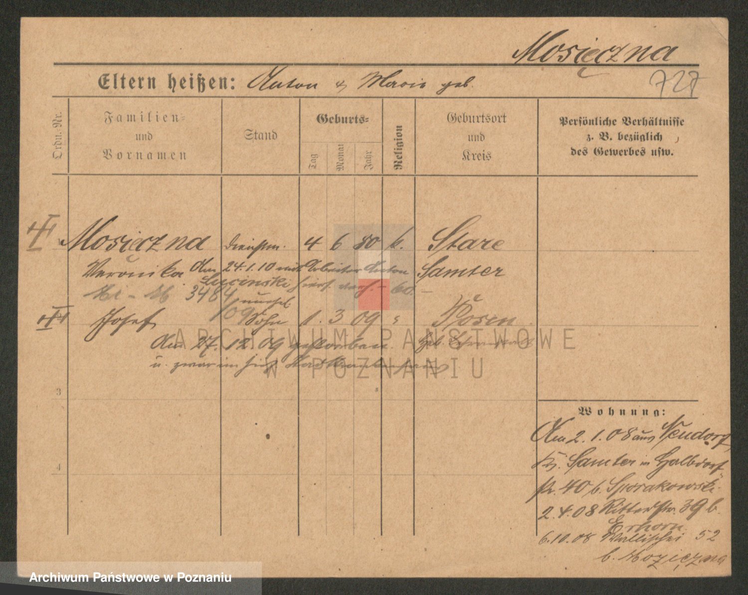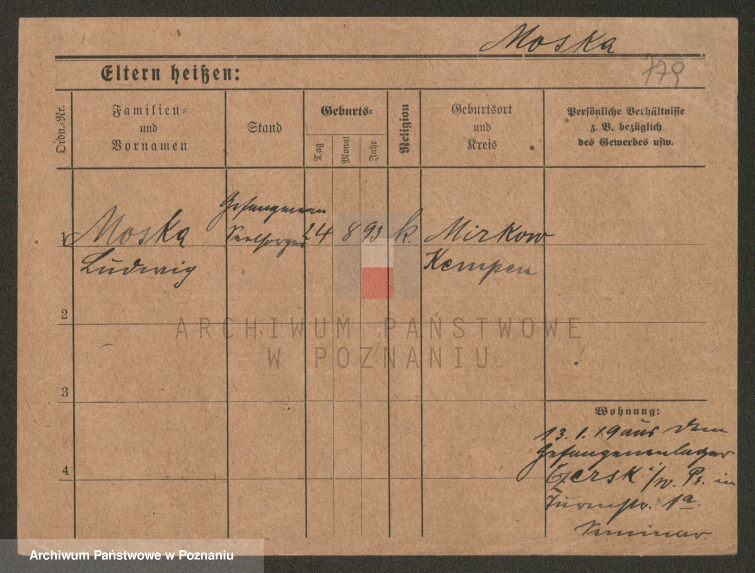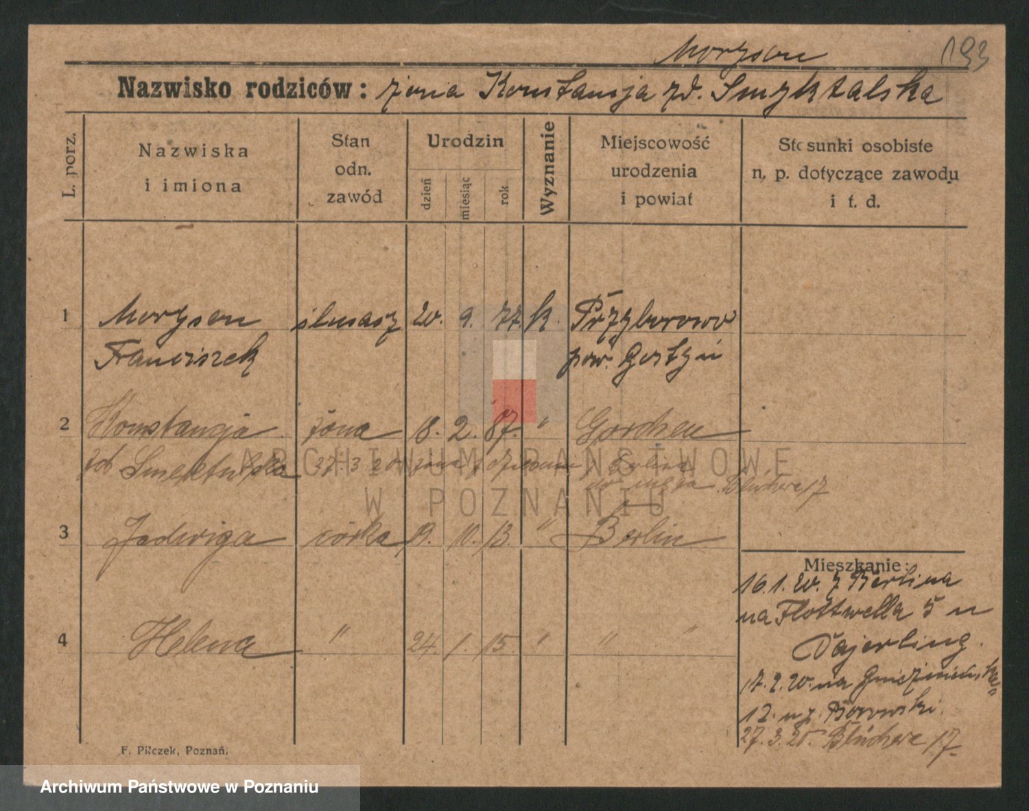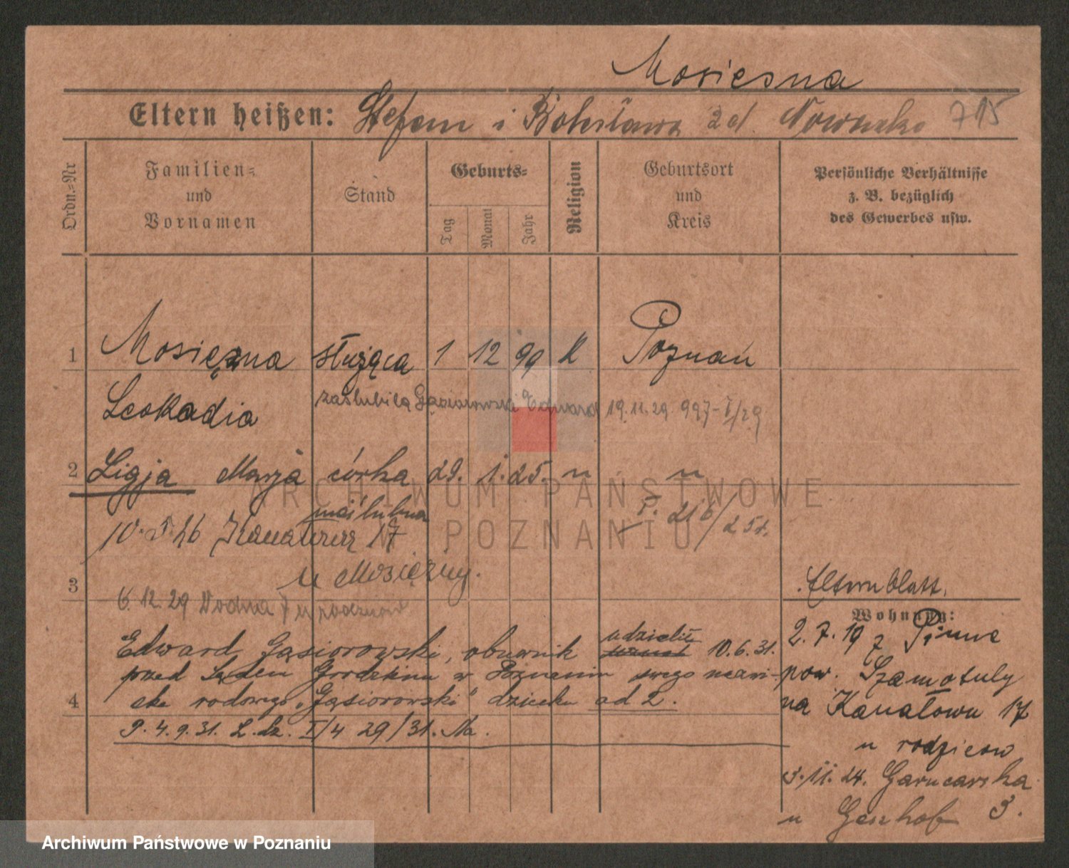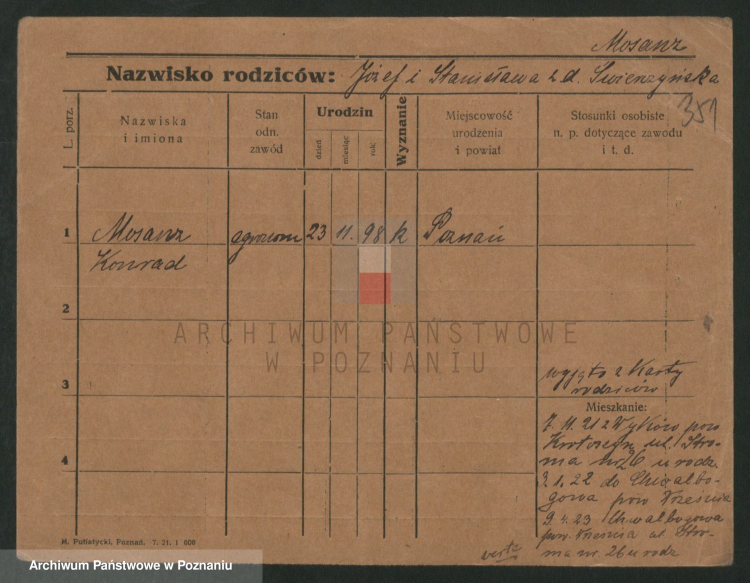 Podgląd karty osobowej dostępny jest po kliknięciu na nazwisko lub ikonkę karty. Można dokonywać powiększenia (ikony na górze) lub przechodzić między kolejnymi skanami (strzałki po bokach).