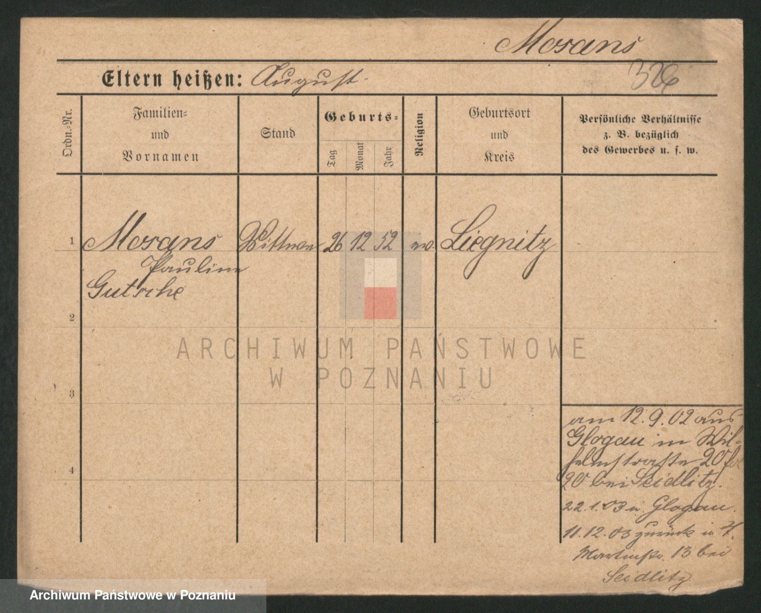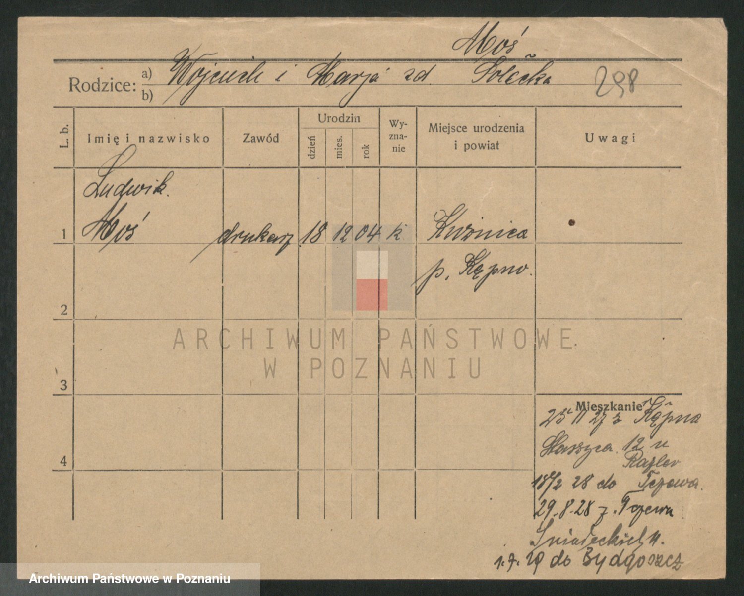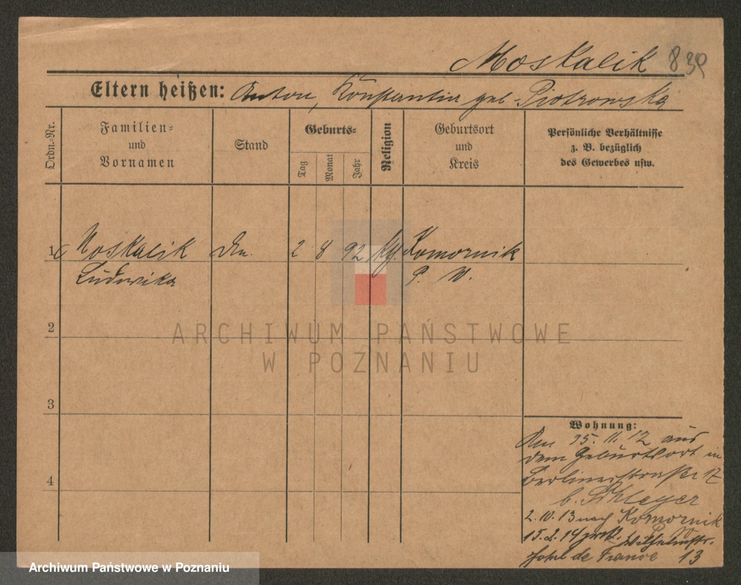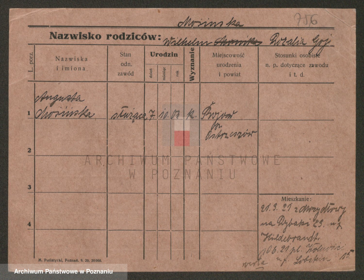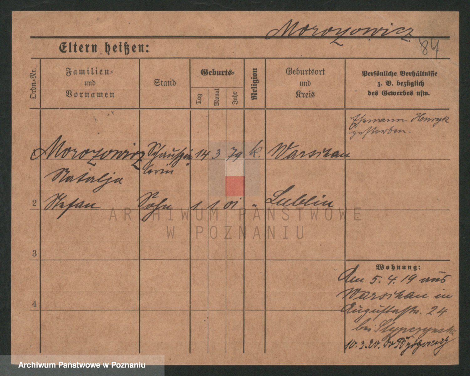 Podgląd karty osobowej dostępny jest po kliknięciu na nazwisko lub ikonkę karty. Można dokonywać powiększenia (ikony na górze) lub przechodzić między kolejnymi skanami (strzałki po bokach).