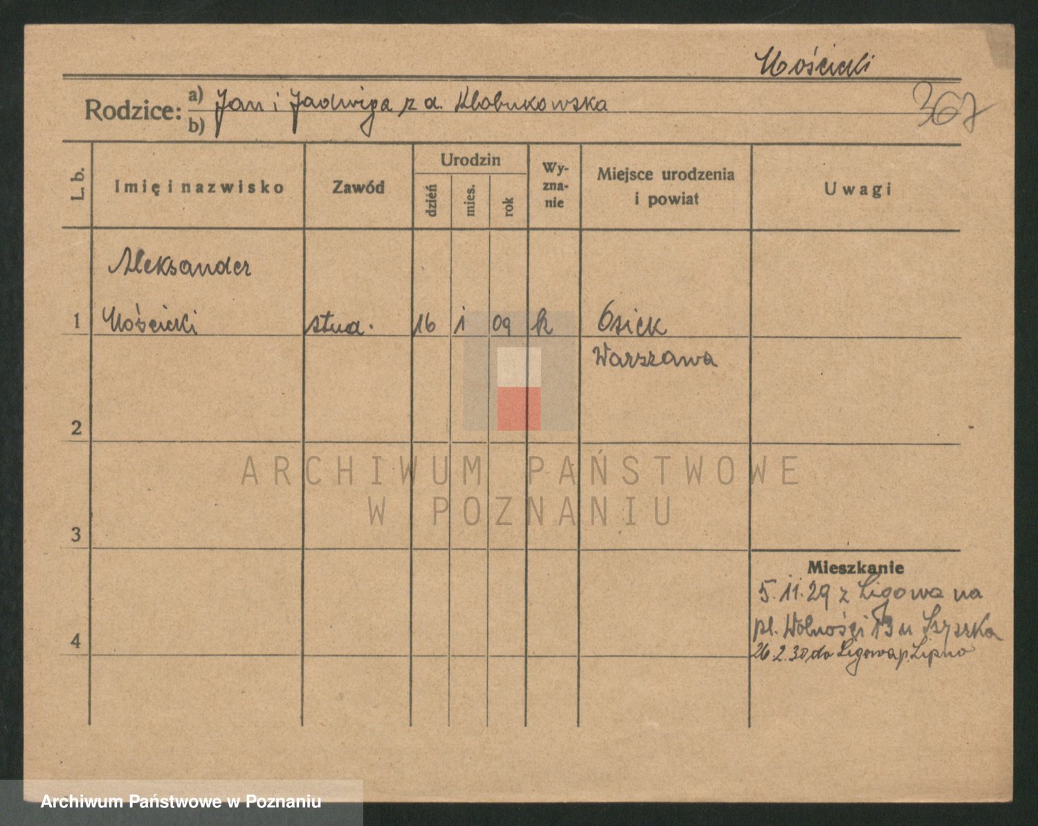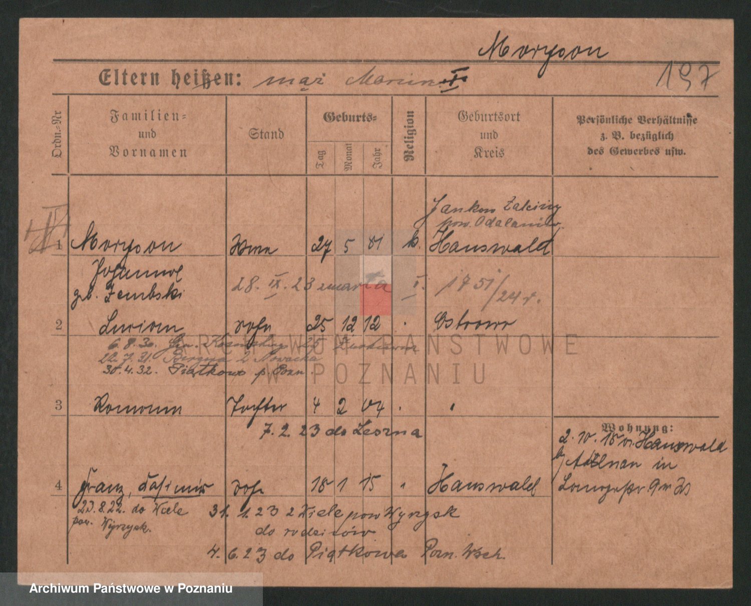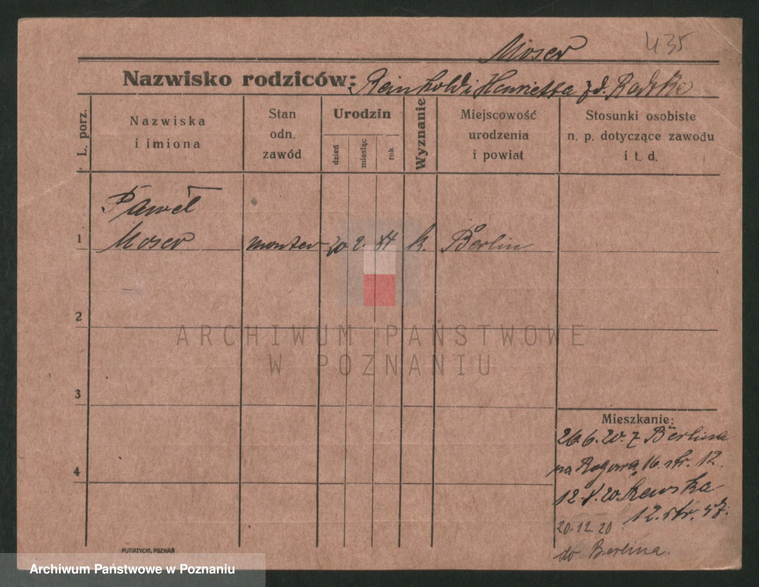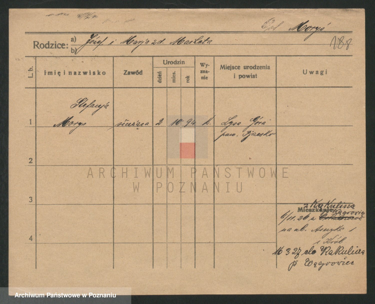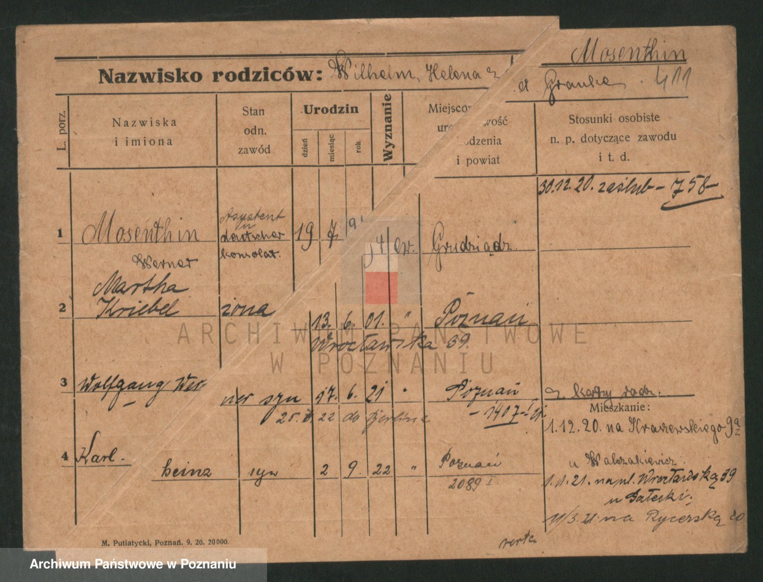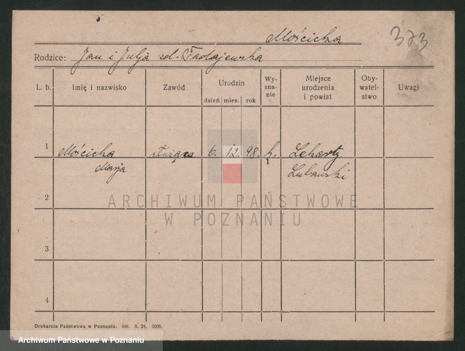 Podgląd karty osobowej dostępny jest po kliknięciu na nazwisko lub ikonkę karty. Można dokonywać powiększenia (ikony na górze) lub przechodzić między kolejnymi skanami (strzałki po bokach).
