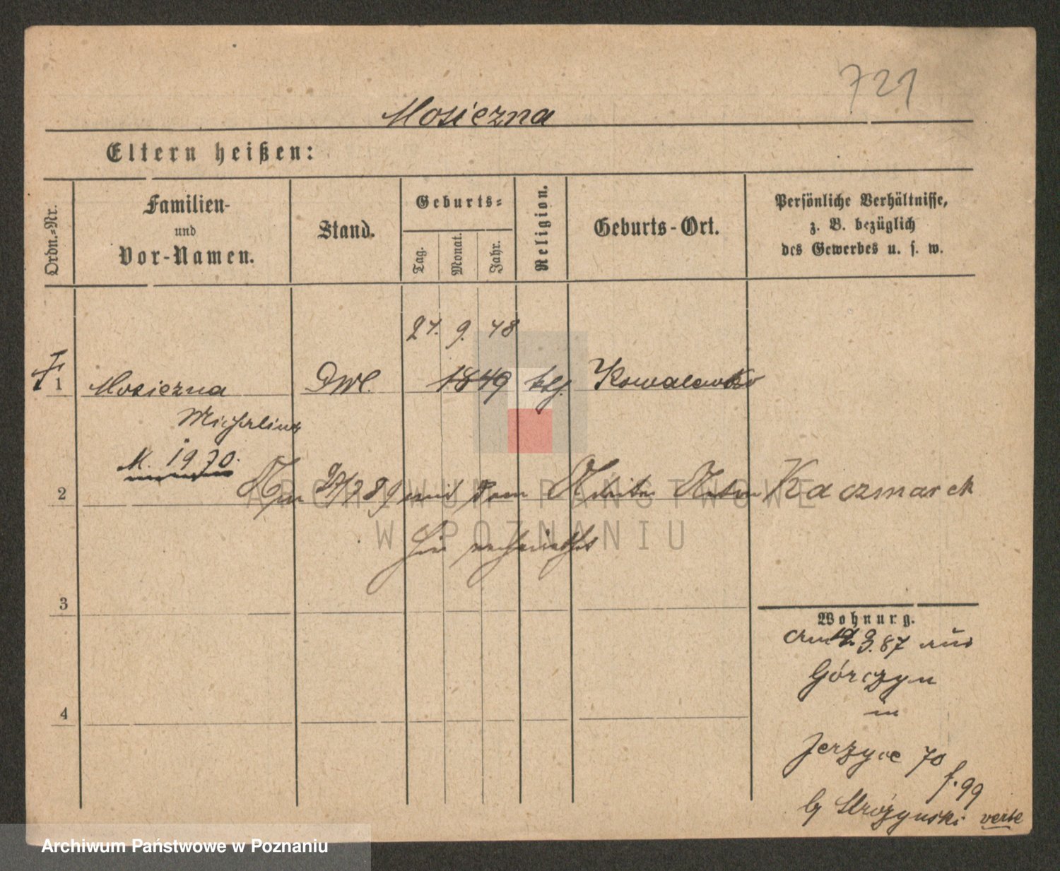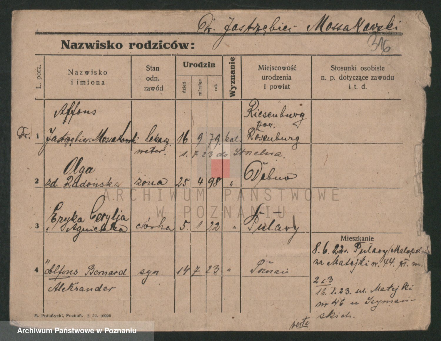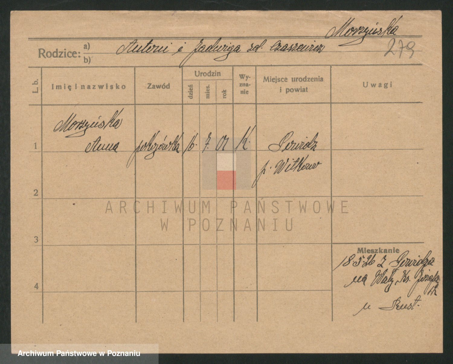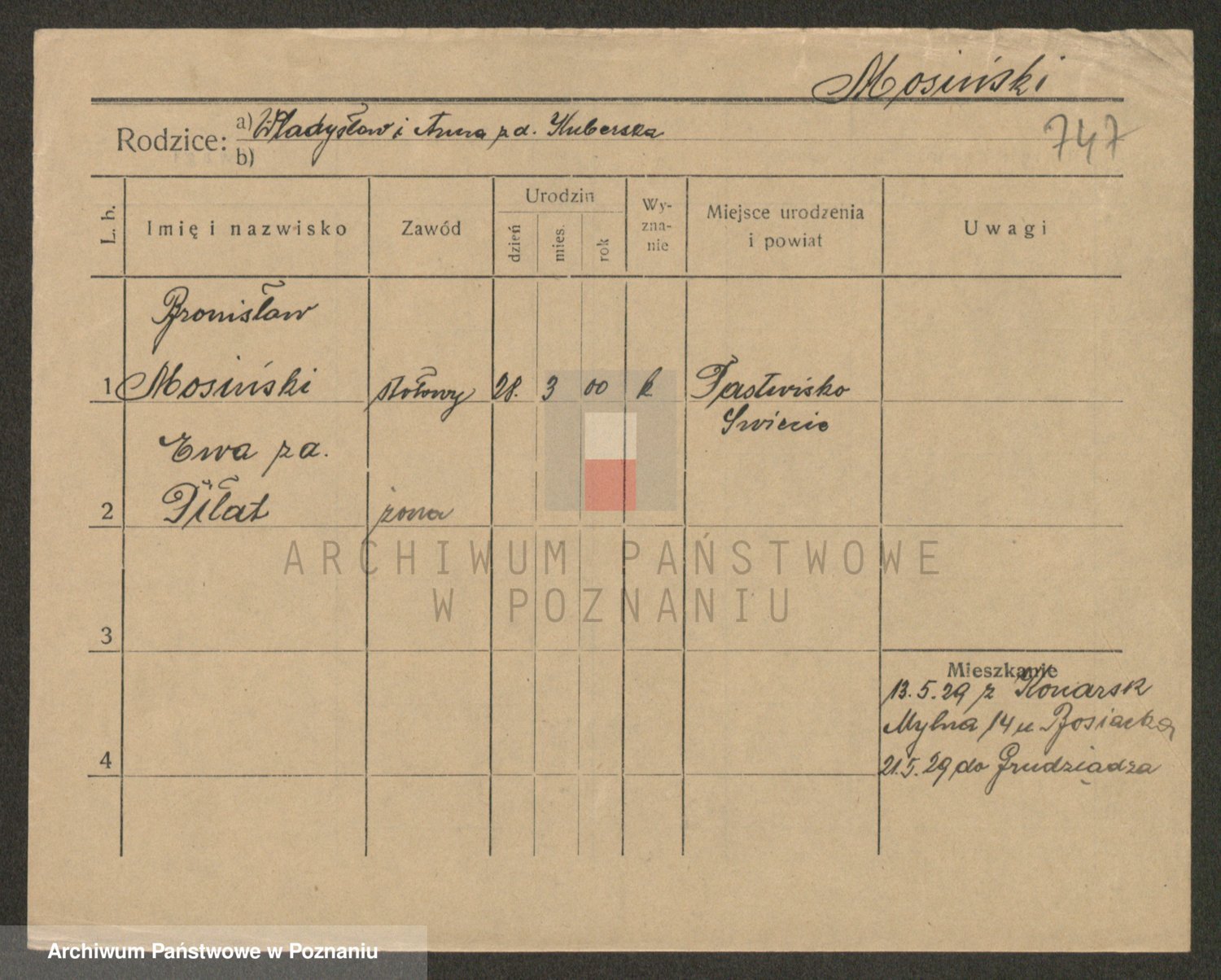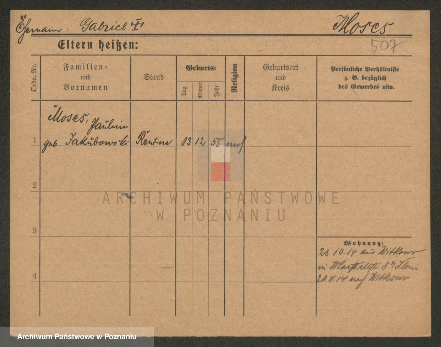 Podgląd karty osobowej dostępny jest po kliknięciu na nazwisko lub ikonkę karty. Można dokonywać powiększenia (ikony na górze) lub przechodzić między kolejnymi skanami (strzałki po bokach).