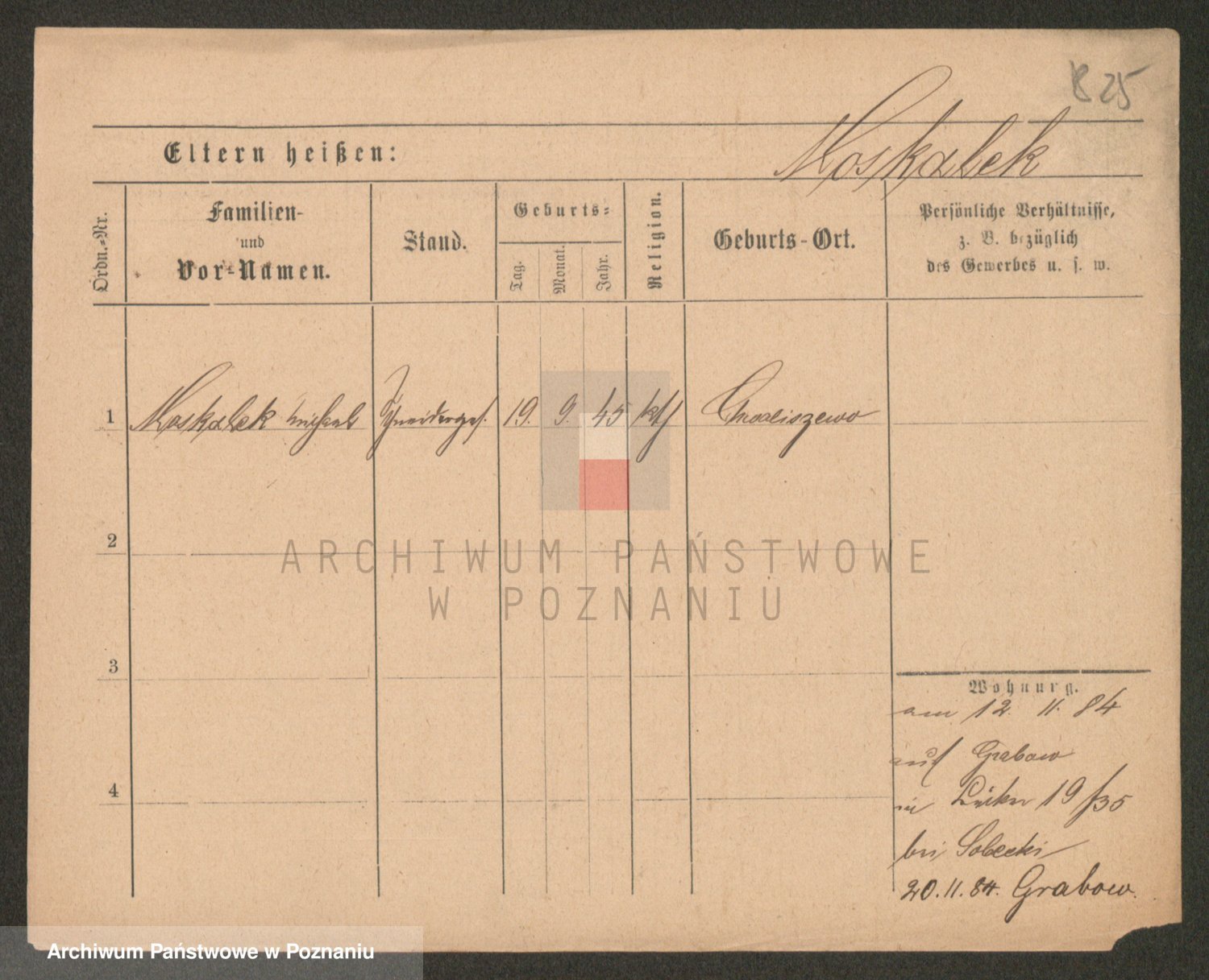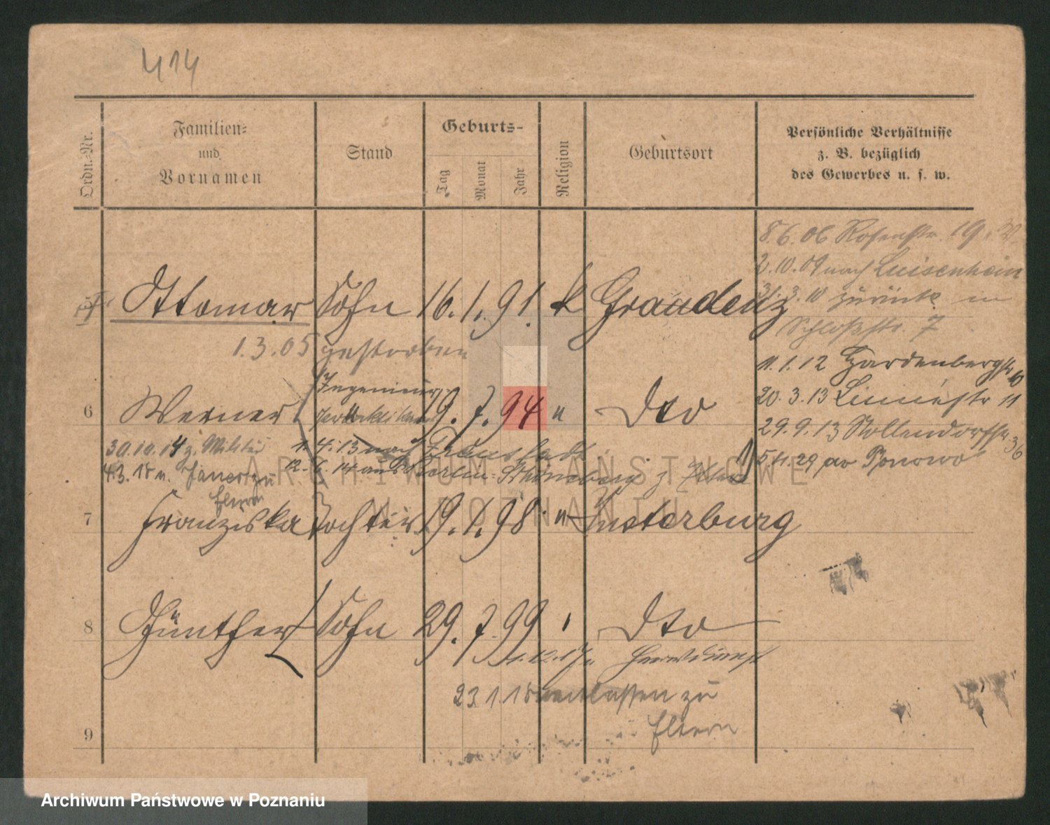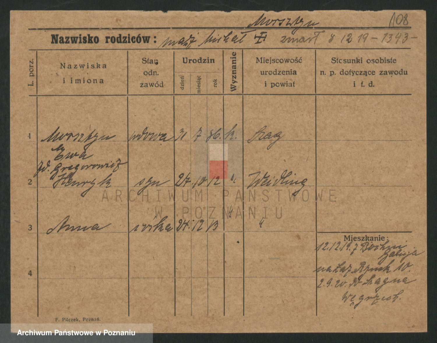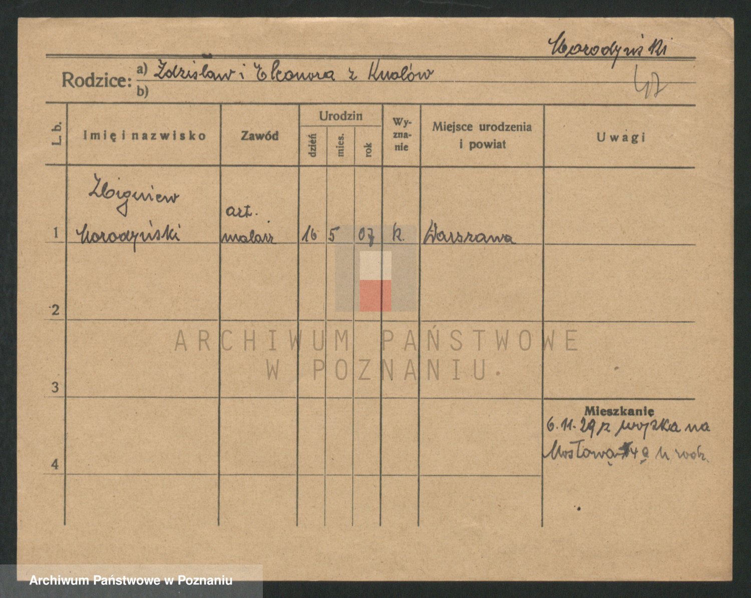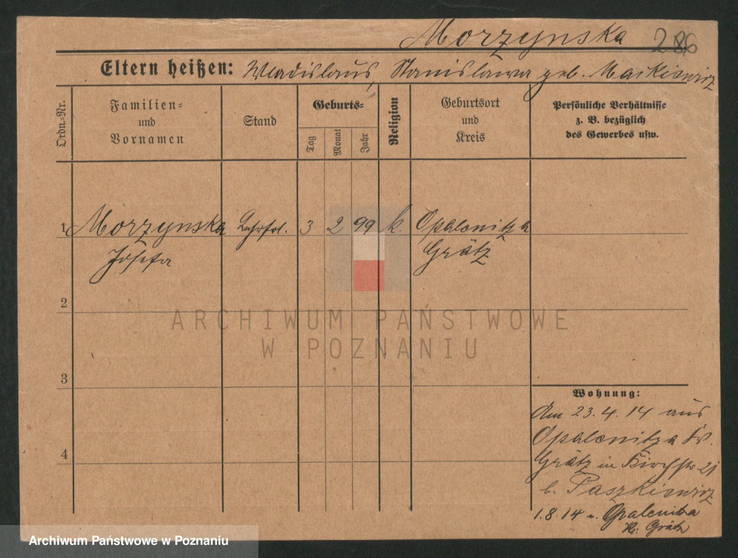 Podgląd karty osobowej dostępny jest po kliknięciu na nazwisko lub ikonkę karty. Można dokonywać powiększenia (ikony na górze) lub przechodzić między kolejnymi skanami (strzałki po bokach).