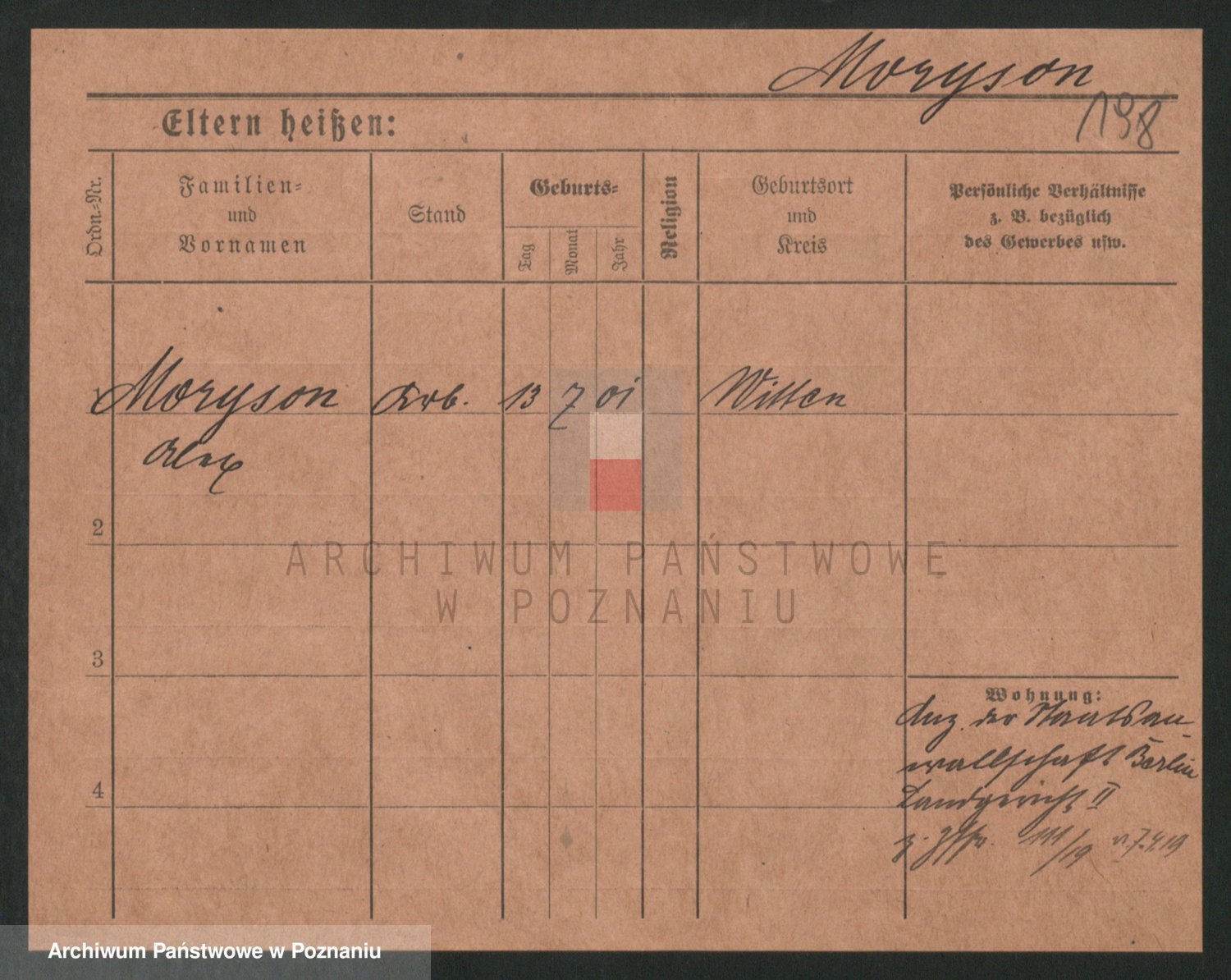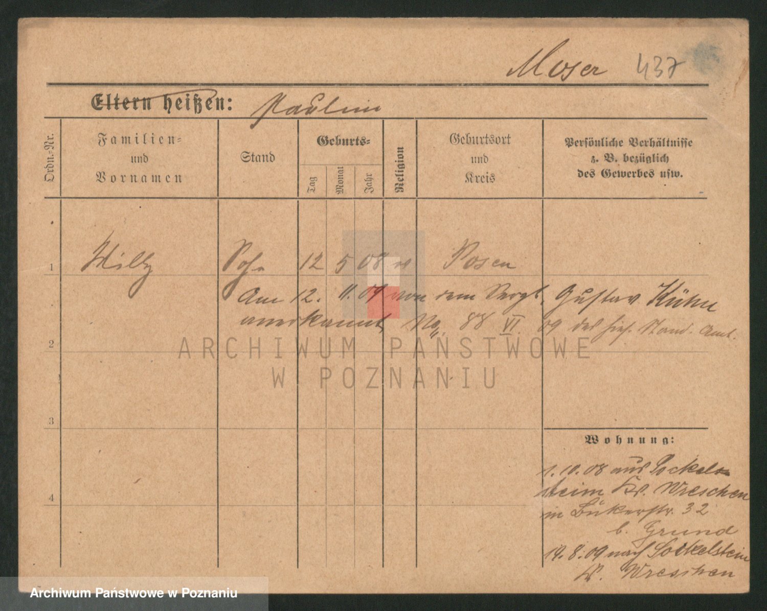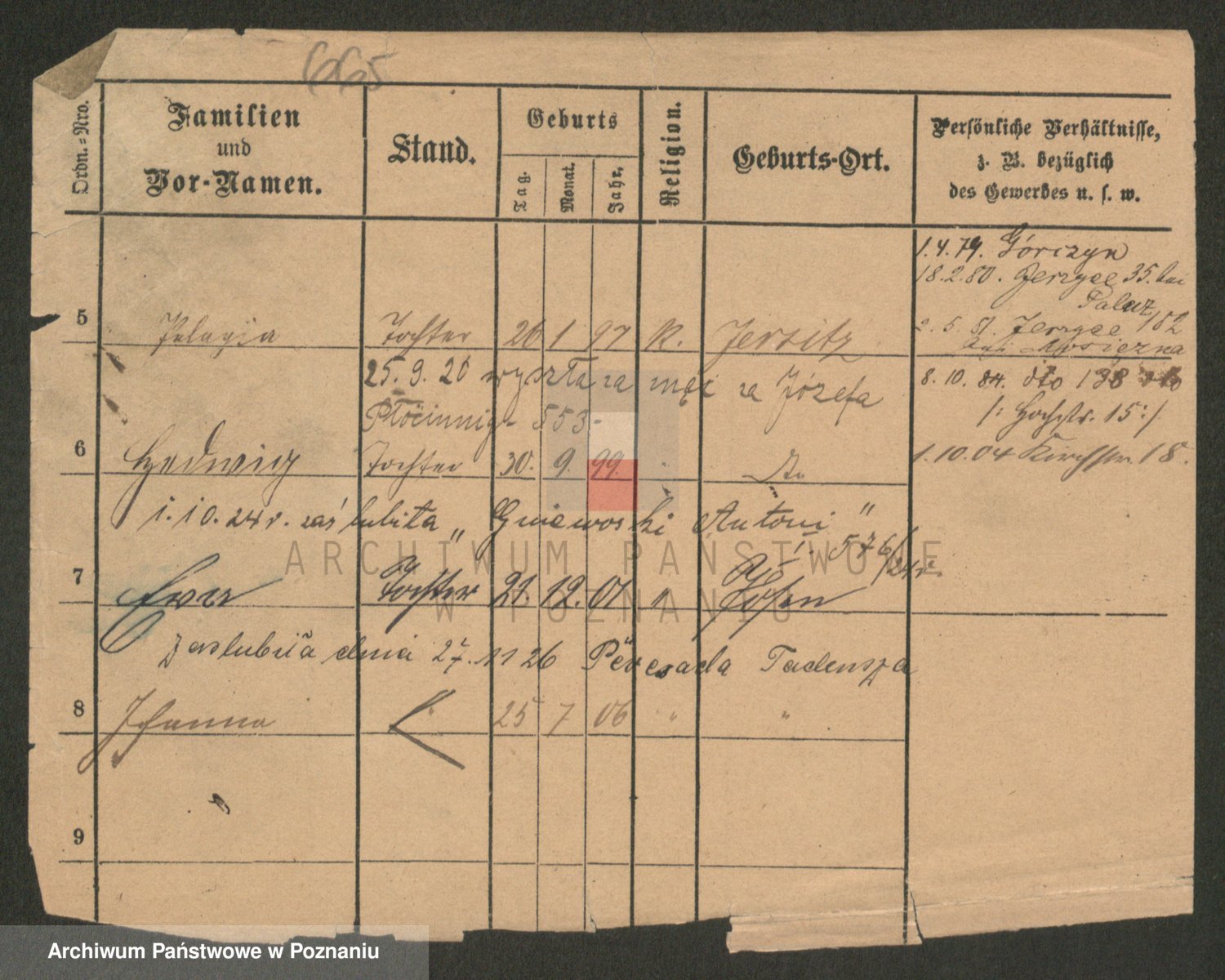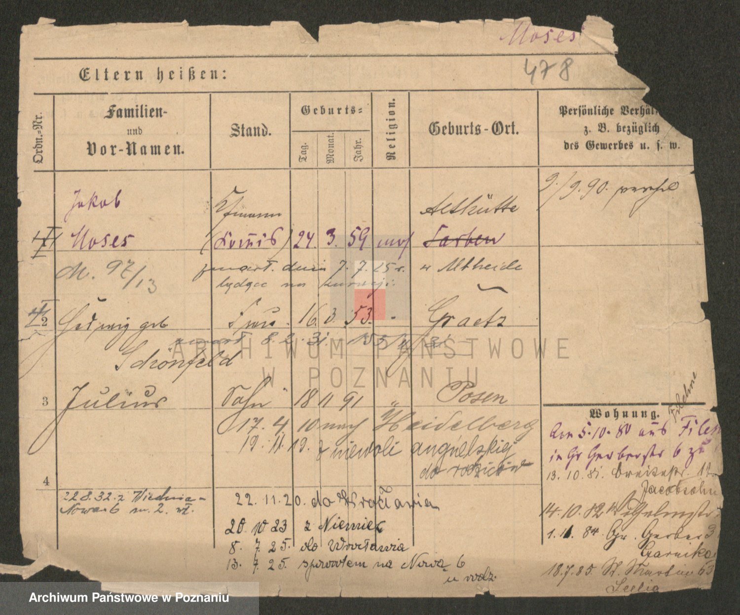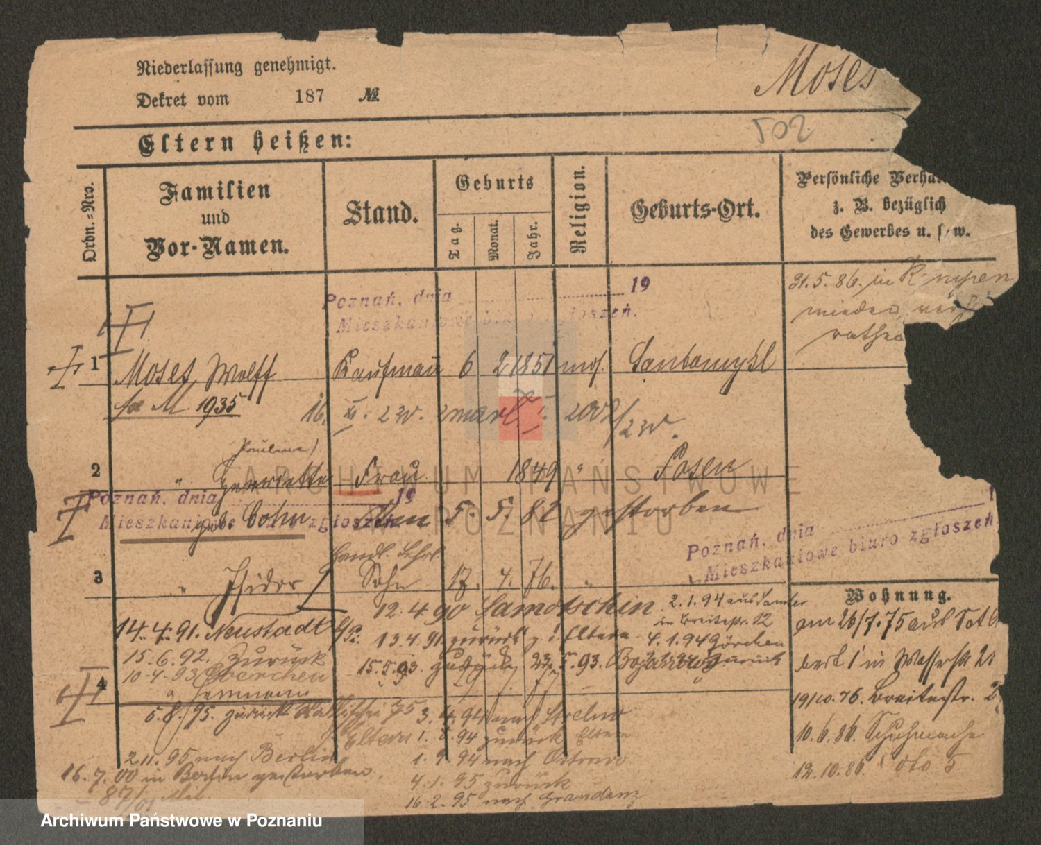 Podgląd karty osobowej dostępny jest po kliknięciu na nazwisko lub ikonkę karty. Można dokonywać powiększenia (ikony na górze) lub przechodzić między kolejnymi skanami (strzałki po bokach).