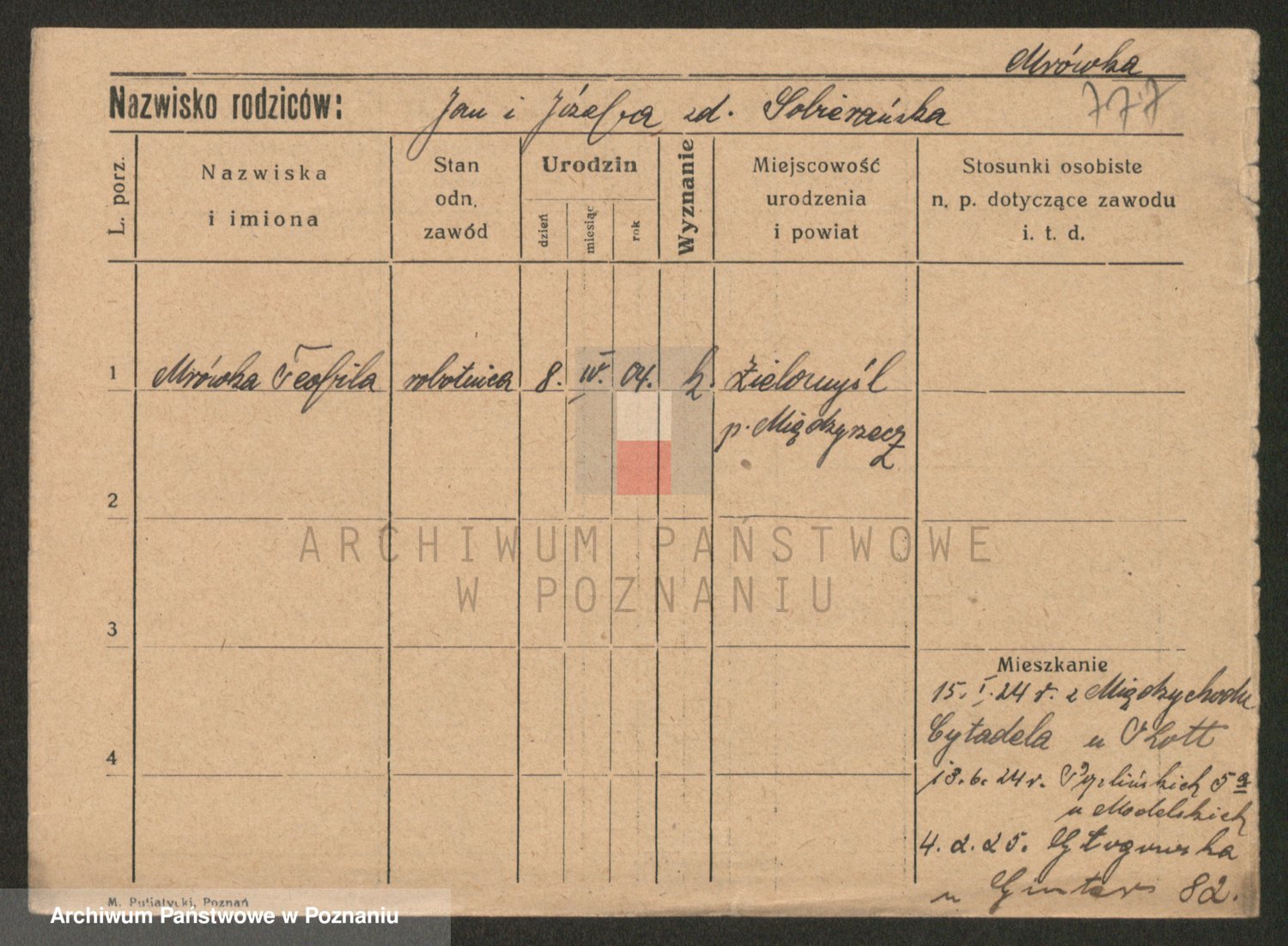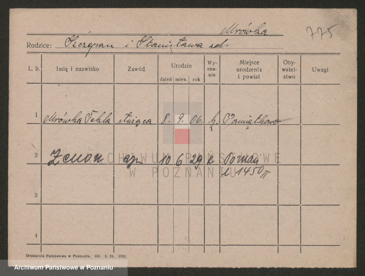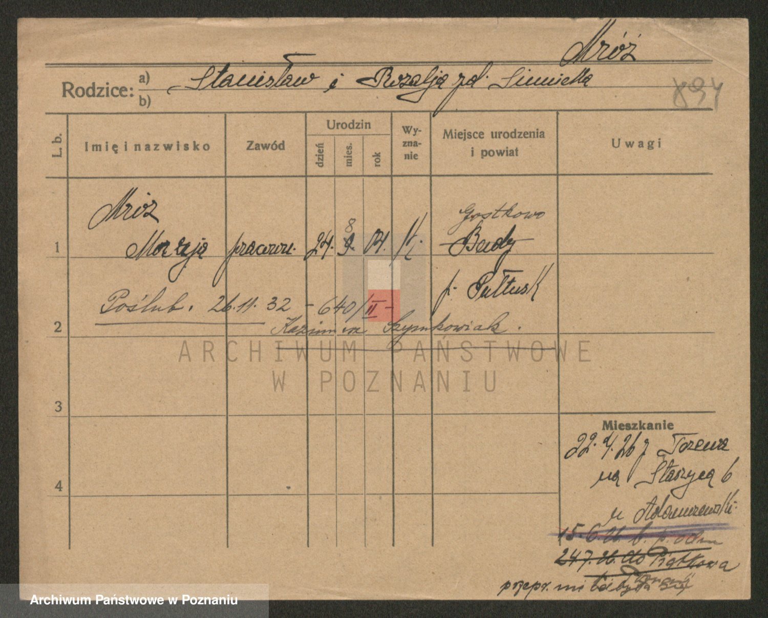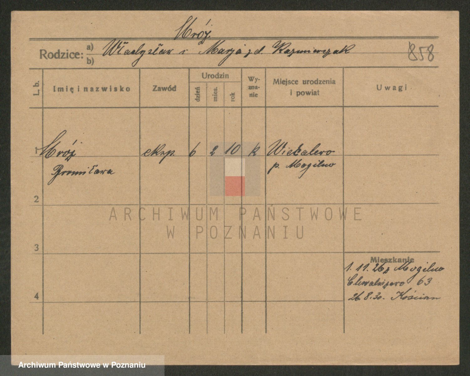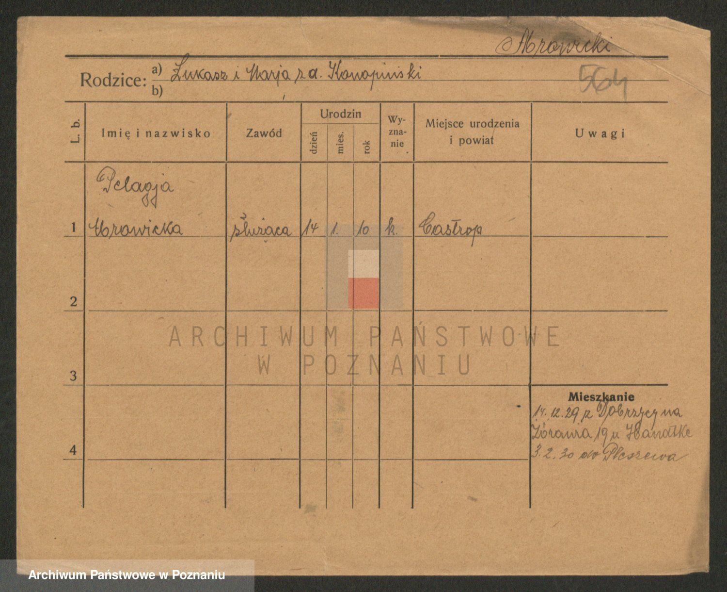 Podgląd karty osobowej dostępny jest po kliknięciu na nazwisko lub ikonkę karty. Można dokonywać powiększenia (ikony na górze) lub przechodzić między kolejnymi skanami (strzałki po bokach).