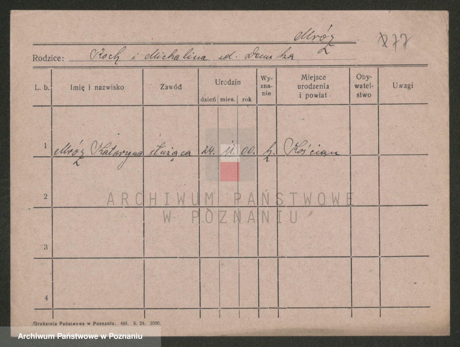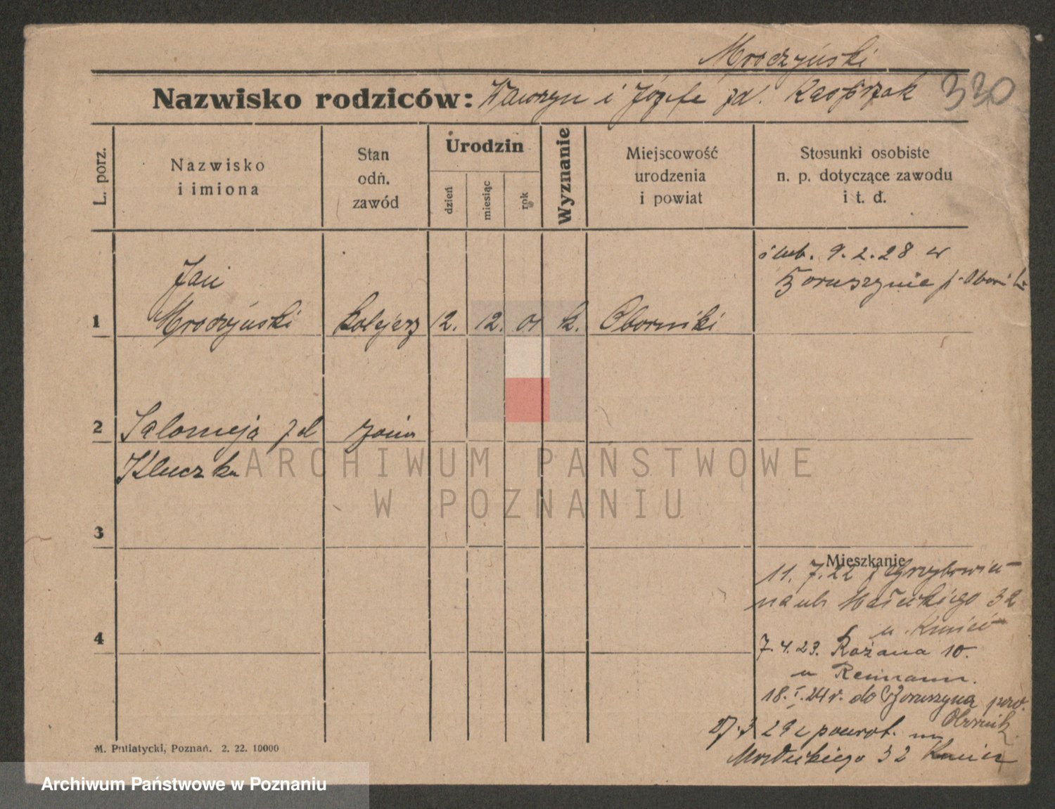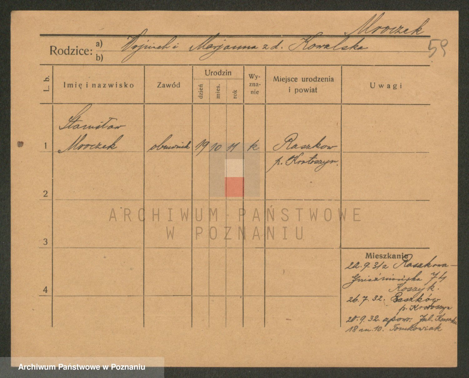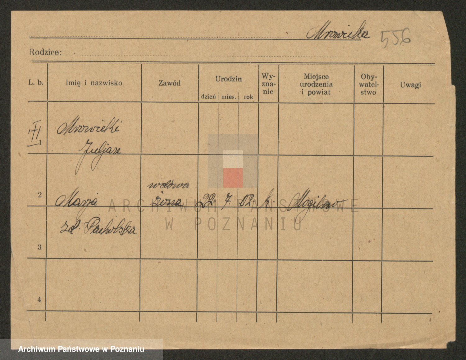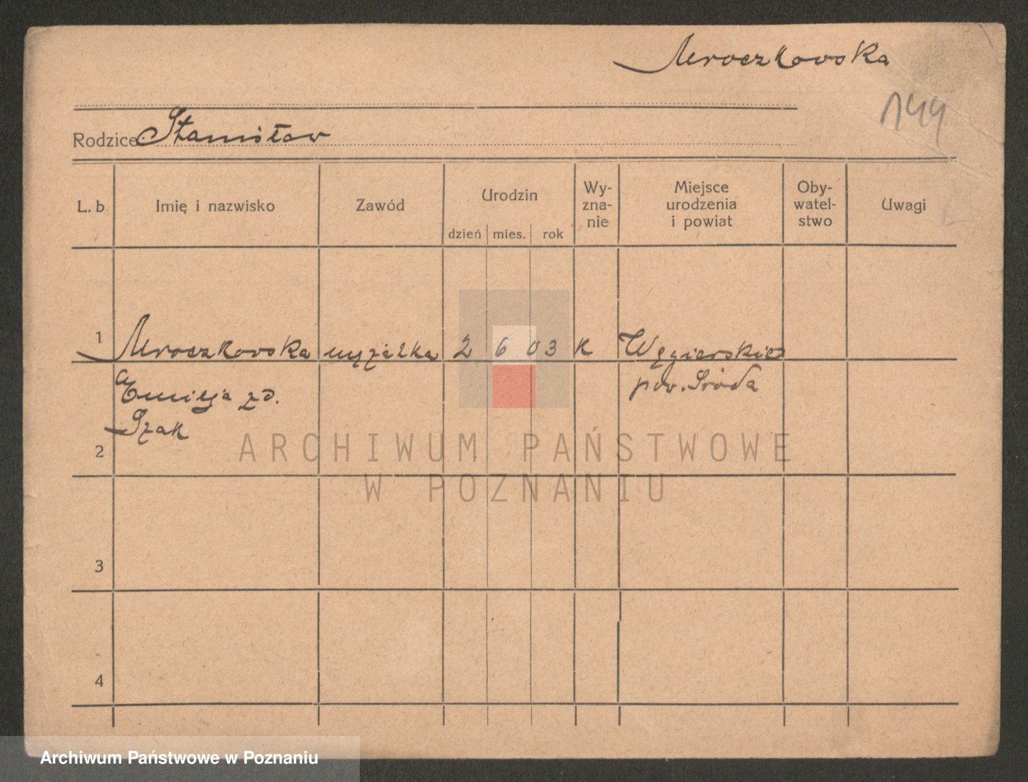 Podgląd karty osobowej dostępny jest po kliknięciu na nazwisko lub ikonkę karty. Można dokonywać powiększenia (ikony na górze) lub przechodzić między kolejnymi skanami (strzałki po bokach).