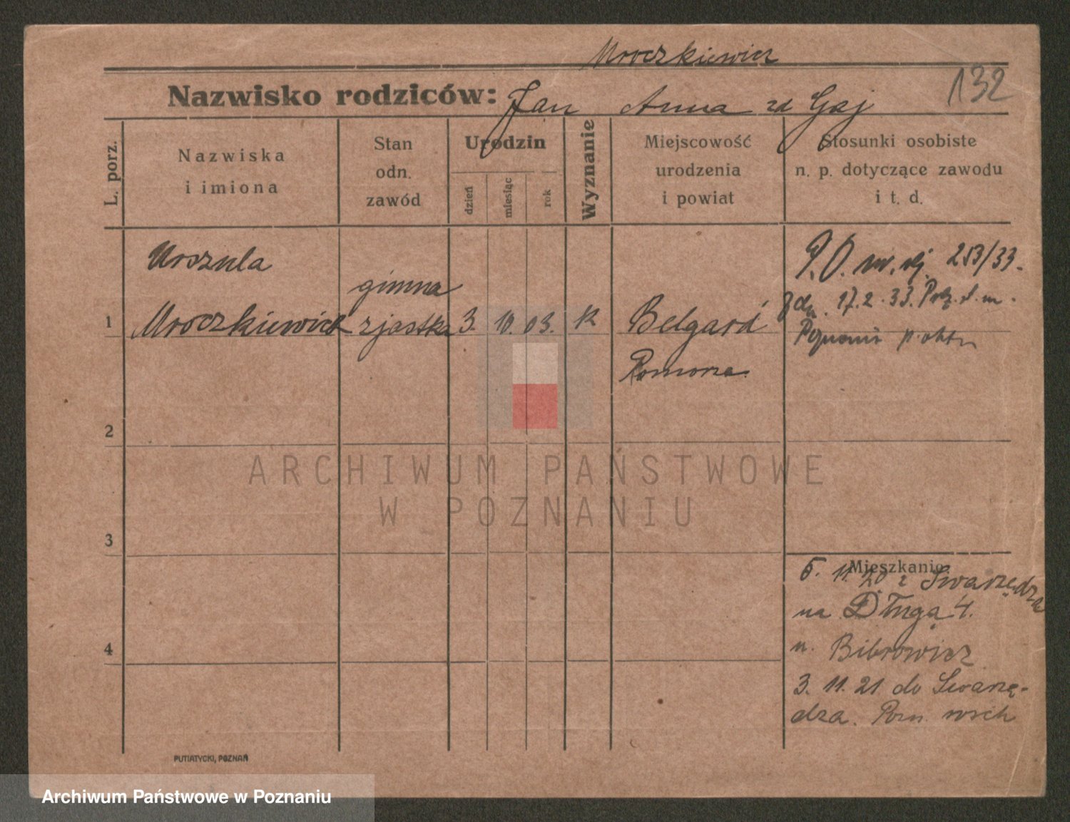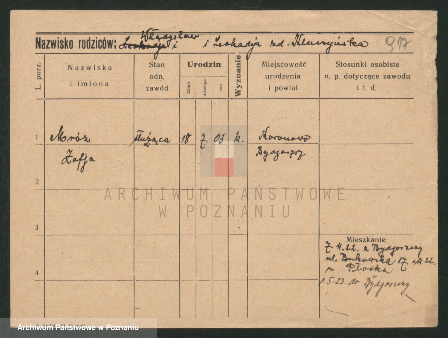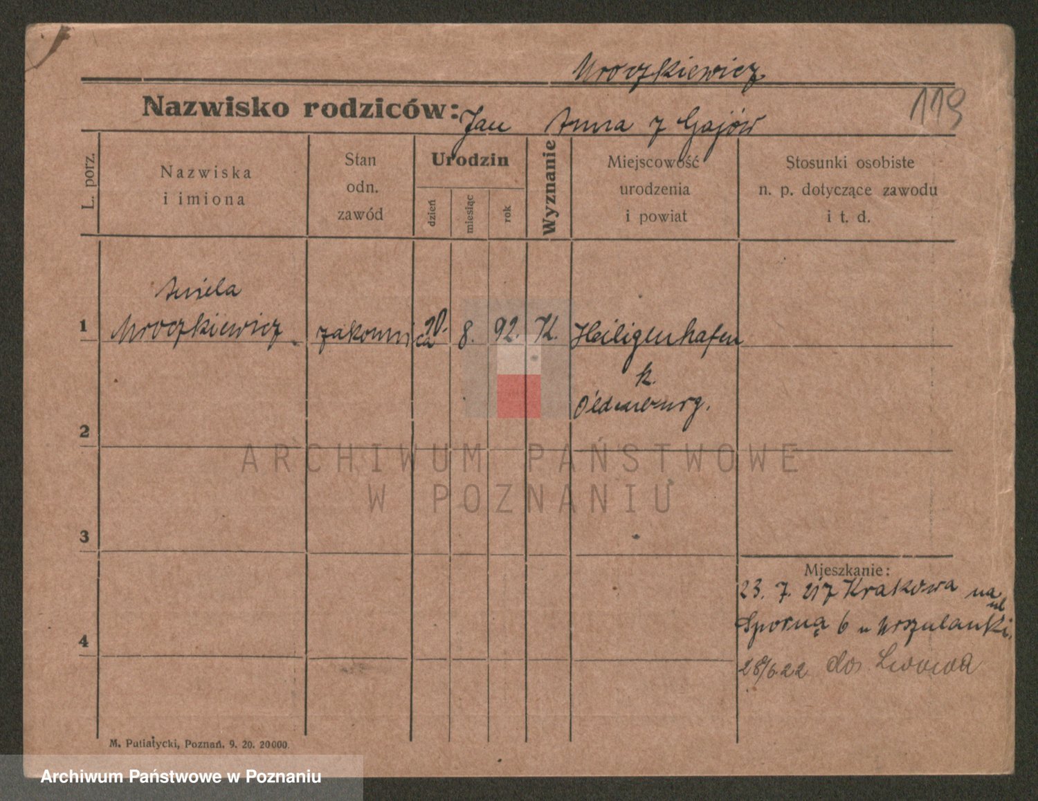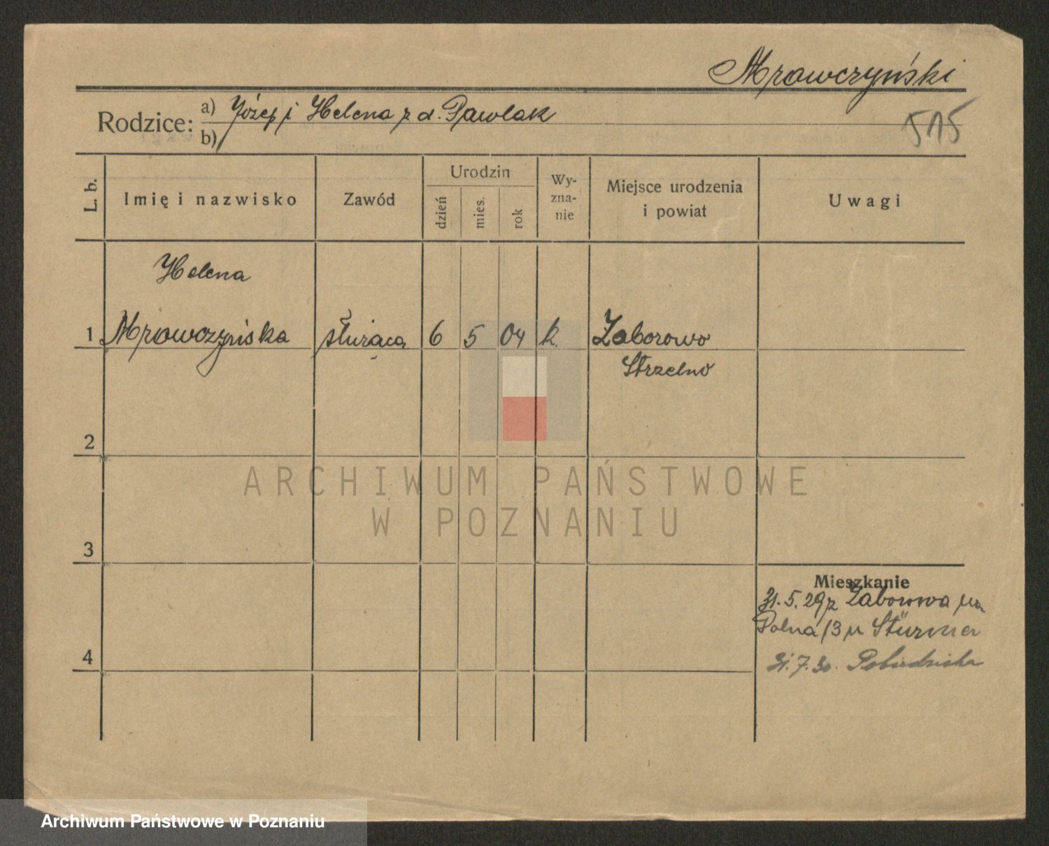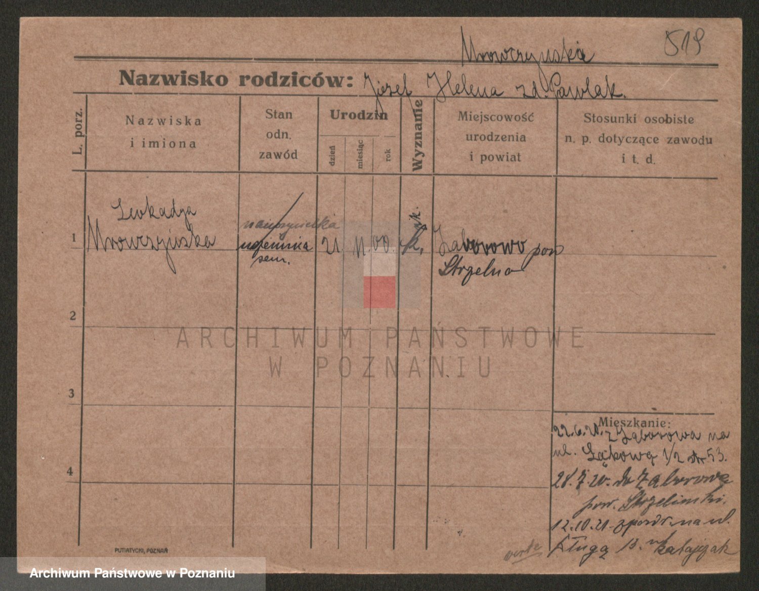 Podgląd karty osobowej dostępny jest po kliknięciu na nazwisko lub ikonkę karty. Można dokonywać powiększenia (ikony na górze) lub przechodzić między kolejnymi skanami (strzałki po bokach).