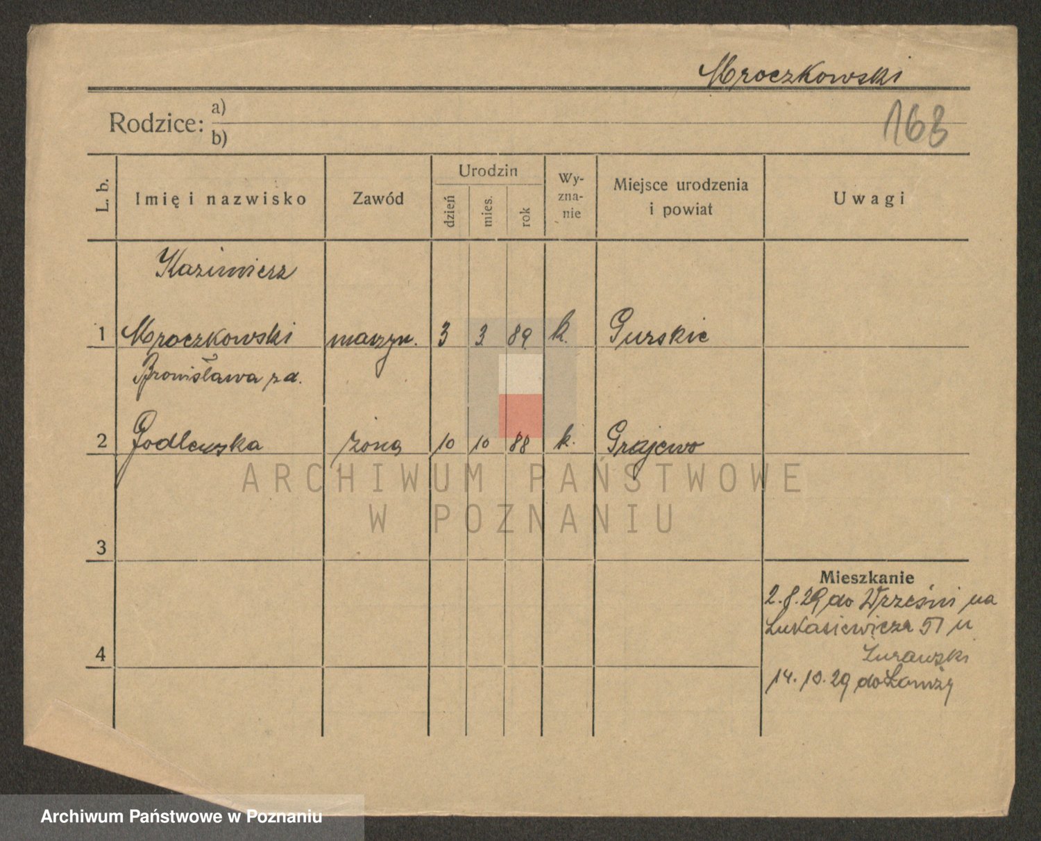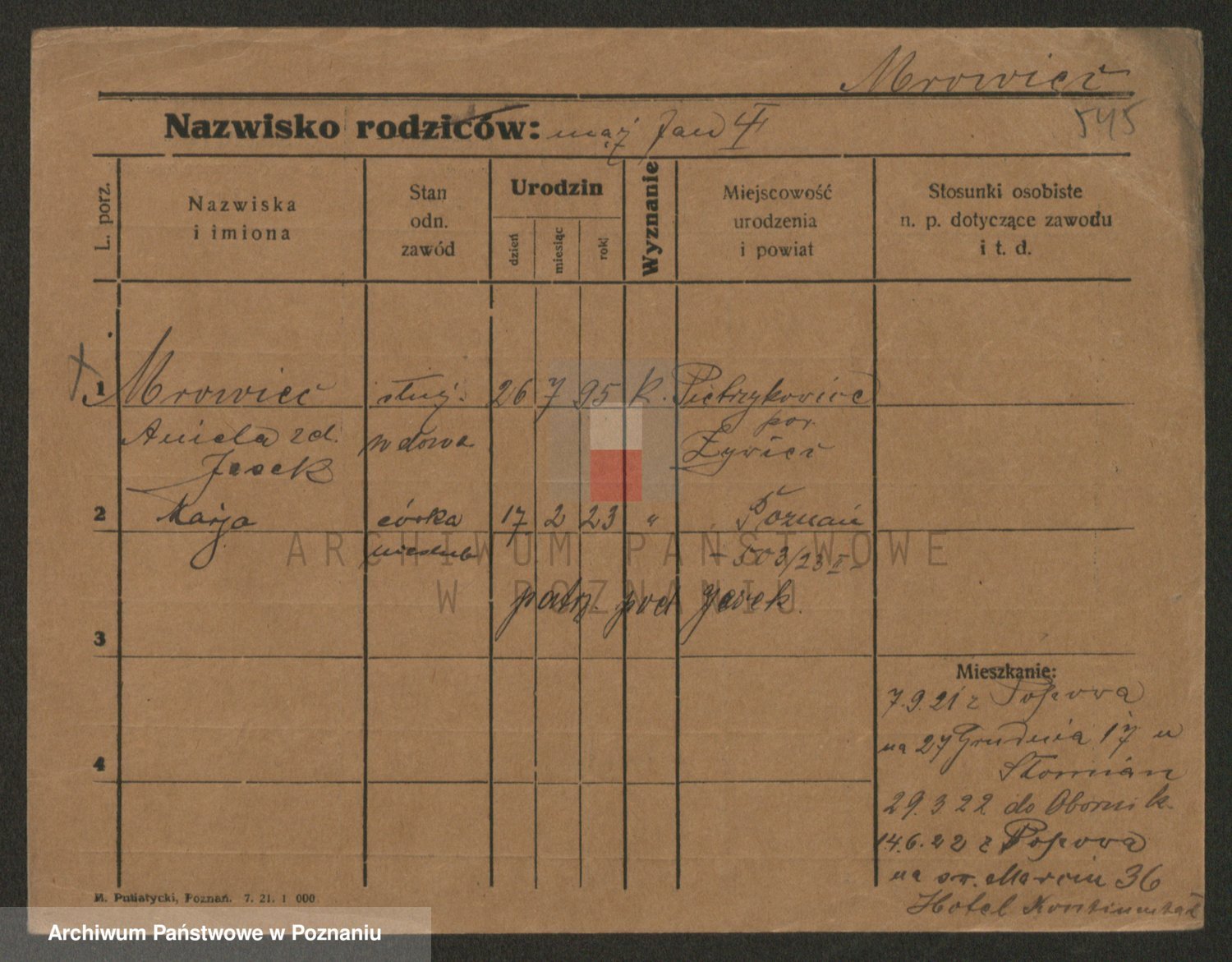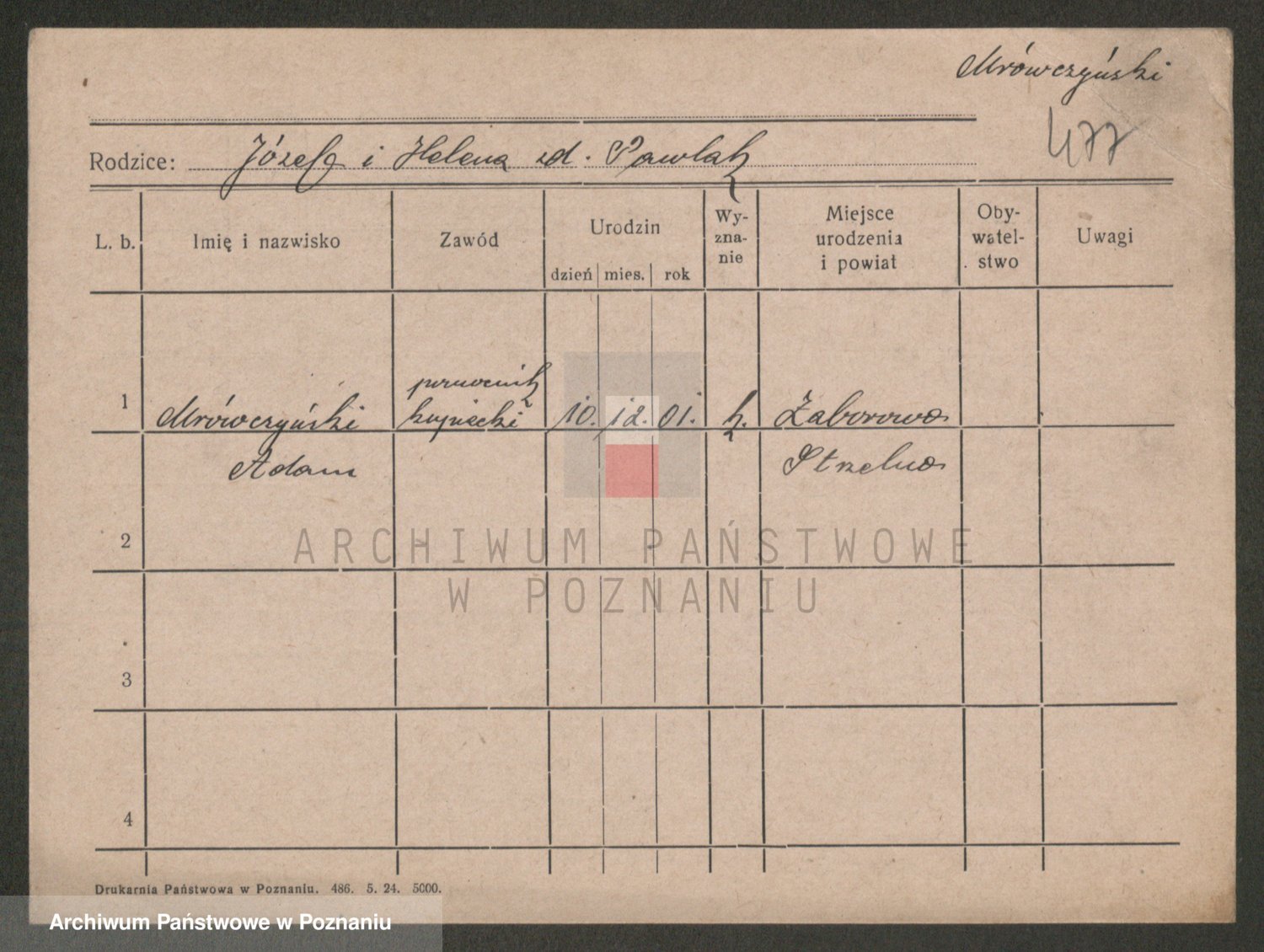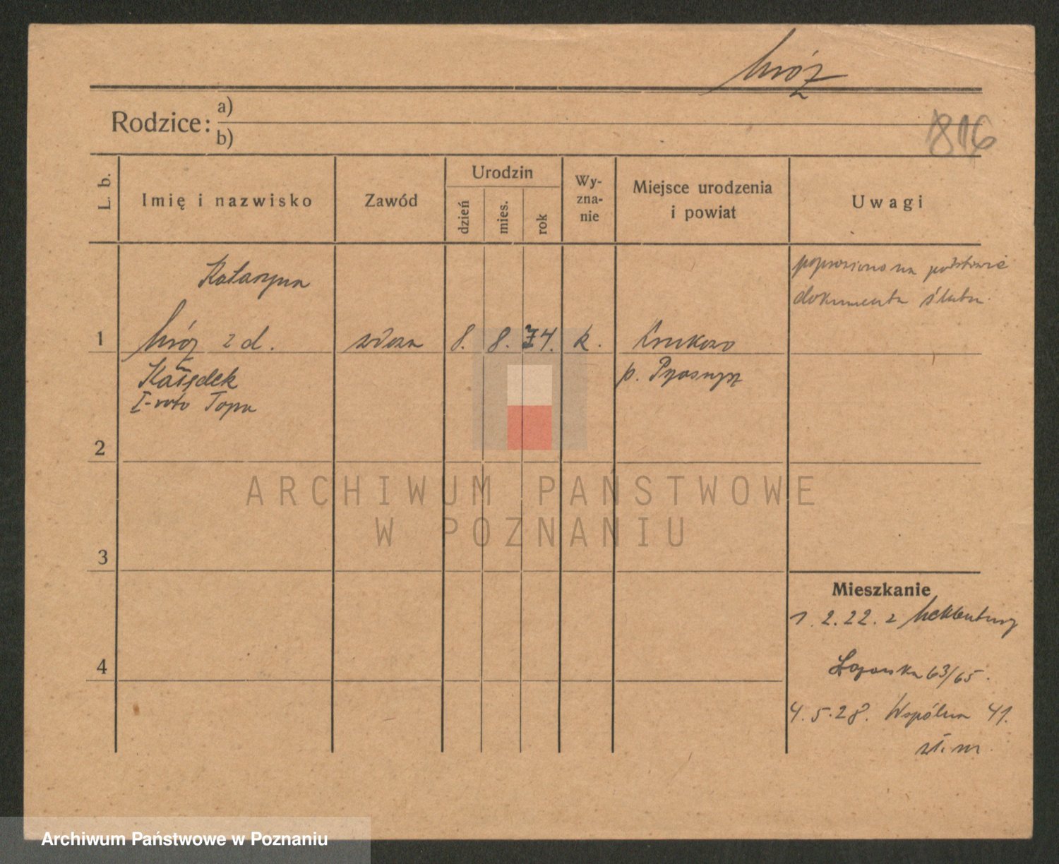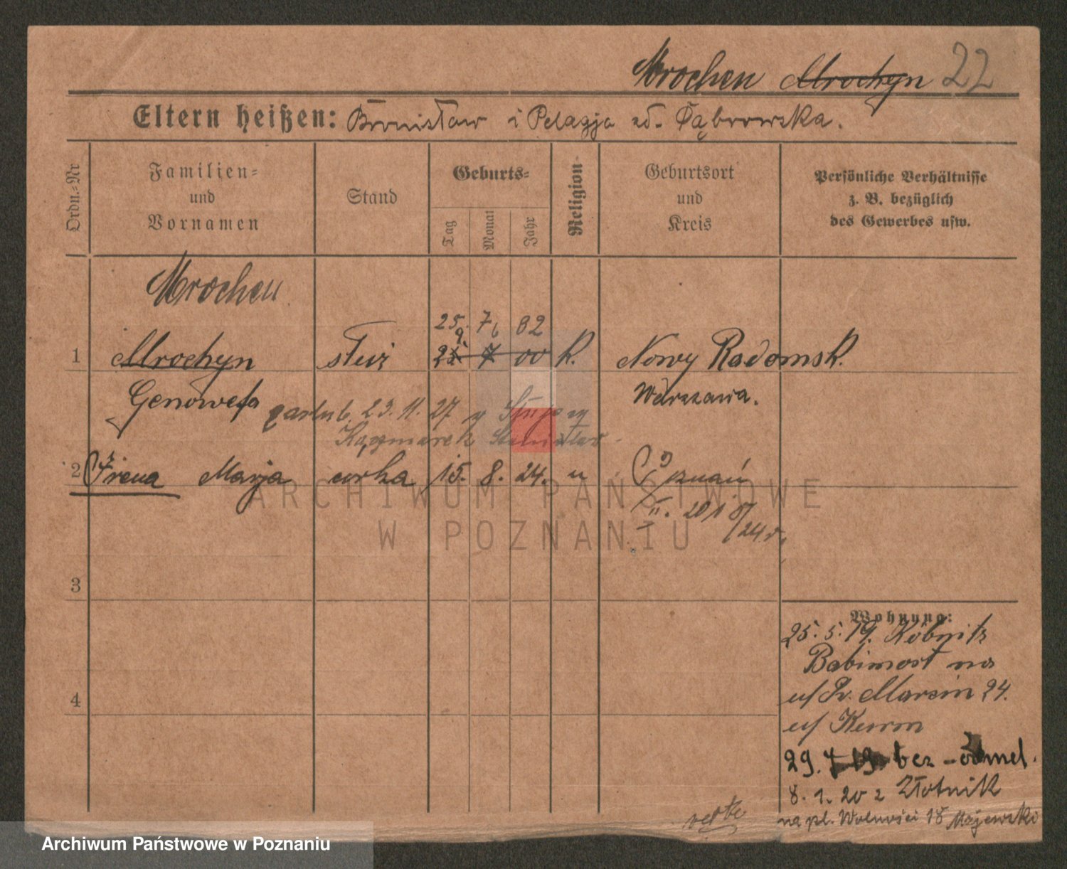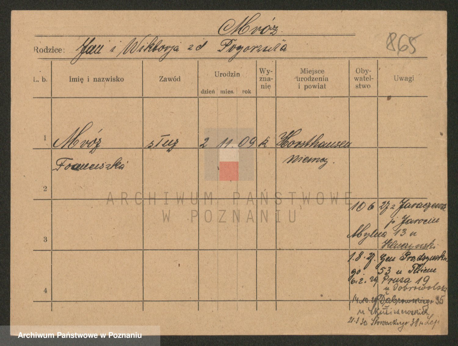 Podgląd karty osobowej dostępny jest po kliknięciu na nazwisko lub ikonkę karty. Można dokonywać powiększenia (ikony na górze) lub przechodzić między kolejnymi skanami (strzałki po bokach).