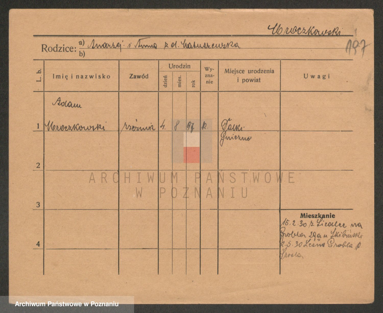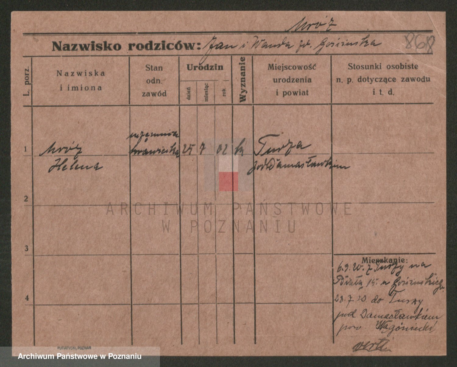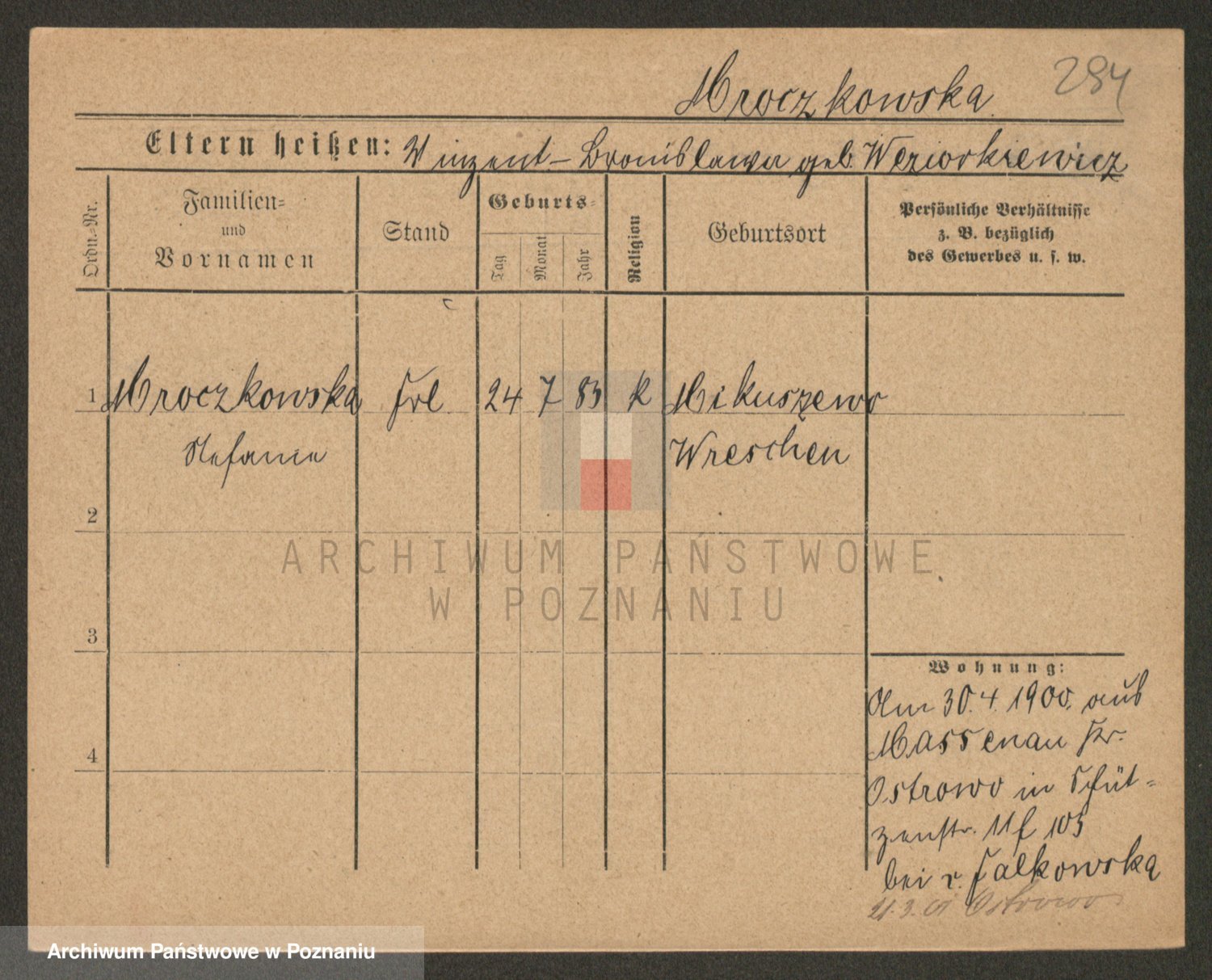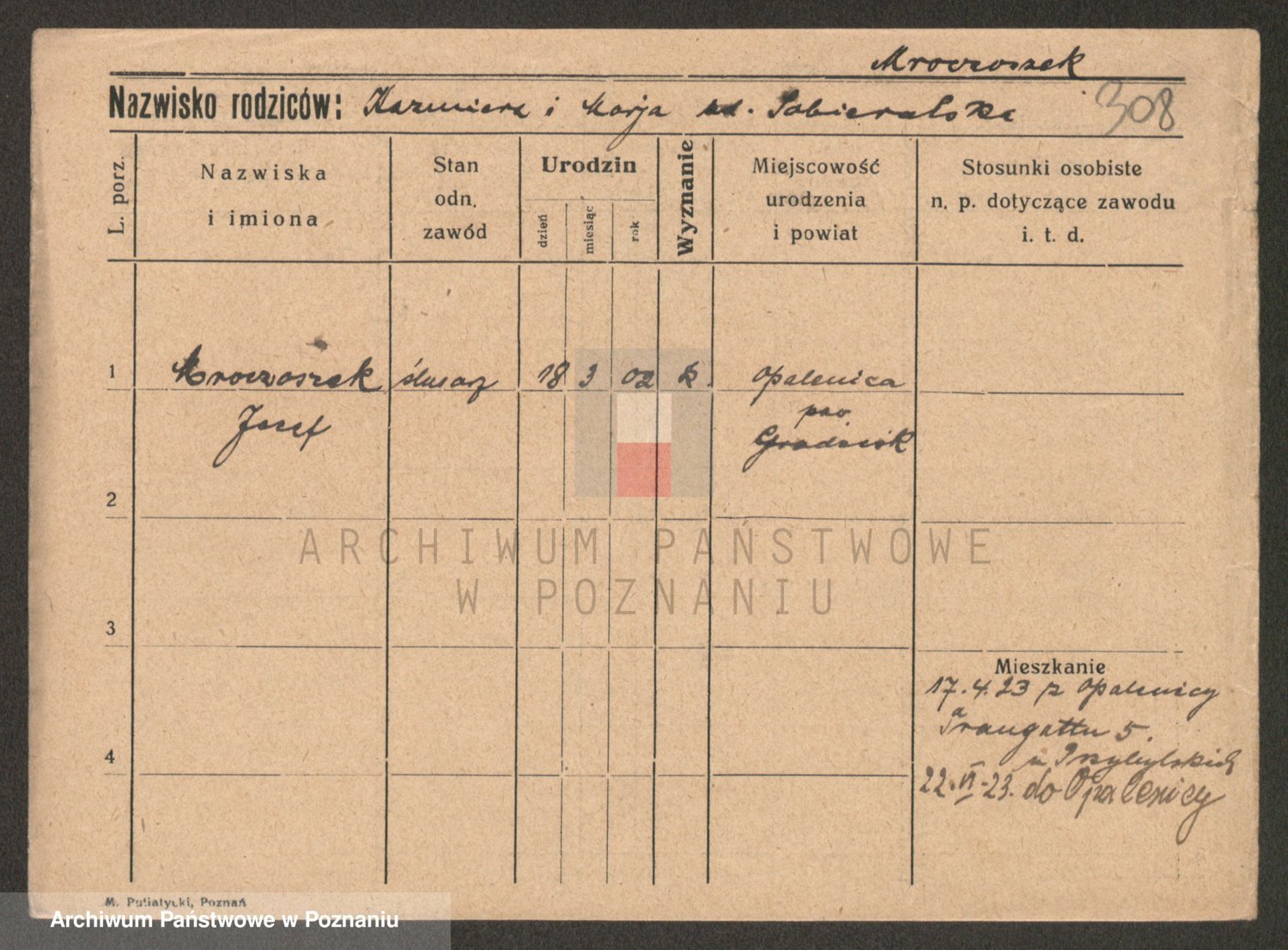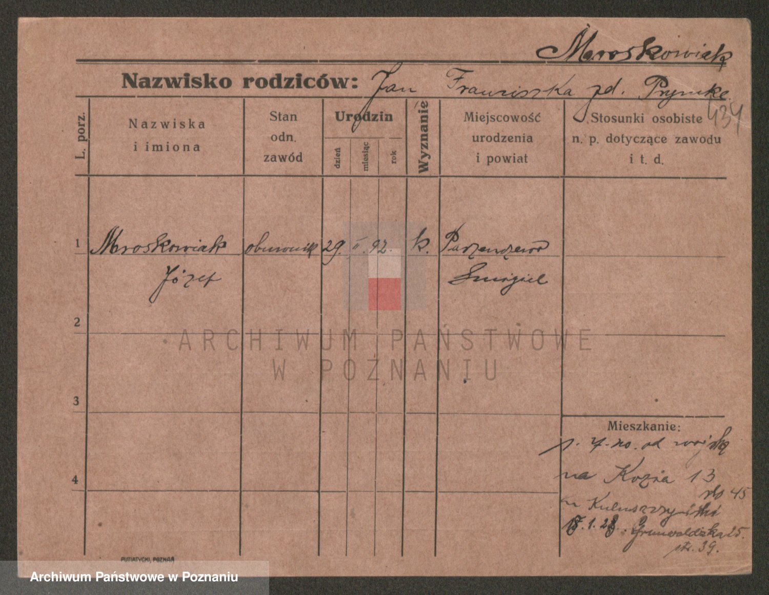 Podgląd karty osobowej dostępny jest po kliknięciu na nazwisko lub ikonkę karty. Można dokonywać powiększenia (ikony na górze) lub przechodzić między kolejnymi skanami (strzałki po bokach).