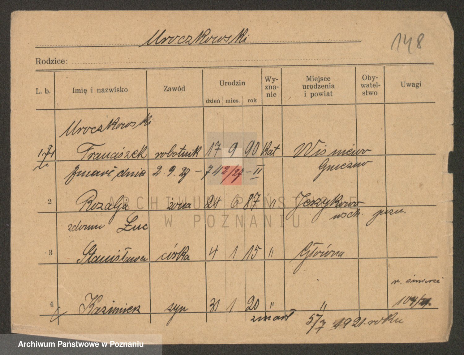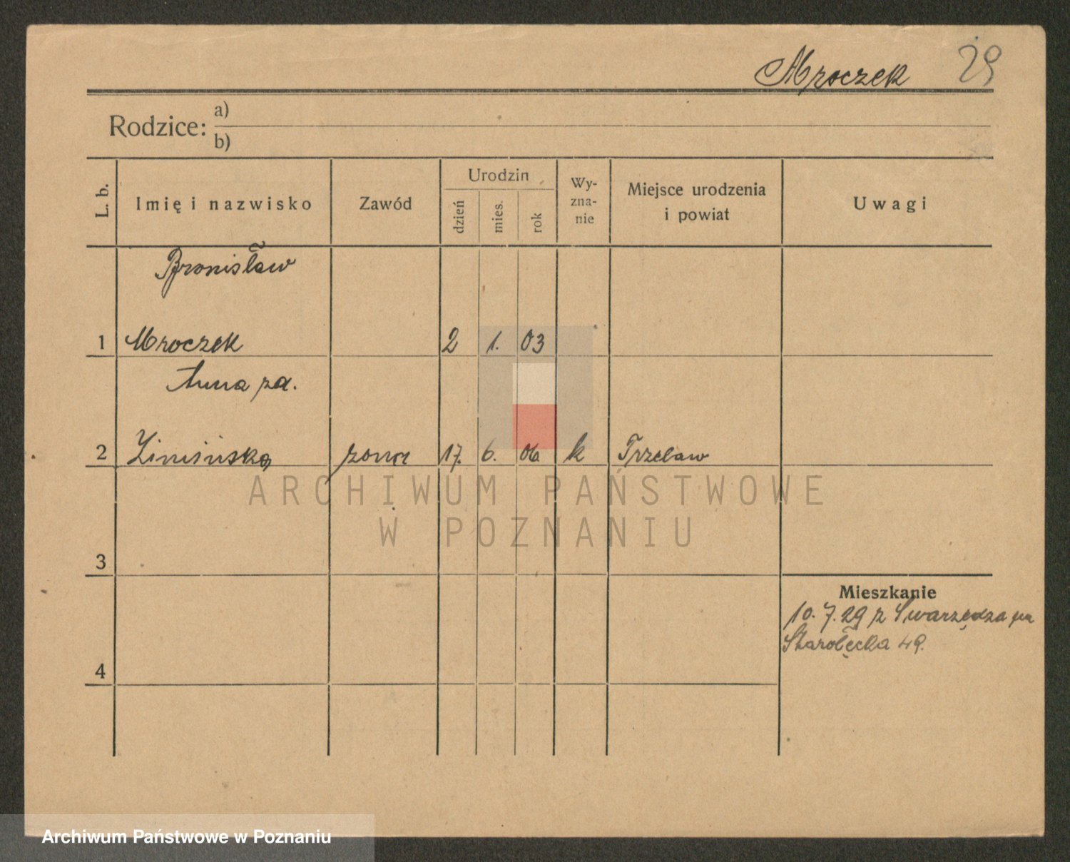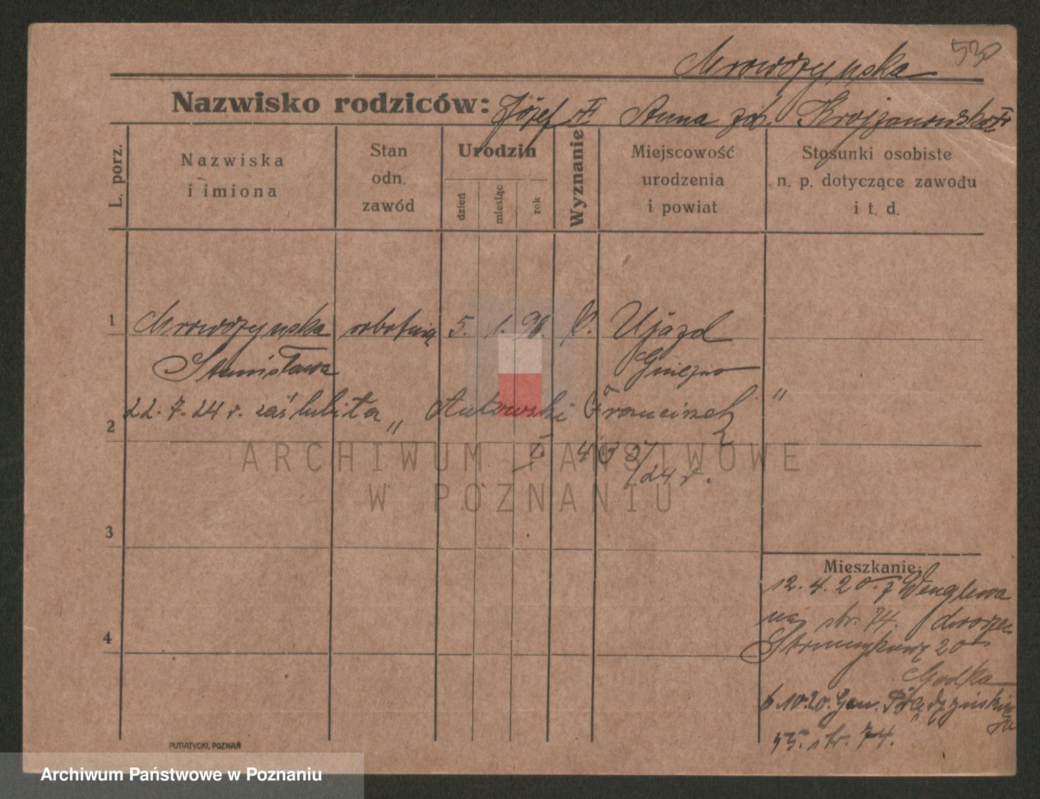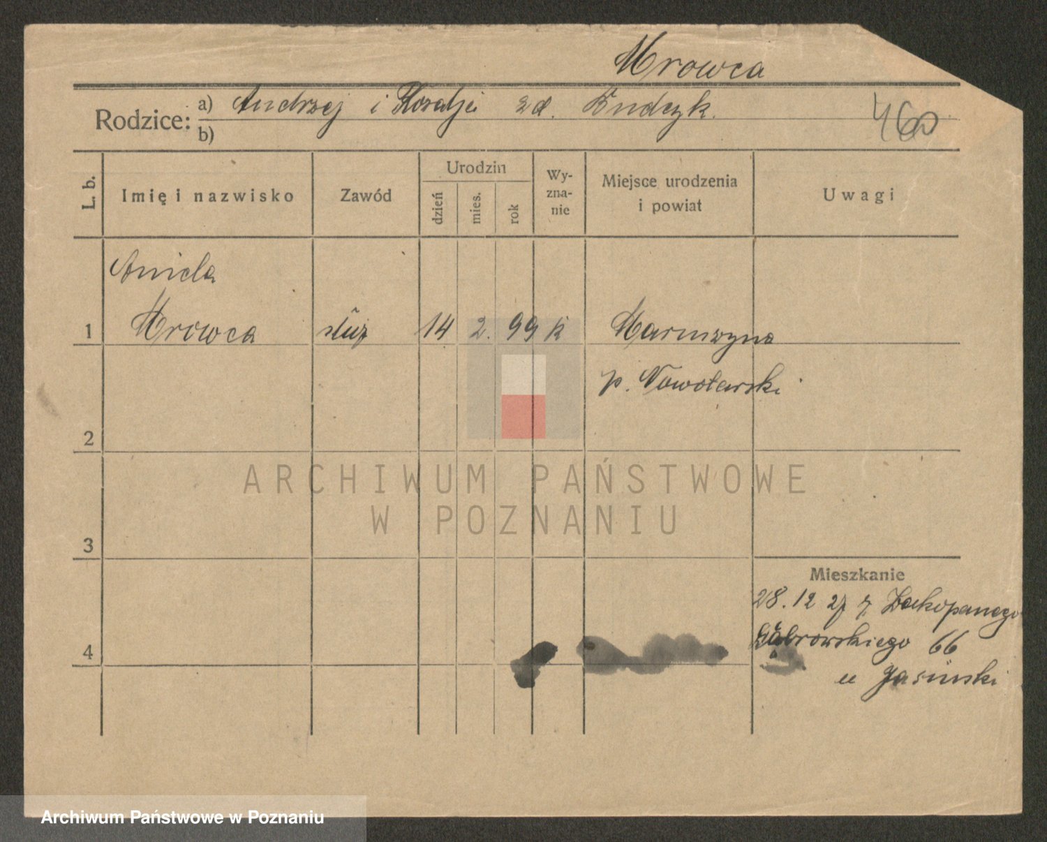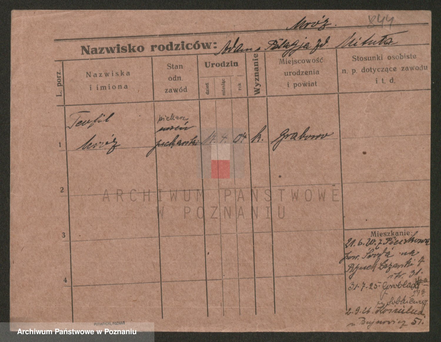Podgląd karty osobowej dostępny jest po kliknięciu na nazwisko lub ikonkę karty. Można dokonywać powiększenia (ikony na górze) lub przechodzić między kolejnymi skanami (strzałki po bokach).