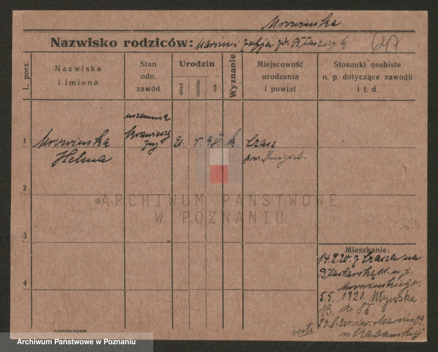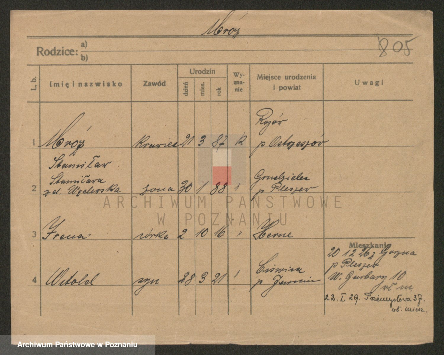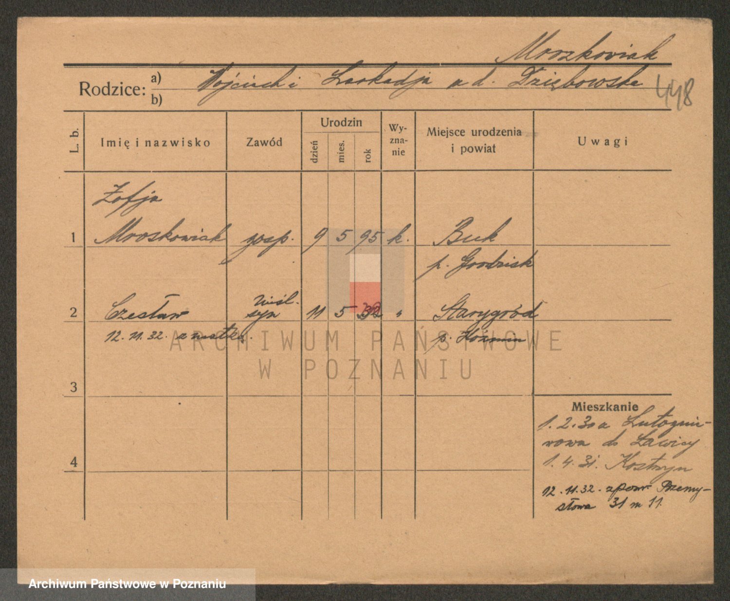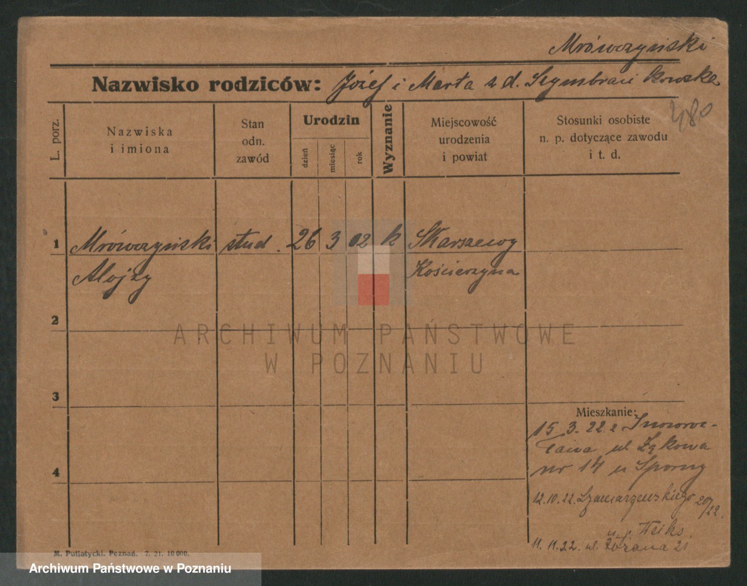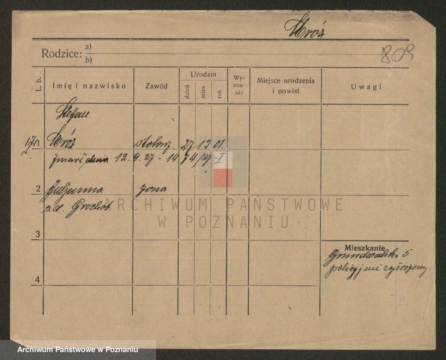 Podgląd karty osobowej dostępny jest po kliknięciu na nazwisko lub ikonkę karty. Można dokonywać powiększenia (ikony na górze) lub przechodzić między kolejnymi skanami (strzałki po bokach).