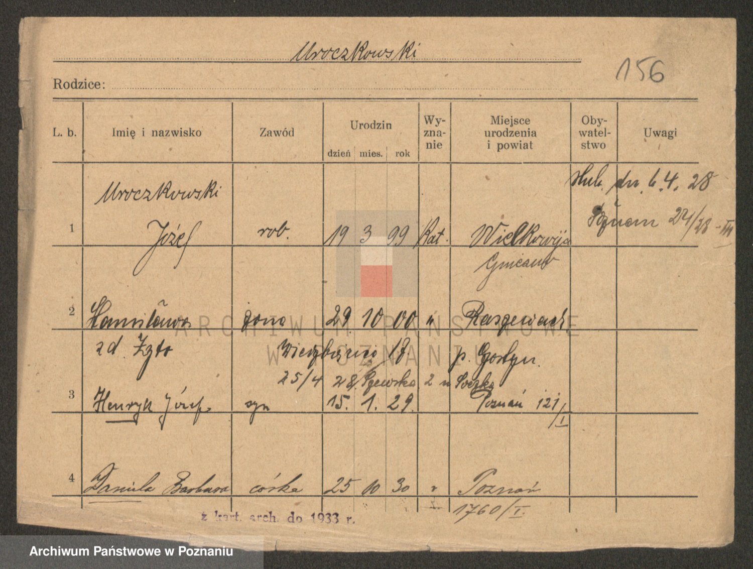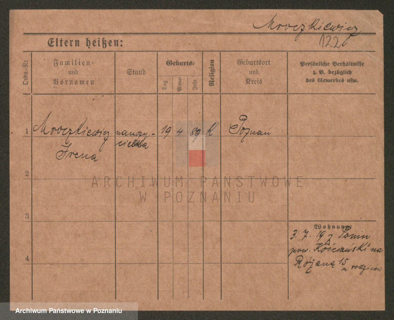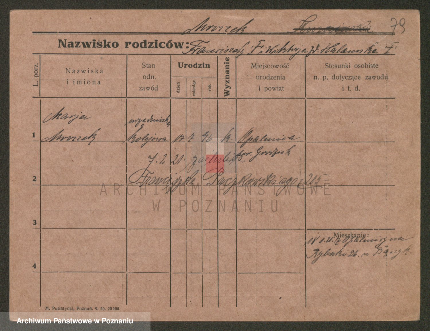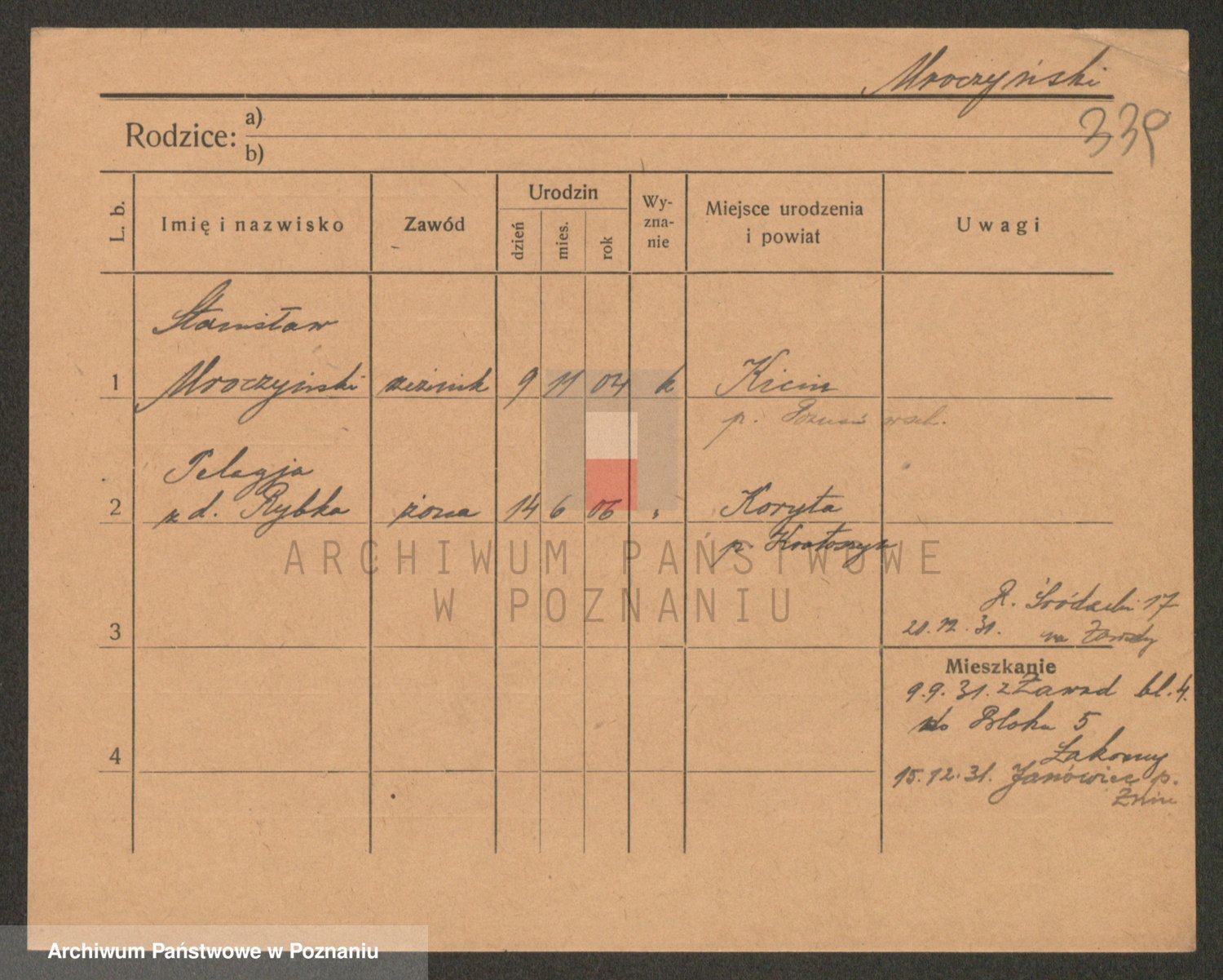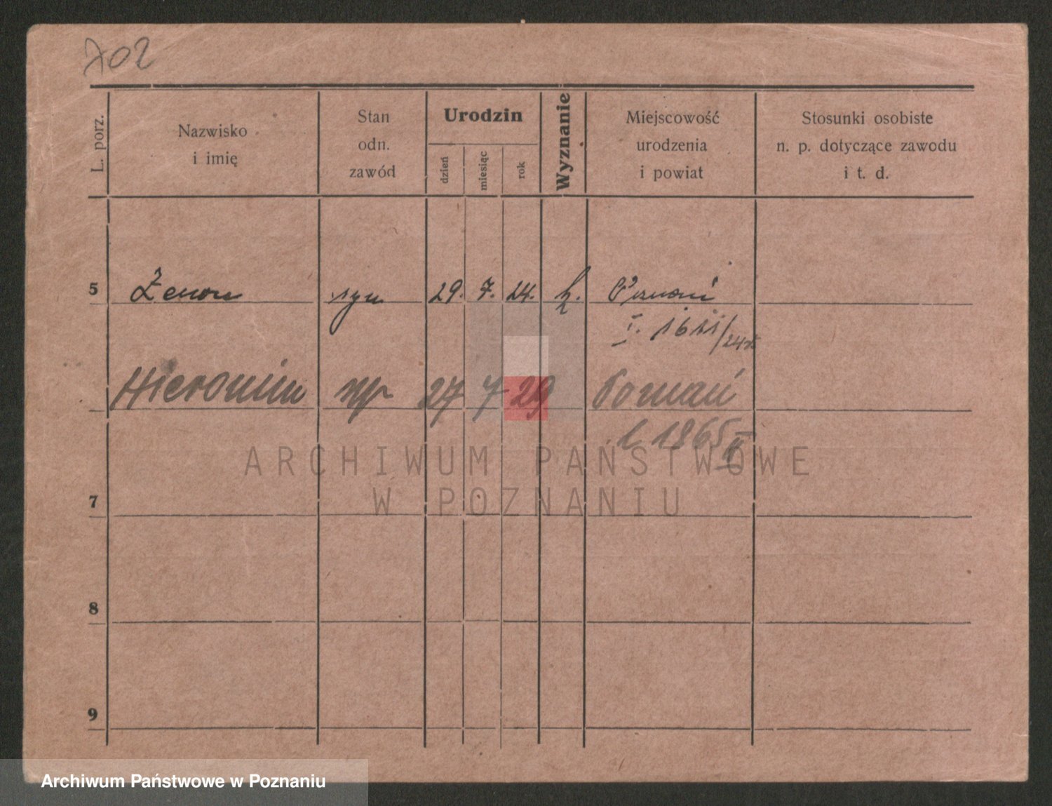 Podgląd karty osobowej dostępny jest po kliknięciu na nazwisko lub ikonkę karty. Można dokonywać powiększenia (ikony na górze) lub przechodzić między kolejnymi skanami (strzałki po bokach).