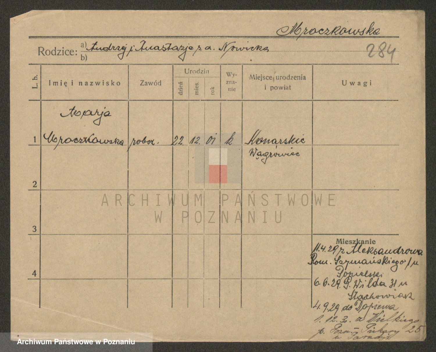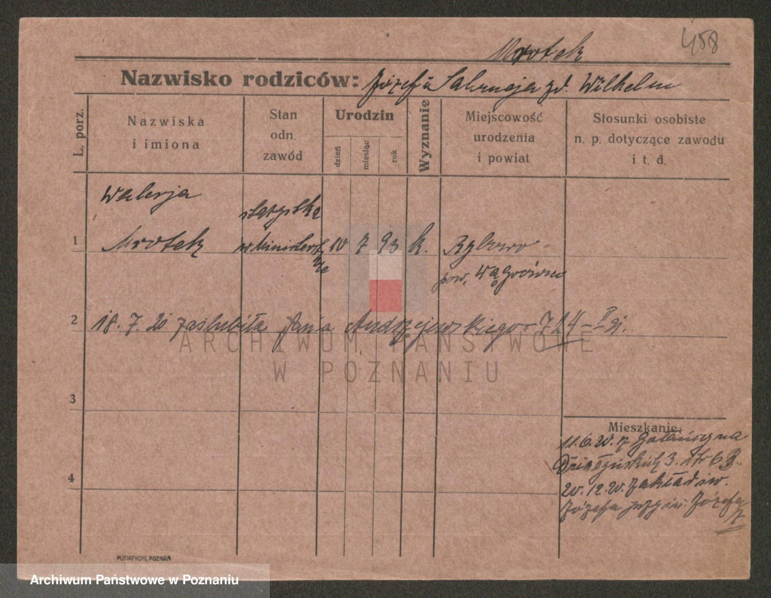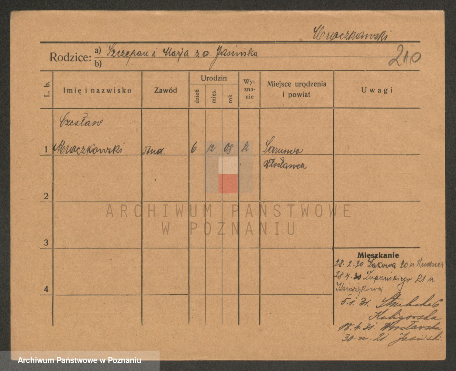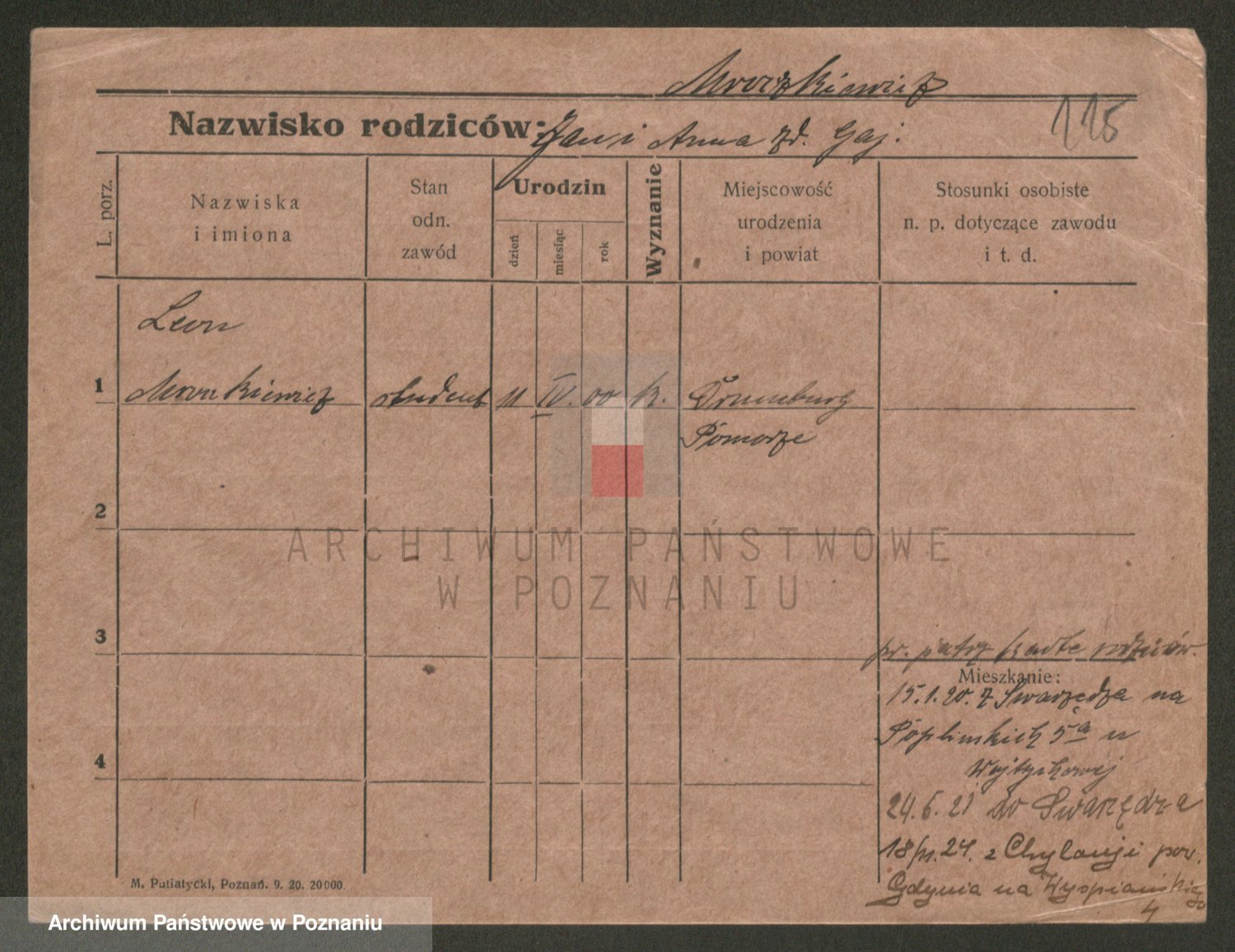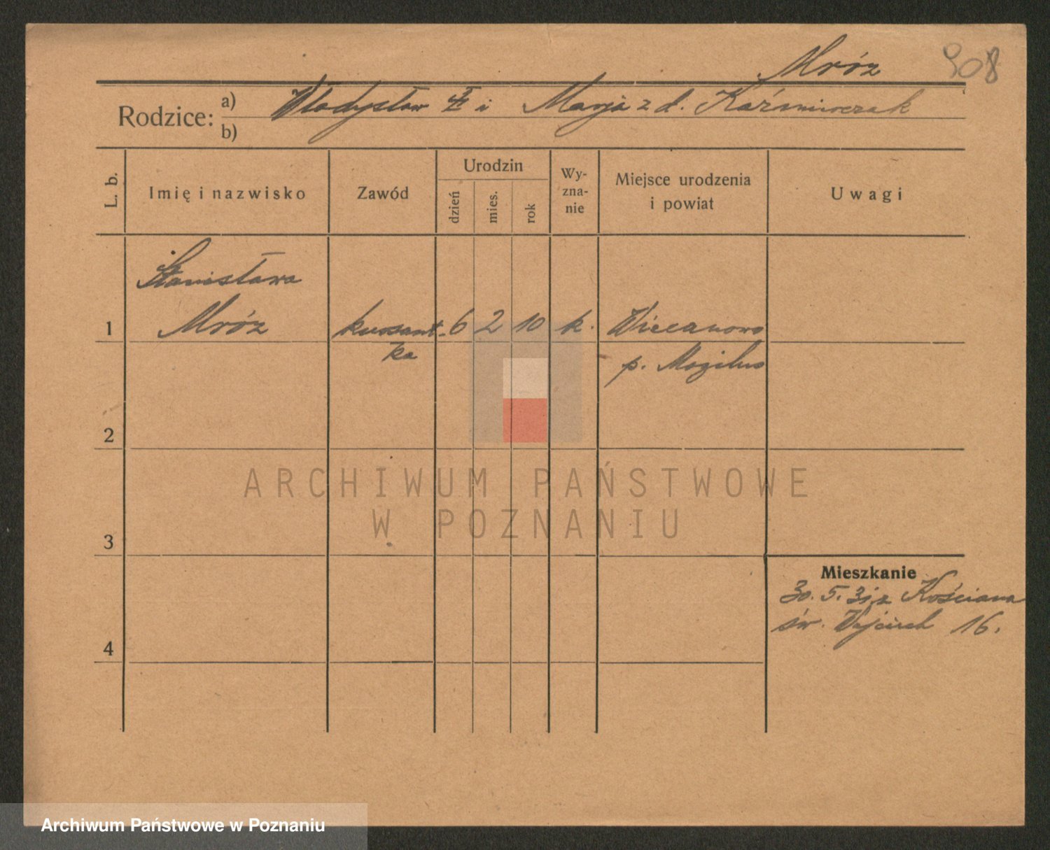 Podgląd karty osobowej dostępny jest po kliknięciu na nazwisko lub ikonkę karty. Można dokonywać powiększenia (ikony na górze) lub przechodzić między kolejnymi skanami (strzałki po bokach).