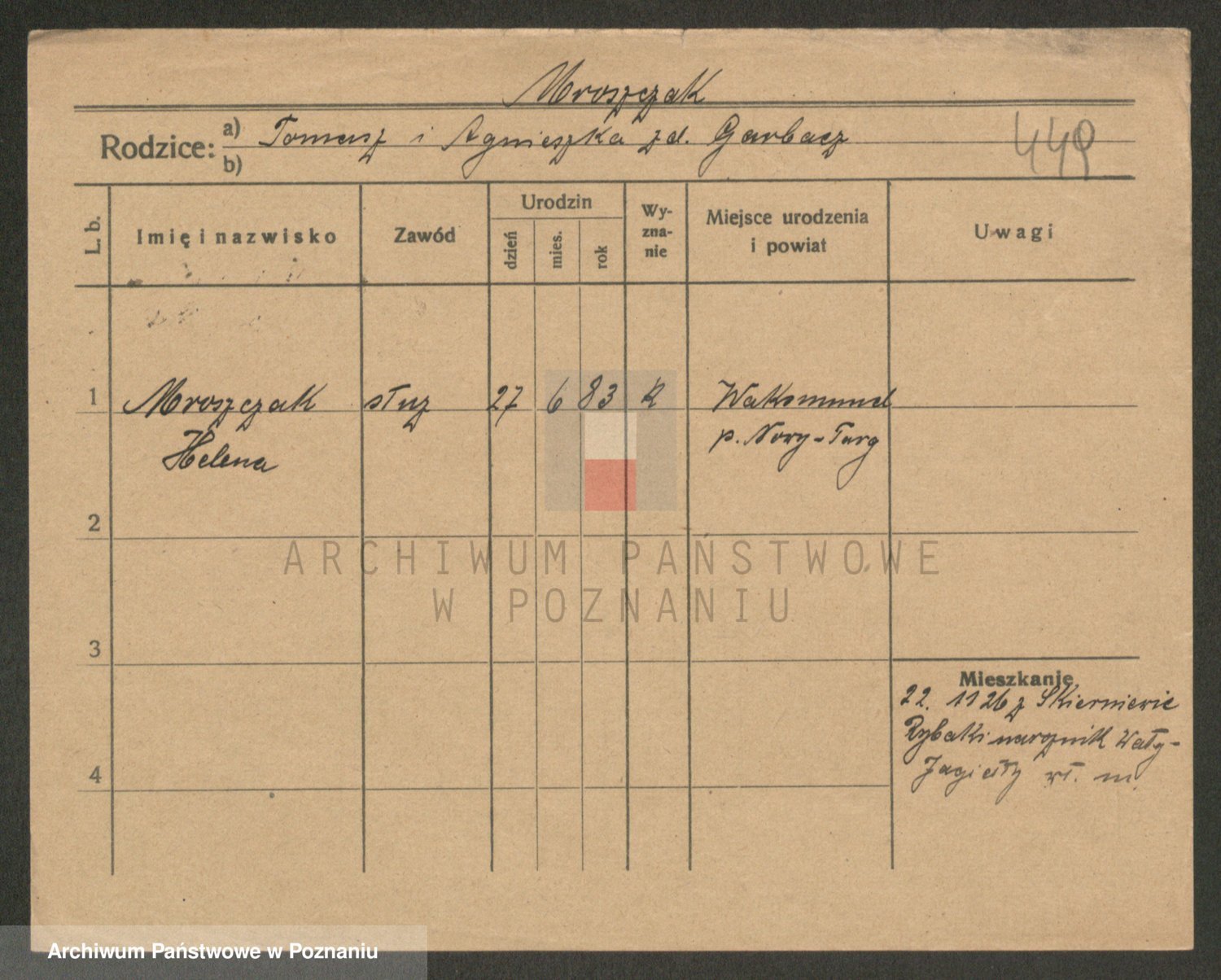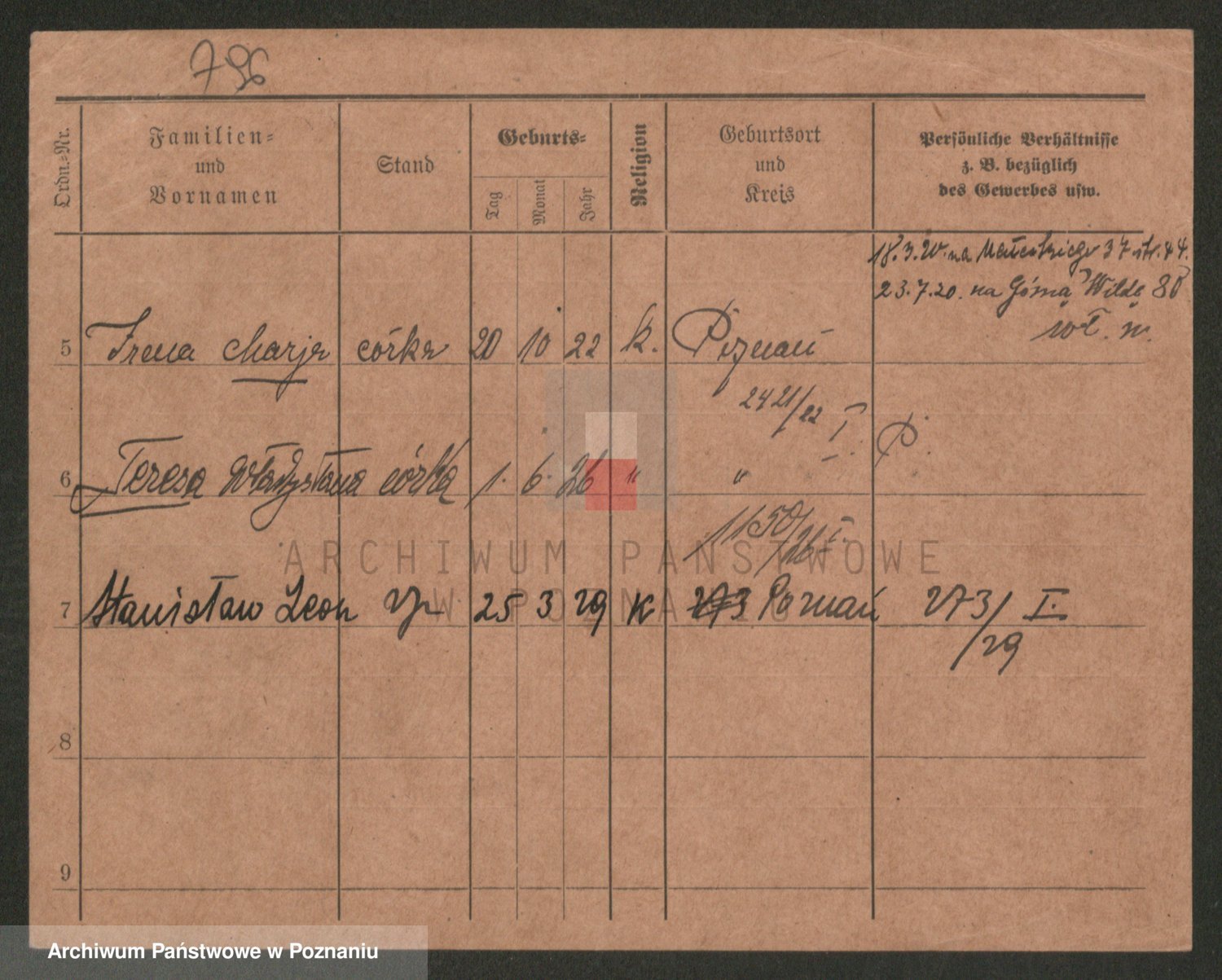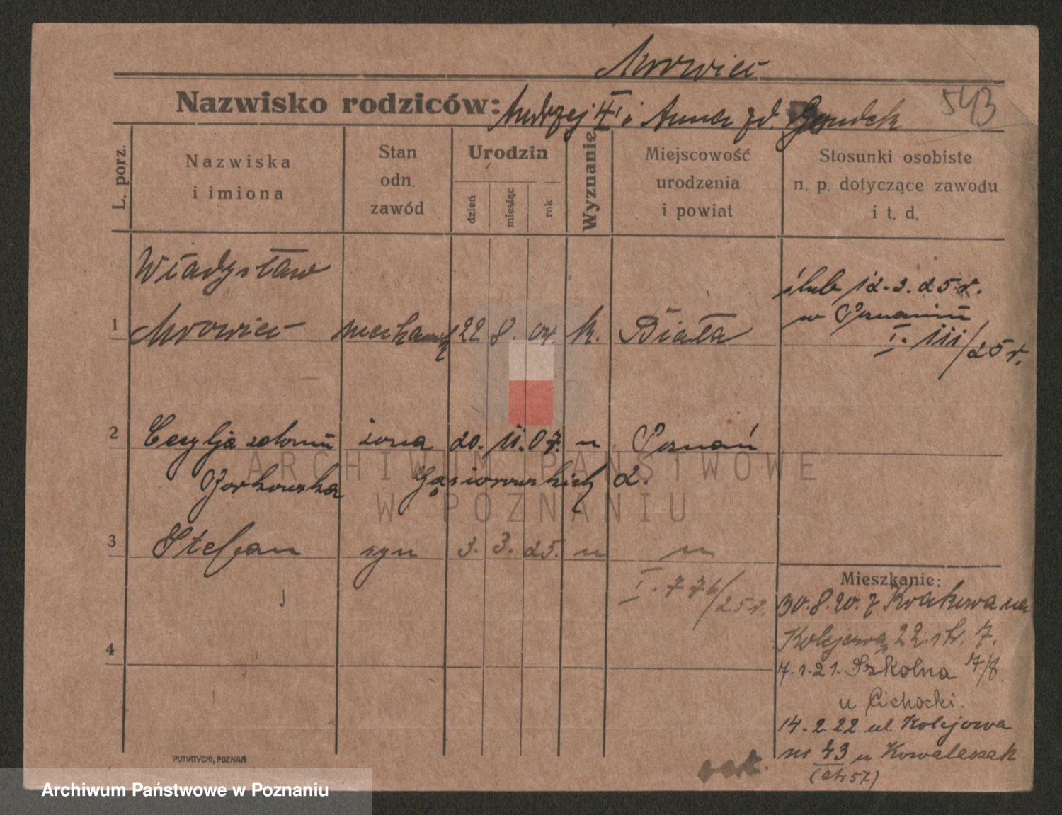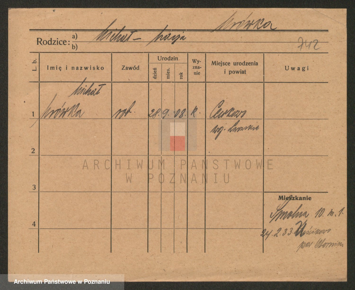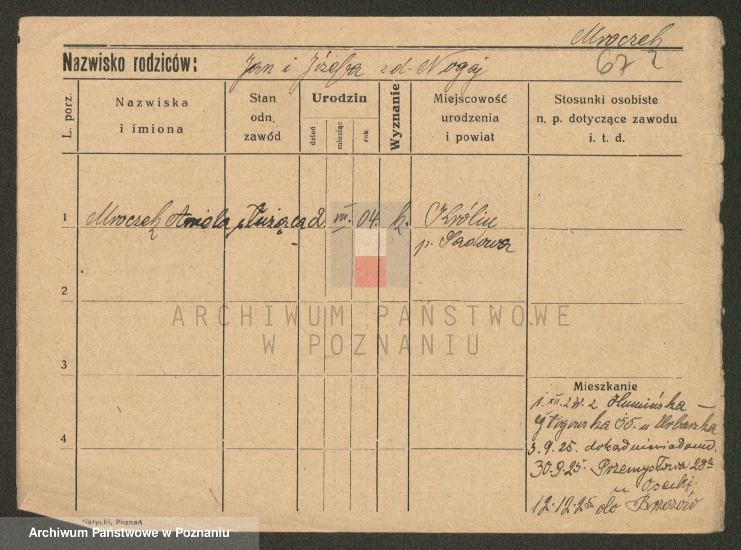 Podgląd karty osobowej dostępny jest po kliknięciu na nazwisko lub ikonkę karty. Można dokonywać powiększenia (ikony na górze) lub przechodzić między kolejnymi skanami (strzałki po bokach).