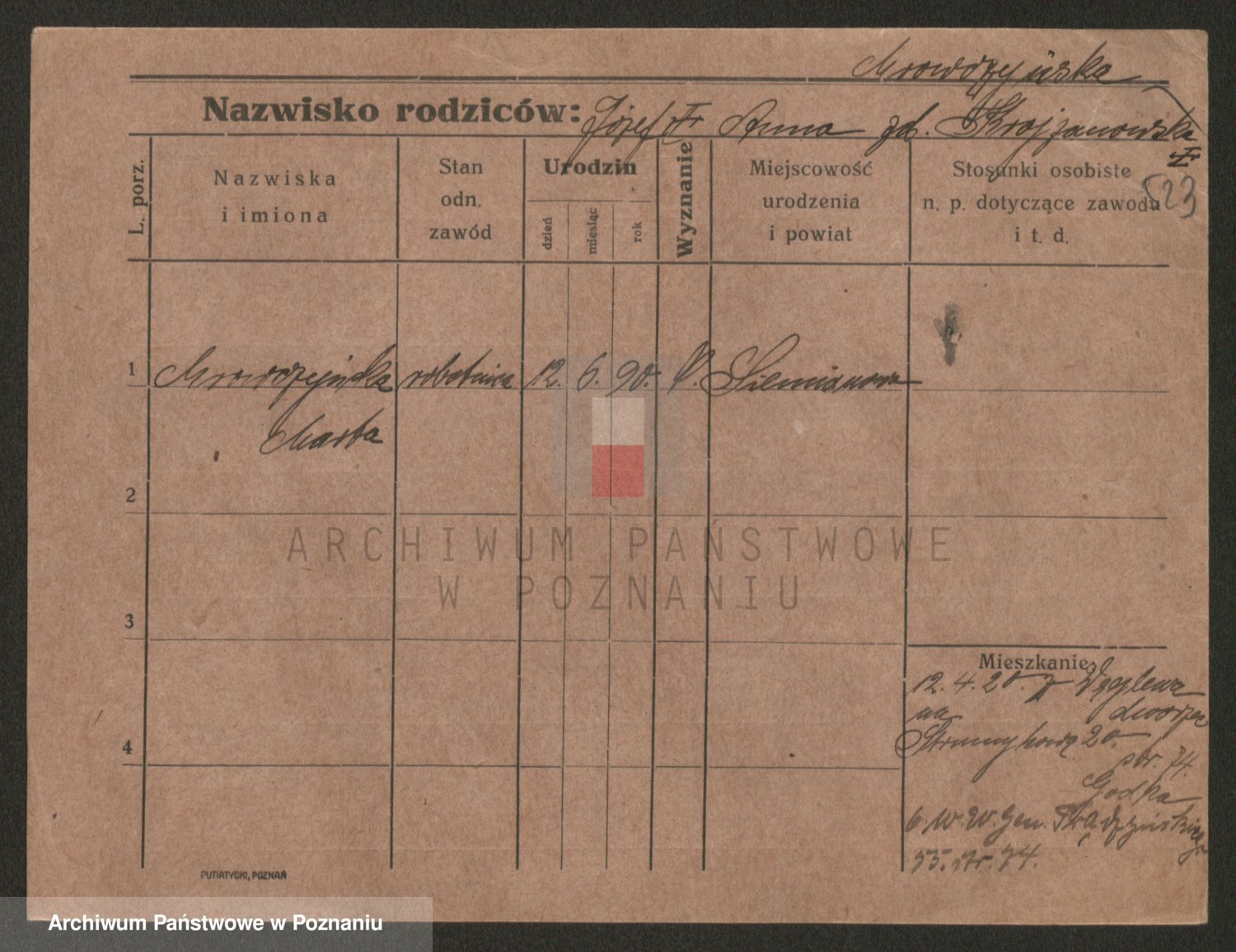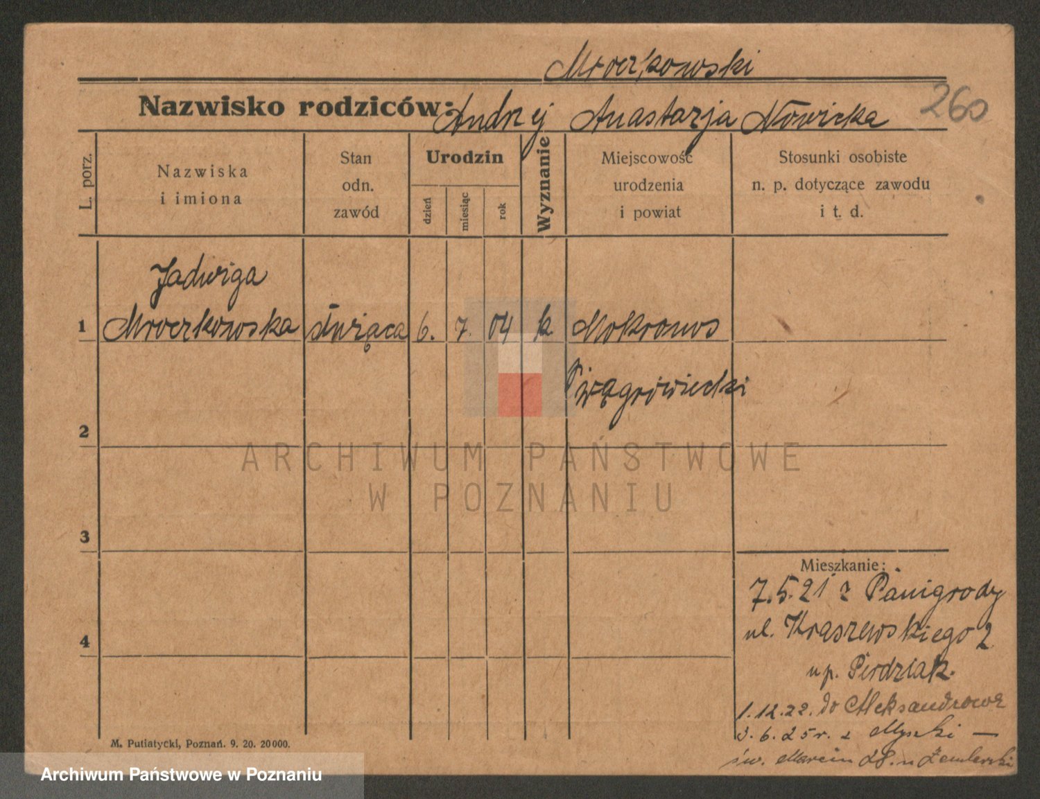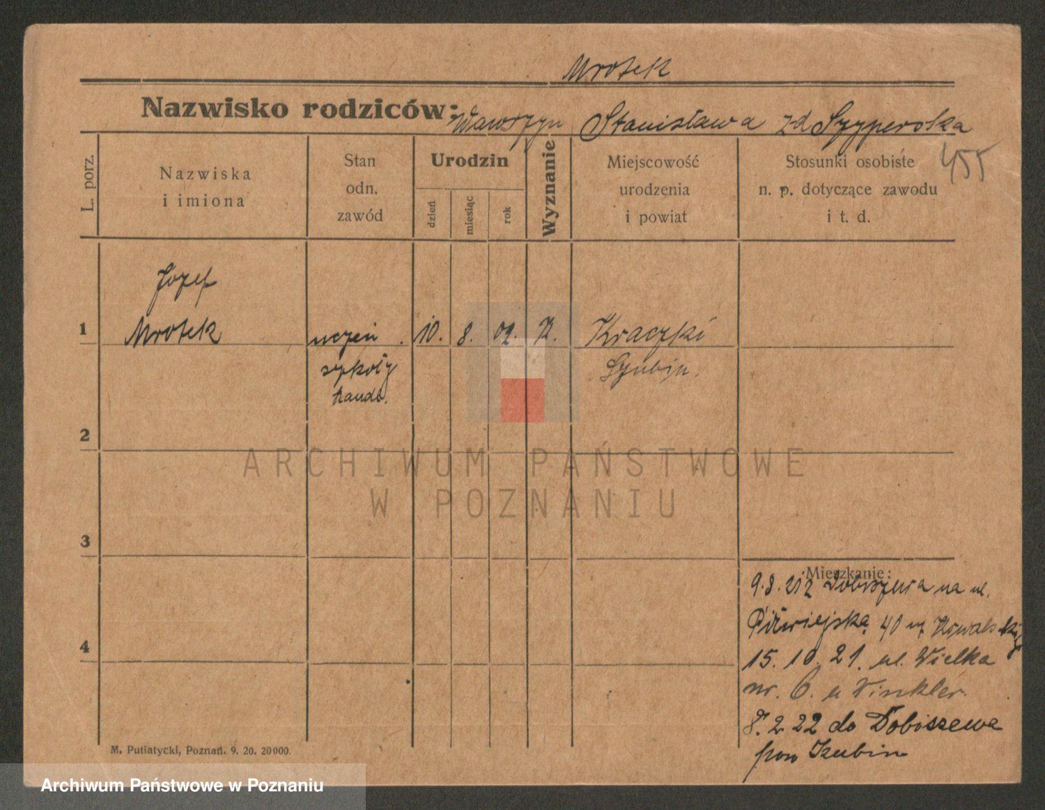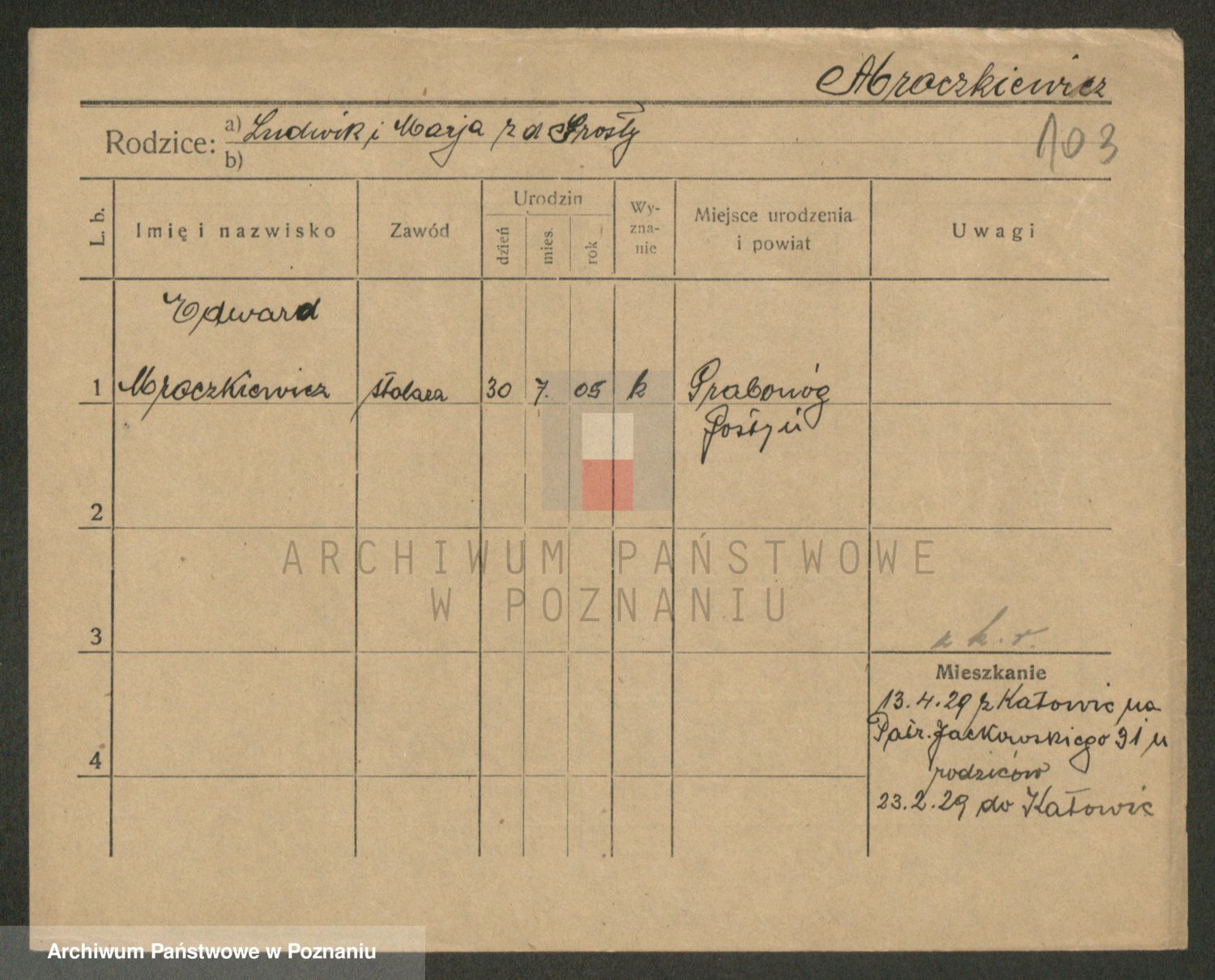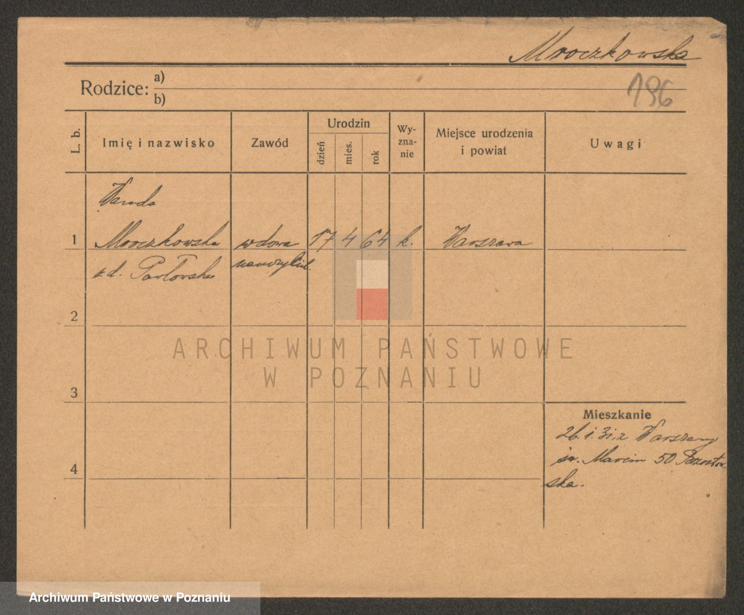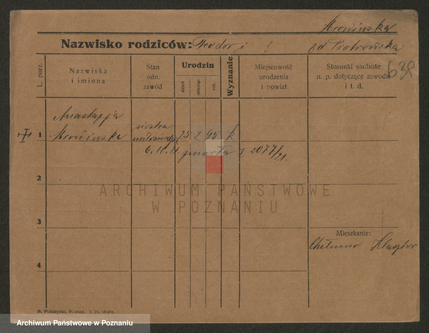 Podgląd karty osobowej dostępny jest po kliknięciu na nazwisko lub ikonkę karty. Można dokonywać powiększenia (ikony na górze) lub przechodzić między kolejnymi skanami (strzałki po bokach).