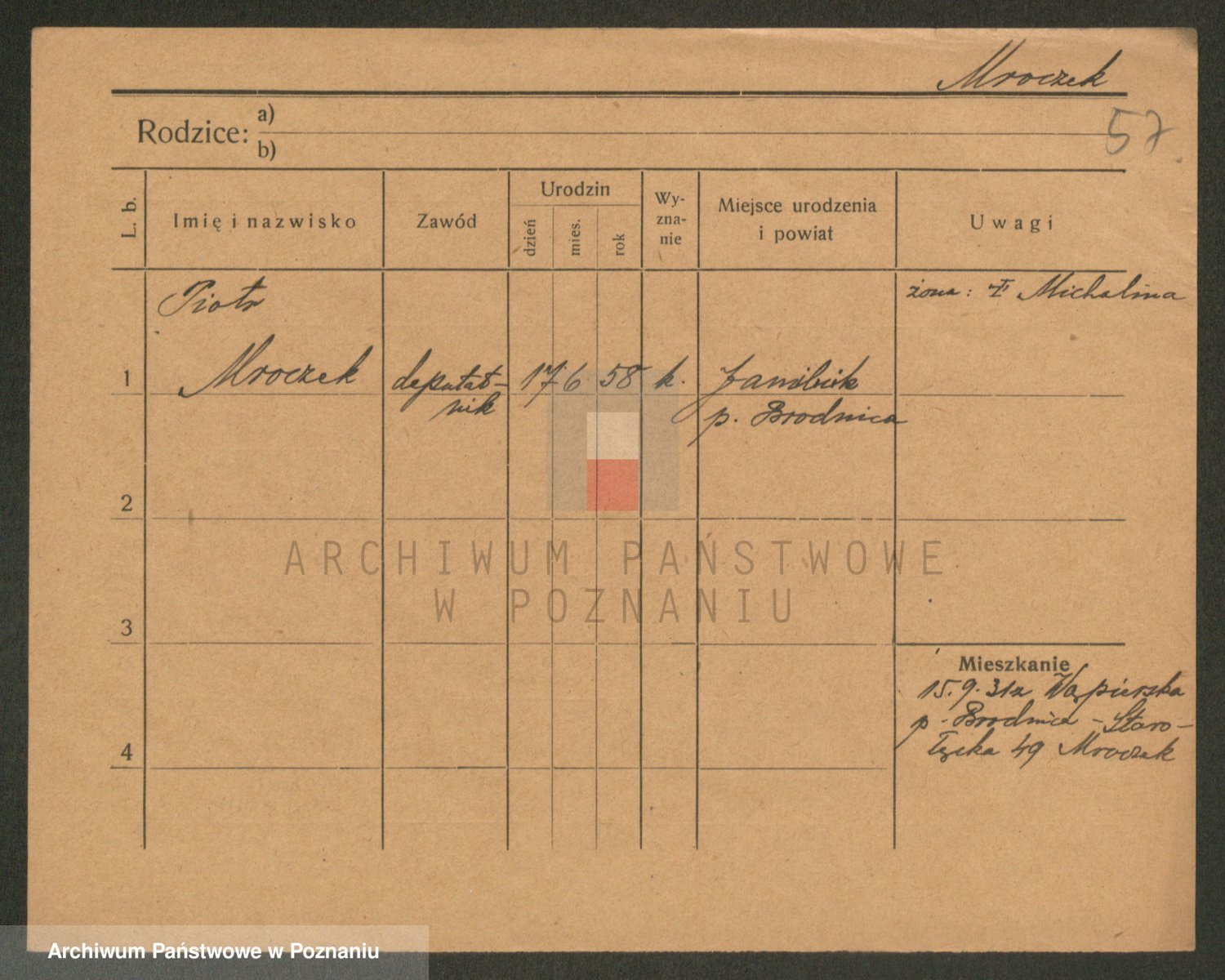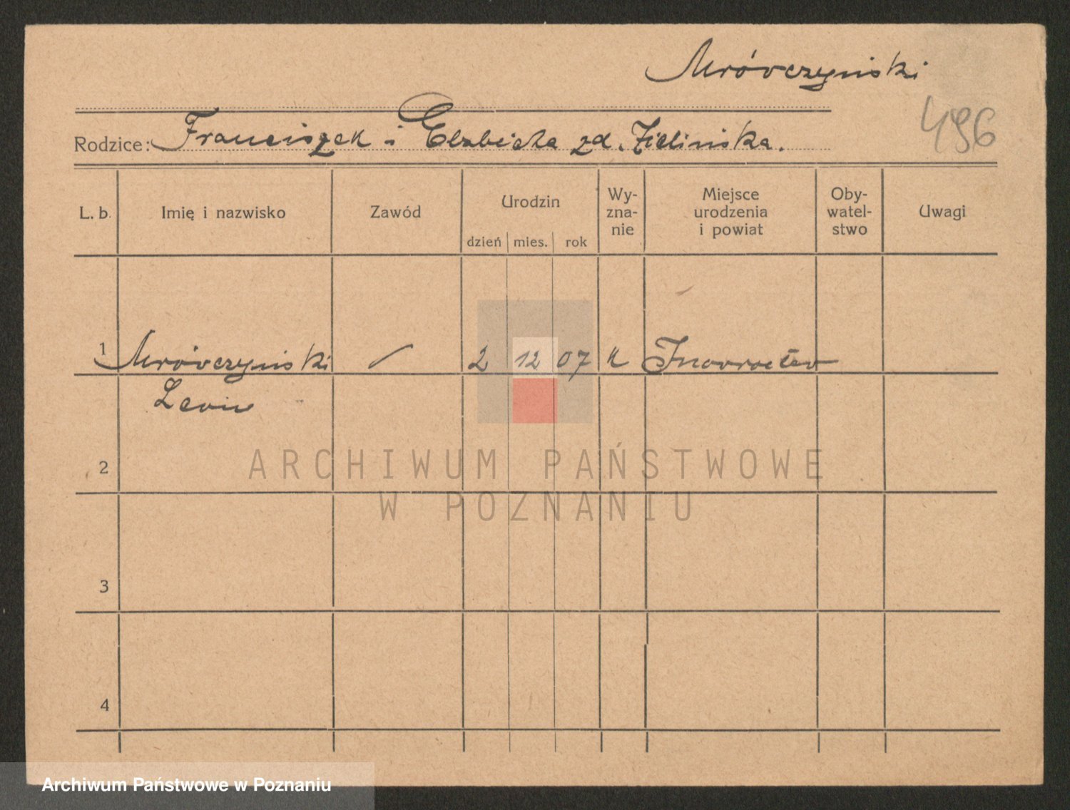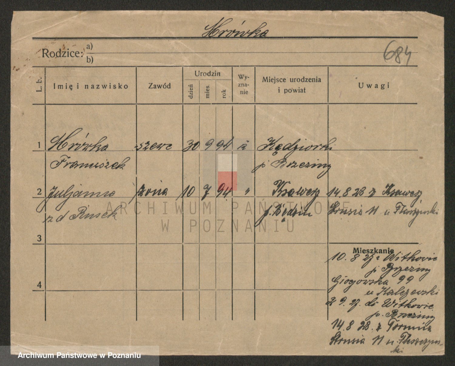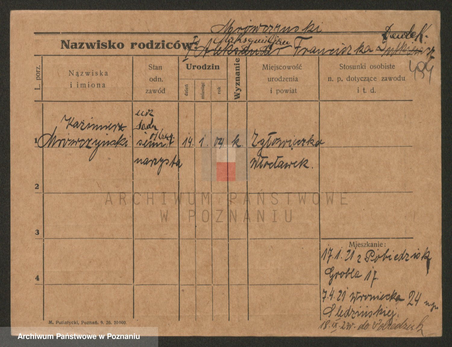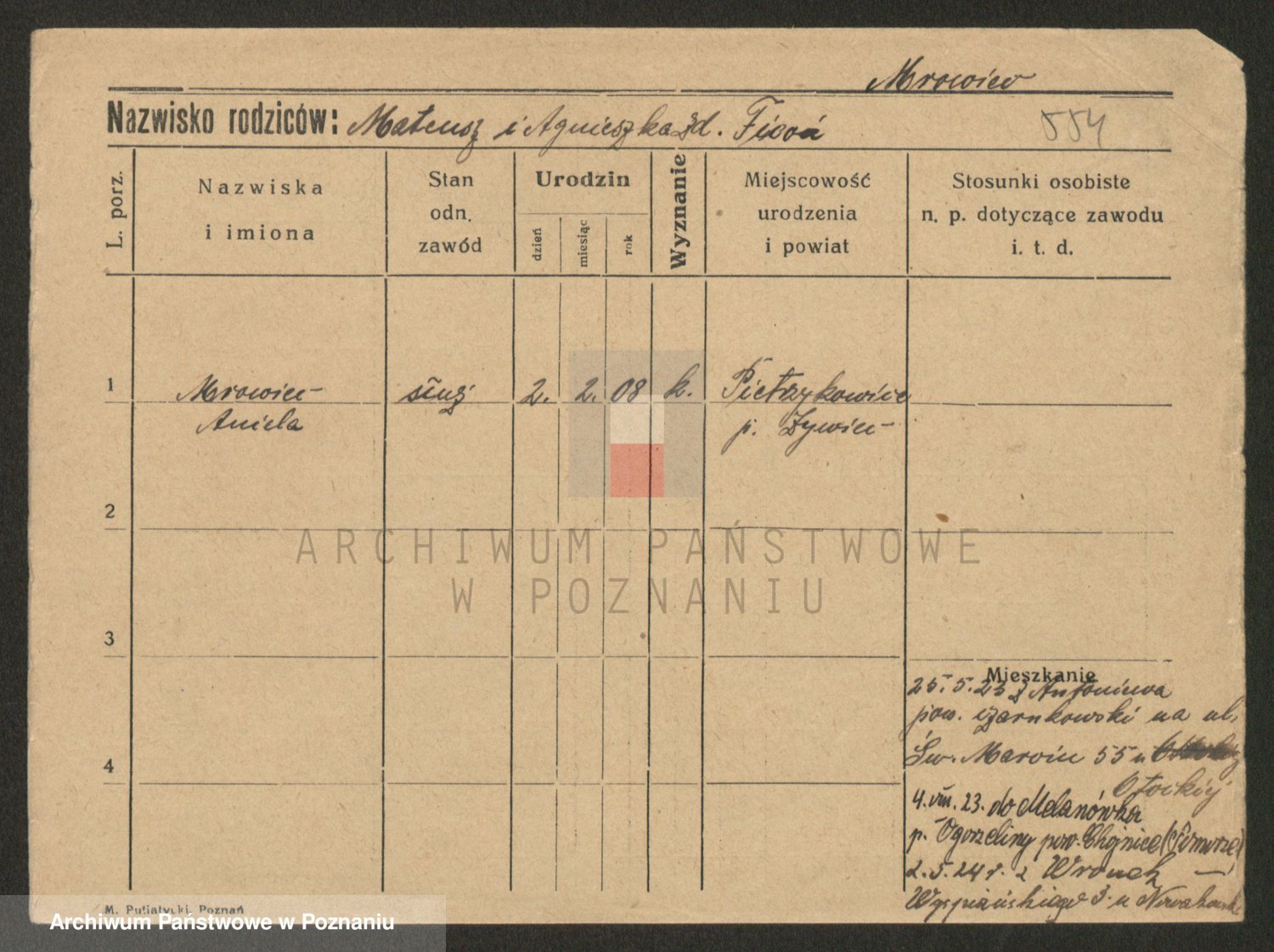 Podgląd karty osobowej dostępny jest po kliknięciu na nazwisko lub ikonkę karty. Można dokonywać powiększenia (ikony na górze) lub przechodzić między kolejnymi skanami (strzałki po bokach).
