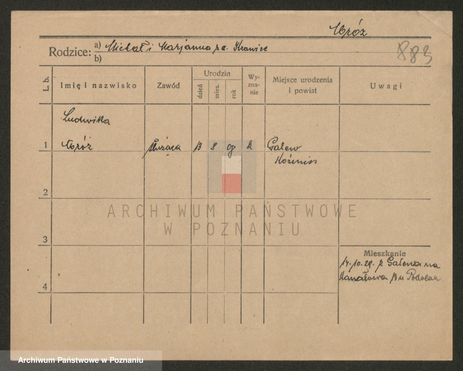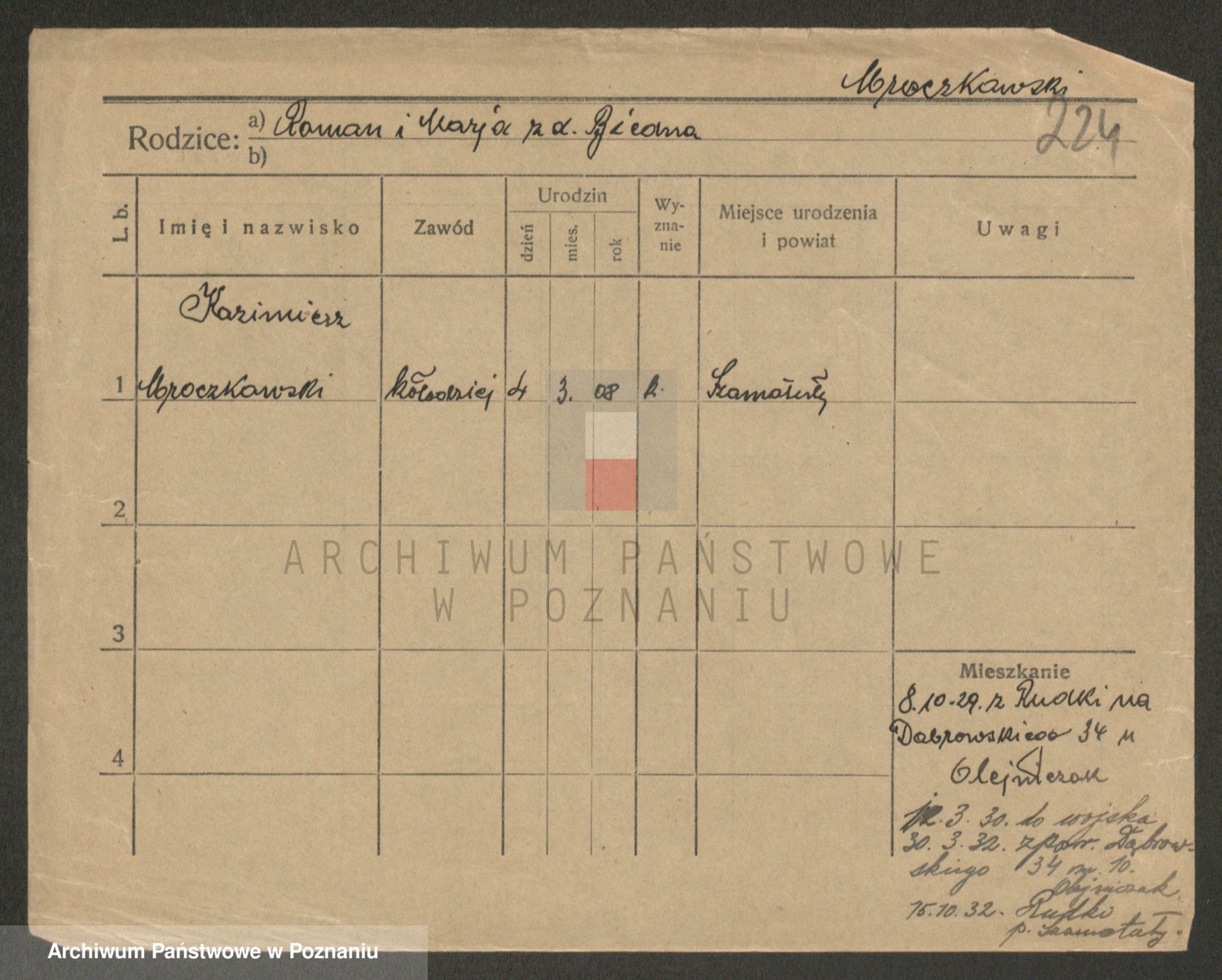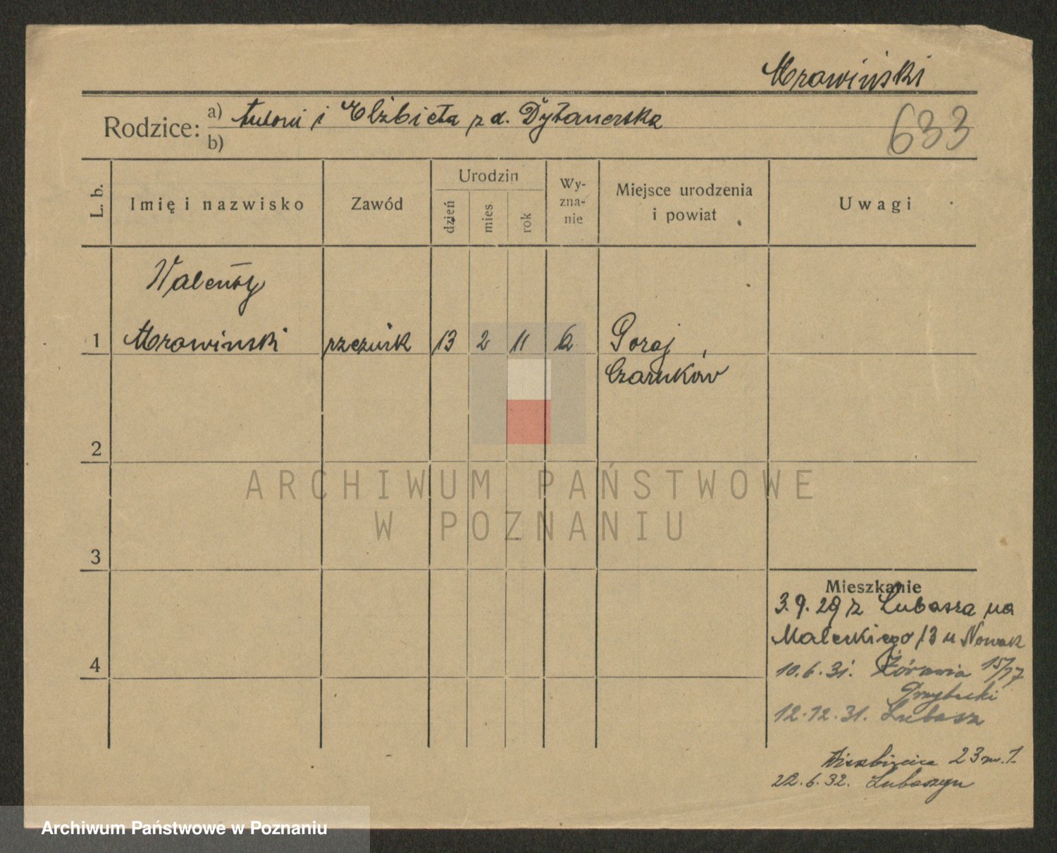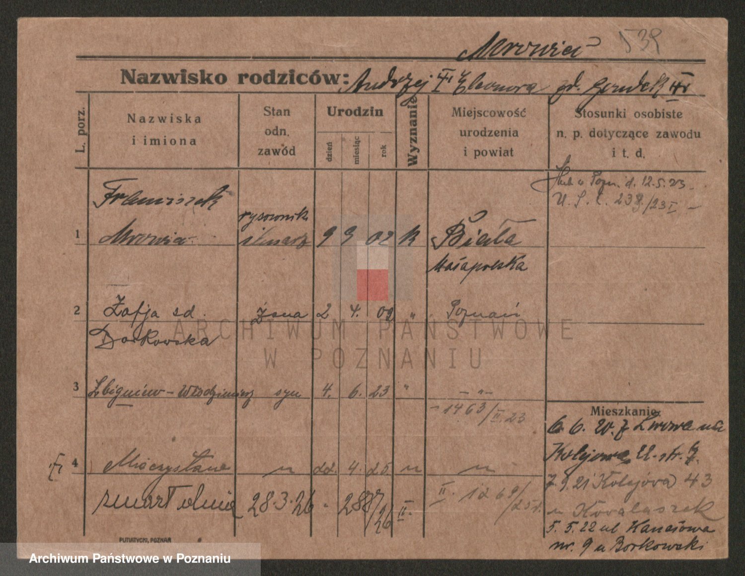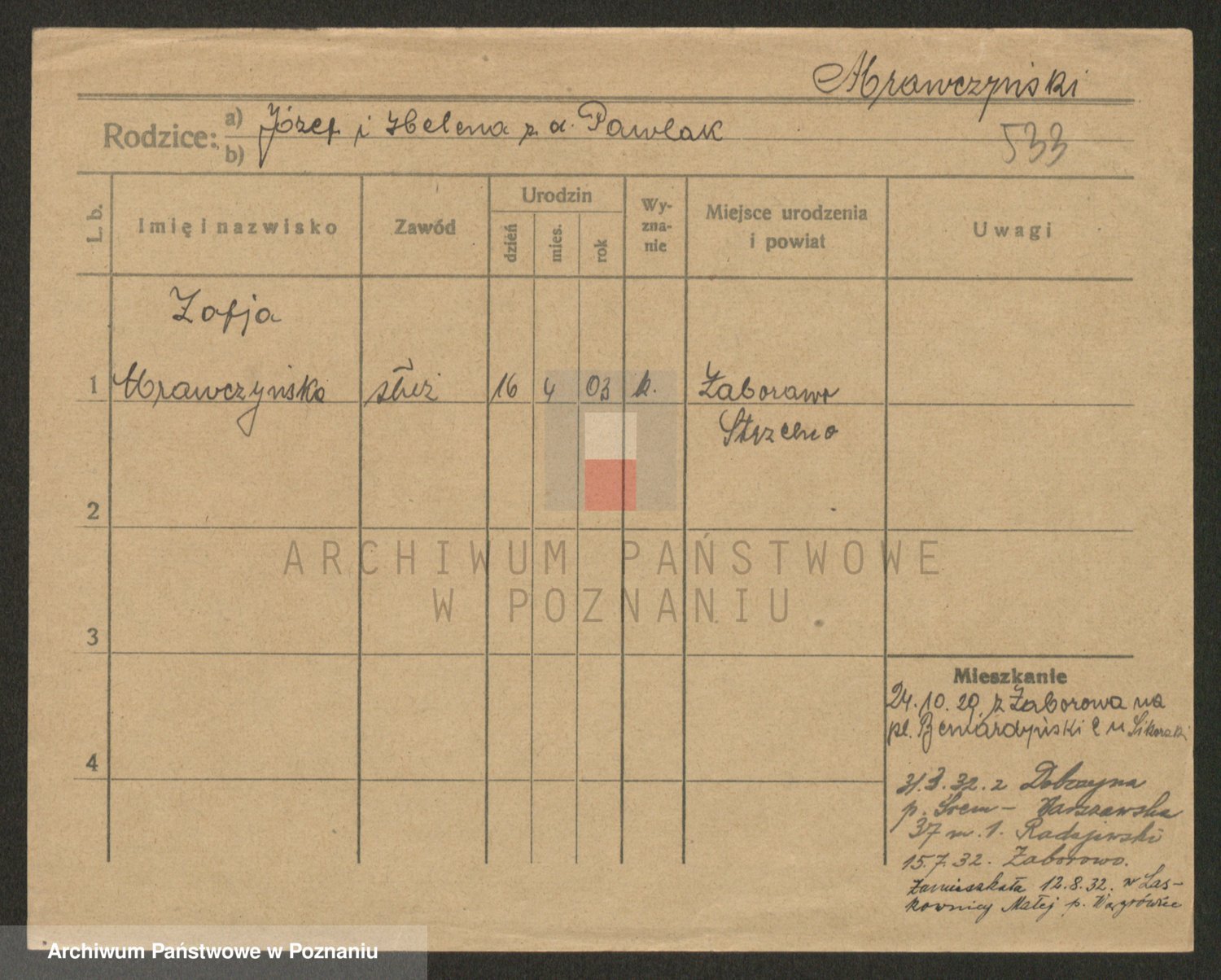 Podgląd karty osobowej dostępny jest po kliknięciu na nazwisko lub ikonkę karty. Można dokonywać powiększenia (ikony na górze) lub przechodzić między kolejnymi skanami (strzałki po bokach).