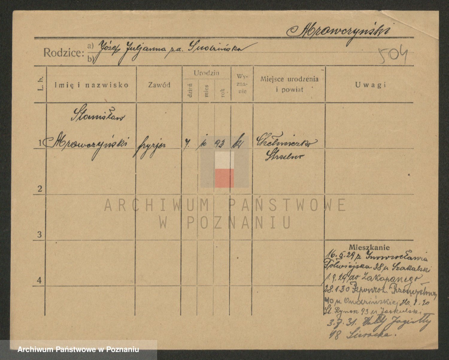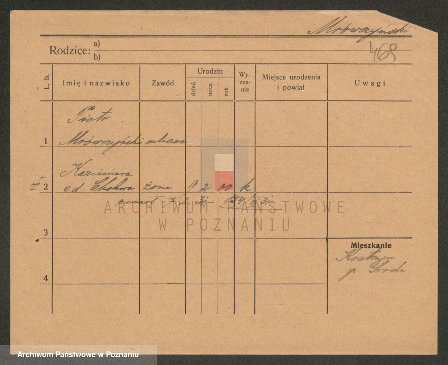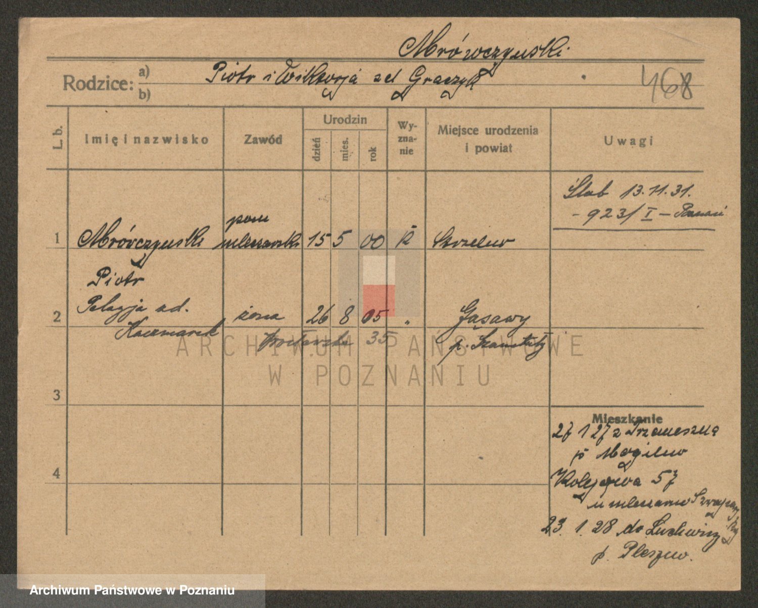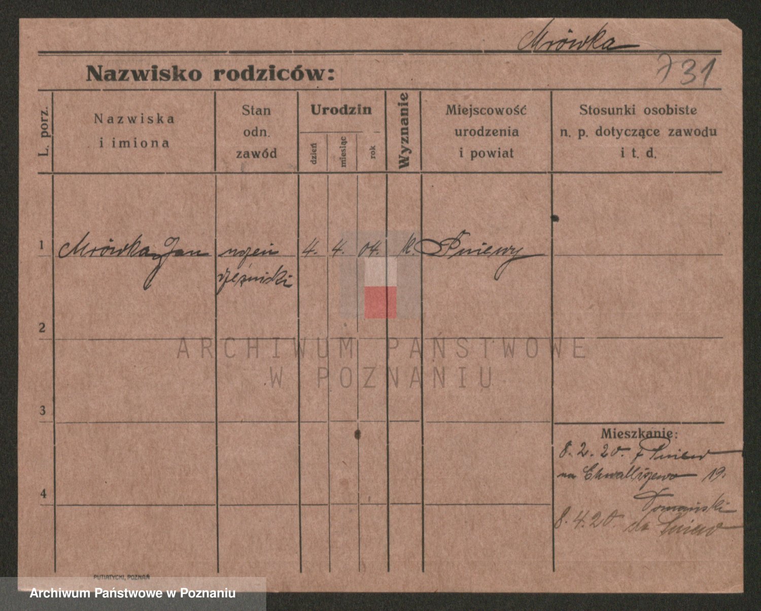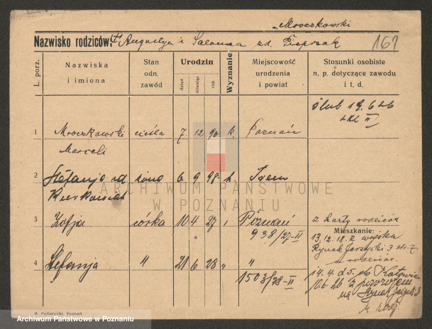 Podgląd karty osobowej dostępny jest po kliknięciu na nazwisko lub ikonkę karty. Można dokonywać powiększenia (ikony na górze) lub przechodzić między kolejnymi skanami (strzałki po bokach).
