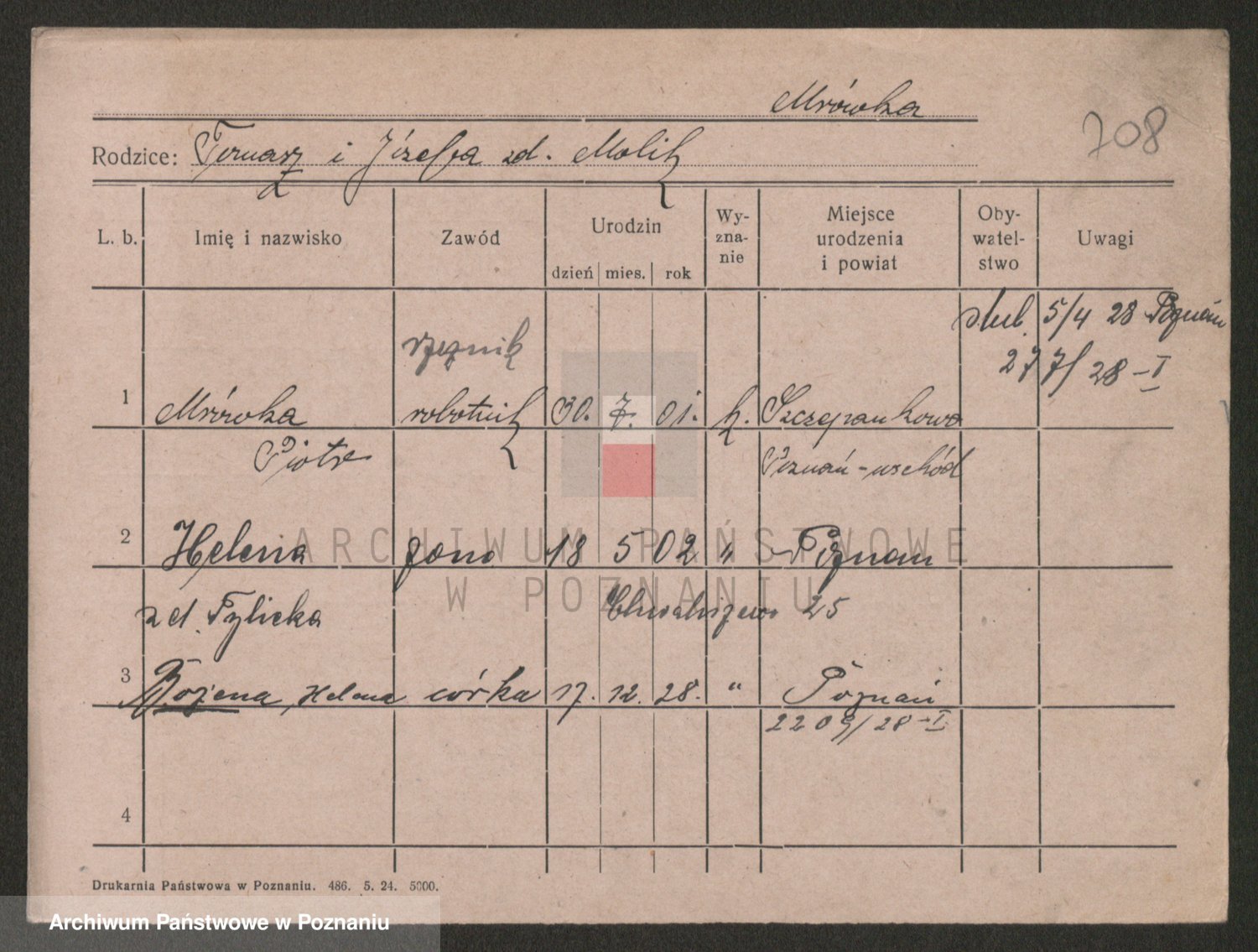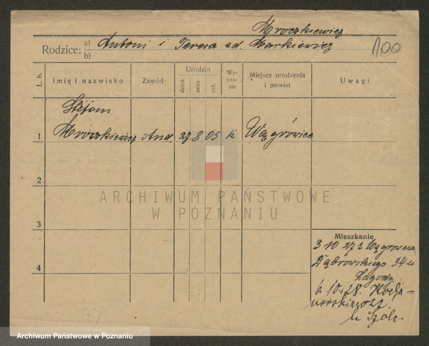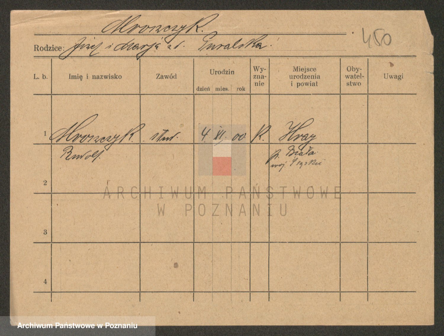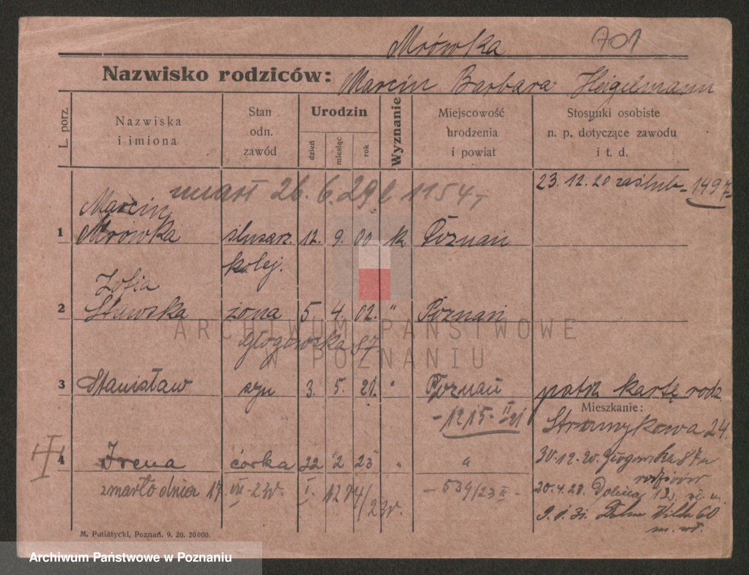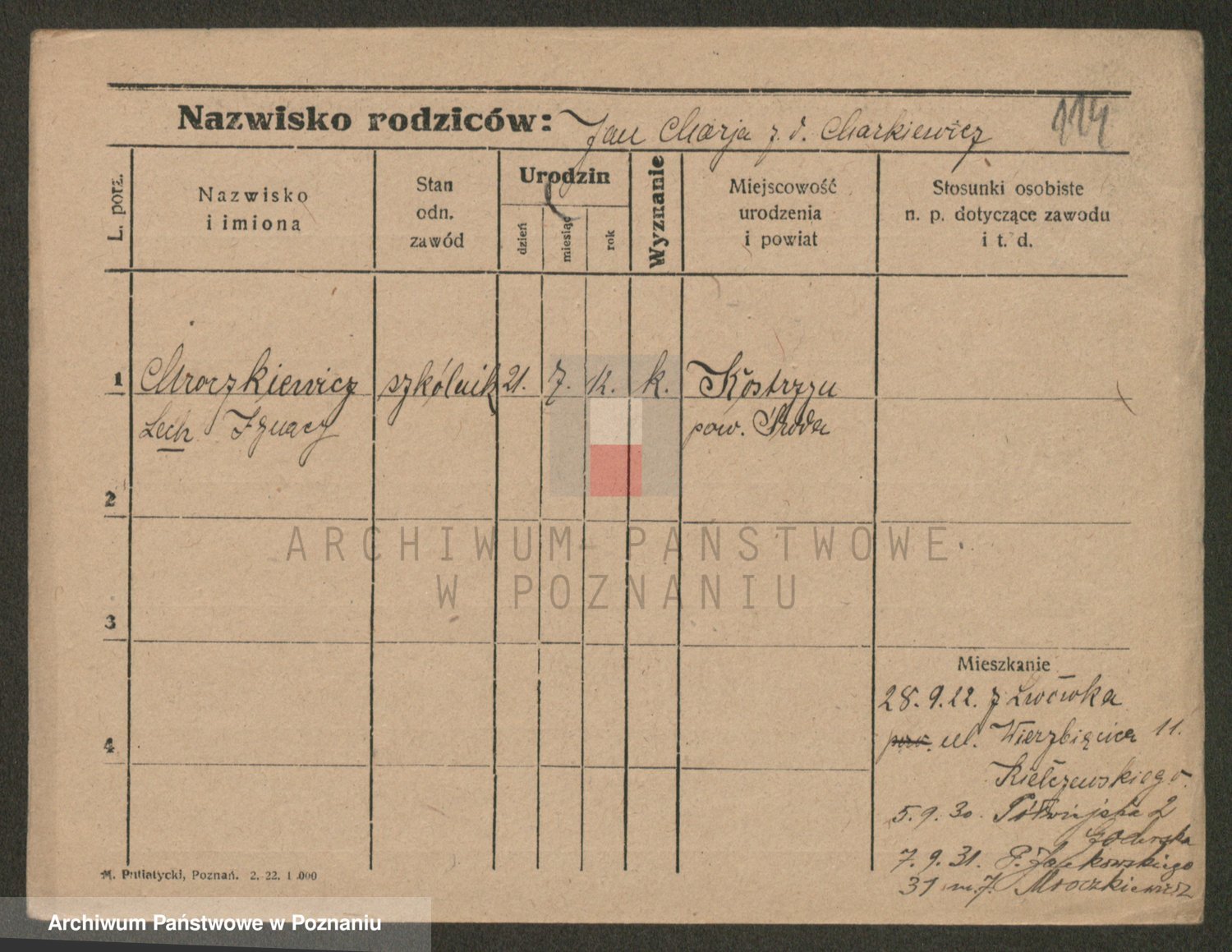Podgląd karty osobowej dostępny jest po kliknięciu na nazwisko lub ikonkę karty. Można dokonywać powiększenia (ikony na górze) lub przechodzić między kolejnymi skanami (strzałki po bokach).