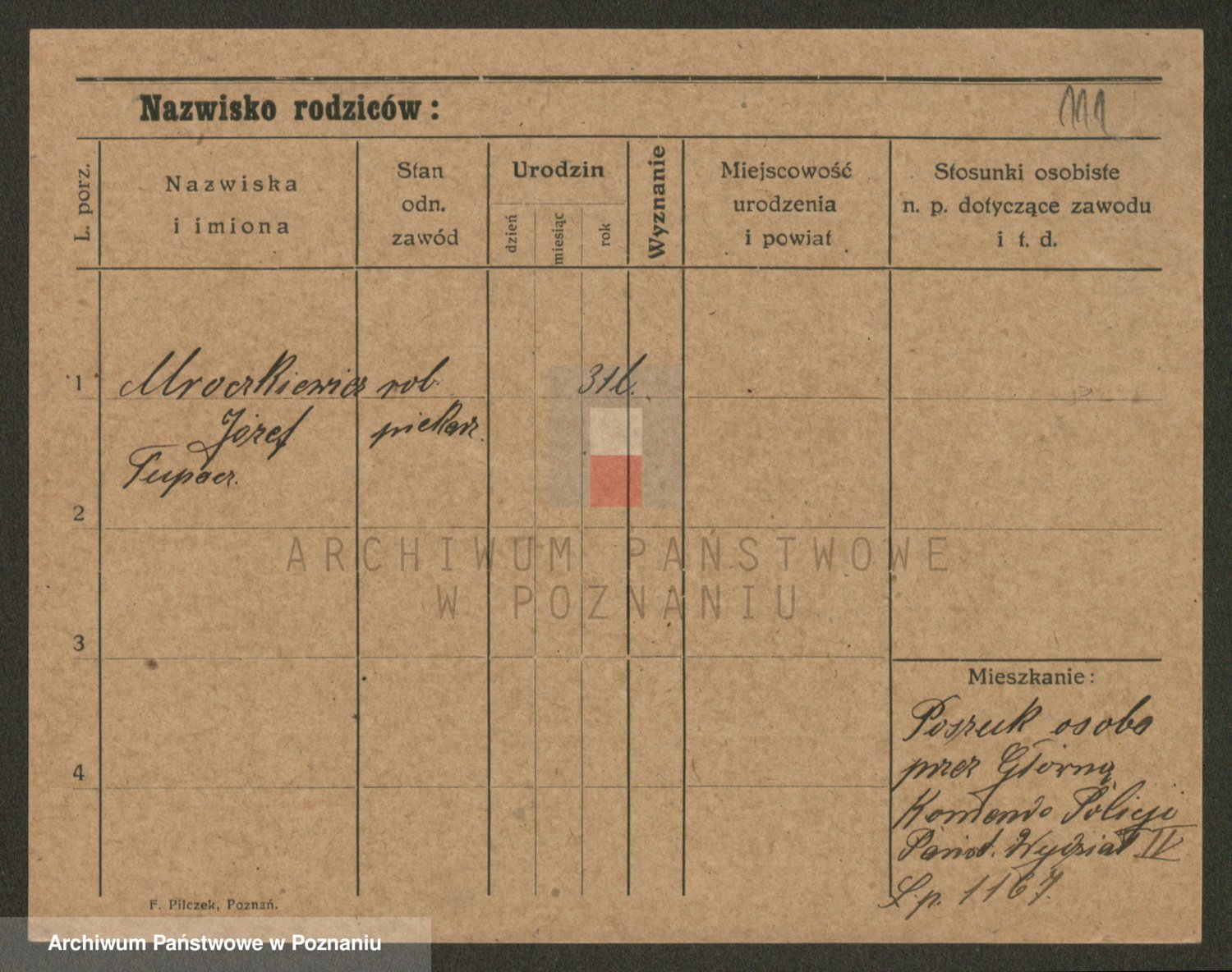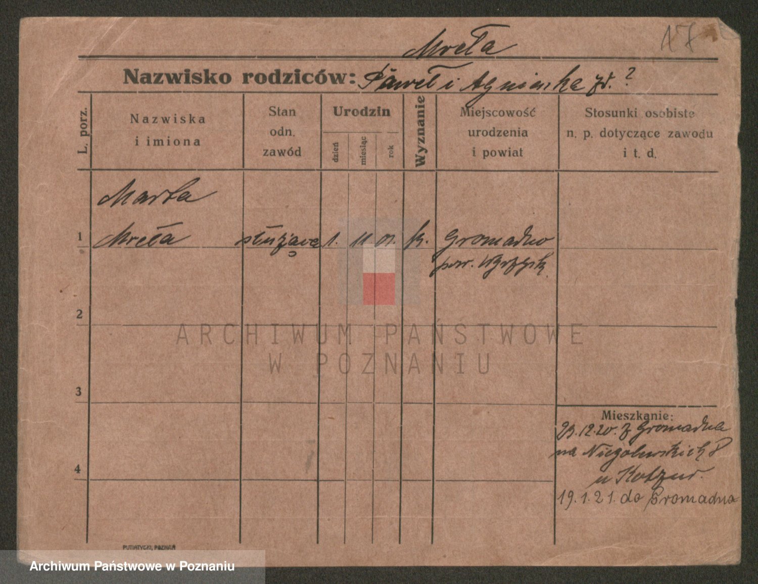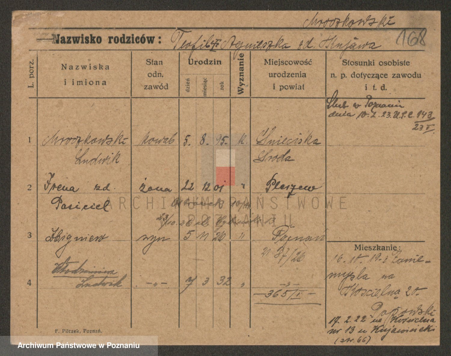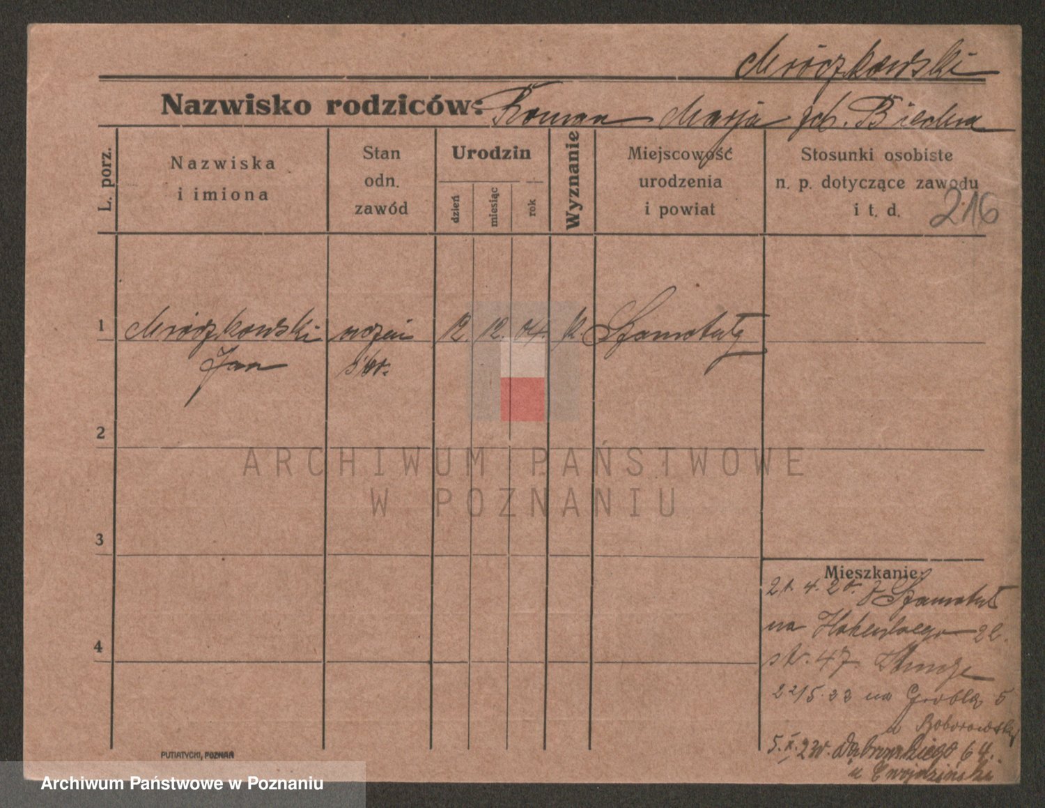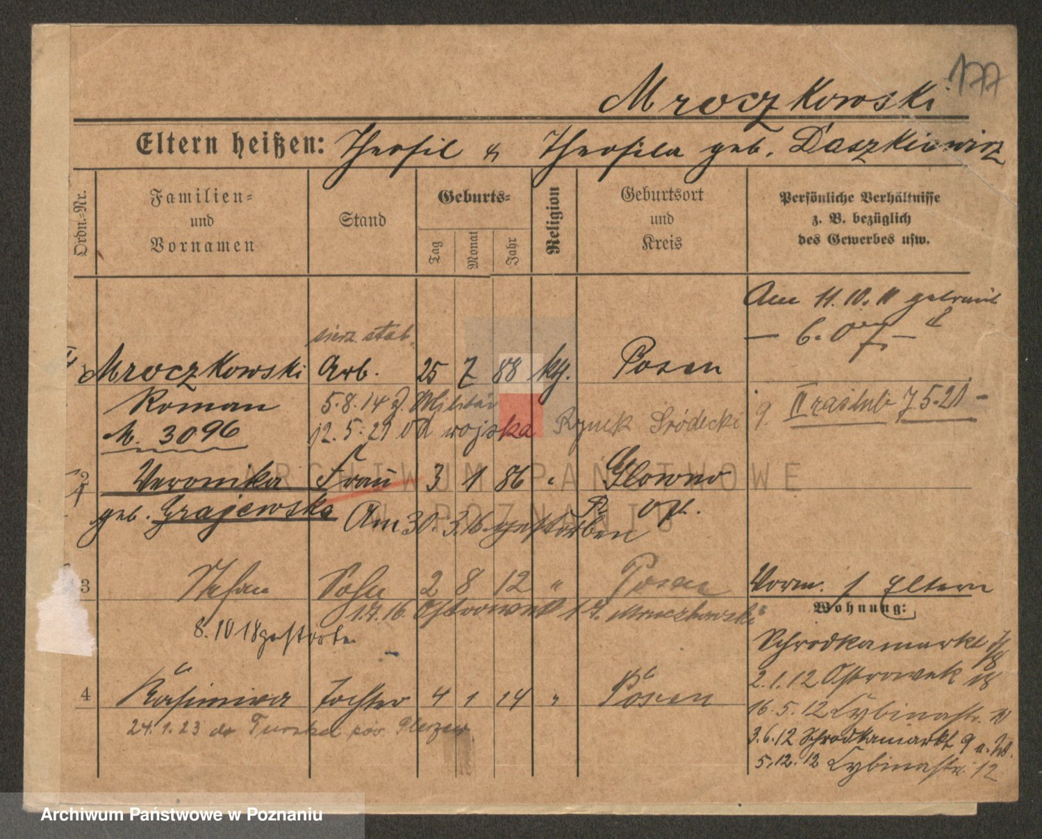 Podgląd karty osobowej dostępny jest po kliknięciu na nazwisko lub ikonkę karty. Można dokonywać powiększenia (ikony na górze) lub przechodzić między kolejnymi skanami (strzałki po bokach).