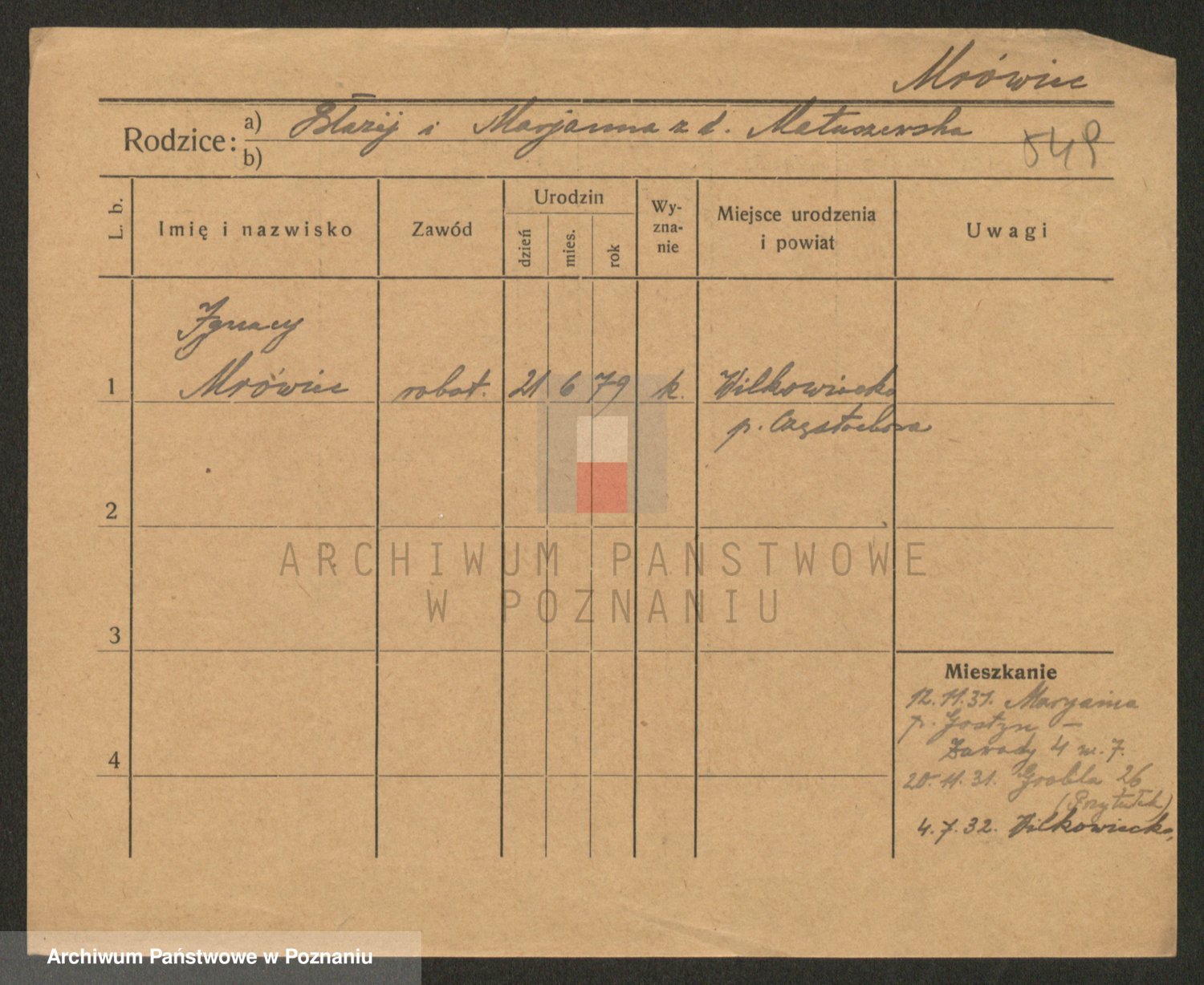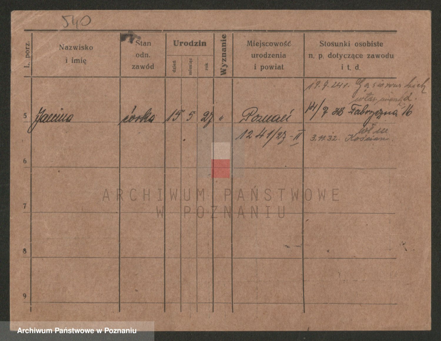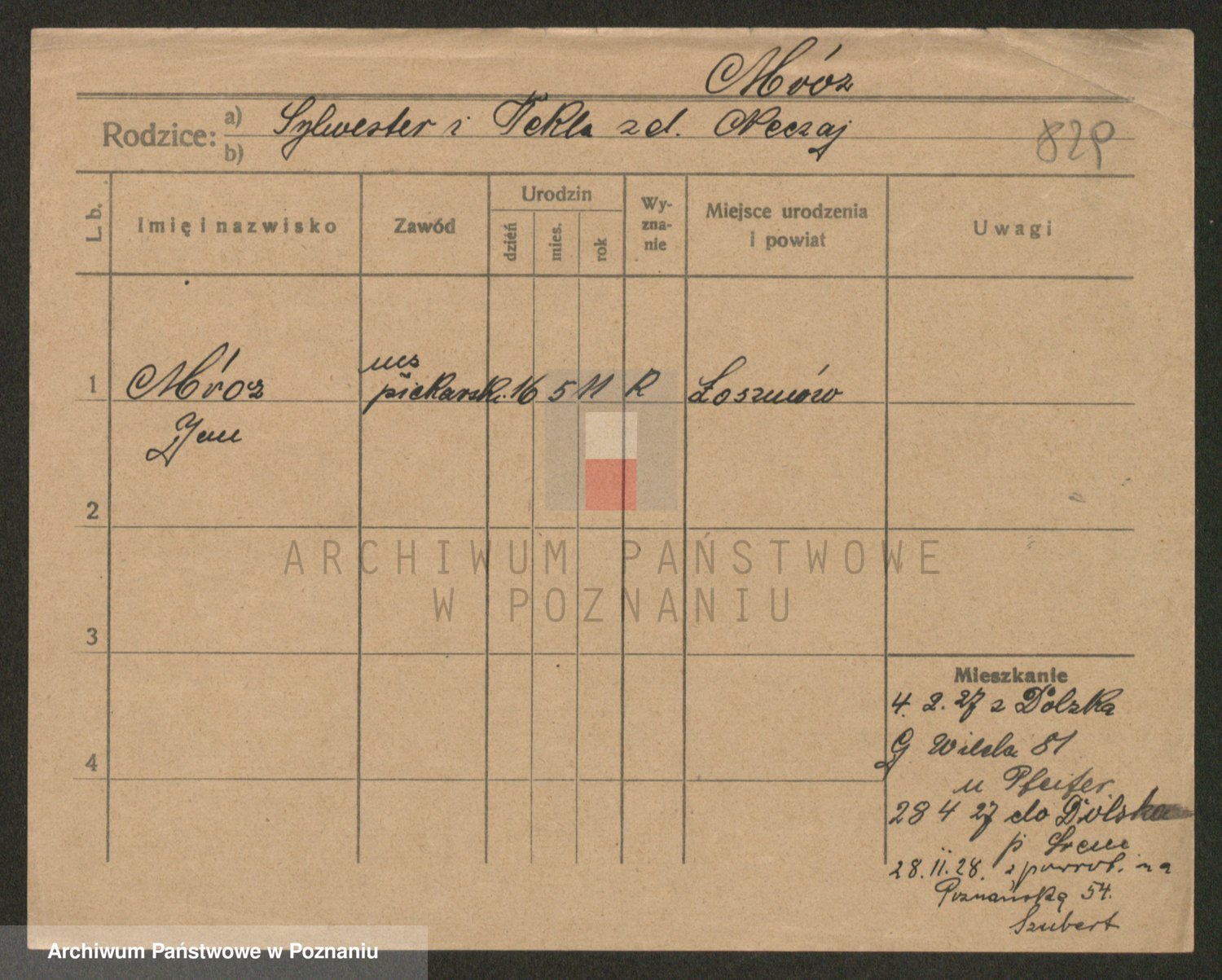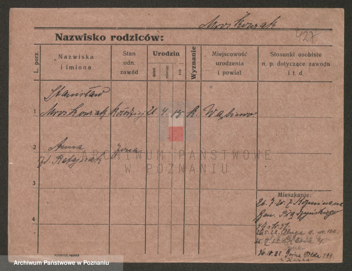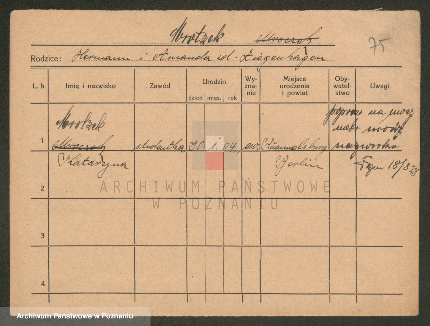 Podgląd karty osobowej dostępny jest po kliknięciu na nazwisko lub ikonkę karty. Można dokonywać powiększenia (ikony na górze) lub przechodzić między kolejnymi skanami (strzałki po bokach).