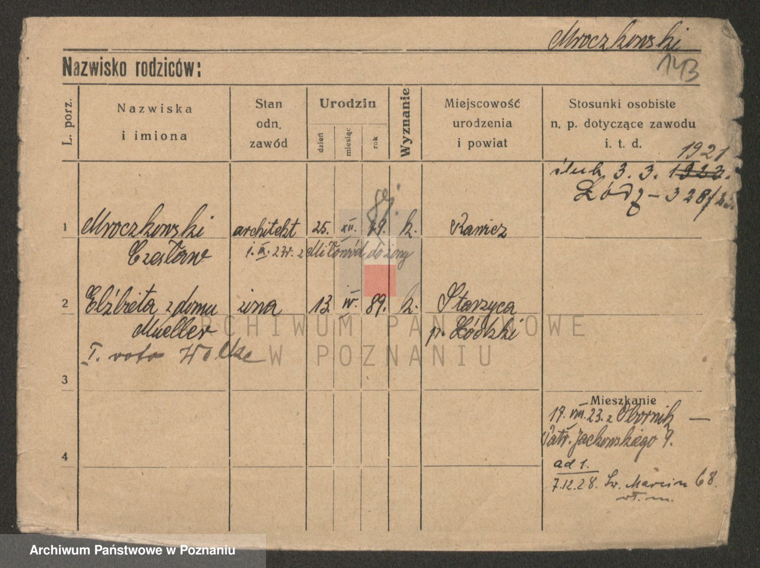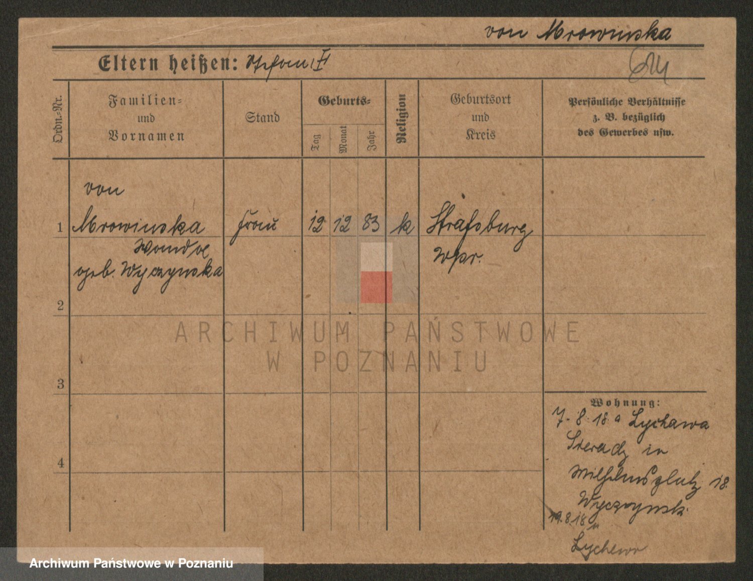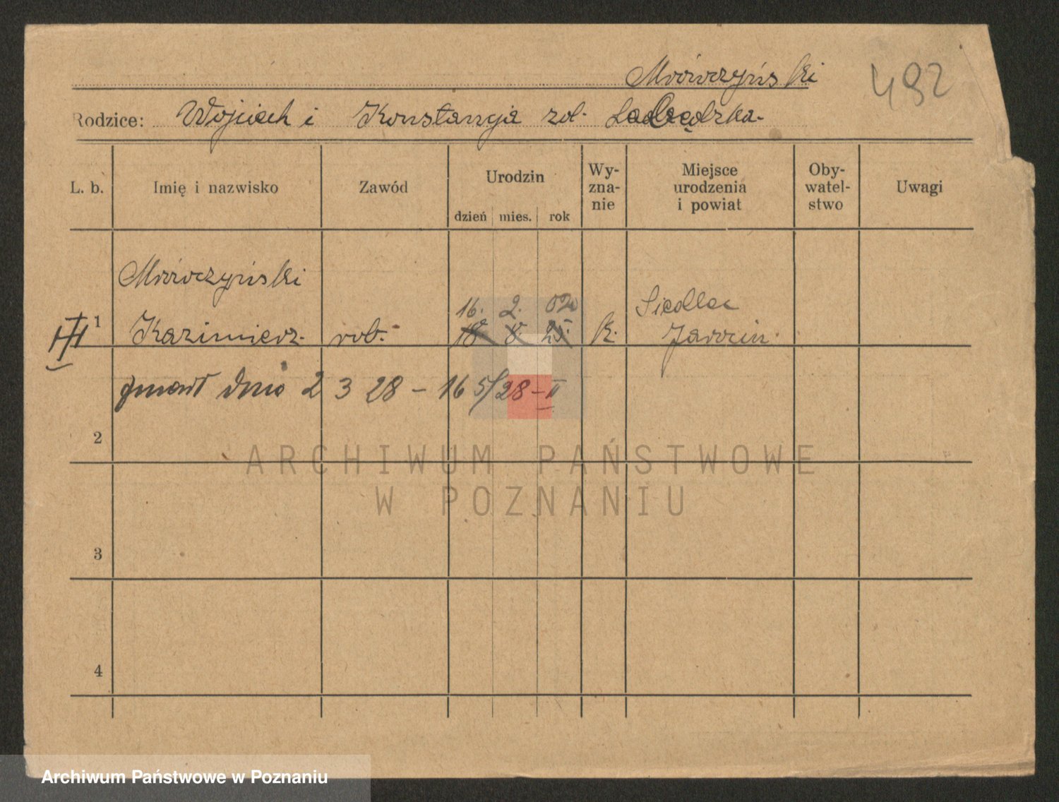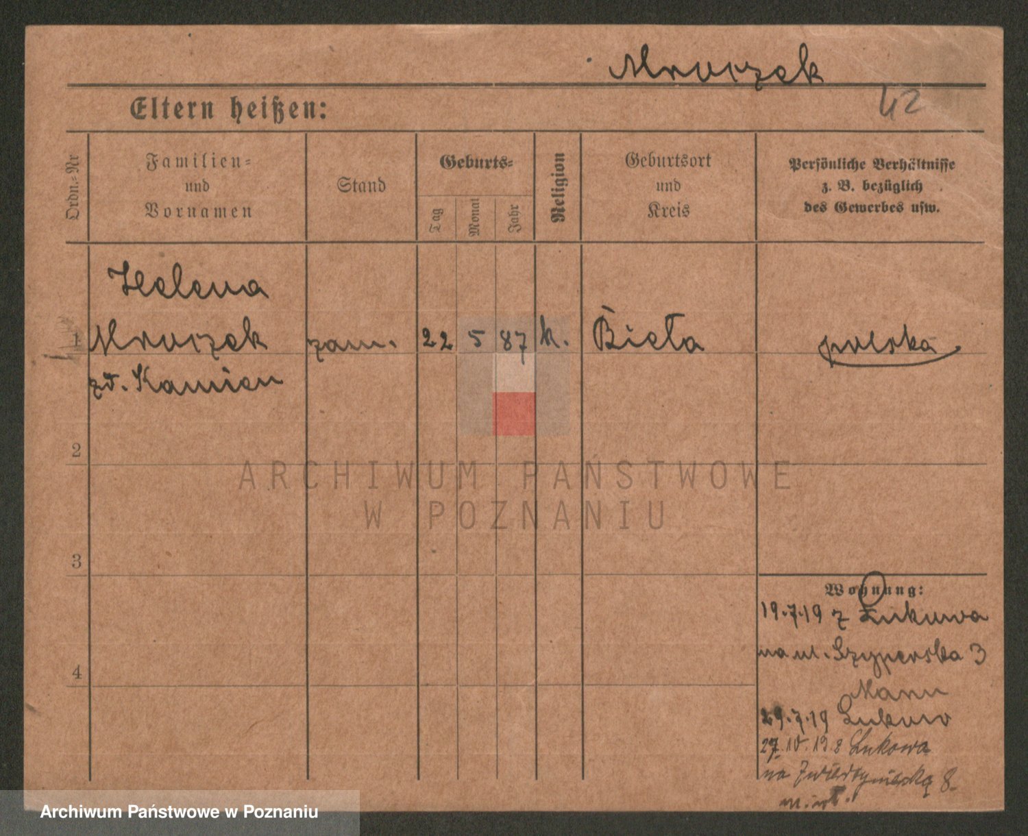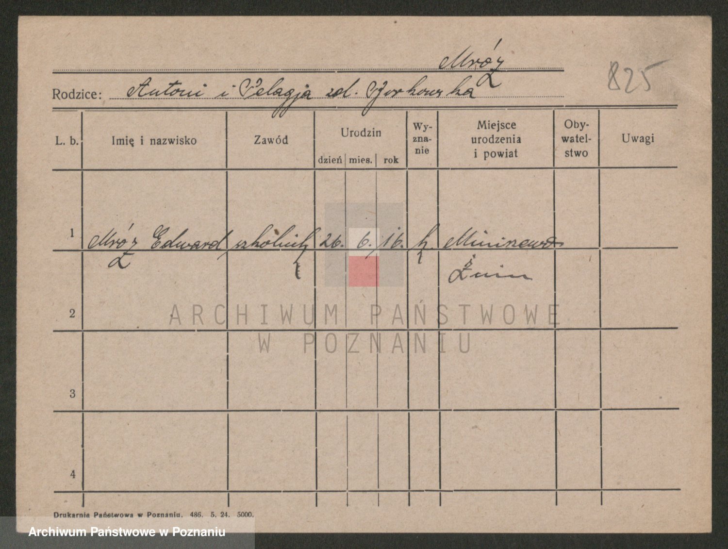 Podgląd karty osobowej dostępny jest po kliknięciu na nazwisko lub ikonkę karty. Można dokonywać powiększenia (ikony na górze) lub przechodzić między kolejnymi skanami (strzałki po bokach).