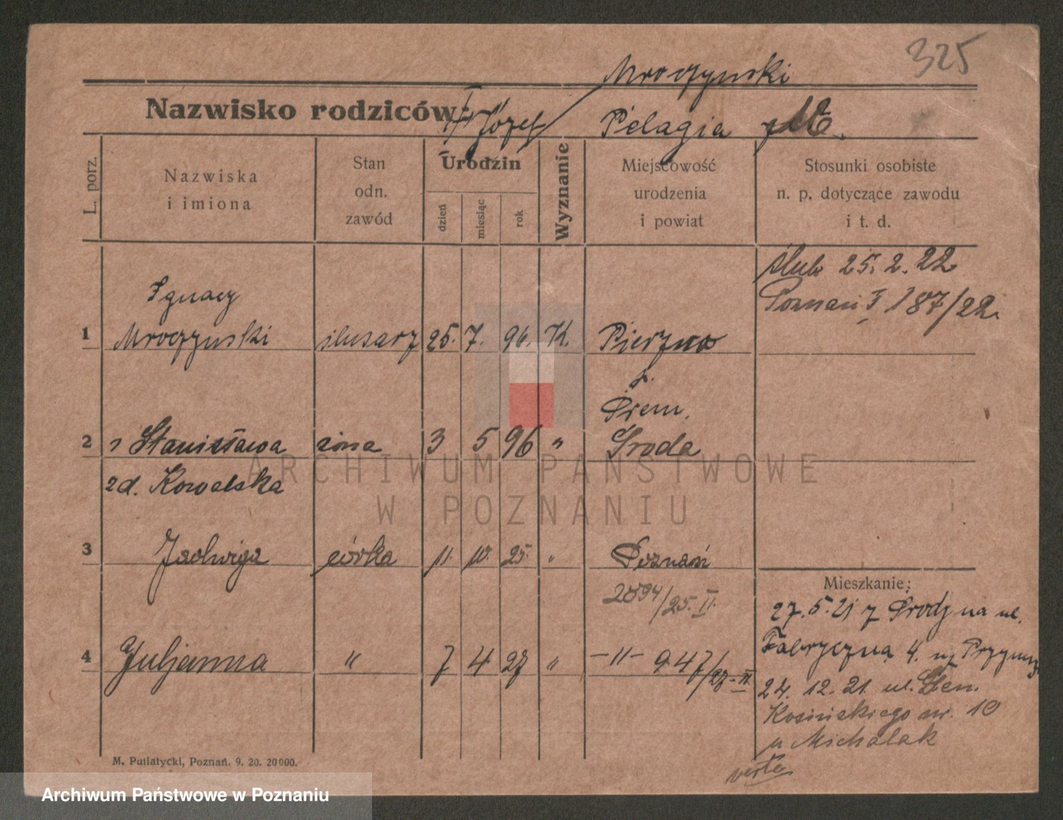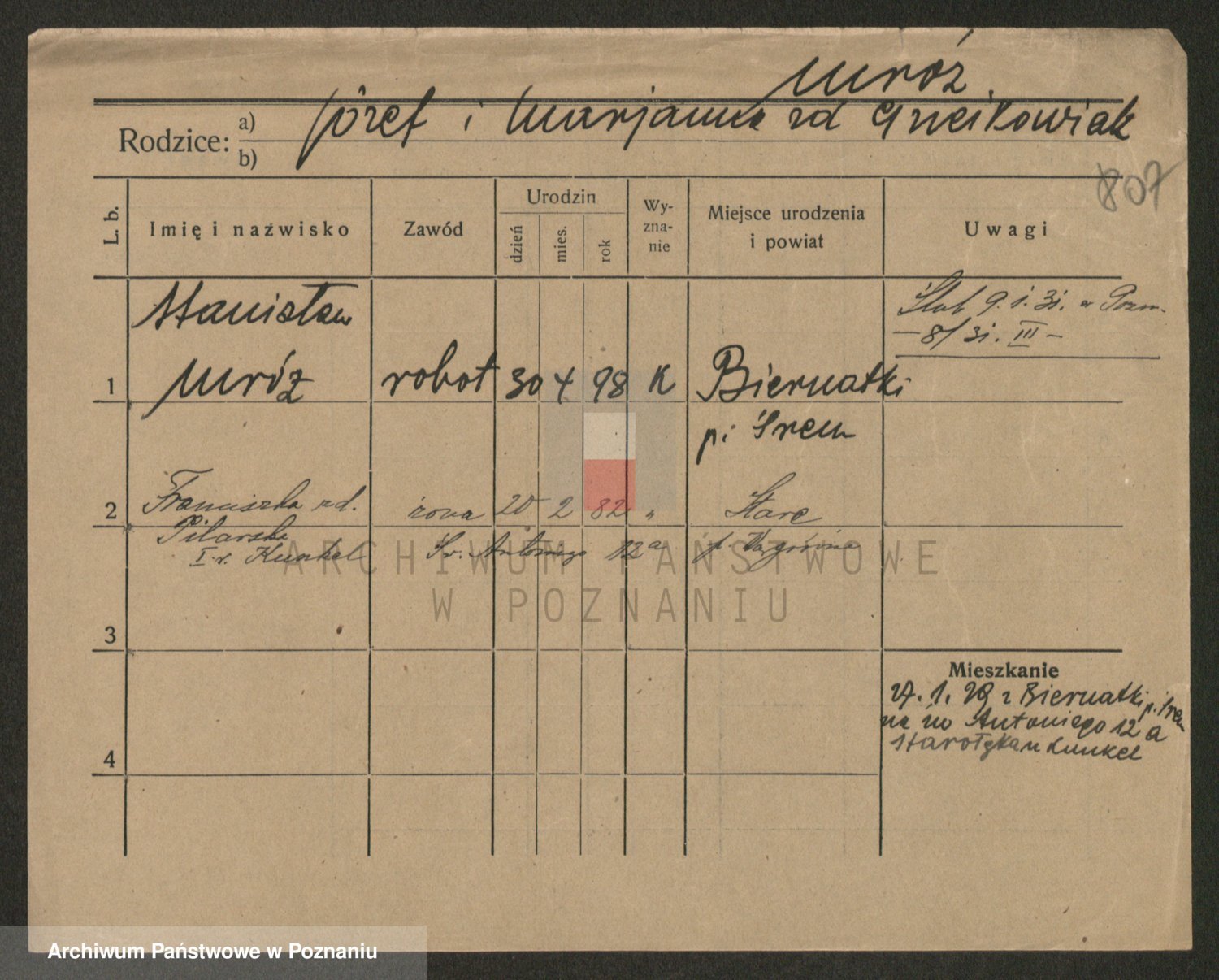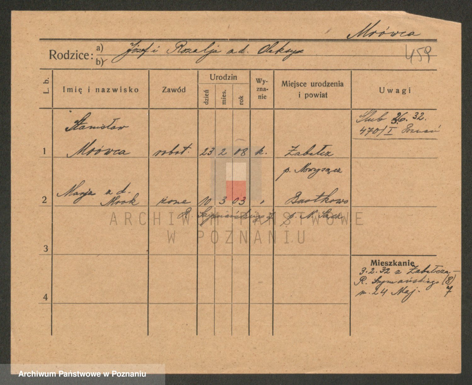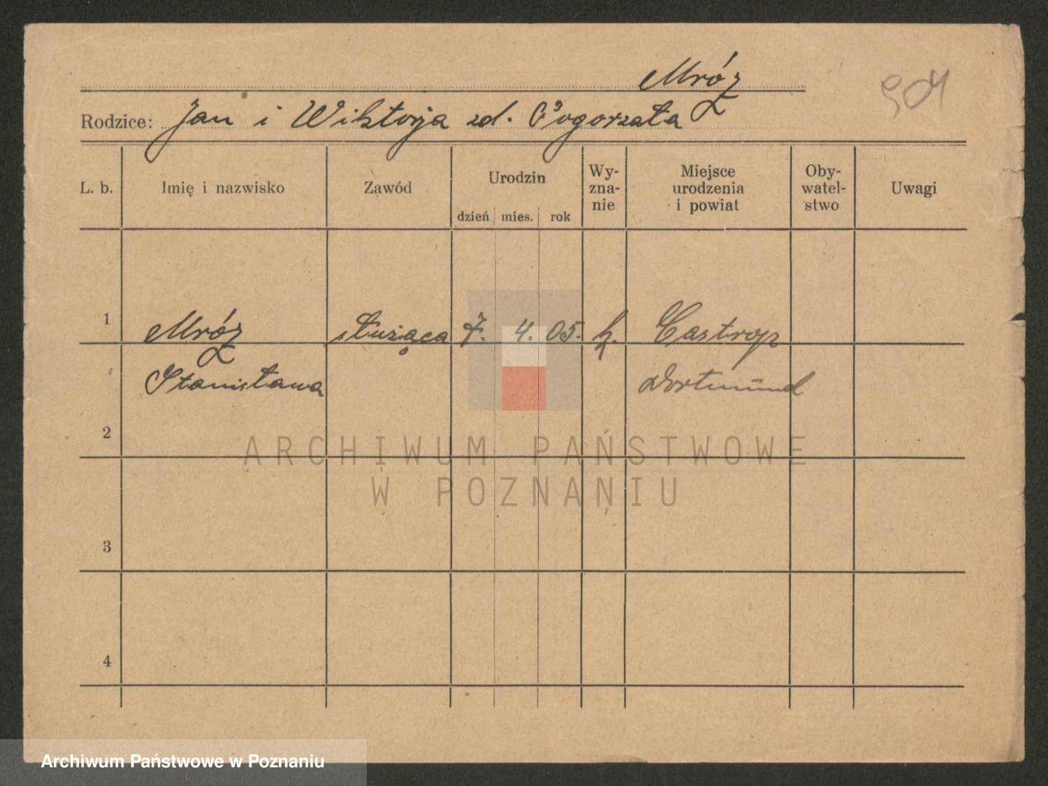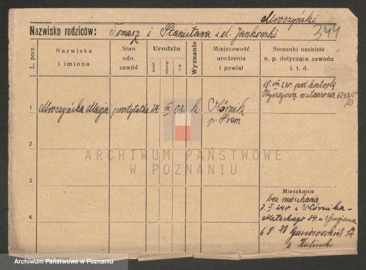 Podgląd karty osobowej dostępny jest po kliknięciu na nazwisko lub ikonkę karty. Można dokonywać powiększenia (ikony na górze) lub przechodzić między kolejnymi skanami (strzałki po bokach).