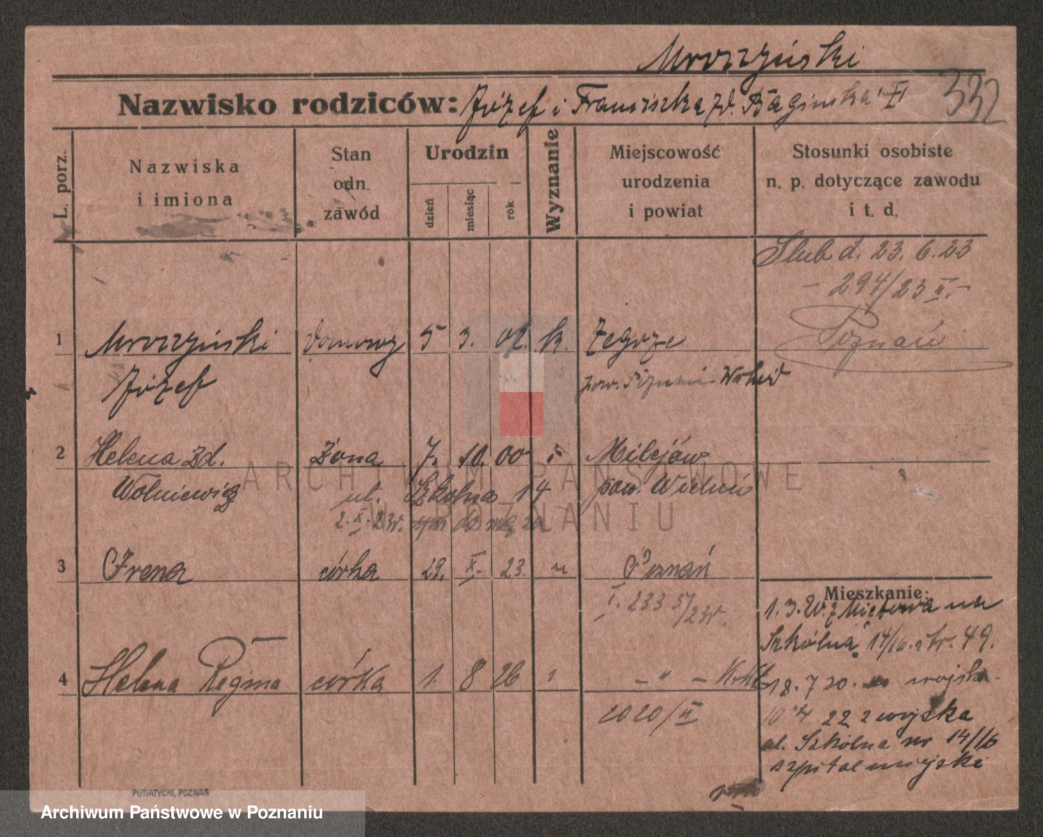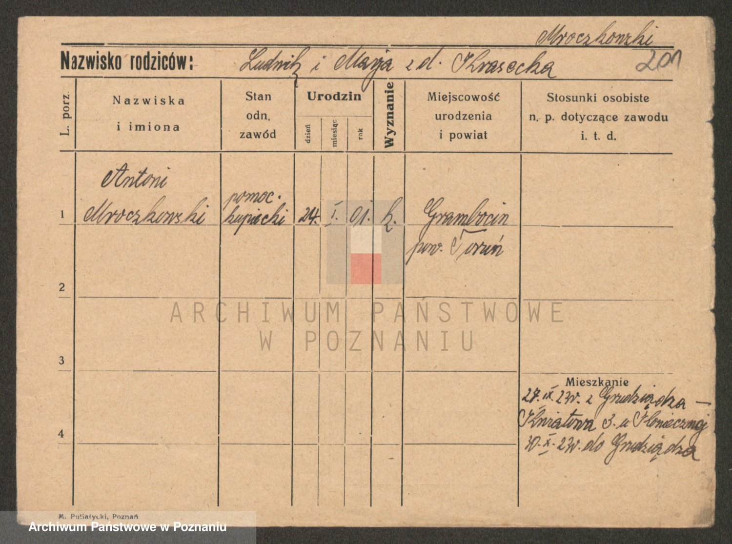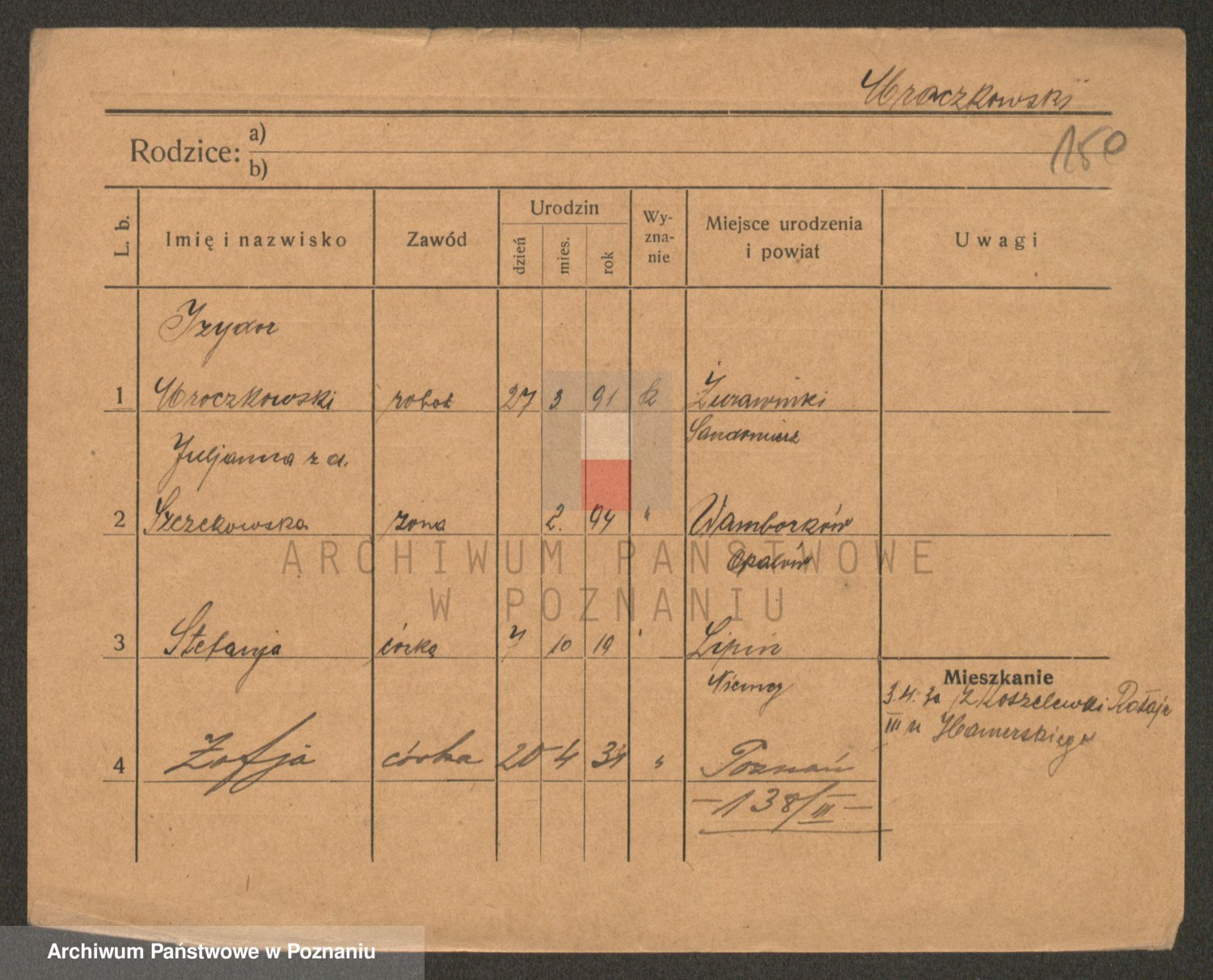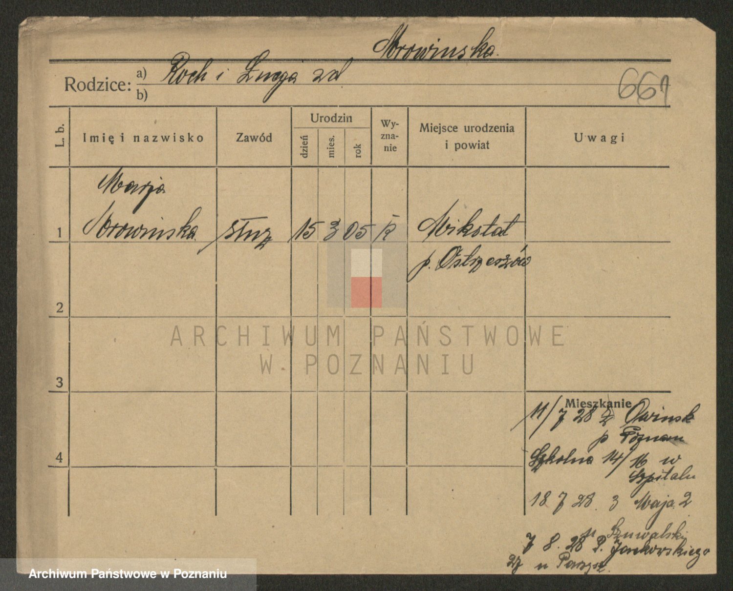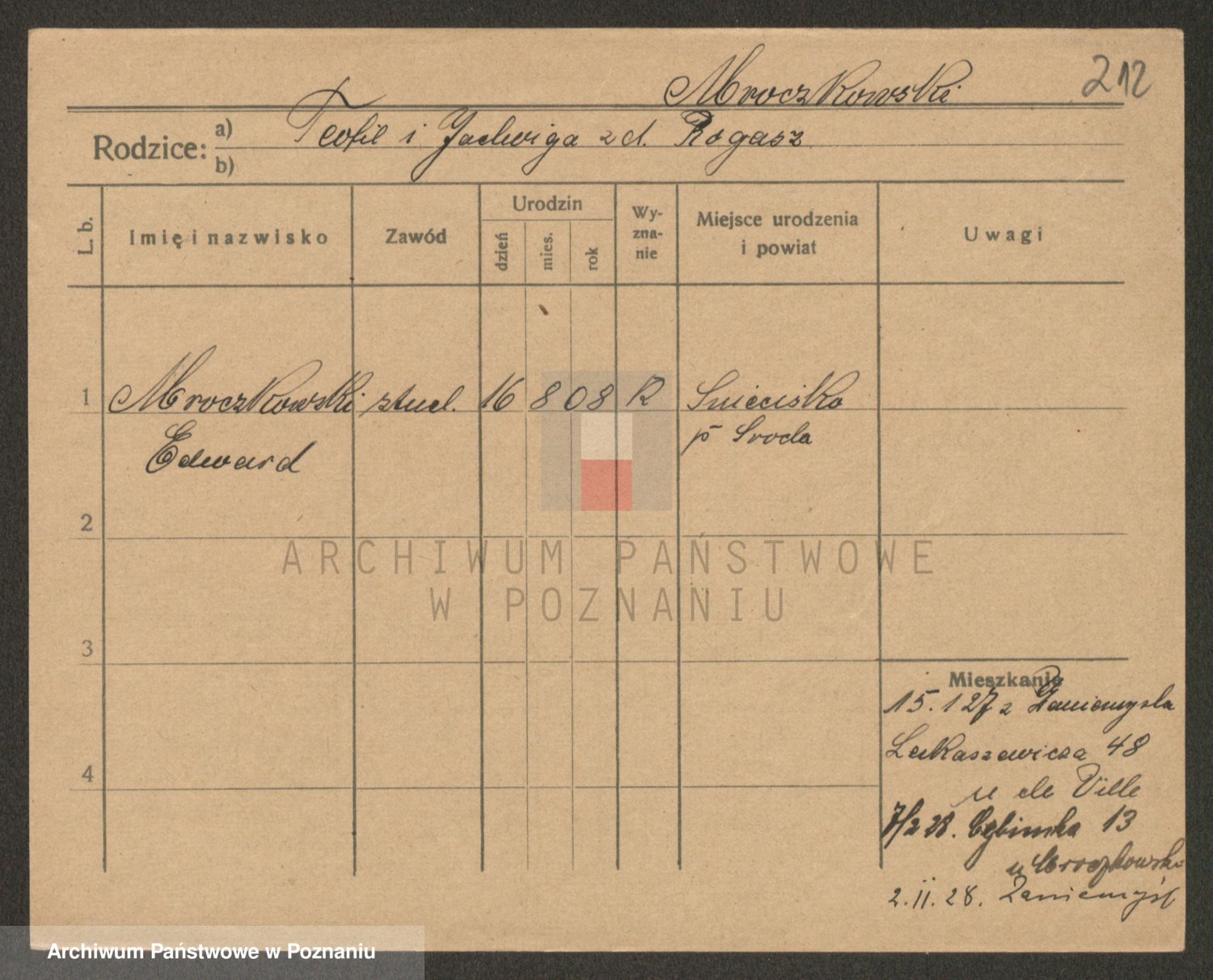 Podgląd karty osobowej dostępny jest po kliknięciu na nazwisko lub ikonkę karty. Można dokonywać powiększenia (ikony na górze) lub przechodzić między kolejnymi skanami (strzałki po bokach).