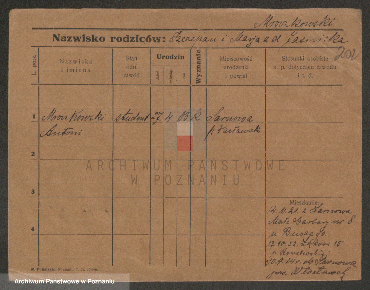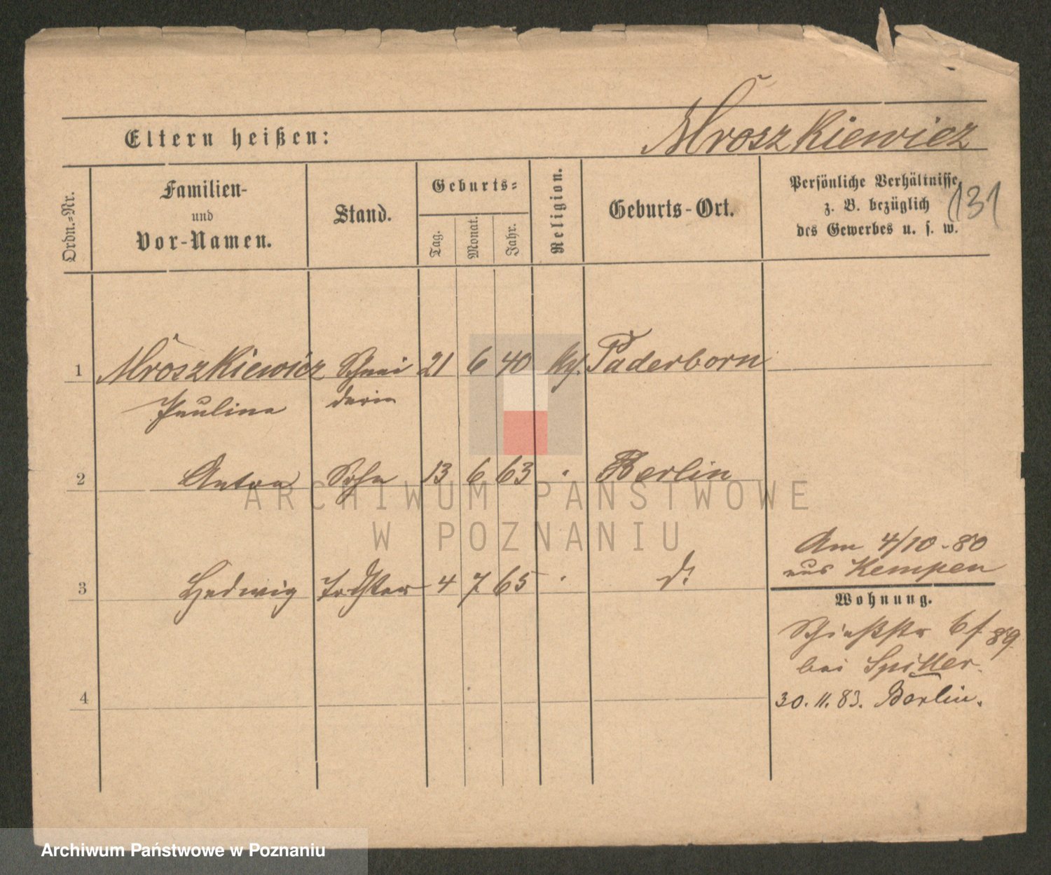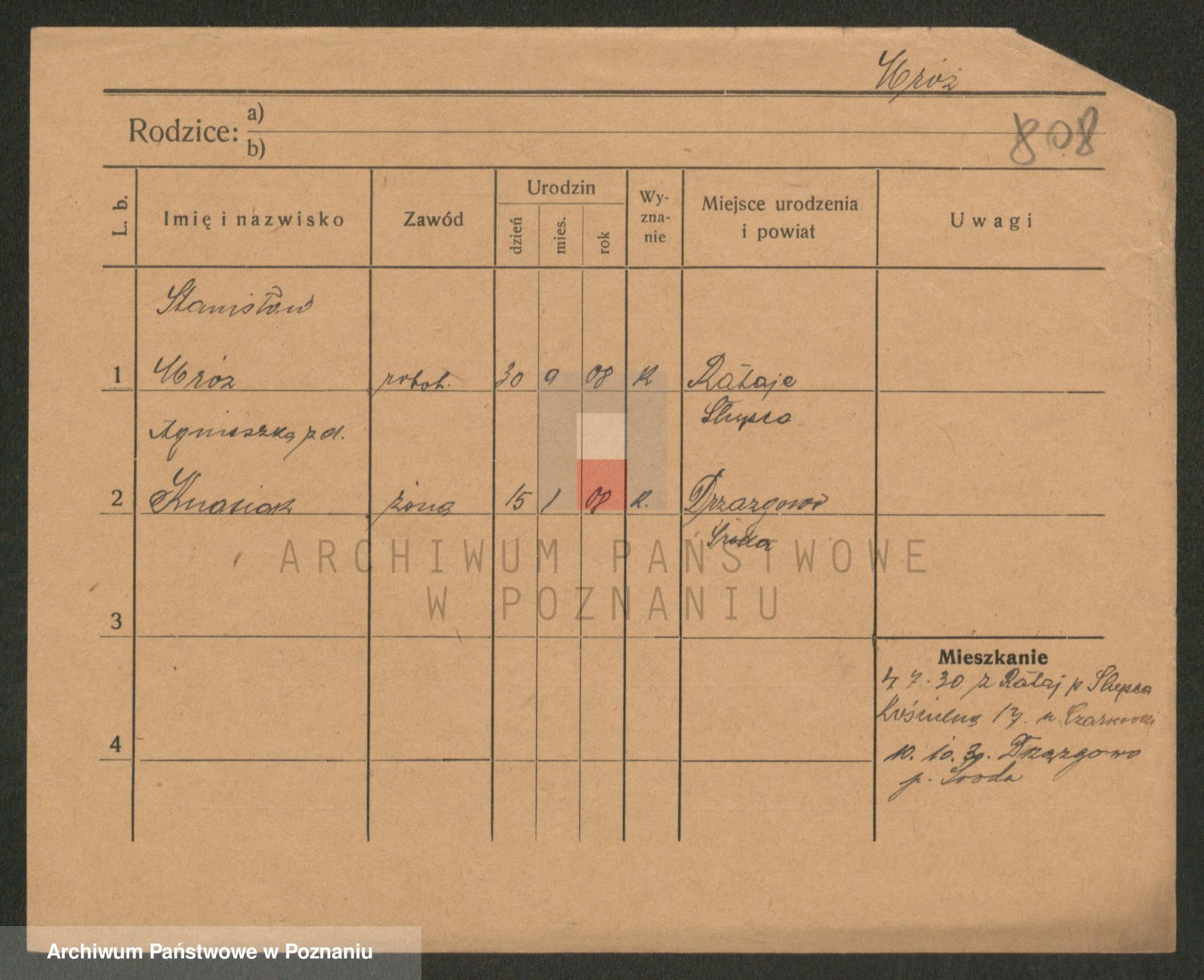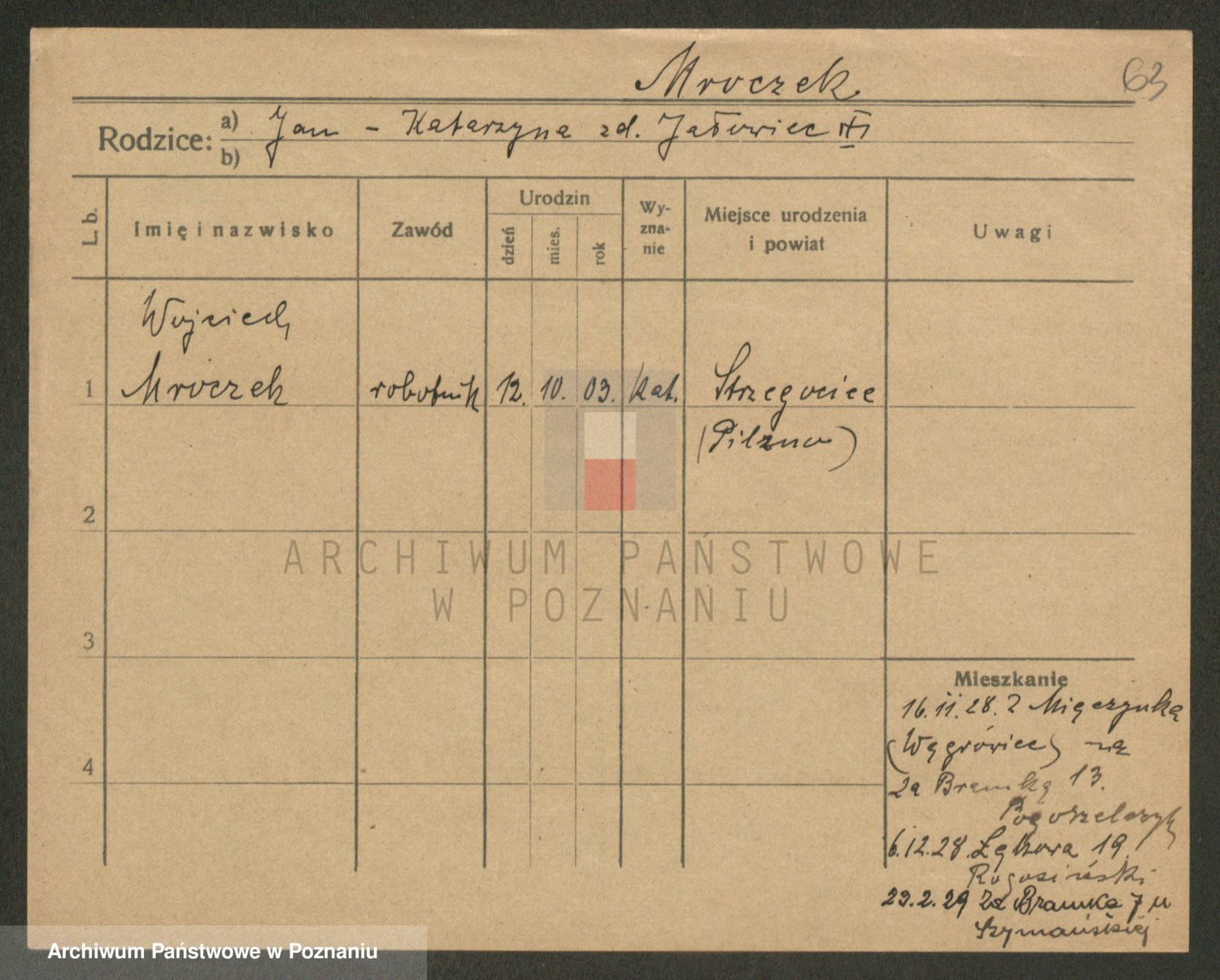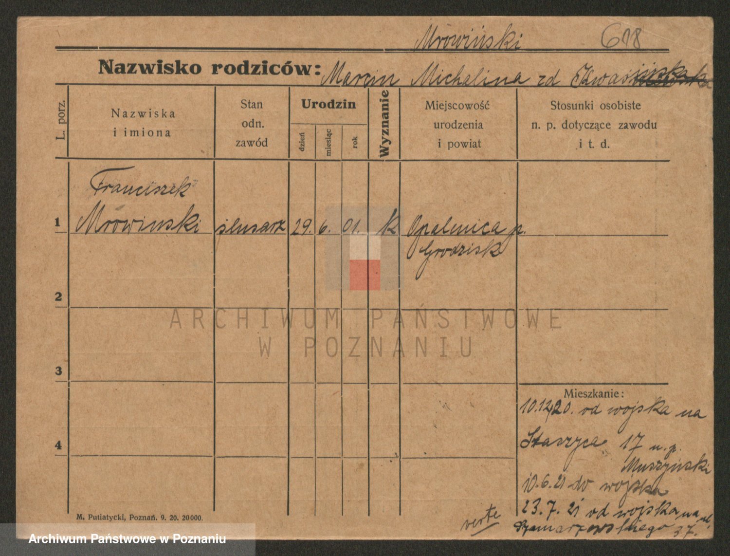 Podgląd karty osobowej dostępny jest po kliknięciu na nazwisko lub ikonkę karty. Można dokonywać powiększenia (ikony na górze) lub przechodzić między kolejnymi skanami (strzałki po bokach).