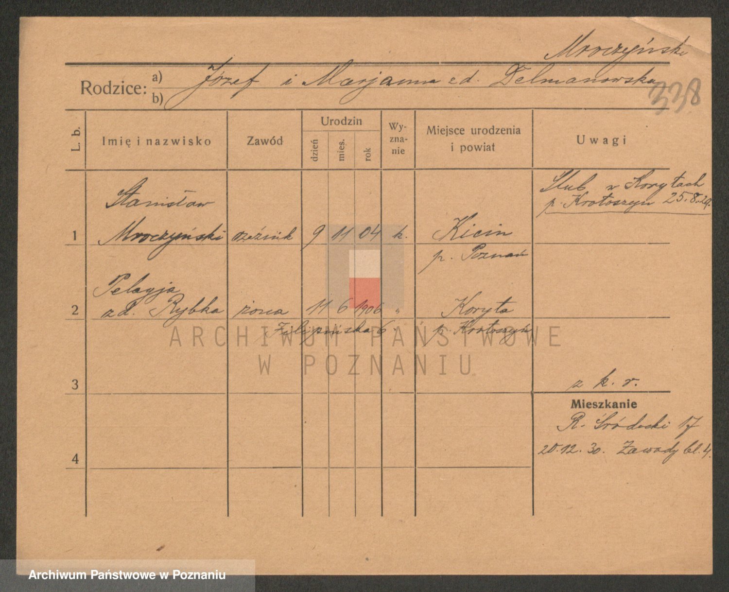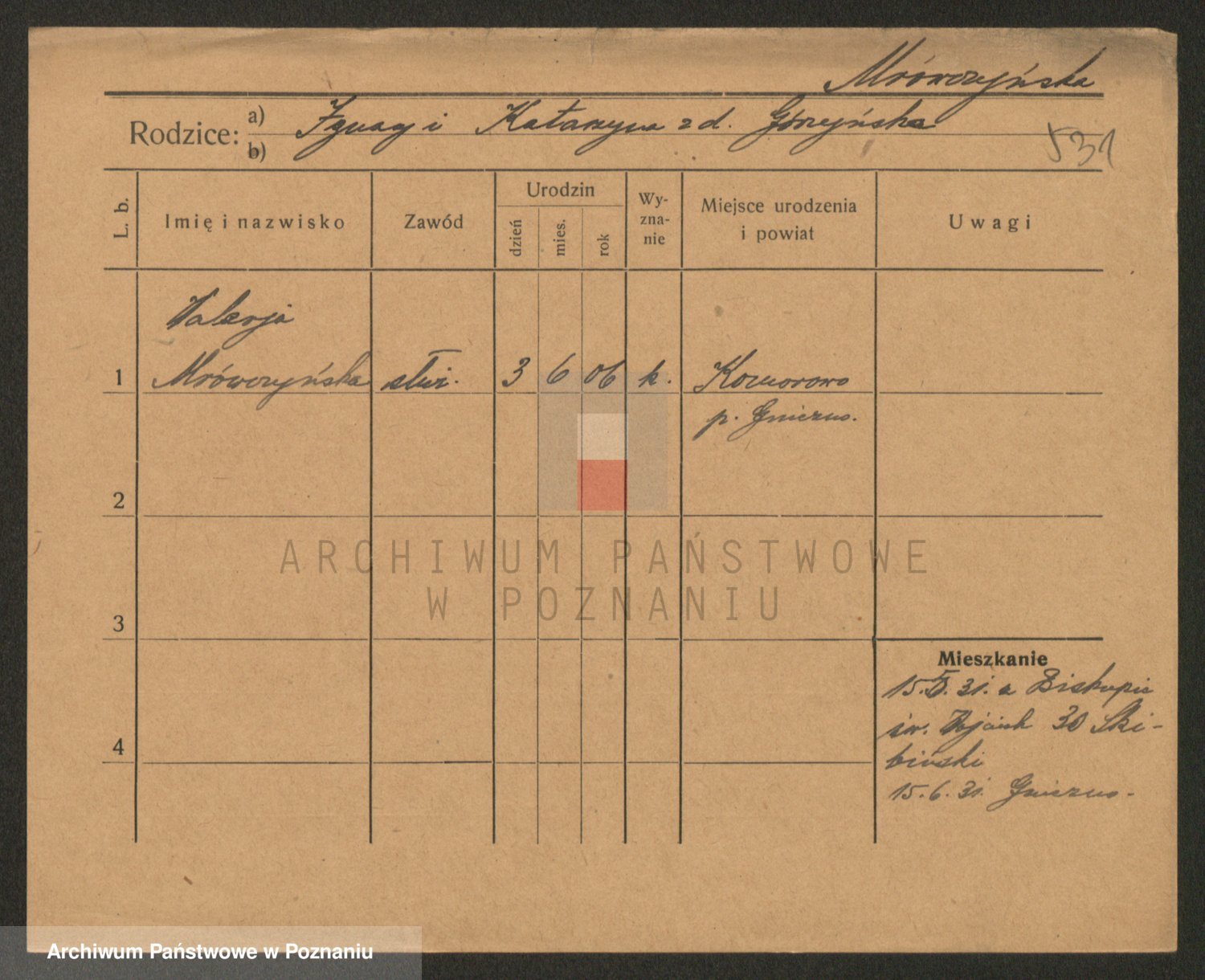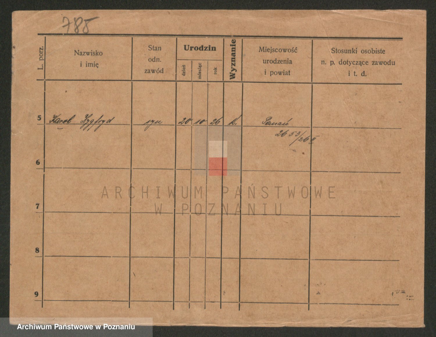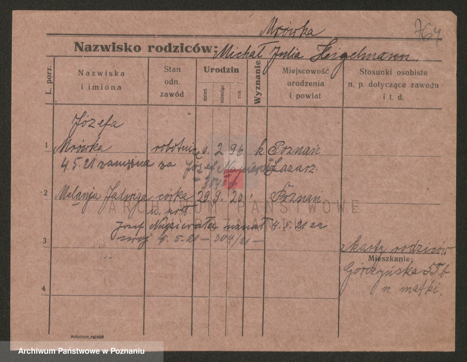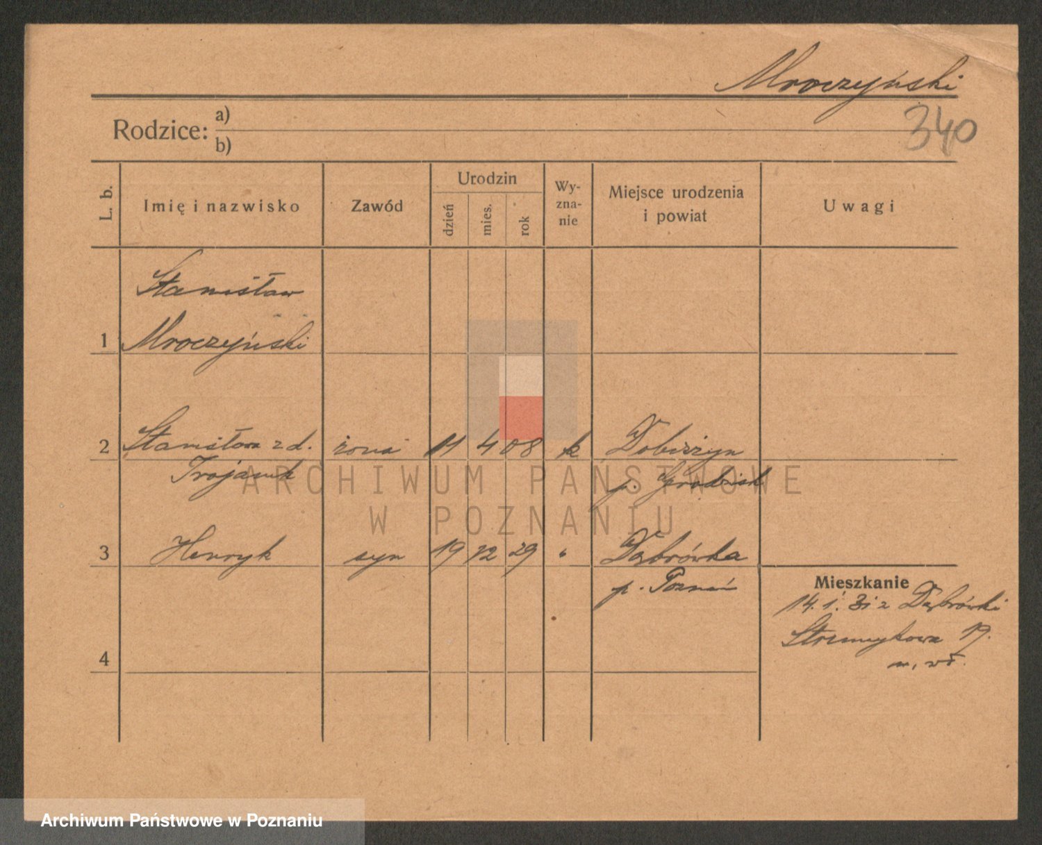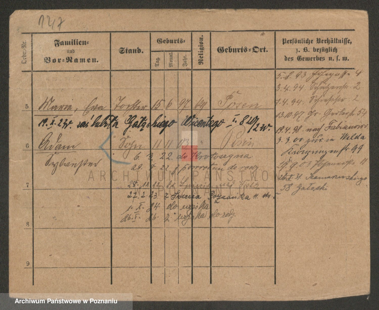 Podgląd karty osobowej dostępny jest po kliknięciu na nazwisko lub ikonkę karty. Można dokonywać powiększenia (ikony na górze) lub przechodzić między kolejnymi skanami (strzałki po bokach).
