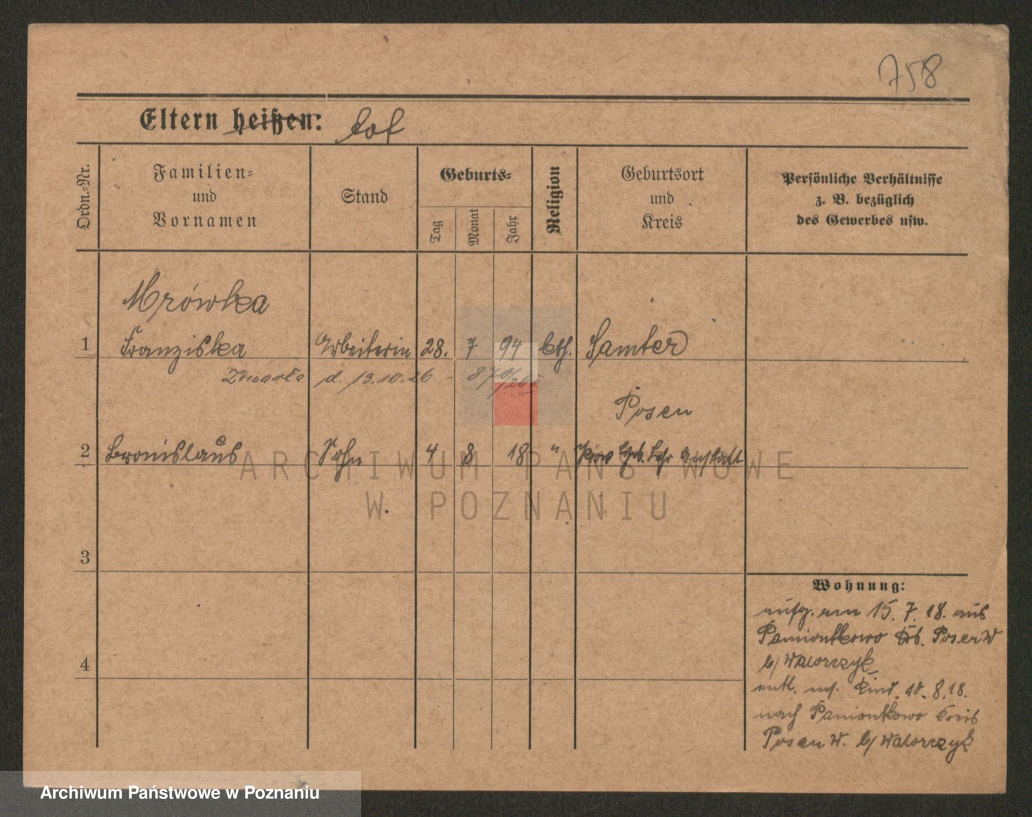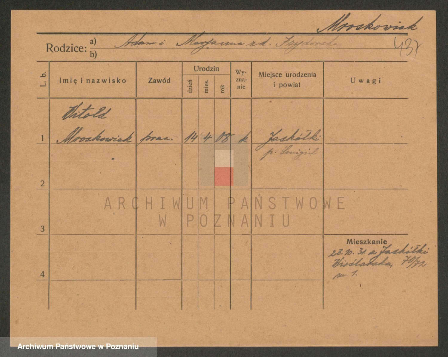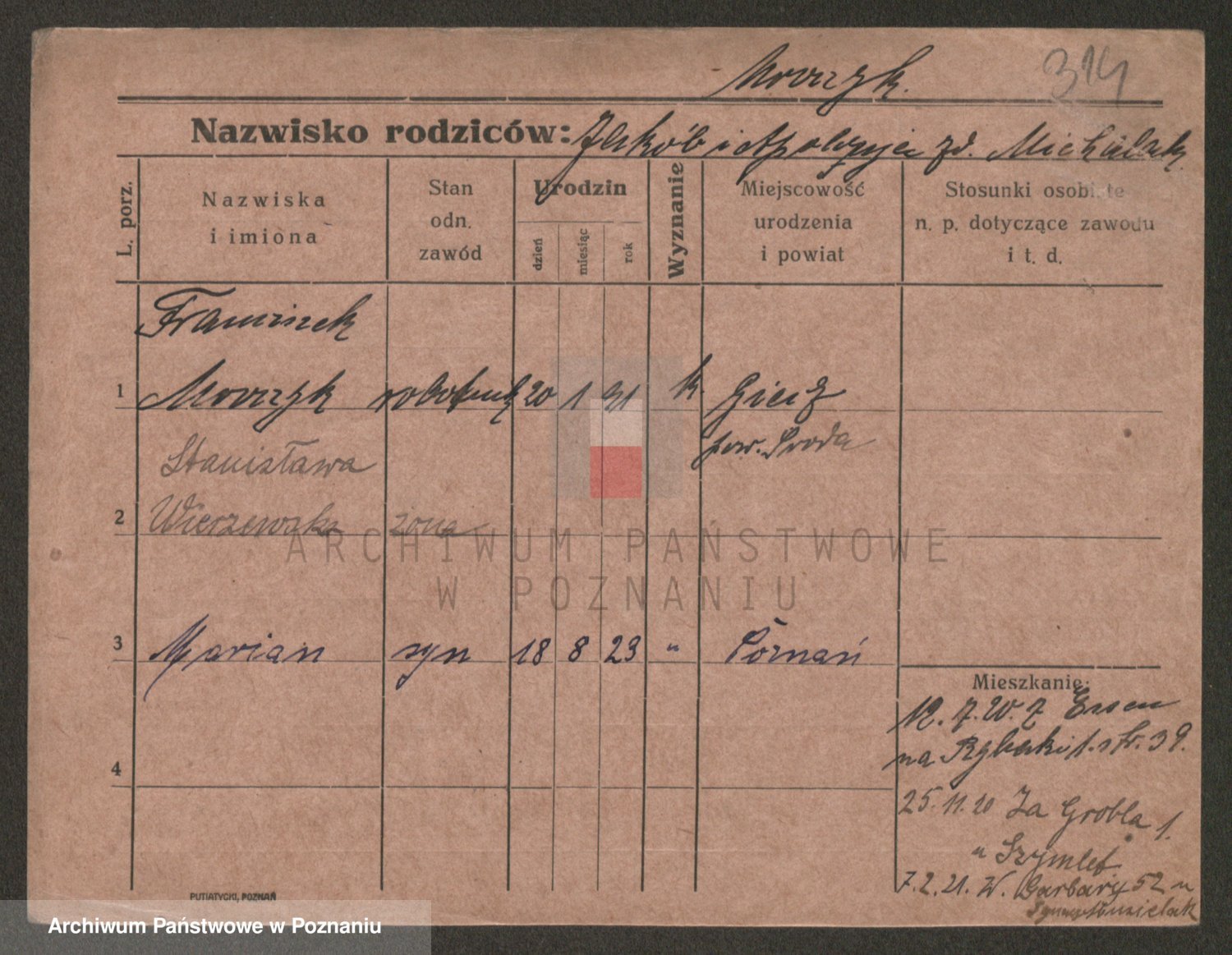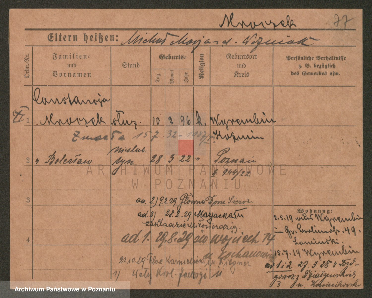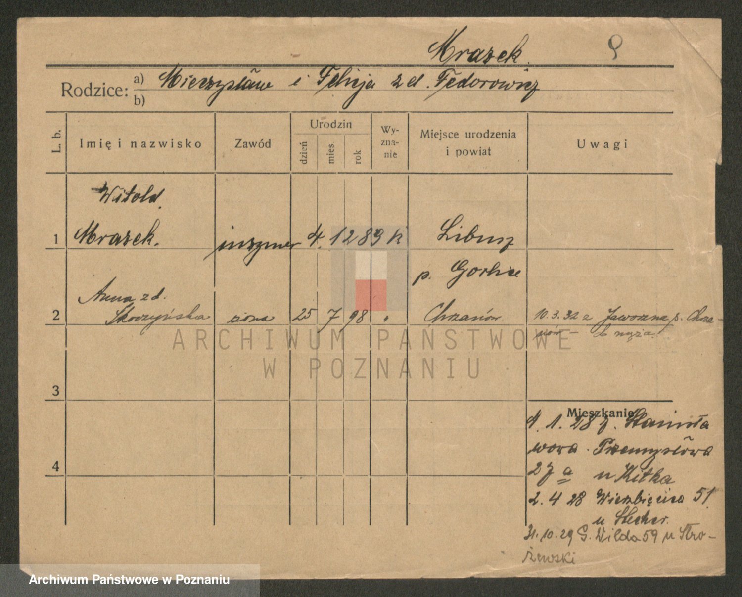 Podgląd karty osobowej dostępny jest po kliknięciu na nazwisko lub ikonkę karty. Można dokonywać powiększenia (ikony na górze) lub przechodzić między kolejnymi skanami (strzałki po bokach).