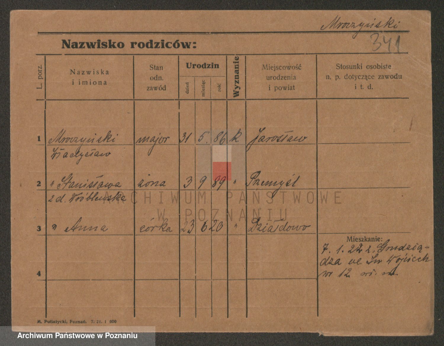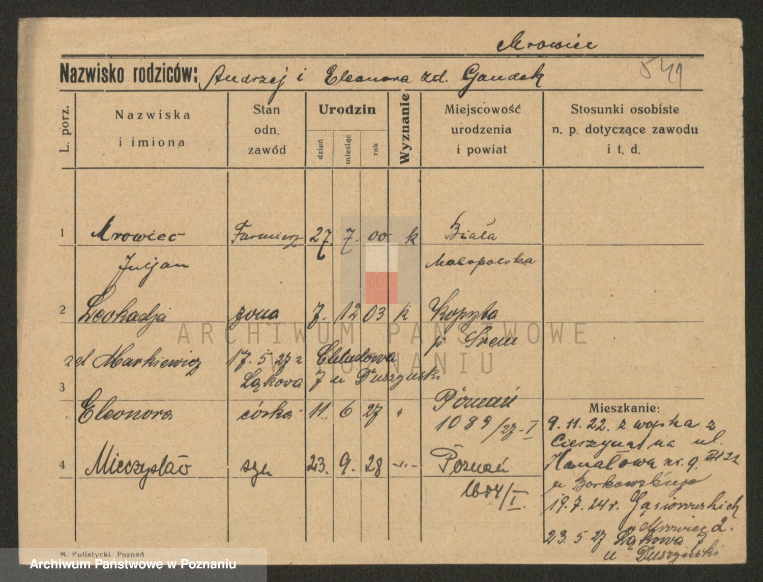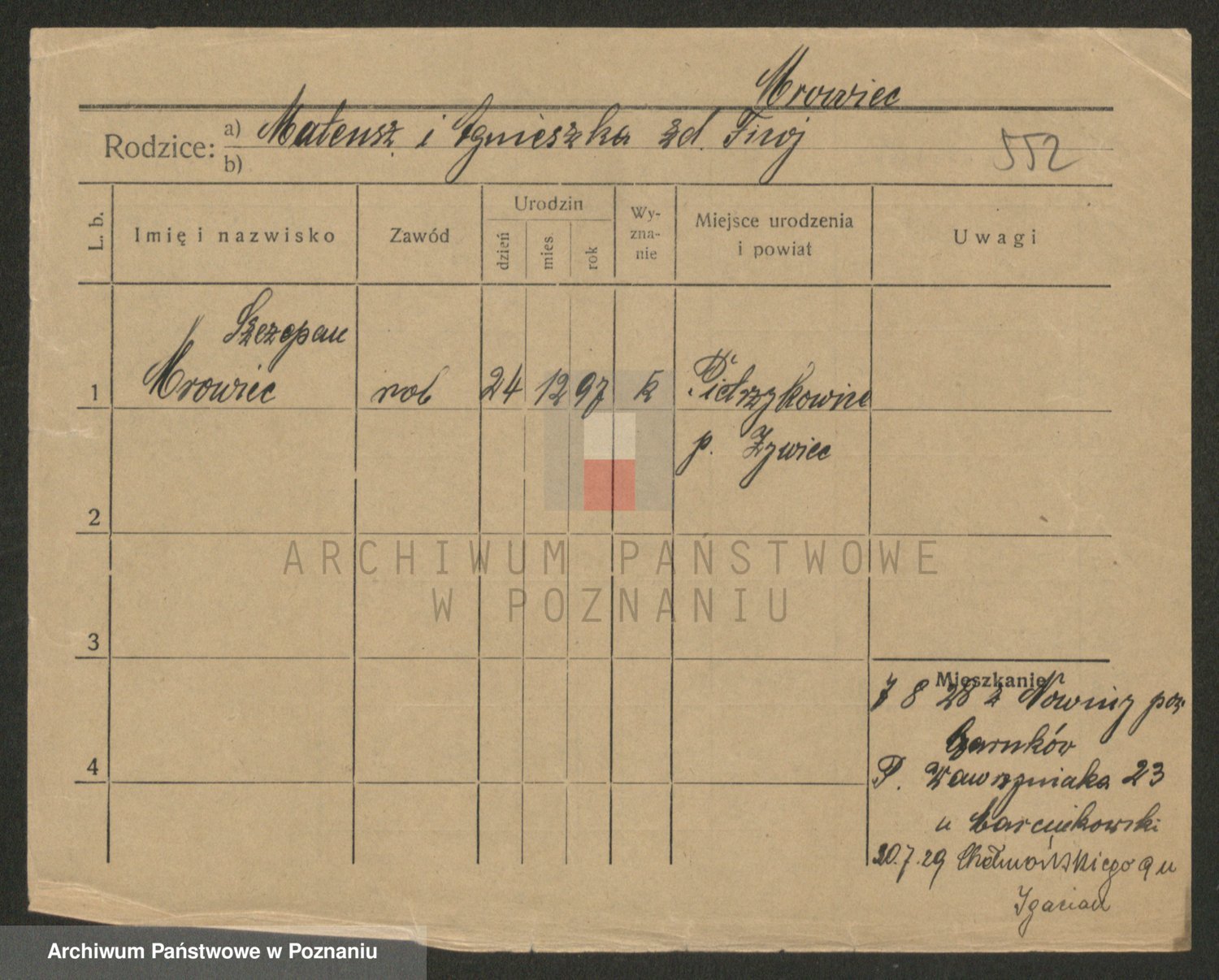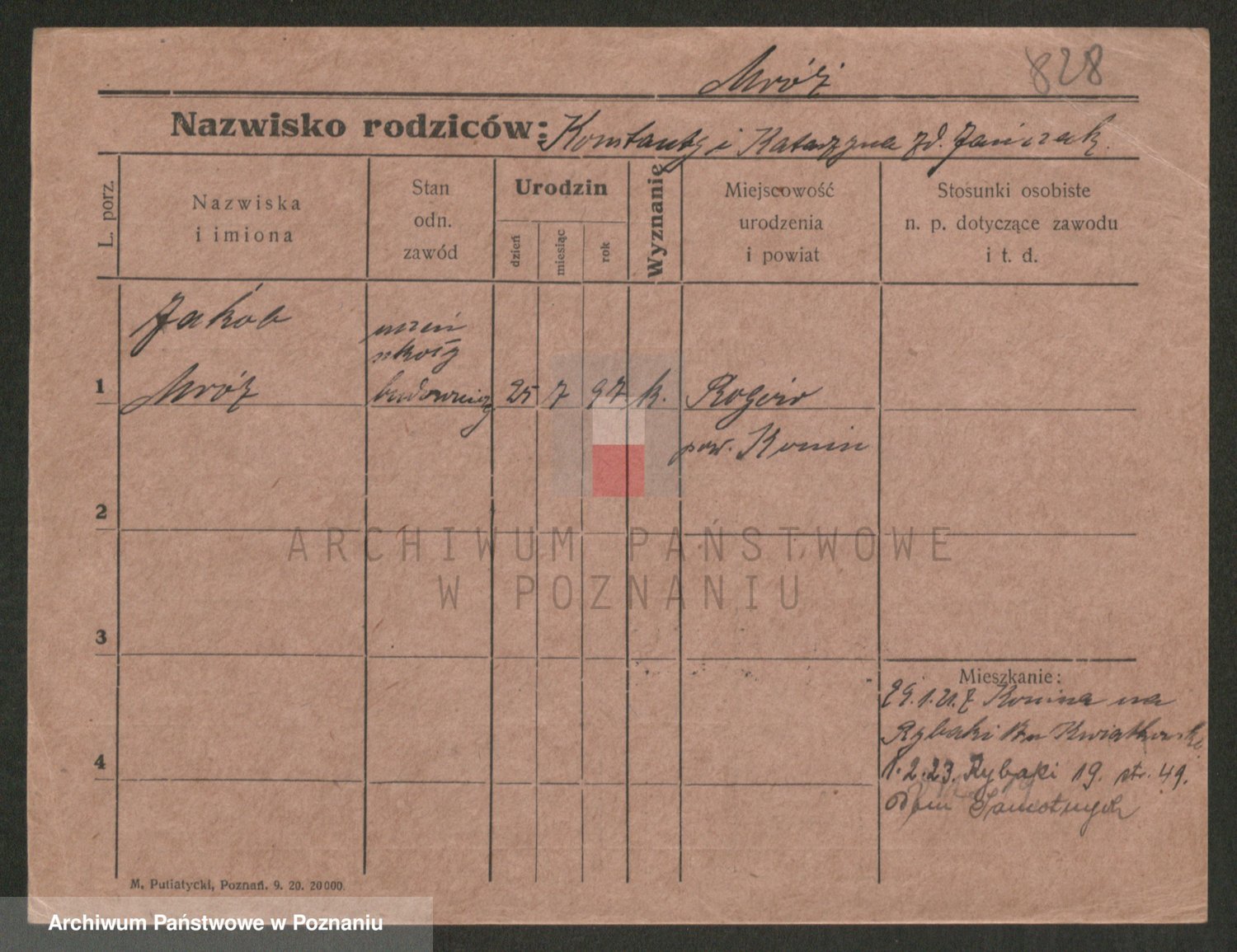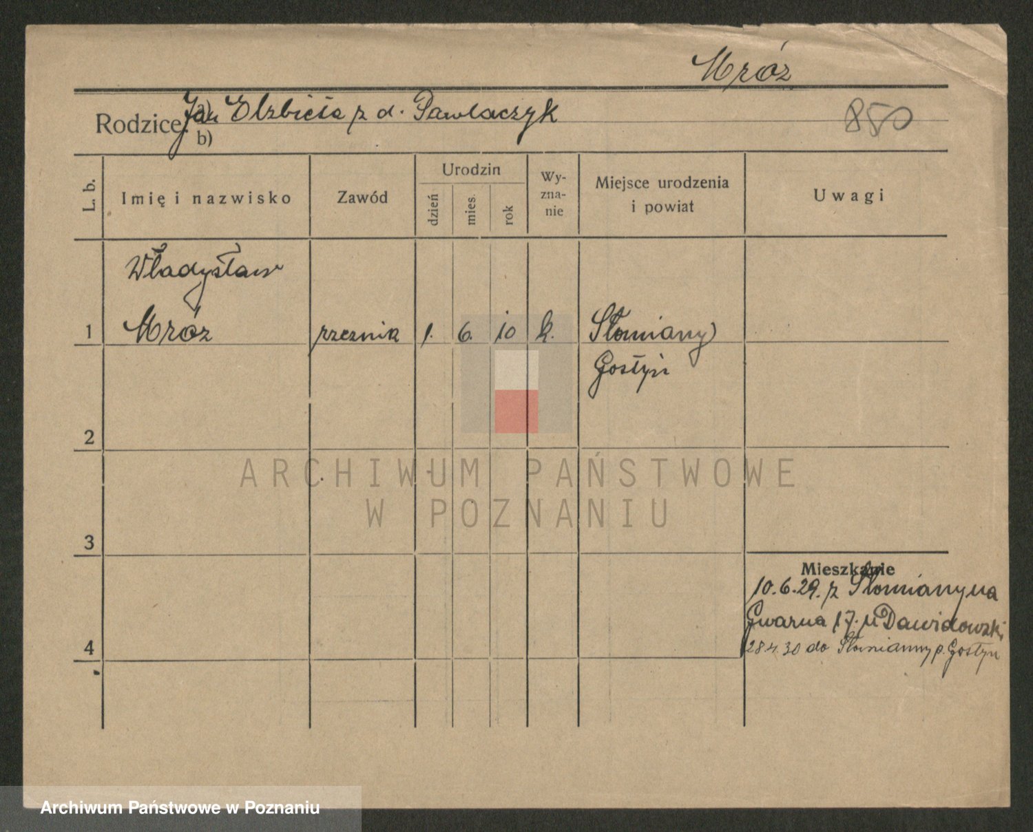 Podgląd karty osobowej dostępny jest po kliknięciu na nazwisko lub ikonkę karty. Można dokonywać powiększenia (ikony na górze) lub przechodzić między kolejnymi skanami (strzałki po bokach).
