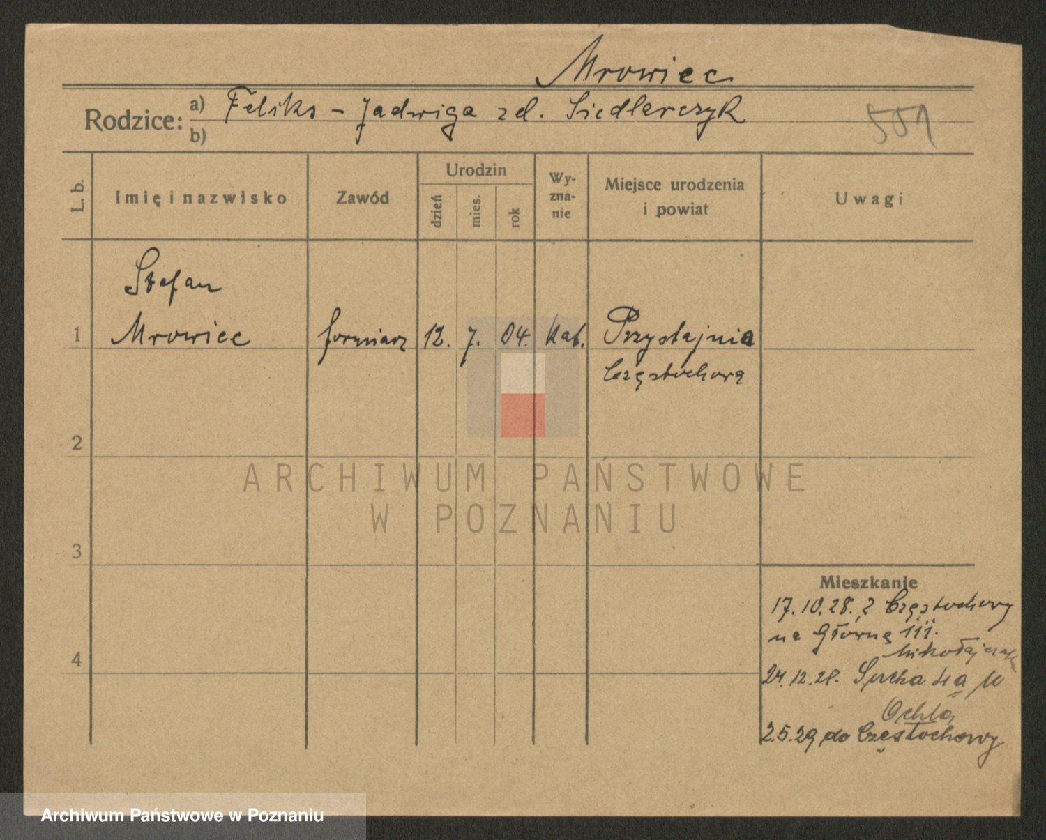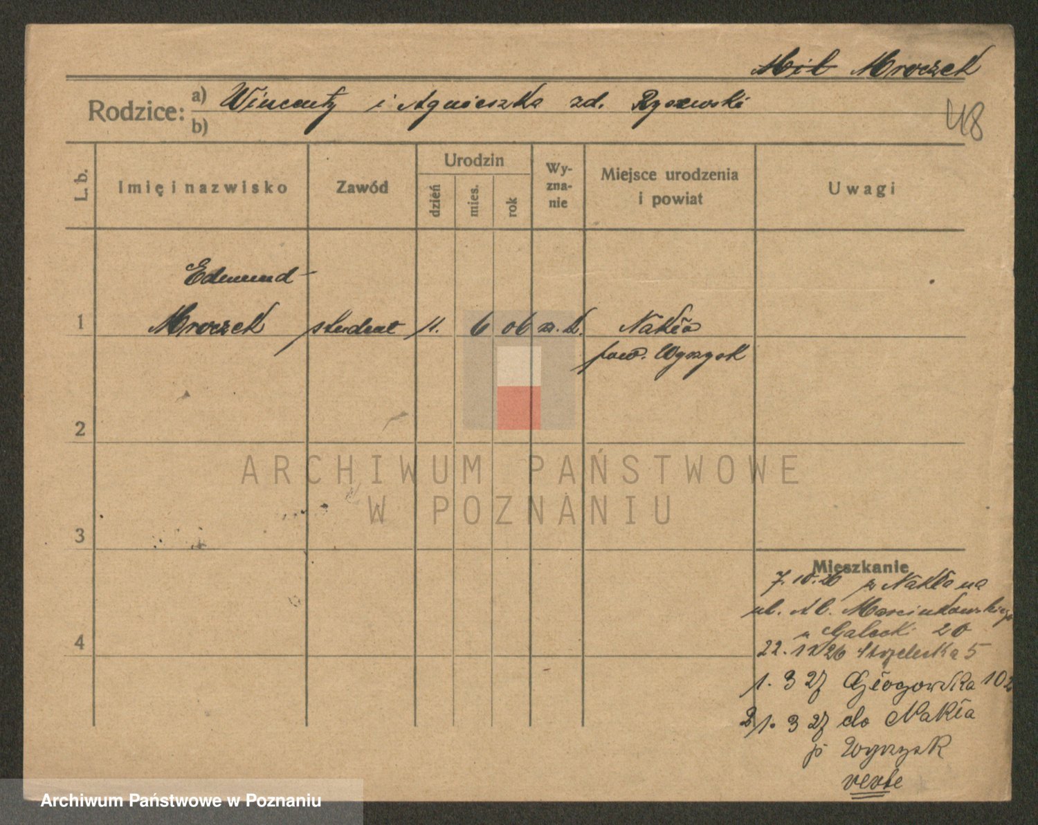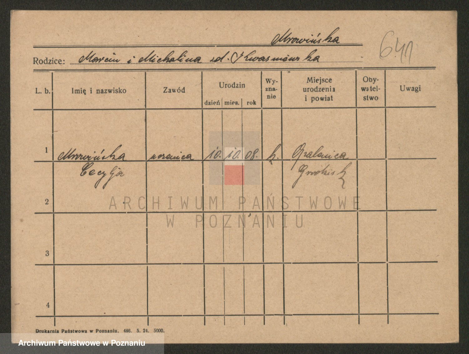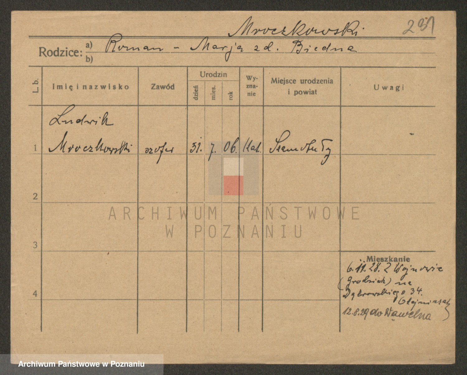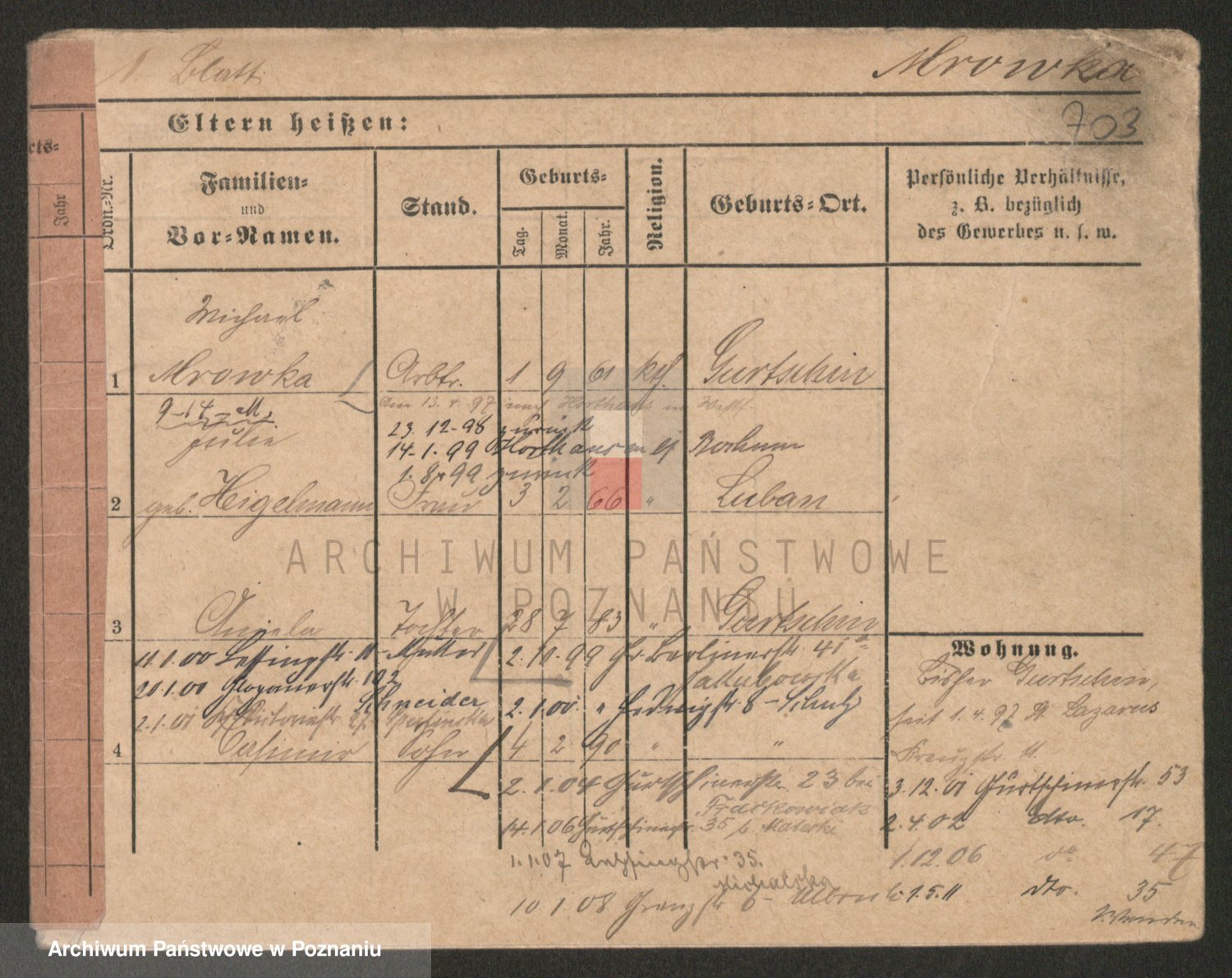 Podgląd karty osobowej dostępny jest po kliknięciu na nazwisko lub ikonkę karty. Można dokonywać powiększenia (ikony na górze) lub przechodzić między kolejnymi skanami (strzałki po bokach).