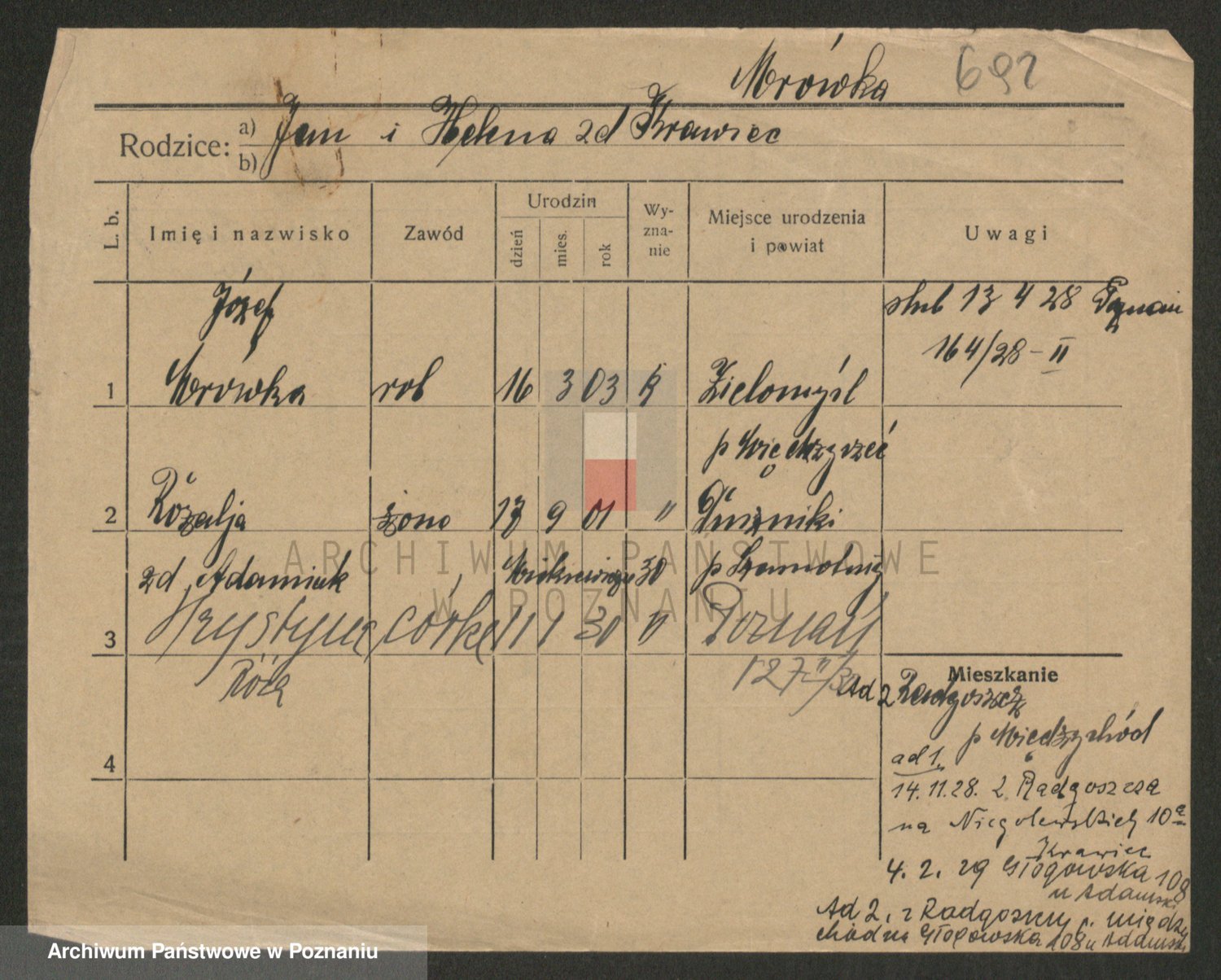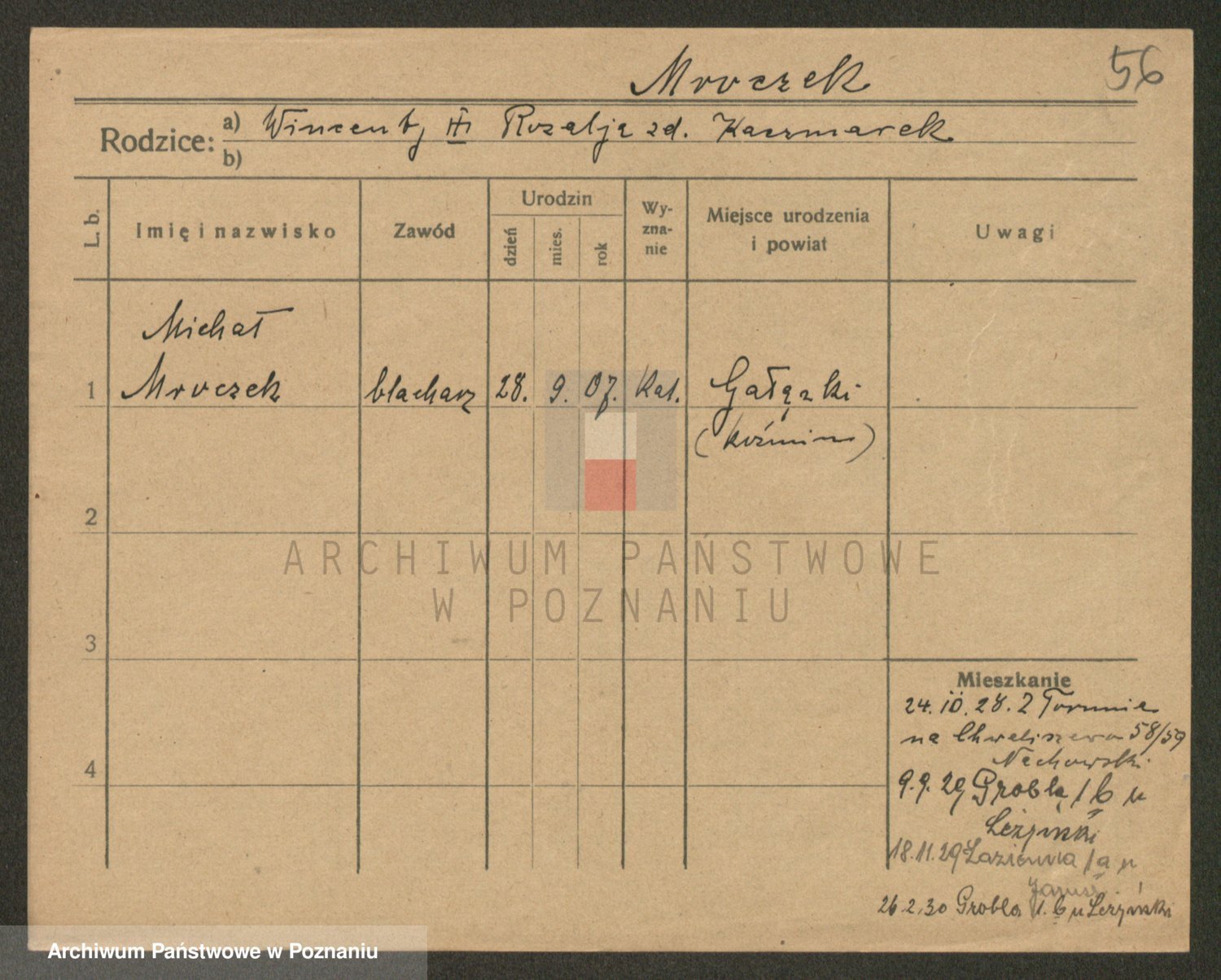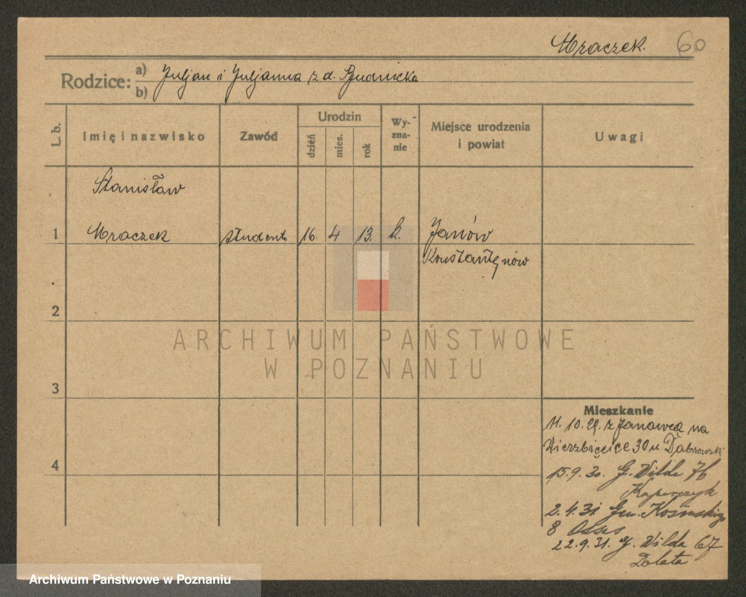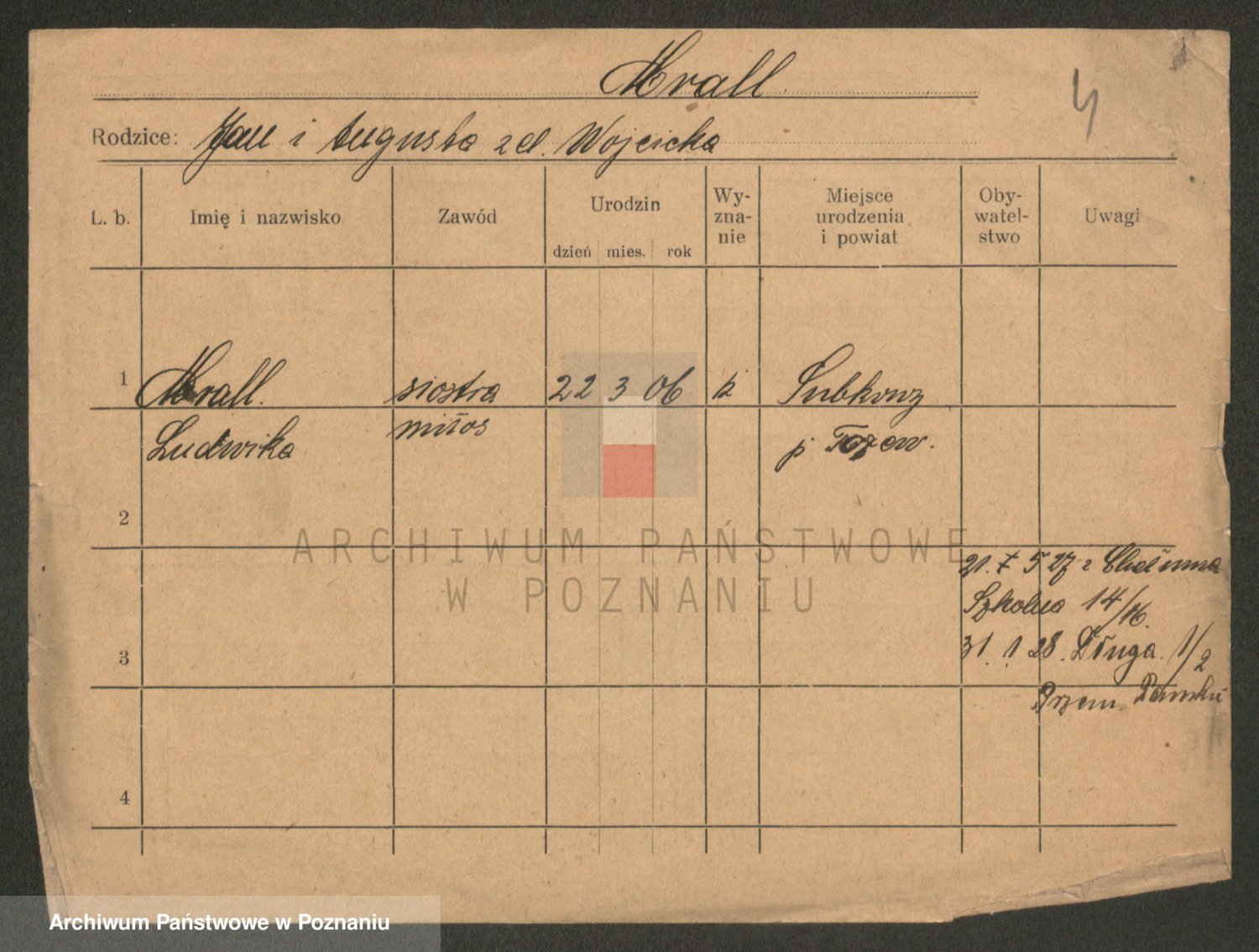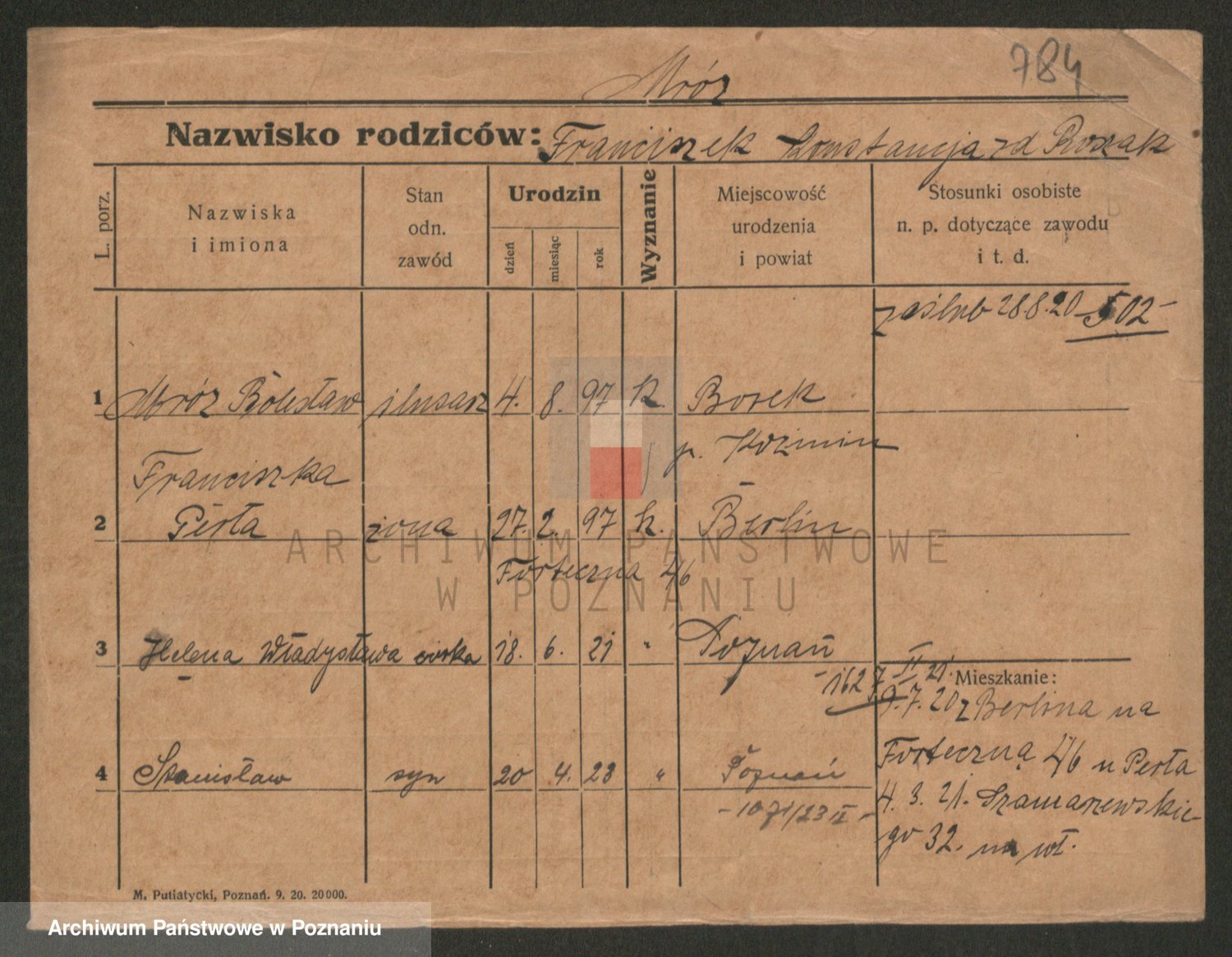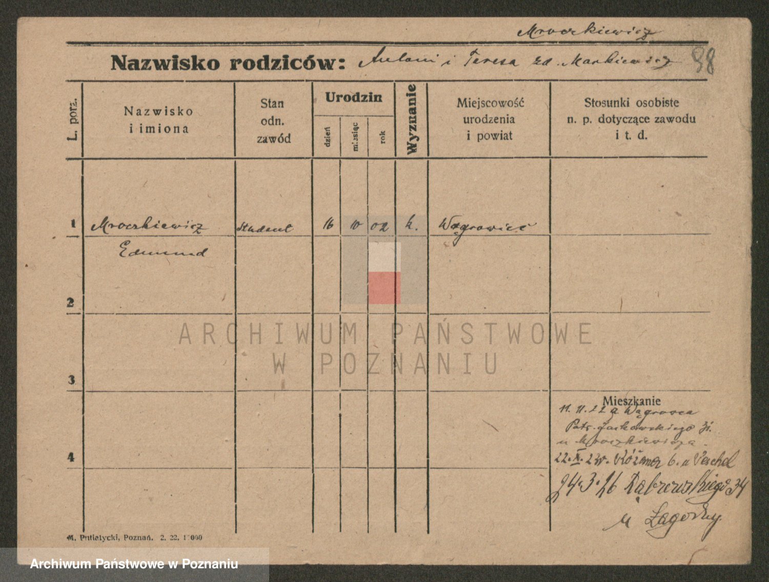 Podgląd karty osobowej dostępny jest po kliknięciu na nazwisko lub ikonkę karty. Można dokonywać powiększenia (ikony na górze) lub przechodzić między kolejnymi skanami (strzałki po bokach).