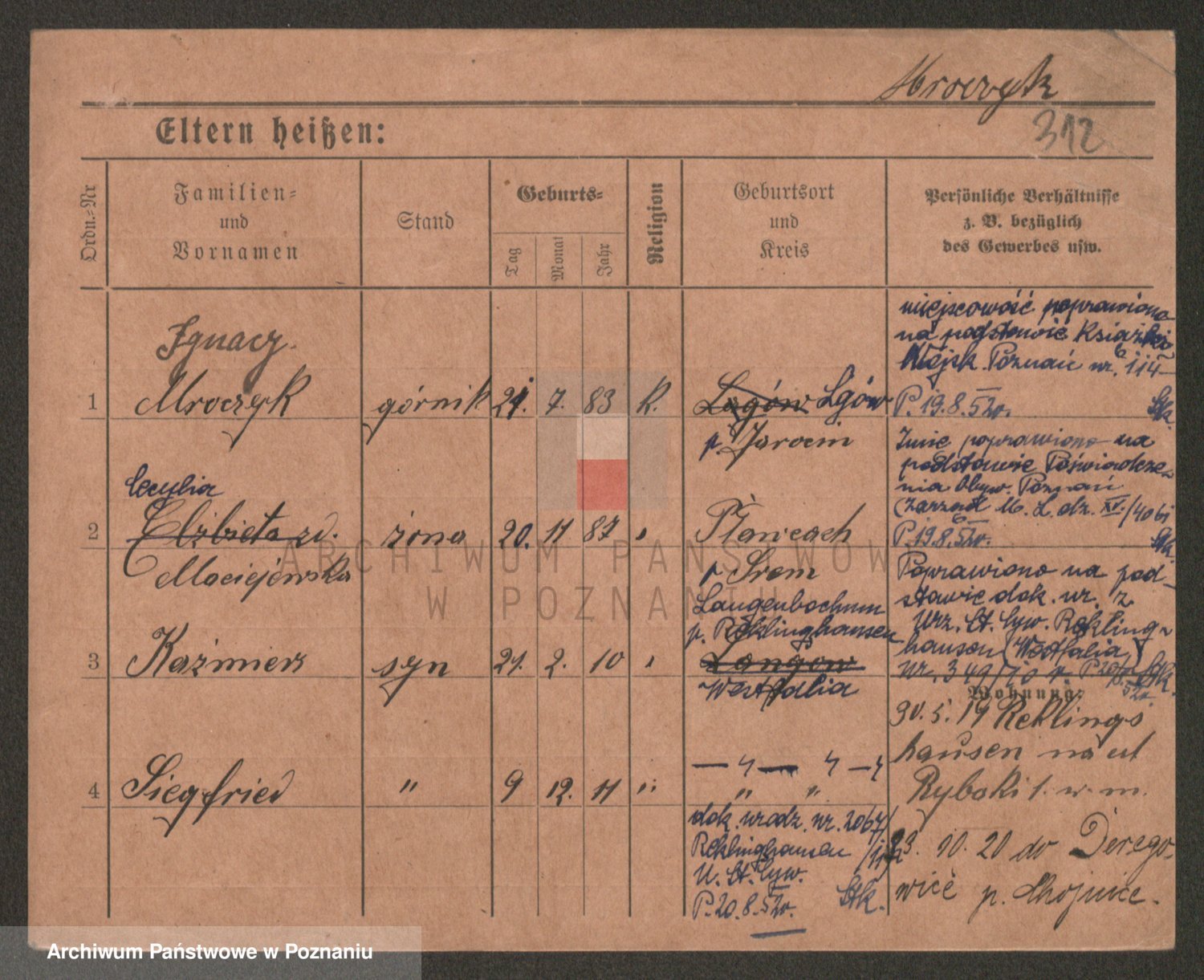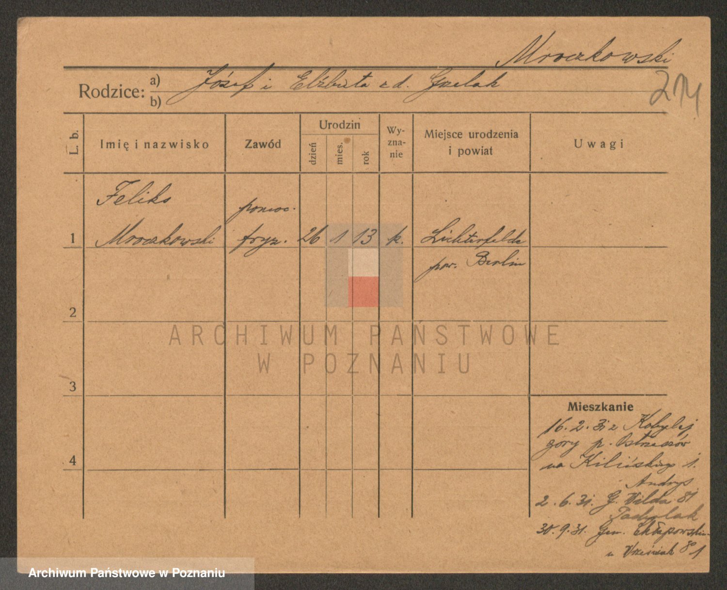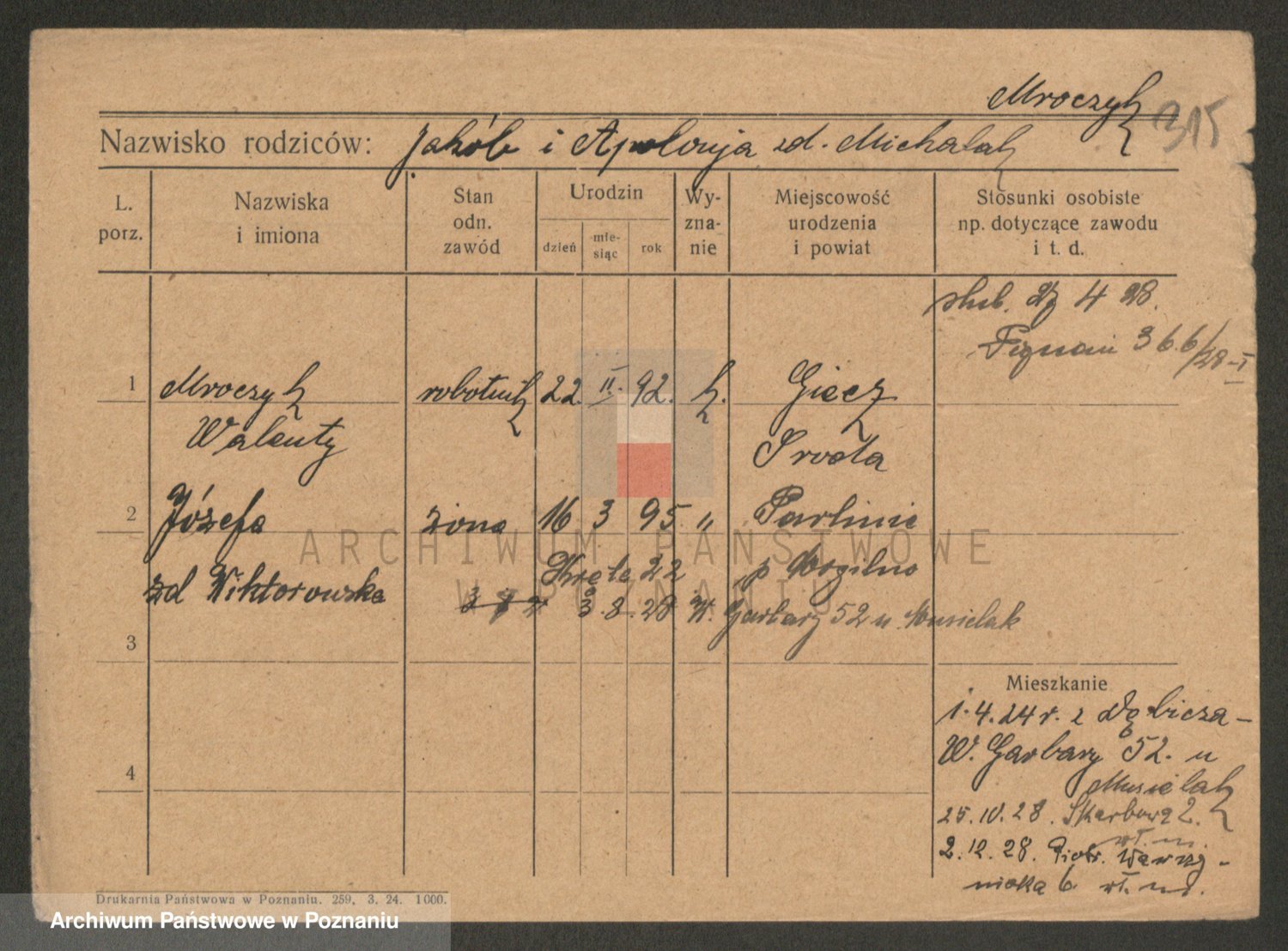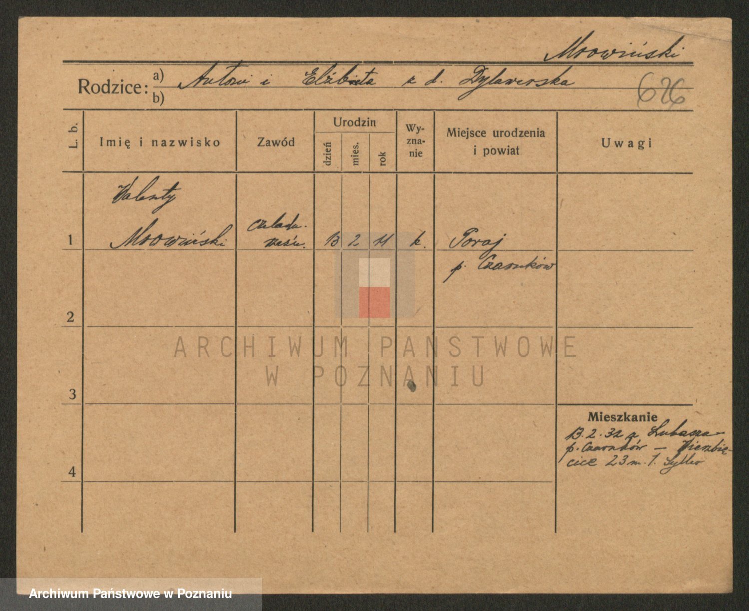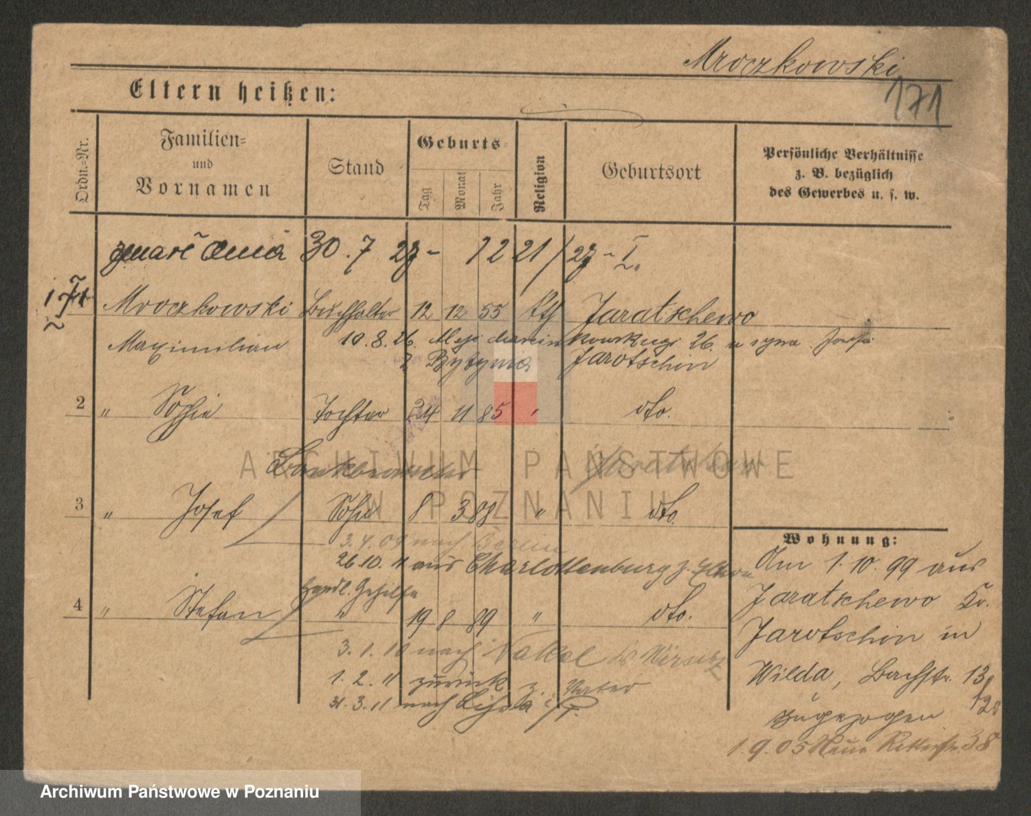 Podgląd karty osobowej dostępny jest po kliknięciu na nazwisko lub ikonkę karty. Można dokonywać powiększenia (ikony na górze) lub przechodzić między kolejnymi skanami (strzałki po bokach).