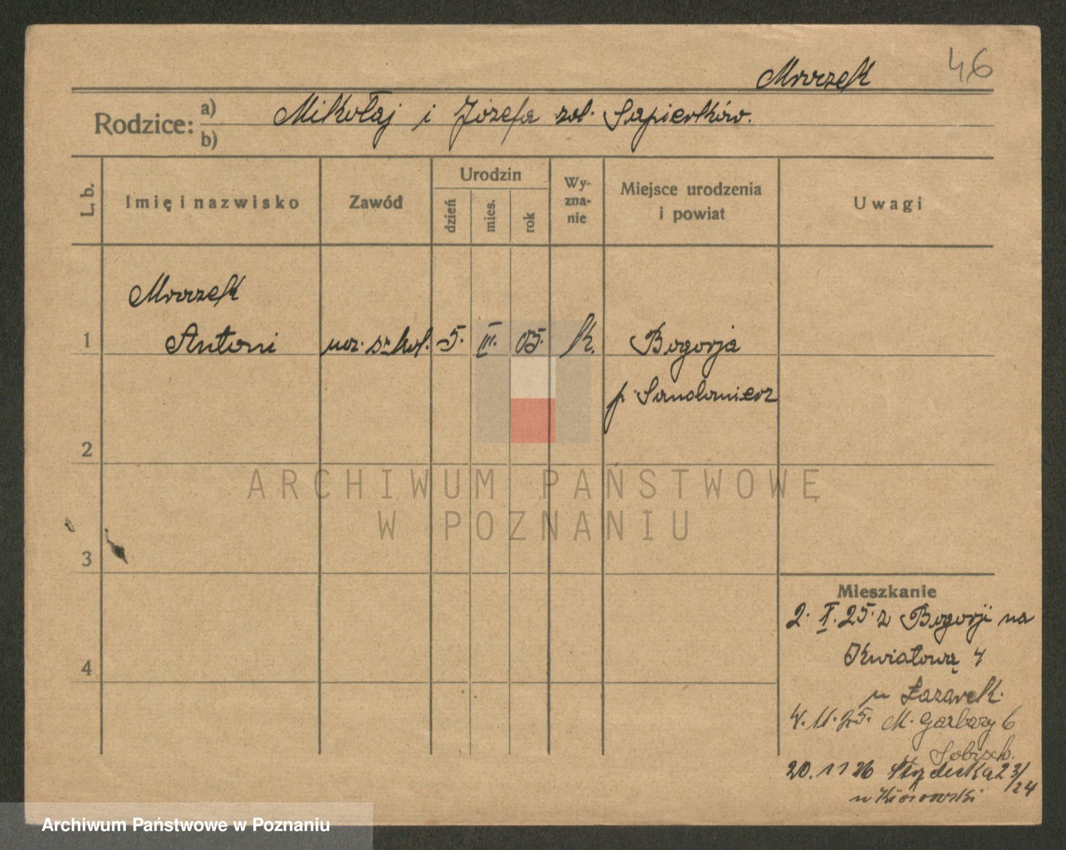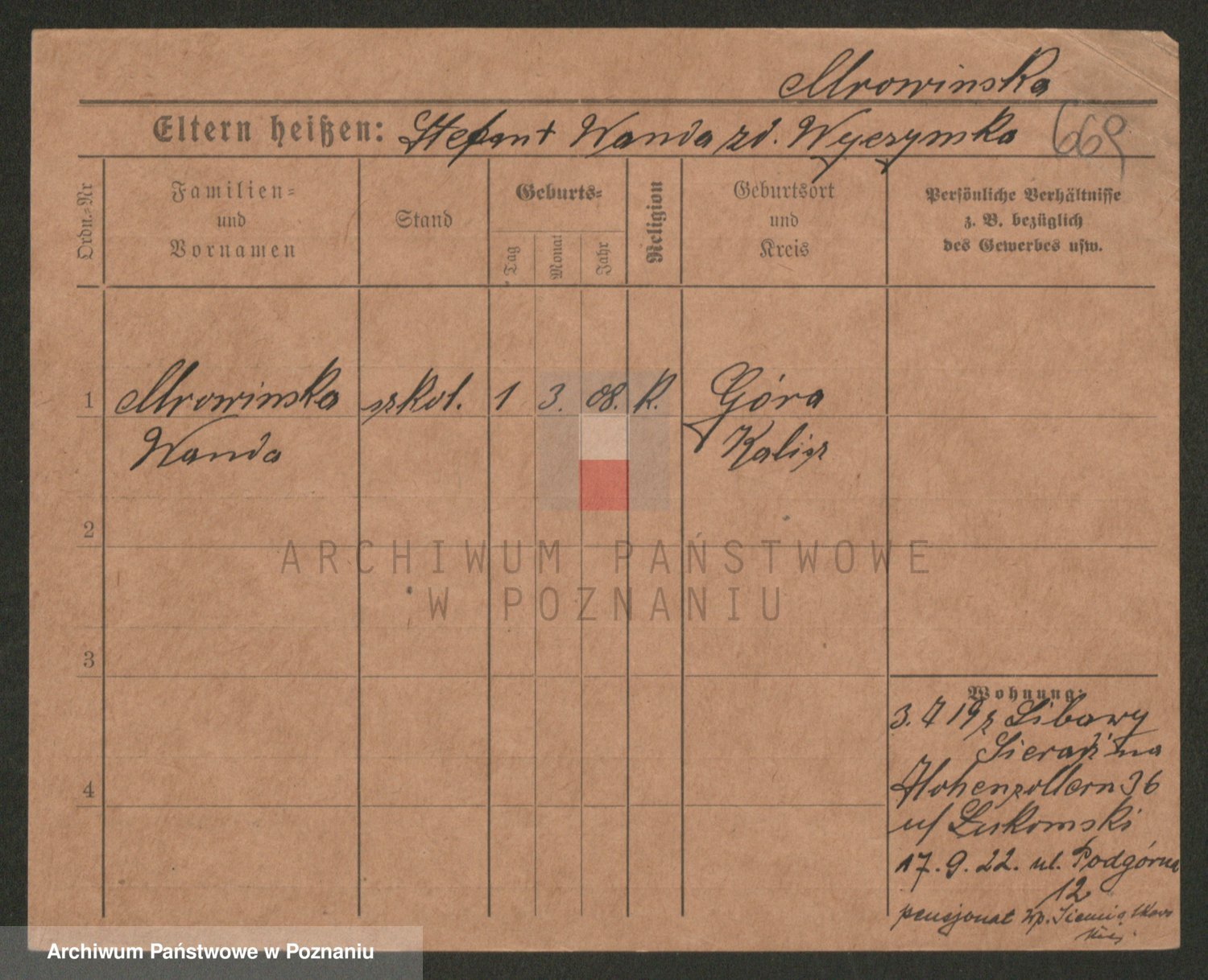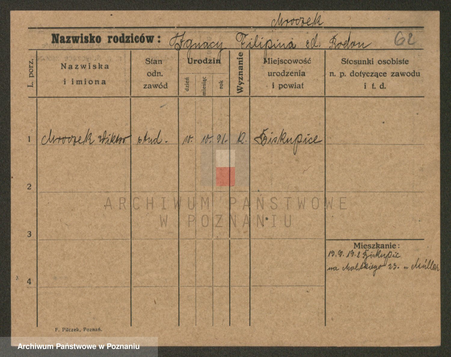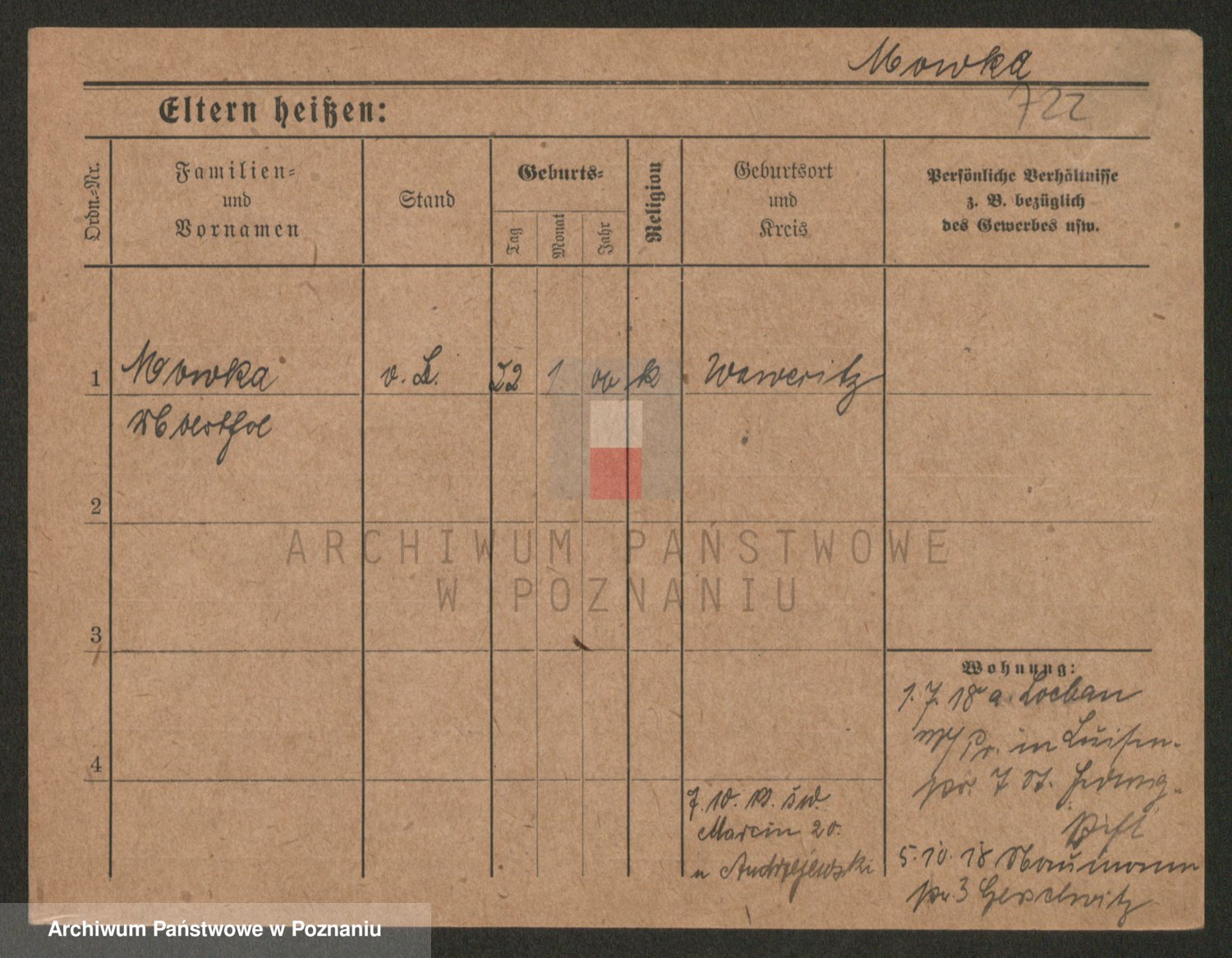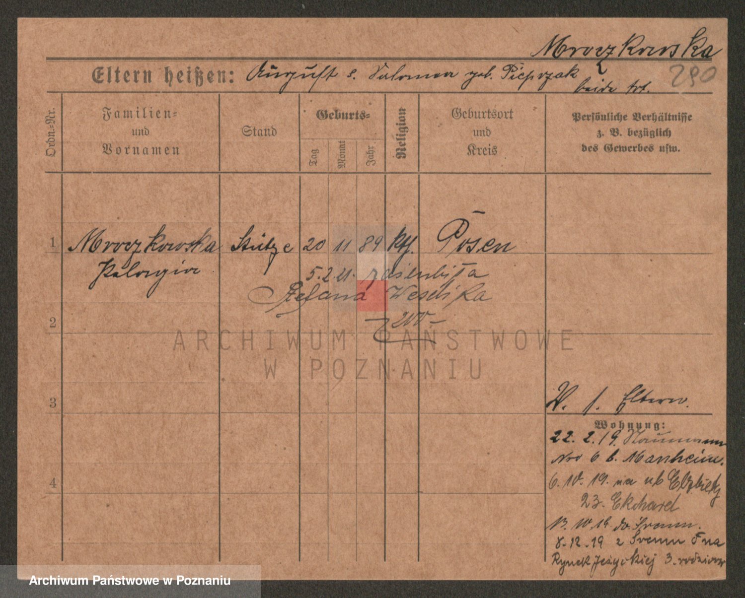 Podgląd karty osobowej dostępny jest po kliknięciu na nazwisko lub ikonkę karty. Można dokonywać powiększenia (ikony na górze) lub przechodzić między kolejnymi skanami (strzałki po bokach).