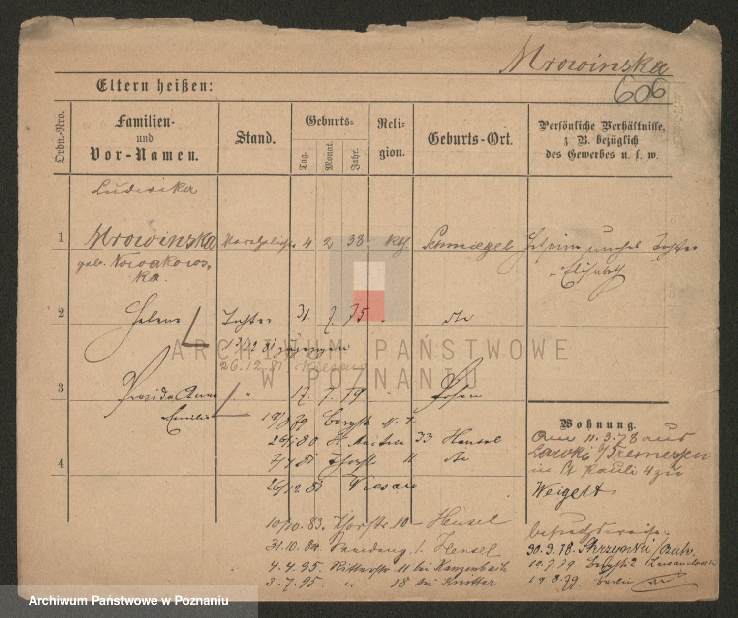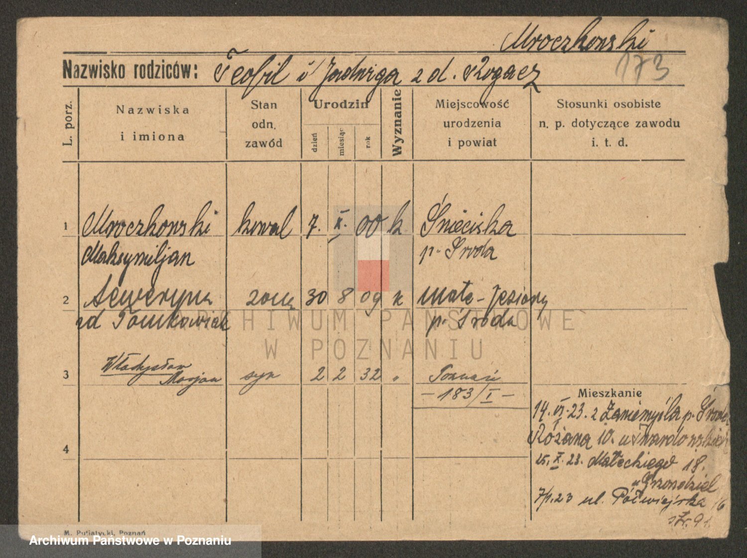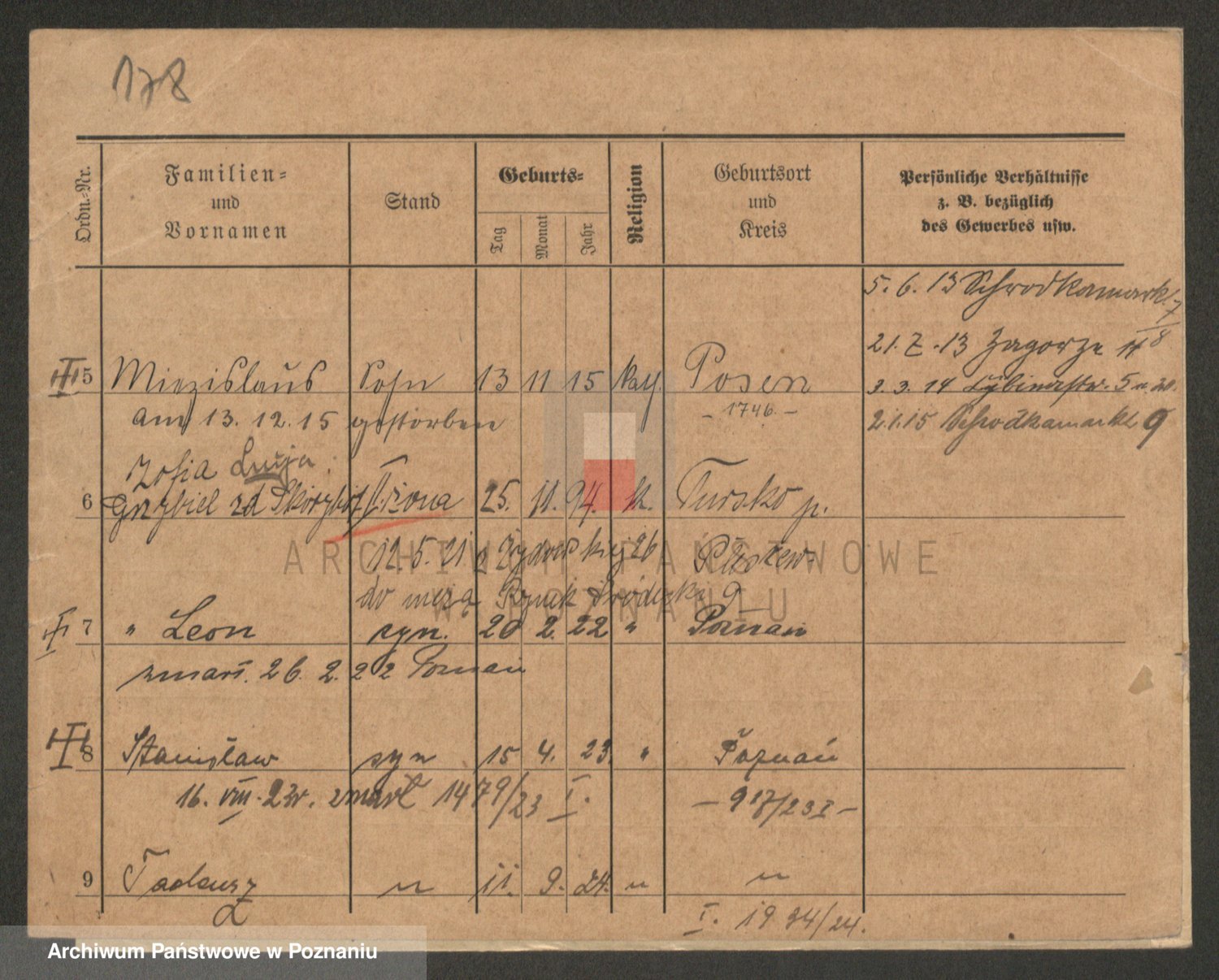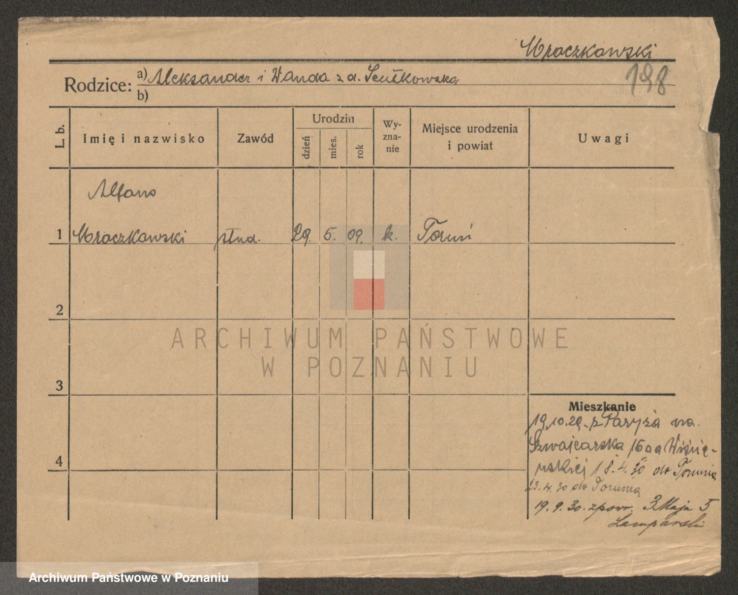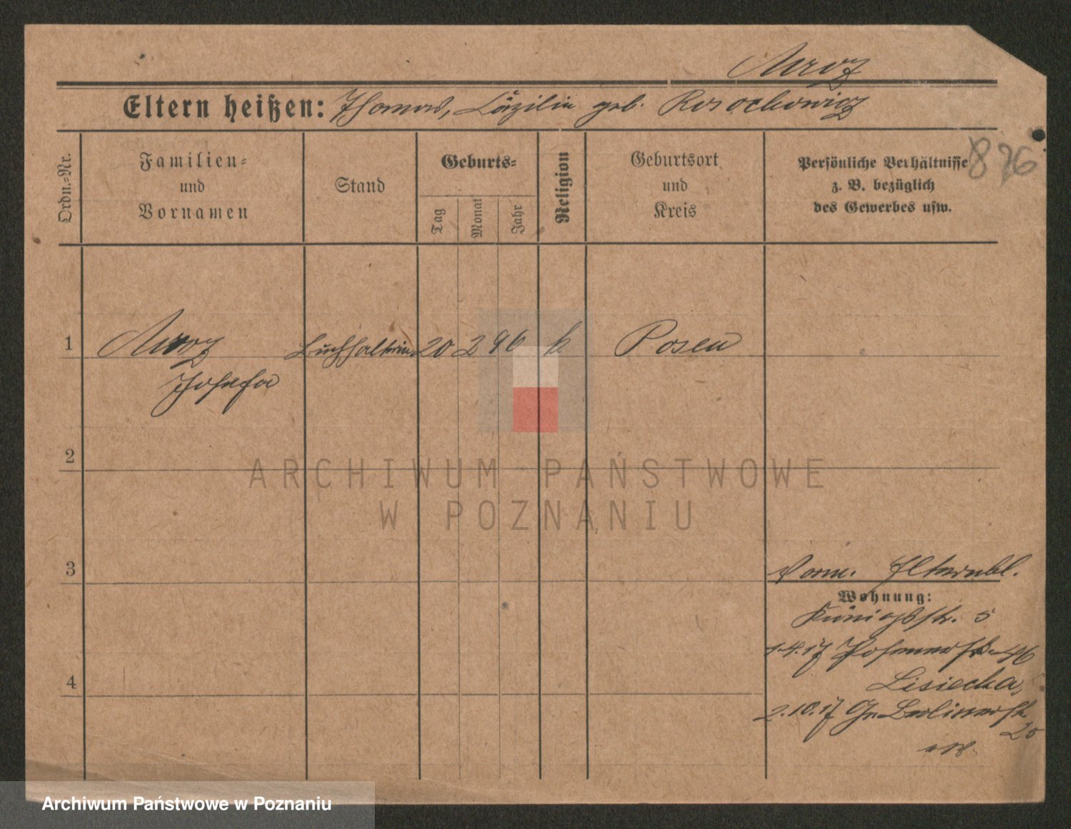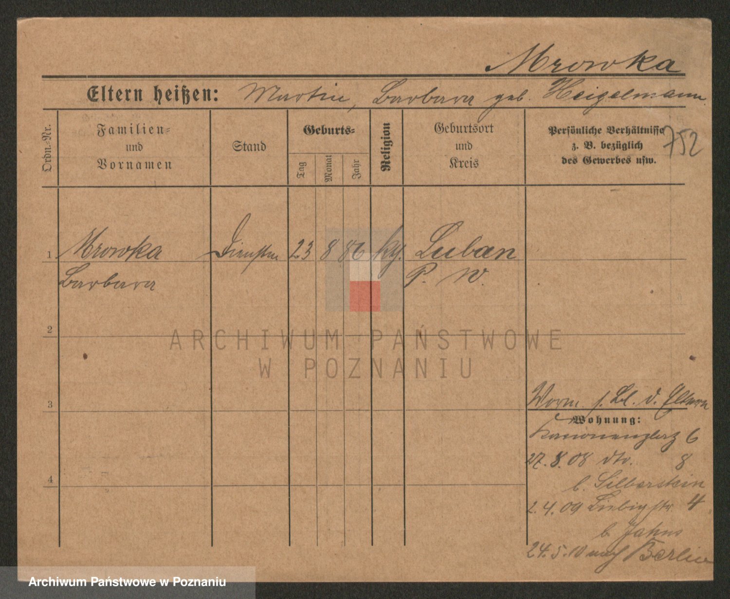 Podgląd karty osobowej dostępny jest po kliknięciu na nazwisko lub ikonkę karty. Można dokonywać powiększenia (ikony na górze) lub przechodzić między kolejnymi skanami (strzałki po bokach).