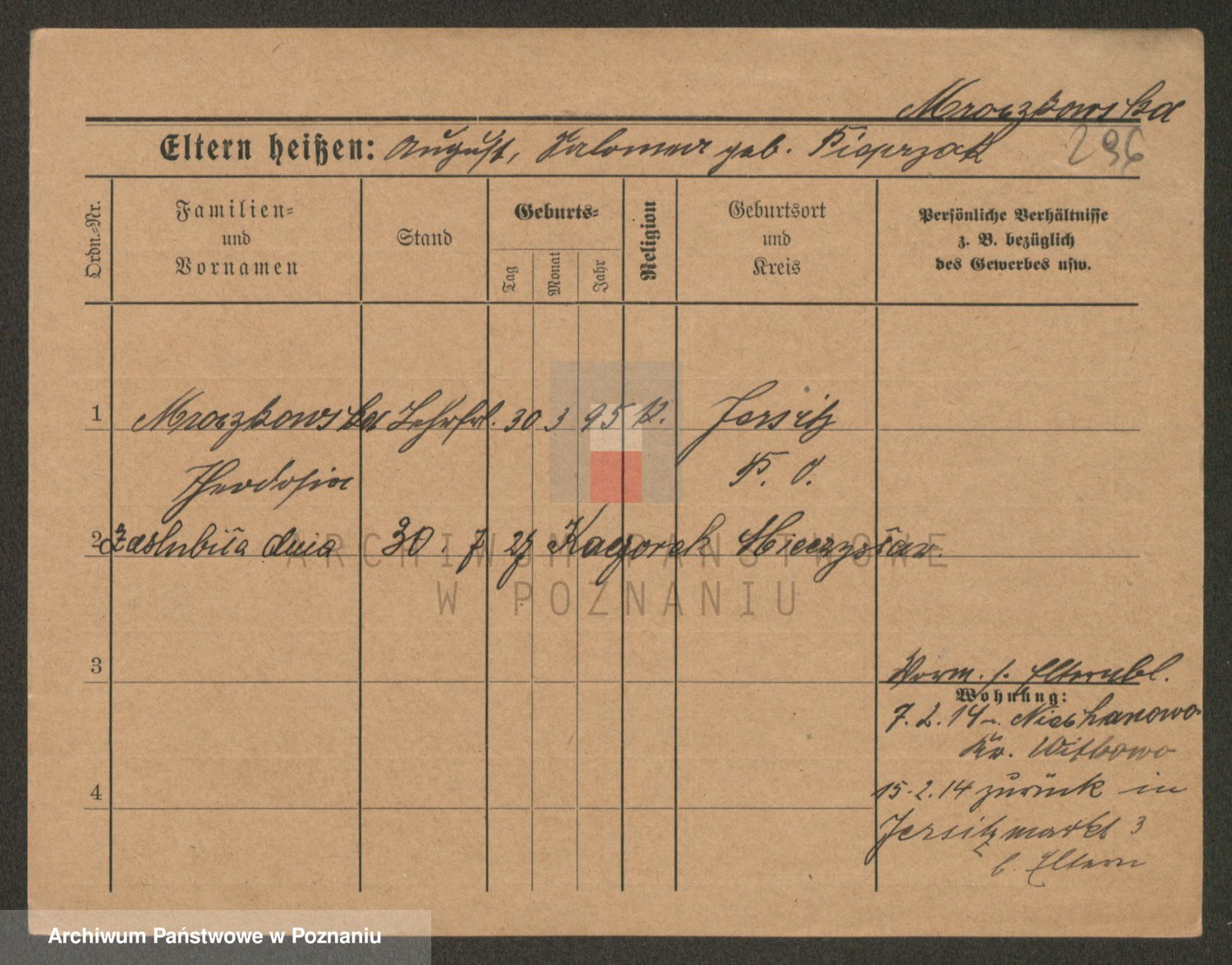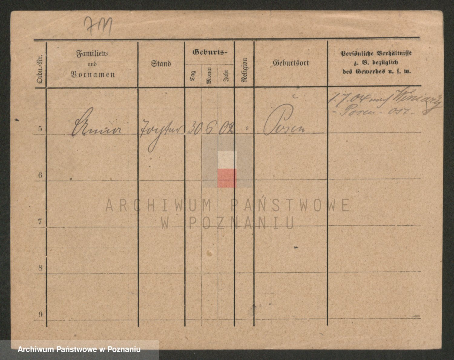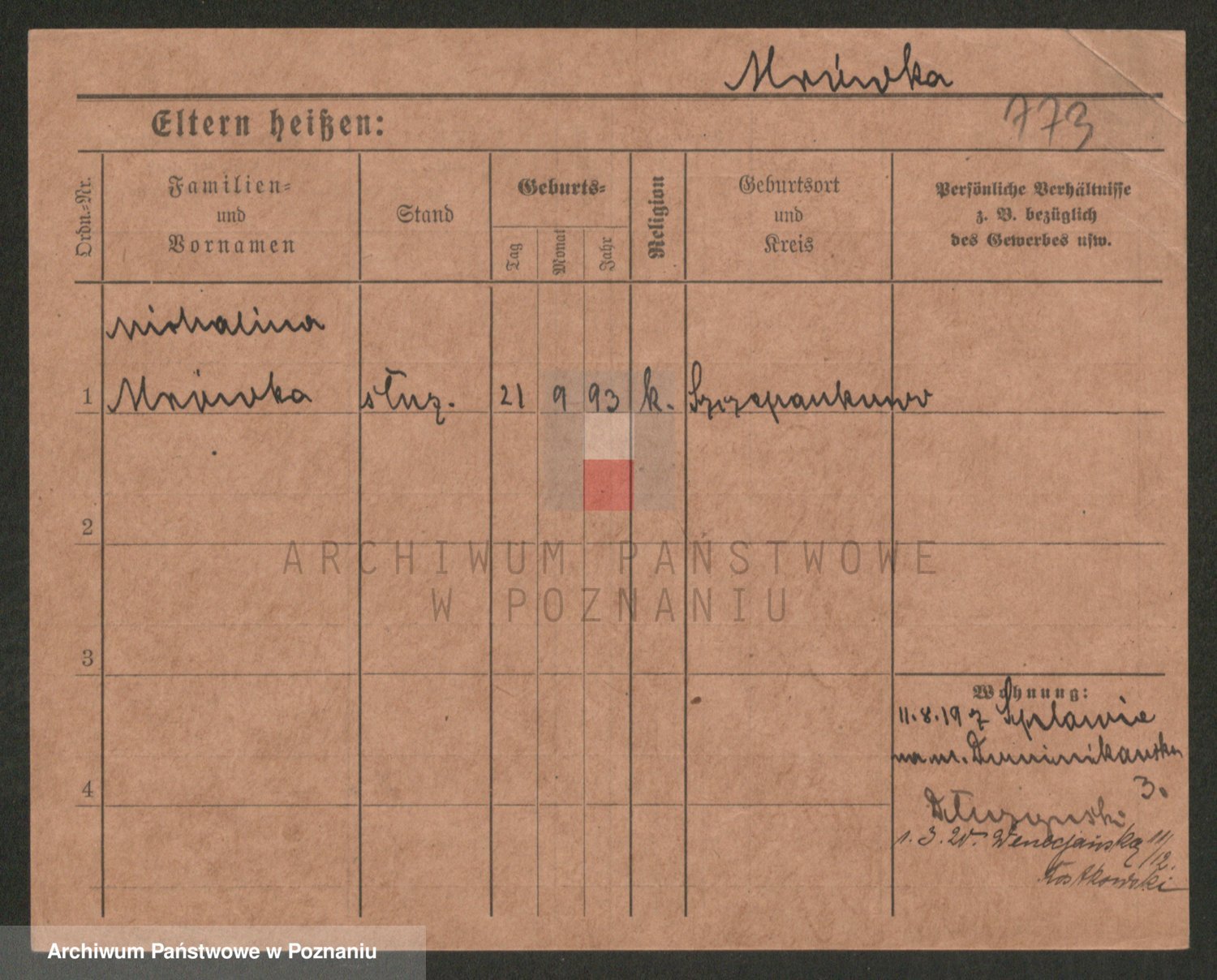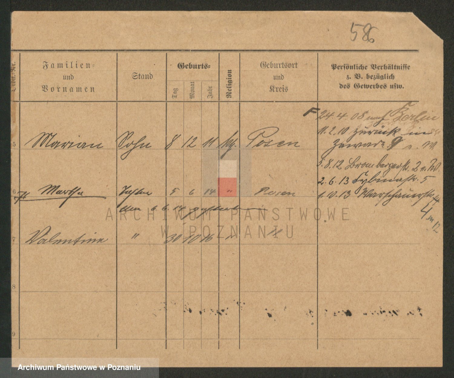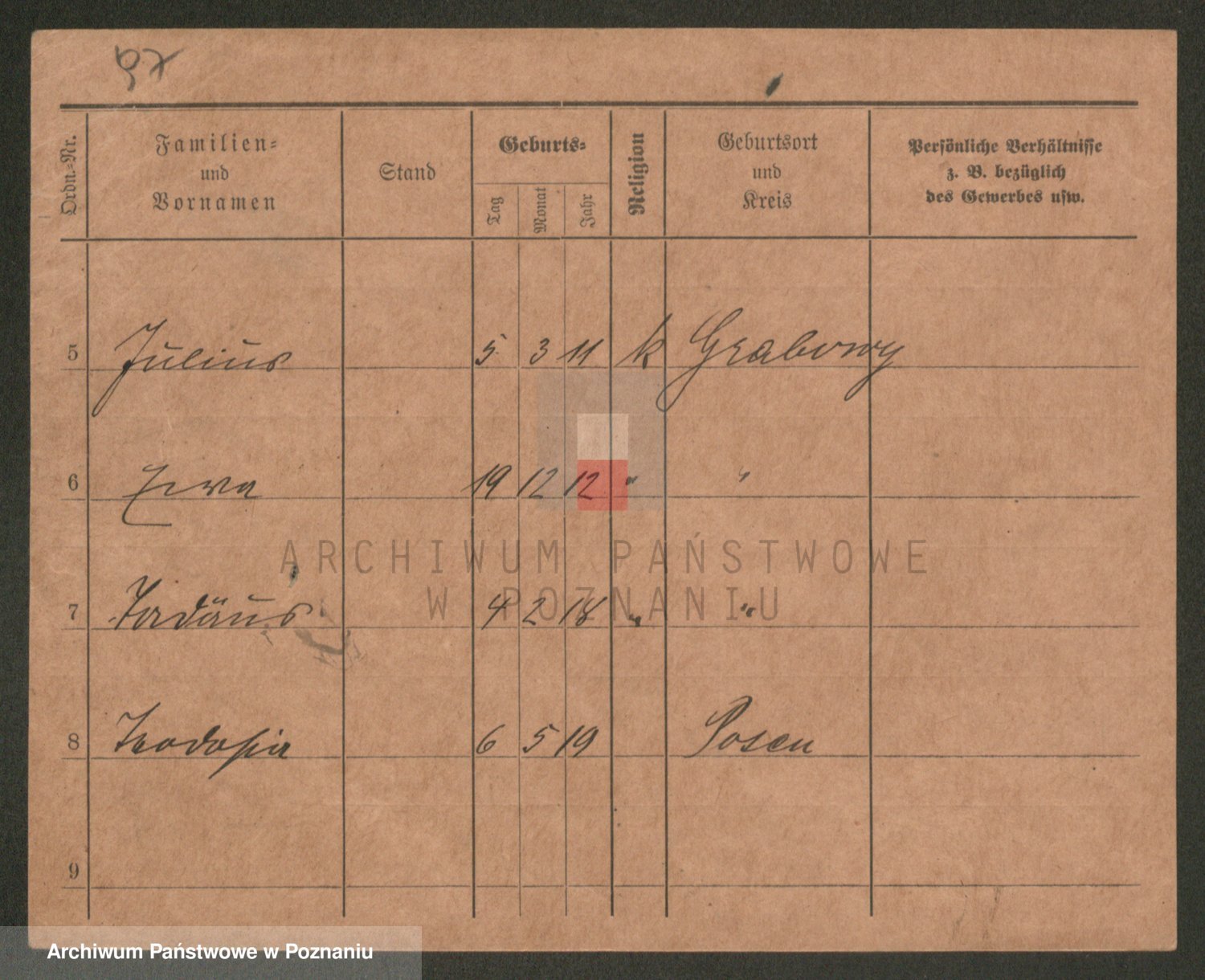 Podgląd karty osobowej dostępny jest po kliknięciu na nazwisko lub ikonkę karty. Można dokonywać powiększenia (ikony na górze) lub przechodzić między kolejnymi skanami (strzałki po bokach).