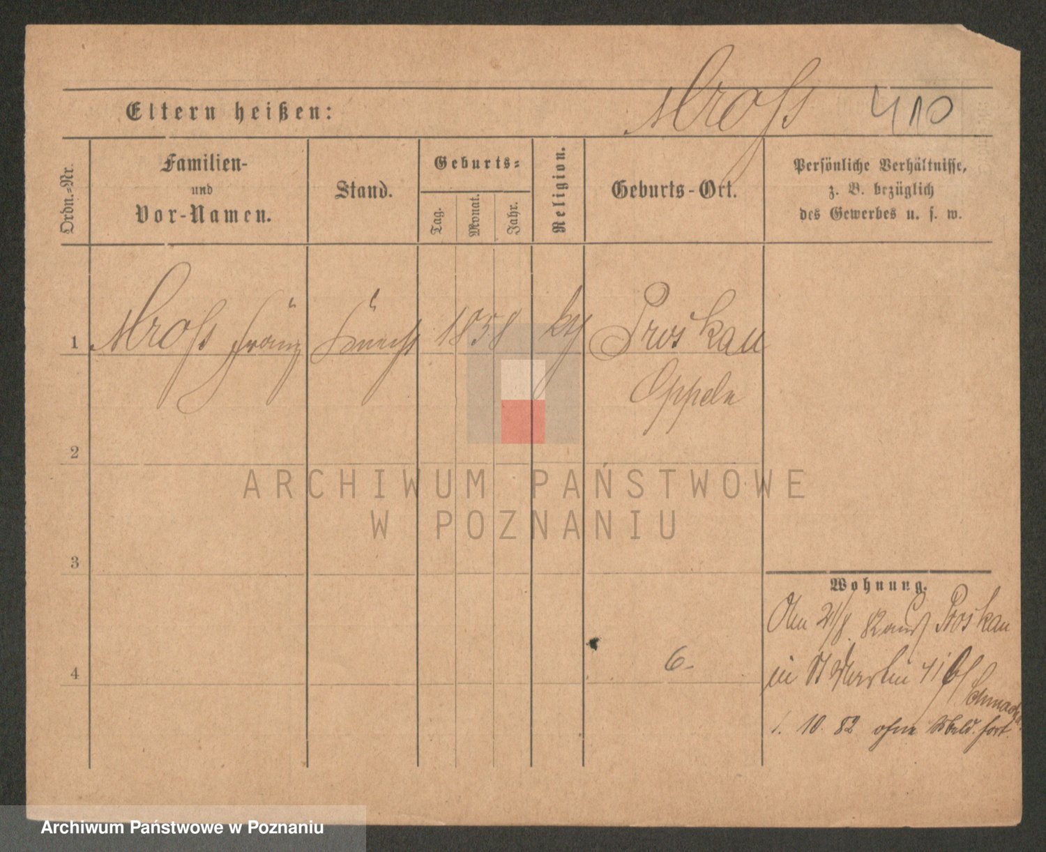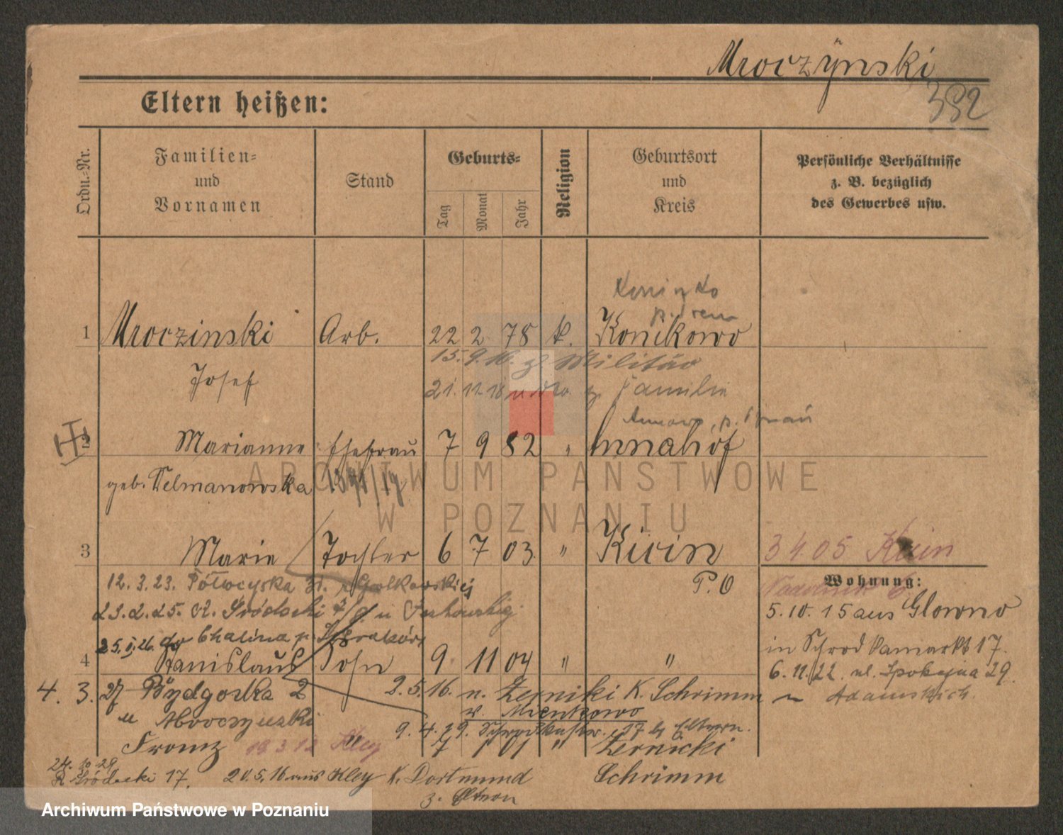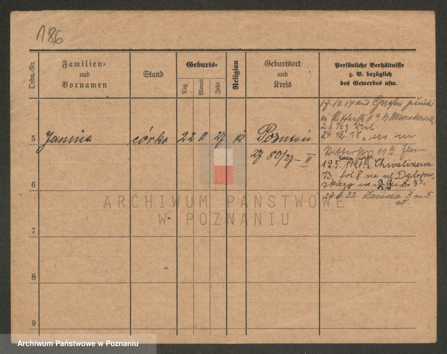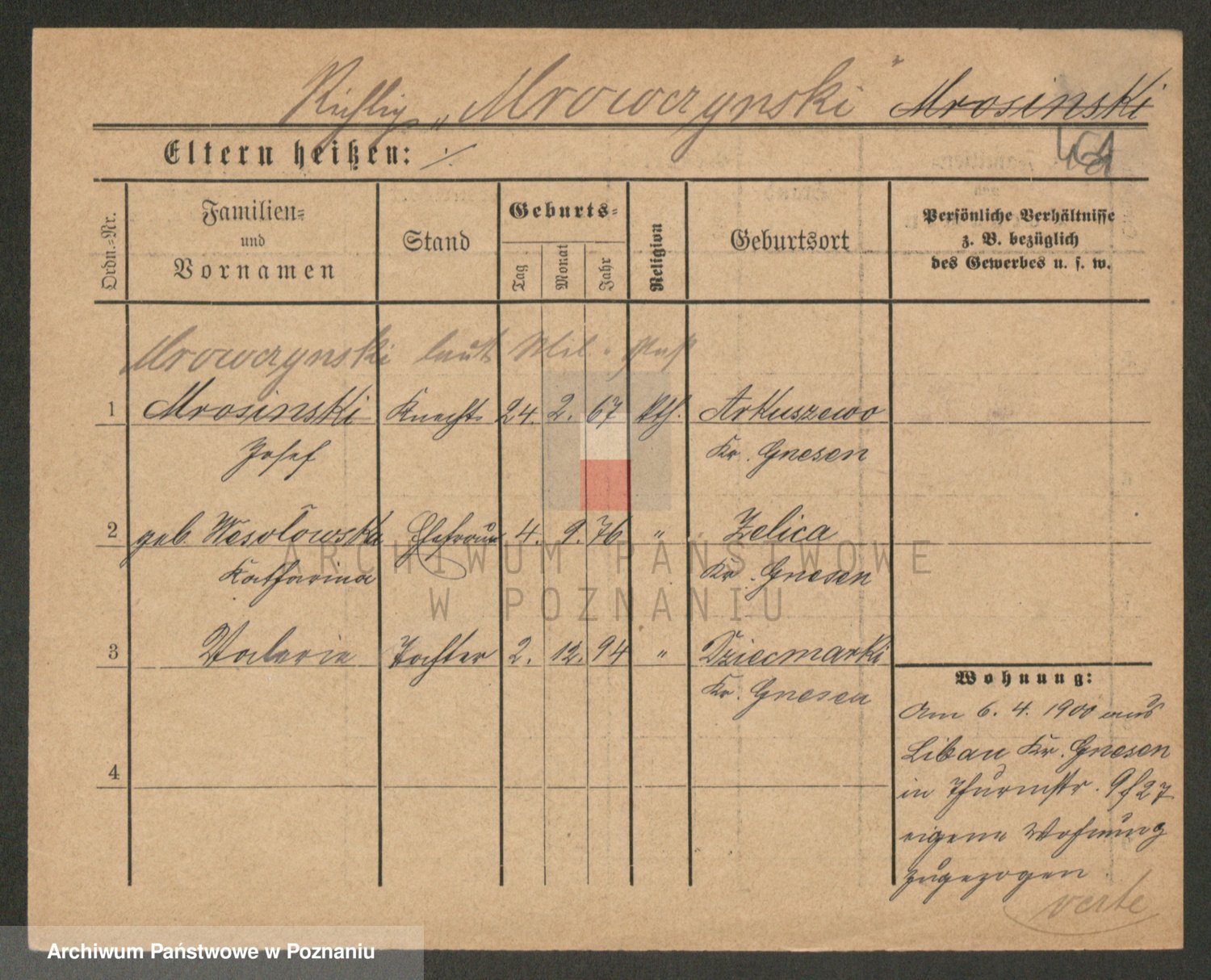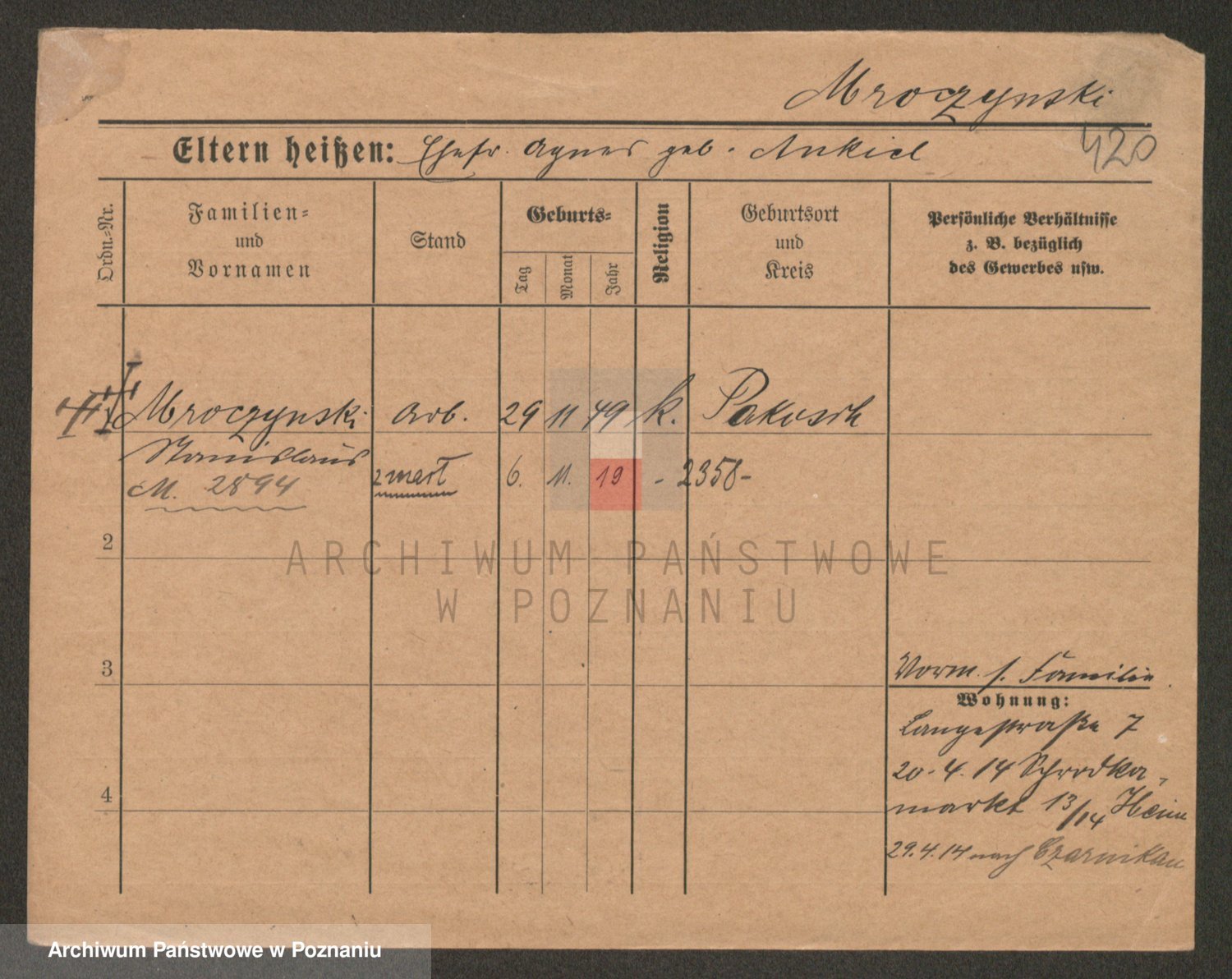 Podgląd karty osobowej dostępny jest po kliknięciu na nazwisko lub ikonkę karty. Można dokonywać powiększenia (ikony na górze) lub przechodzić między kolejnymi skanami (strzałki po bokach).