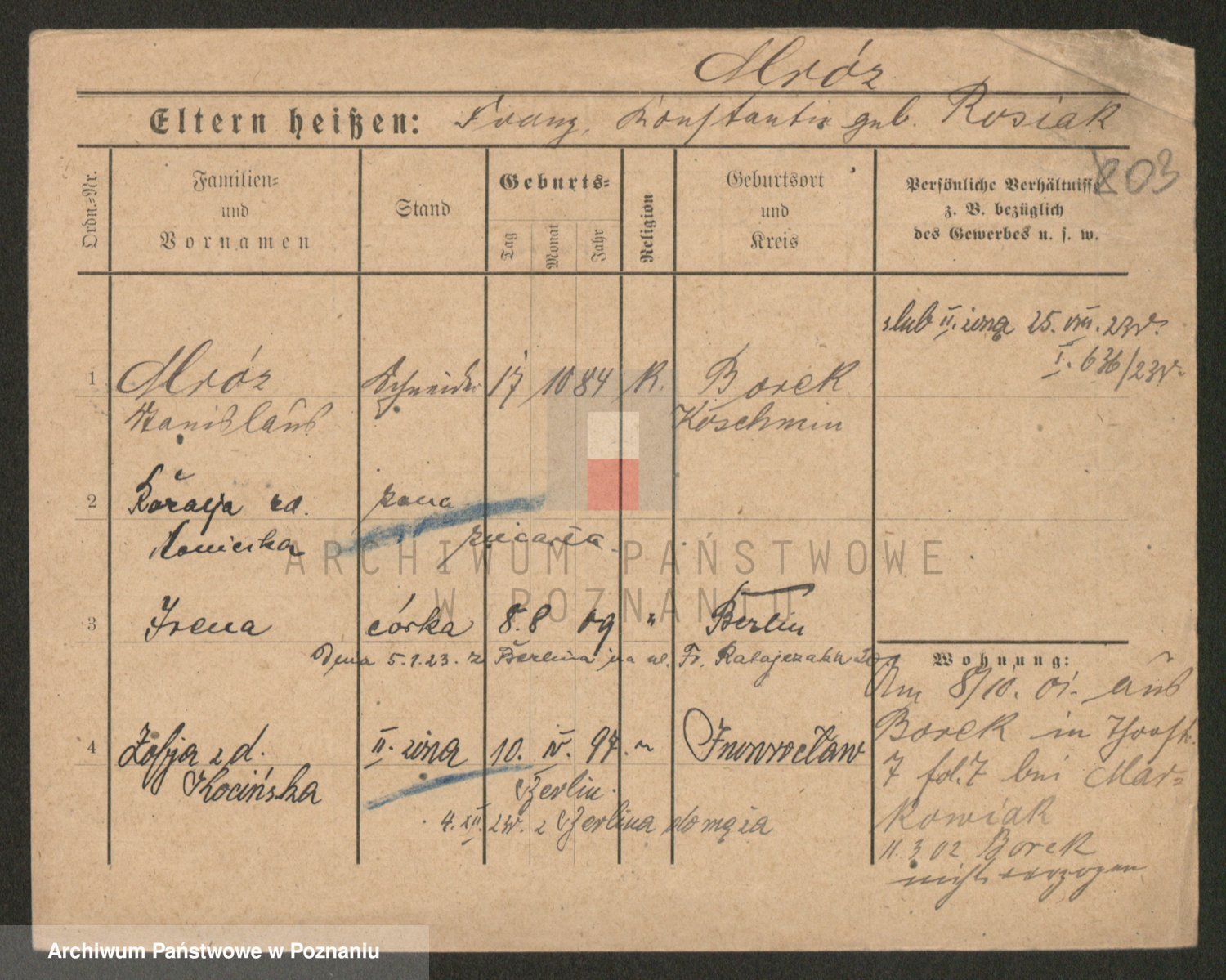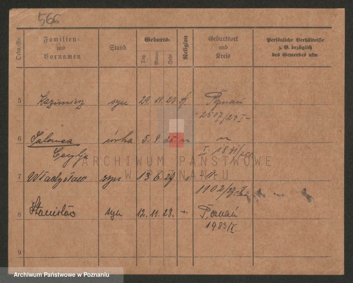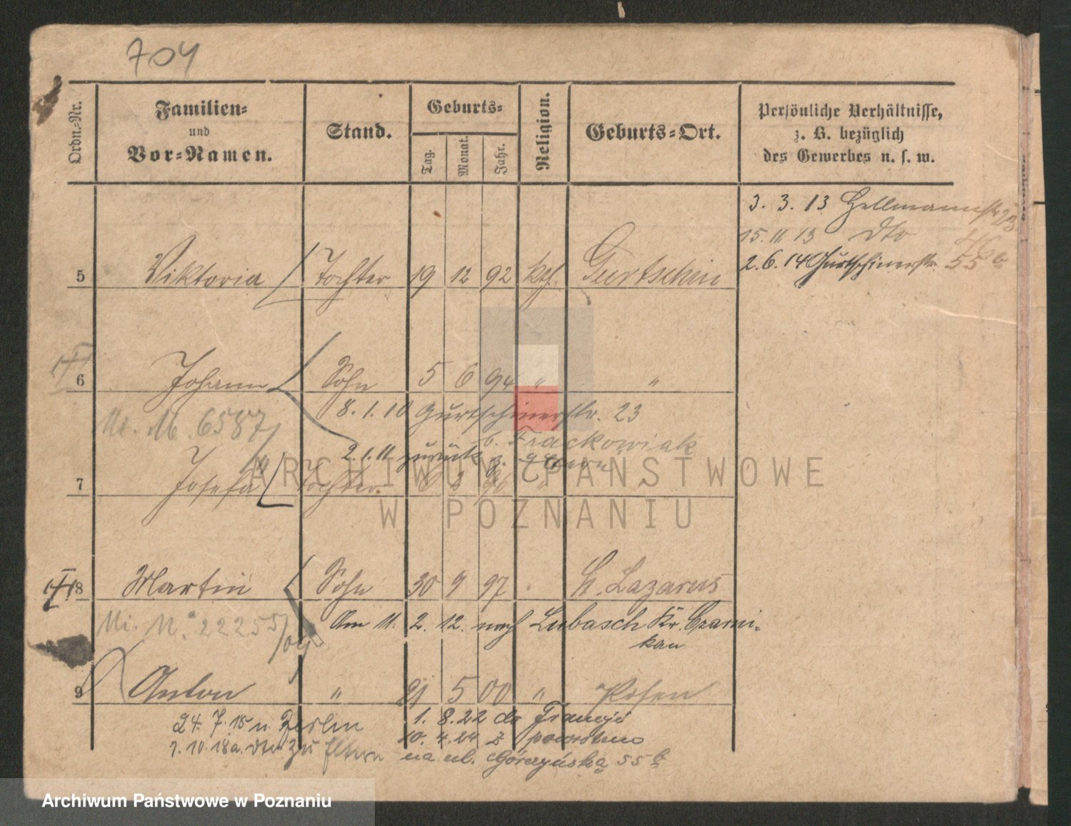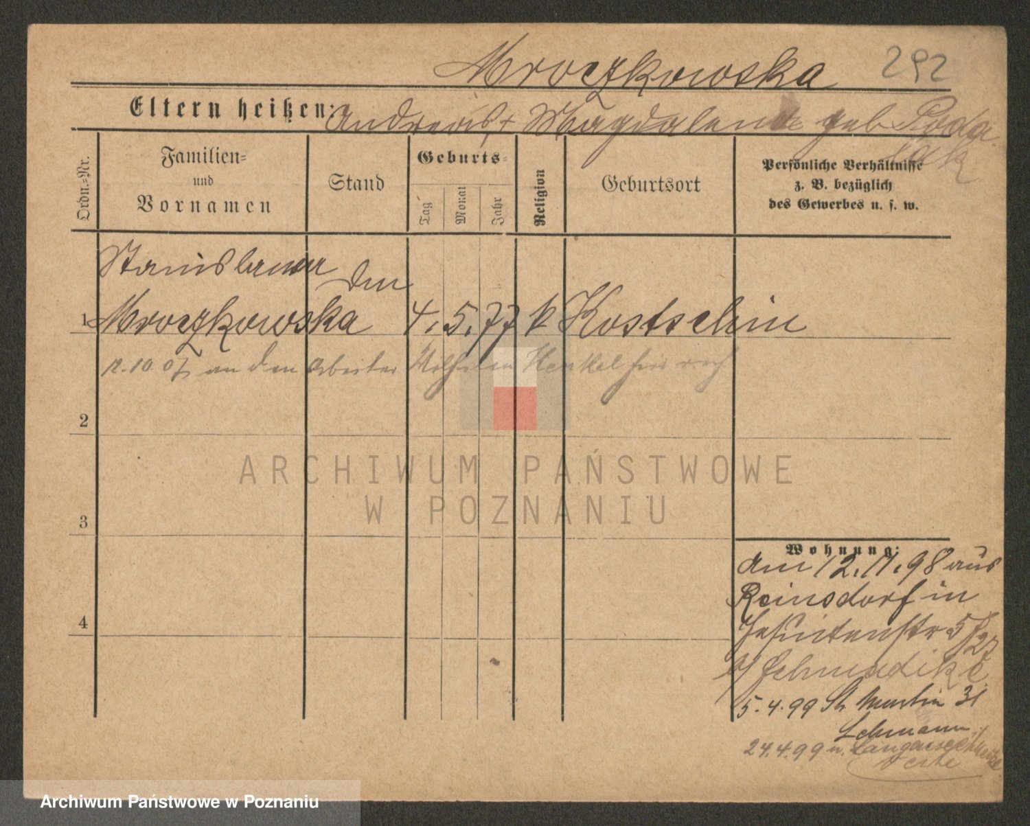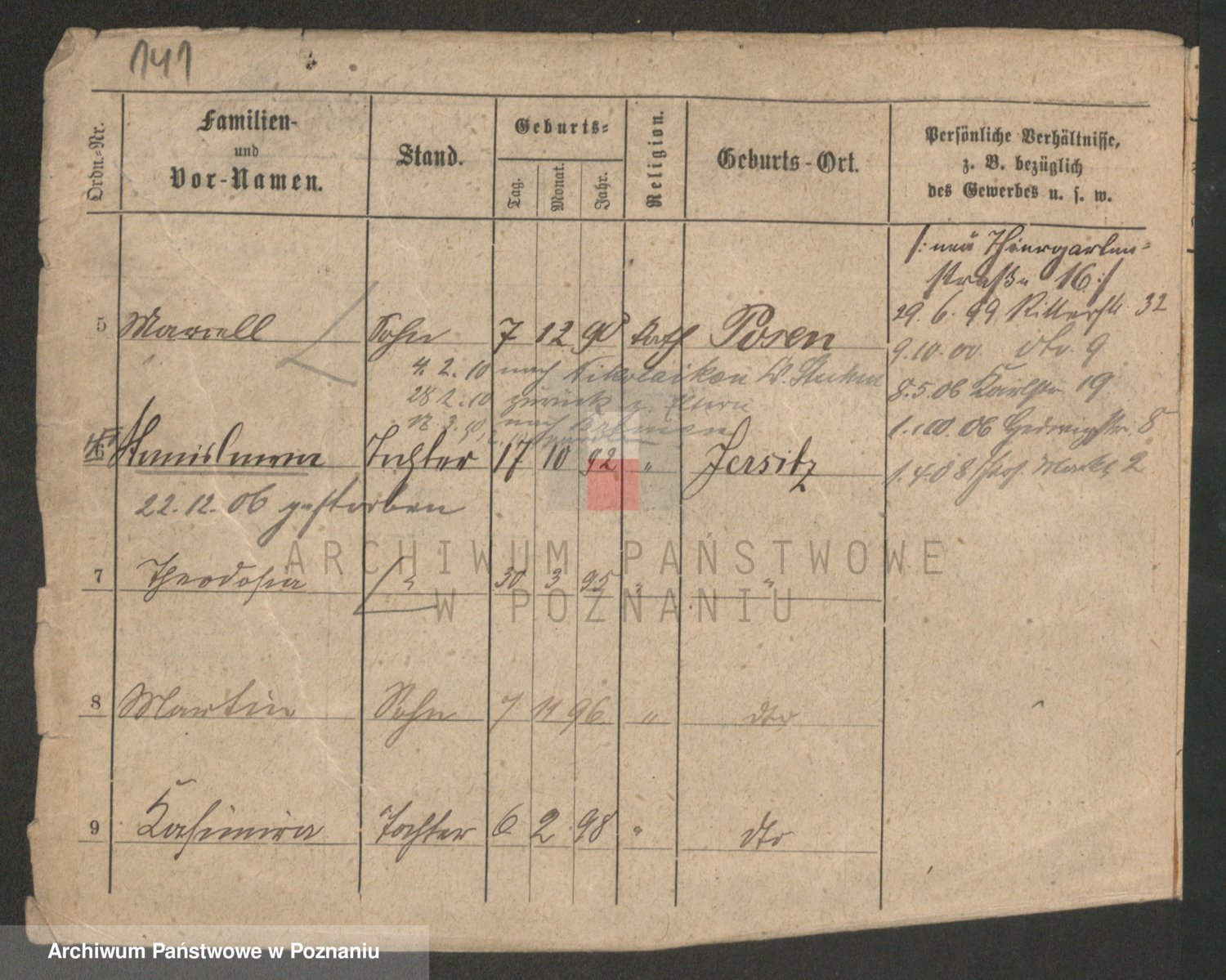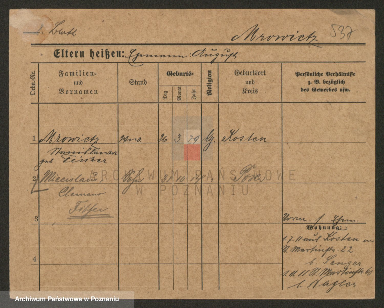 Podgląd karty osobowej dostępny jest po kliknięciu na nazwisko lub ikonkę karty. Można dokonywać powiększenia (ikony na górze) lub przechodzić między kolejnymi skanami (strzałki po bokach).