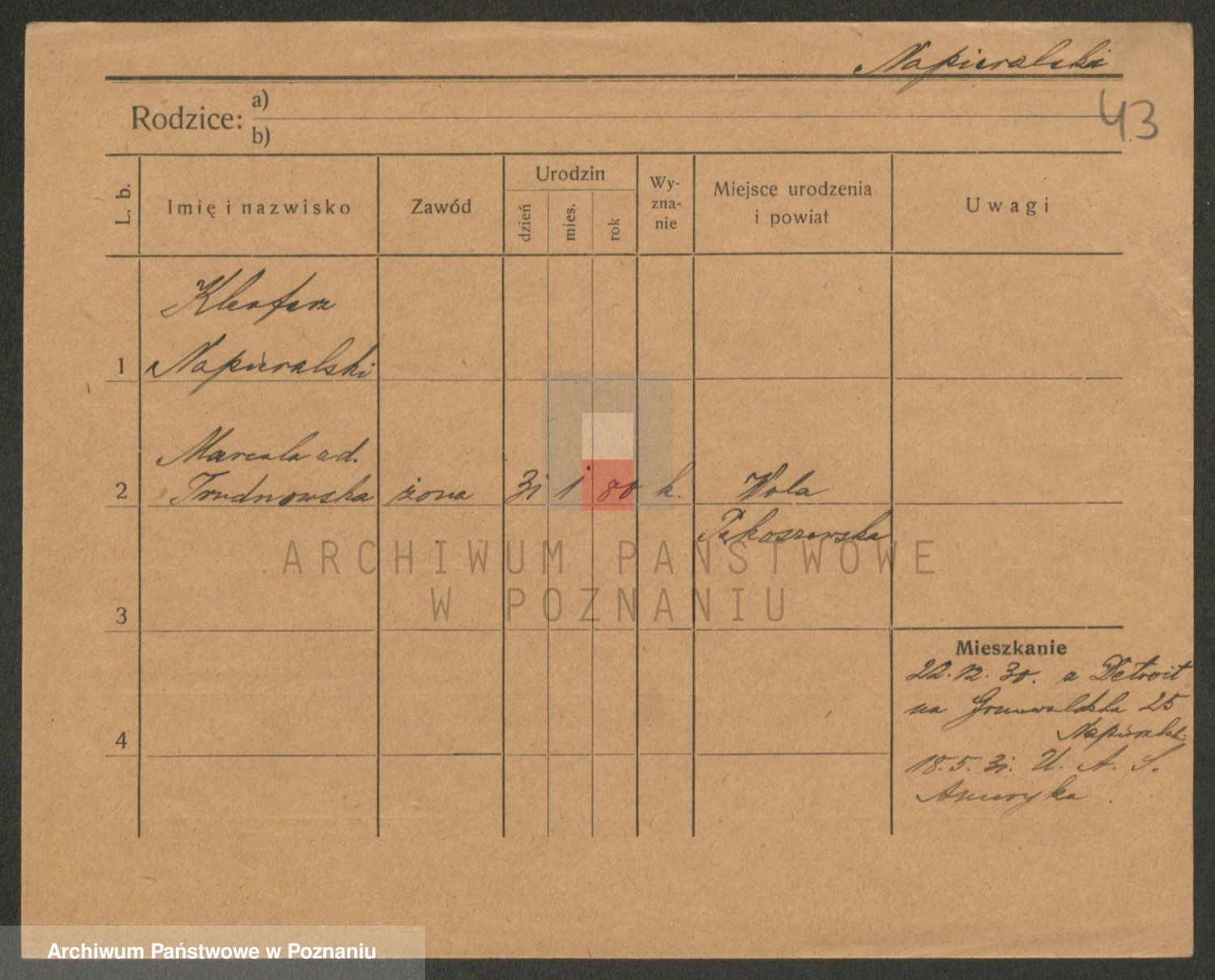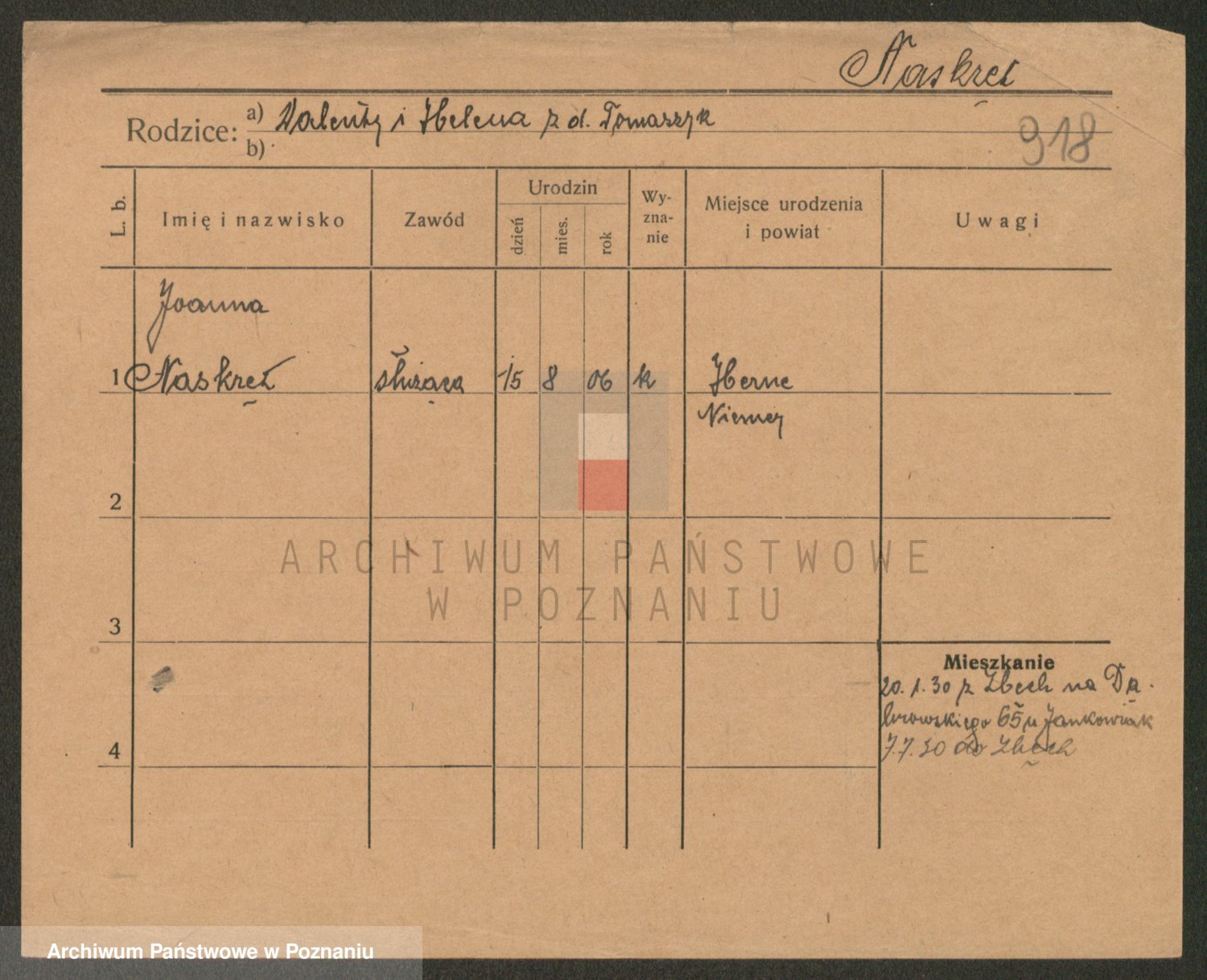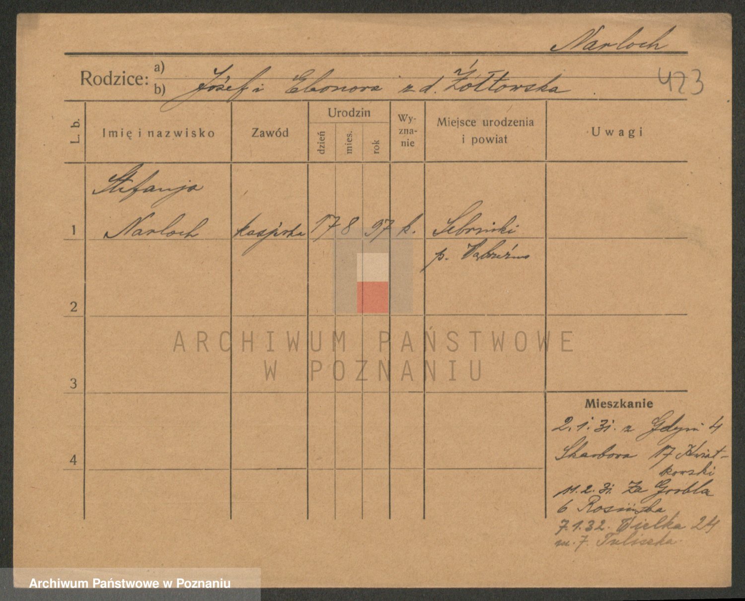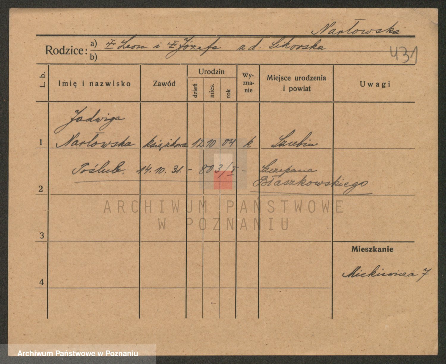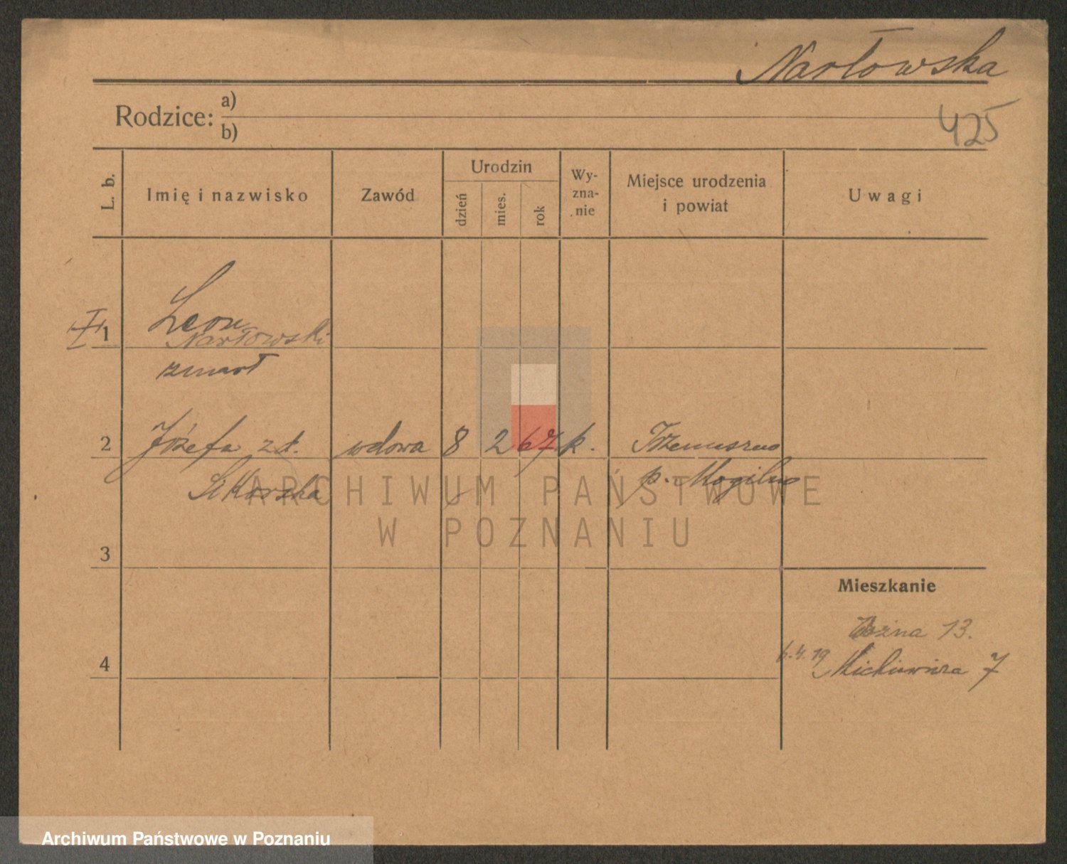 Podgląd karty osobowej dostępny jest po kliknięciu na nazwisko lub ikonkę karty. Można dokonywać powiększenia (ikony na górze) lub przechodzić między kolejnymi skanami (strzałki po bokach).