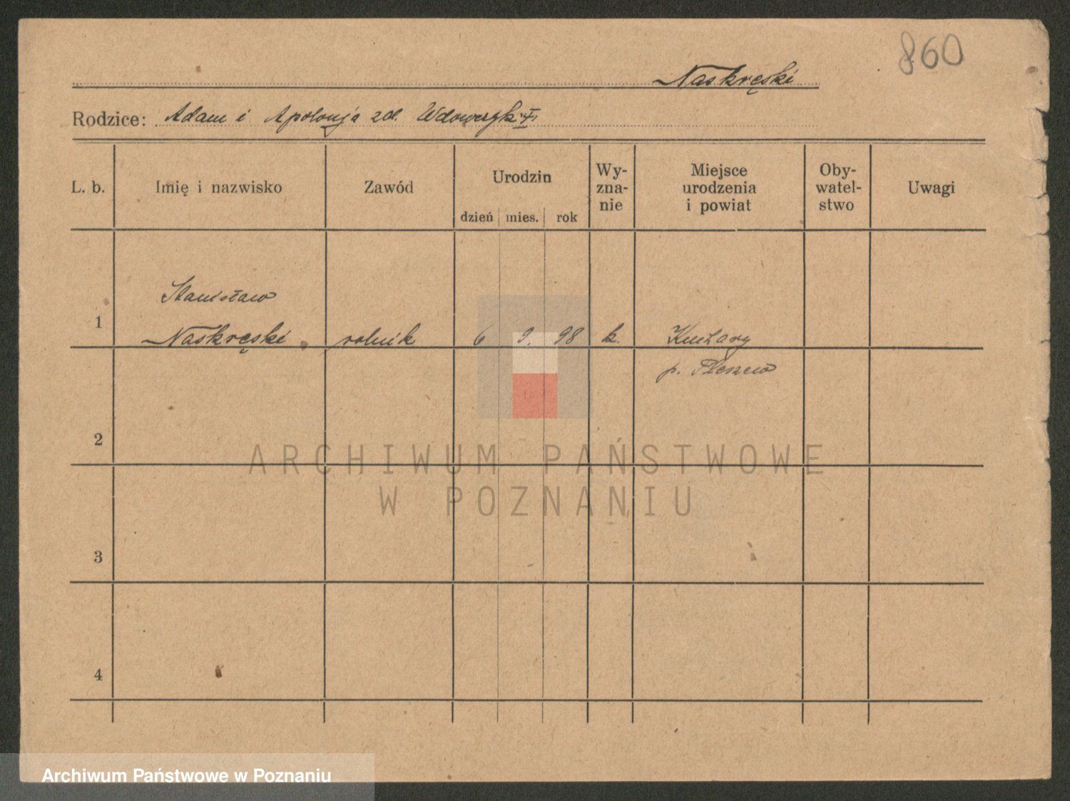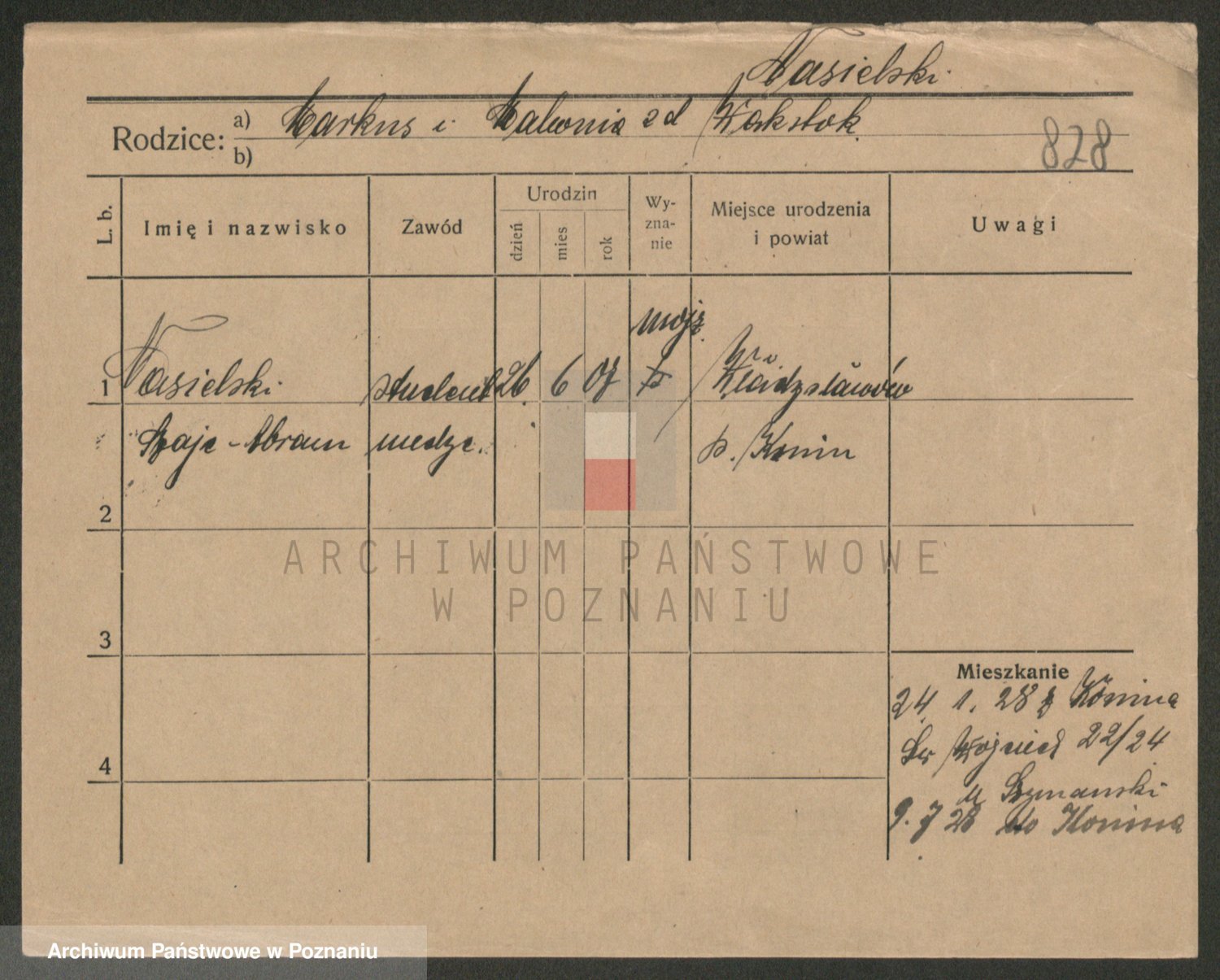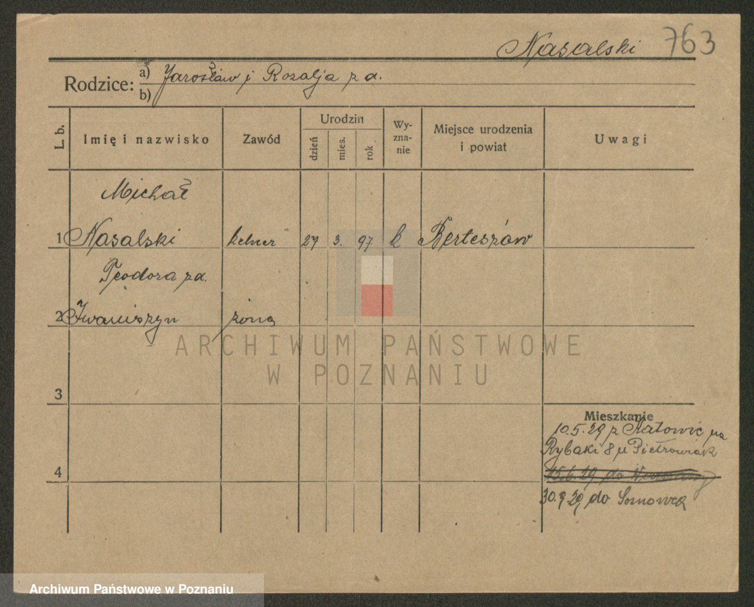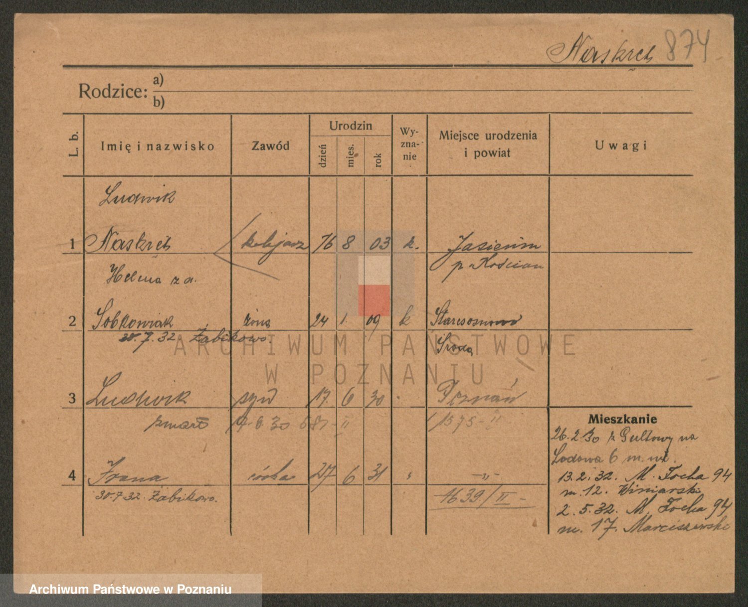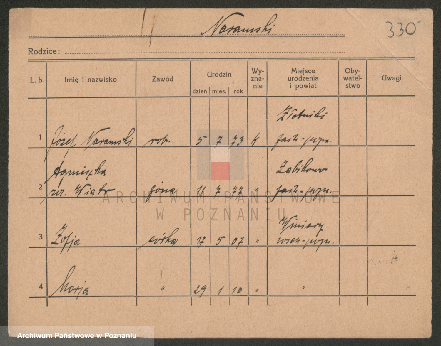 Podgląd karty osobowej dostępny jest po kliknięciu na nazwisko lub ikonkę karty. Można dokonywać powiększenia (ikony na górze) lub przechodzić między kolejnymi skanami (strzałki po bokach).