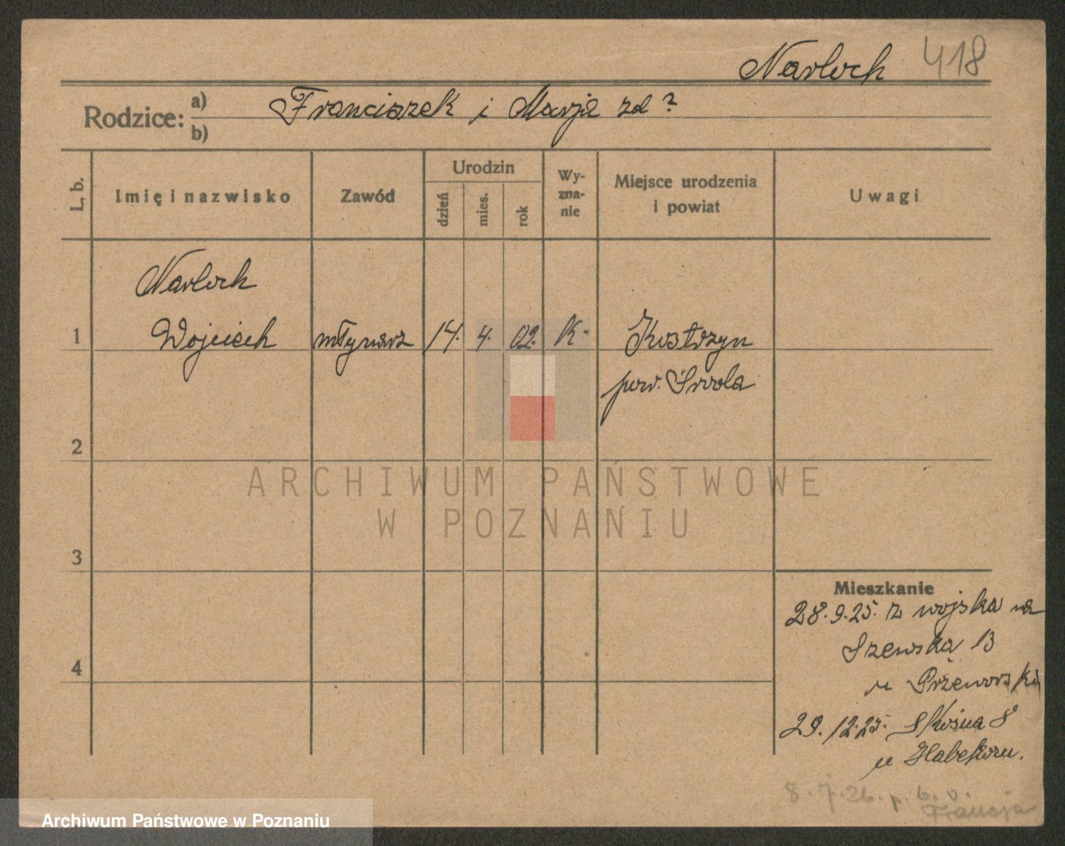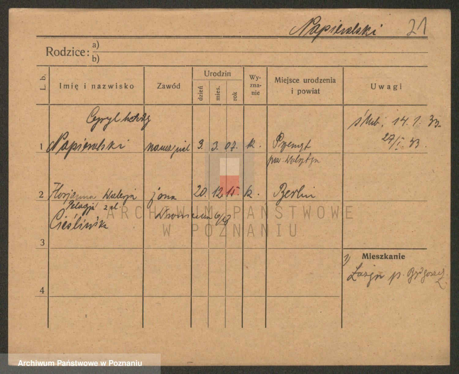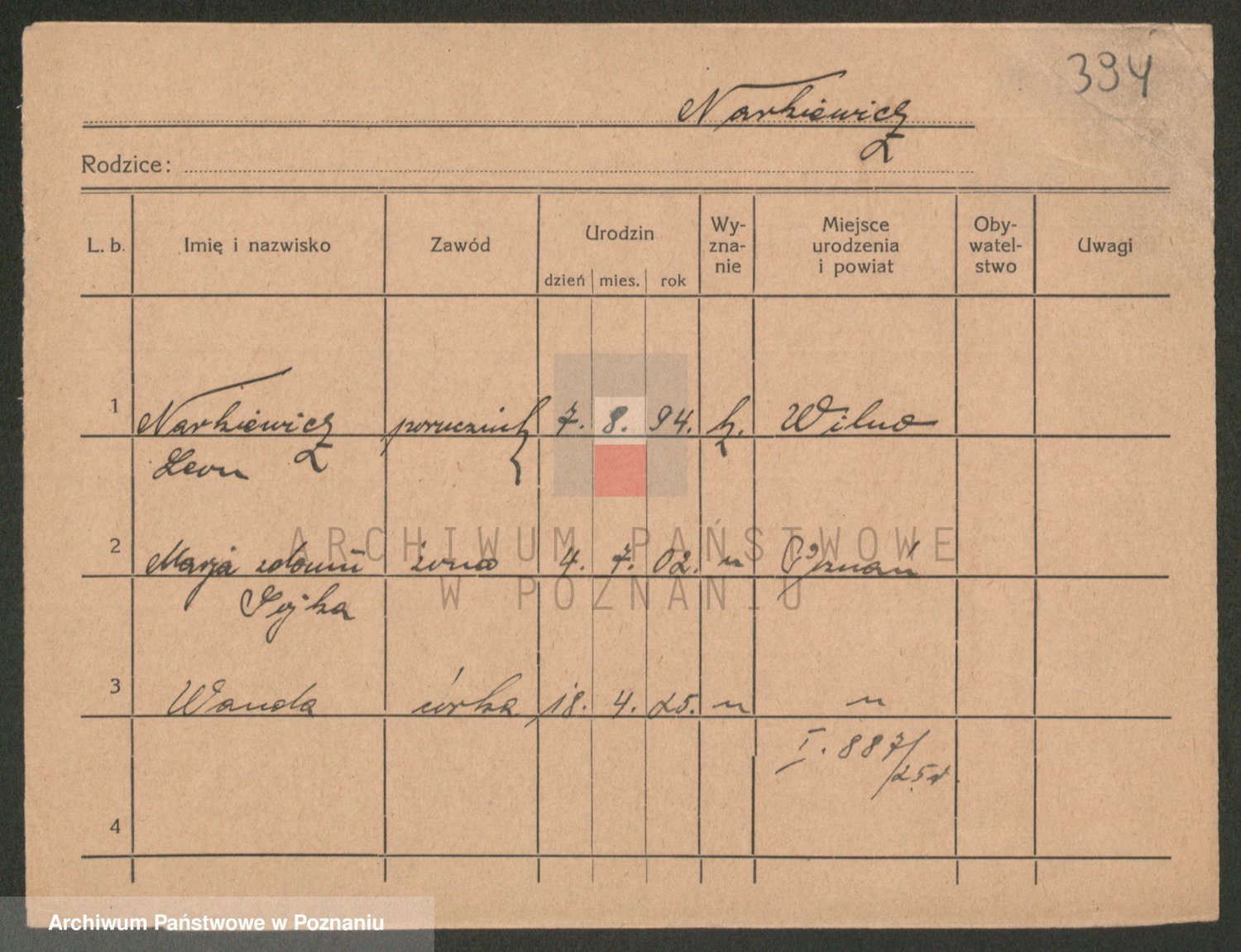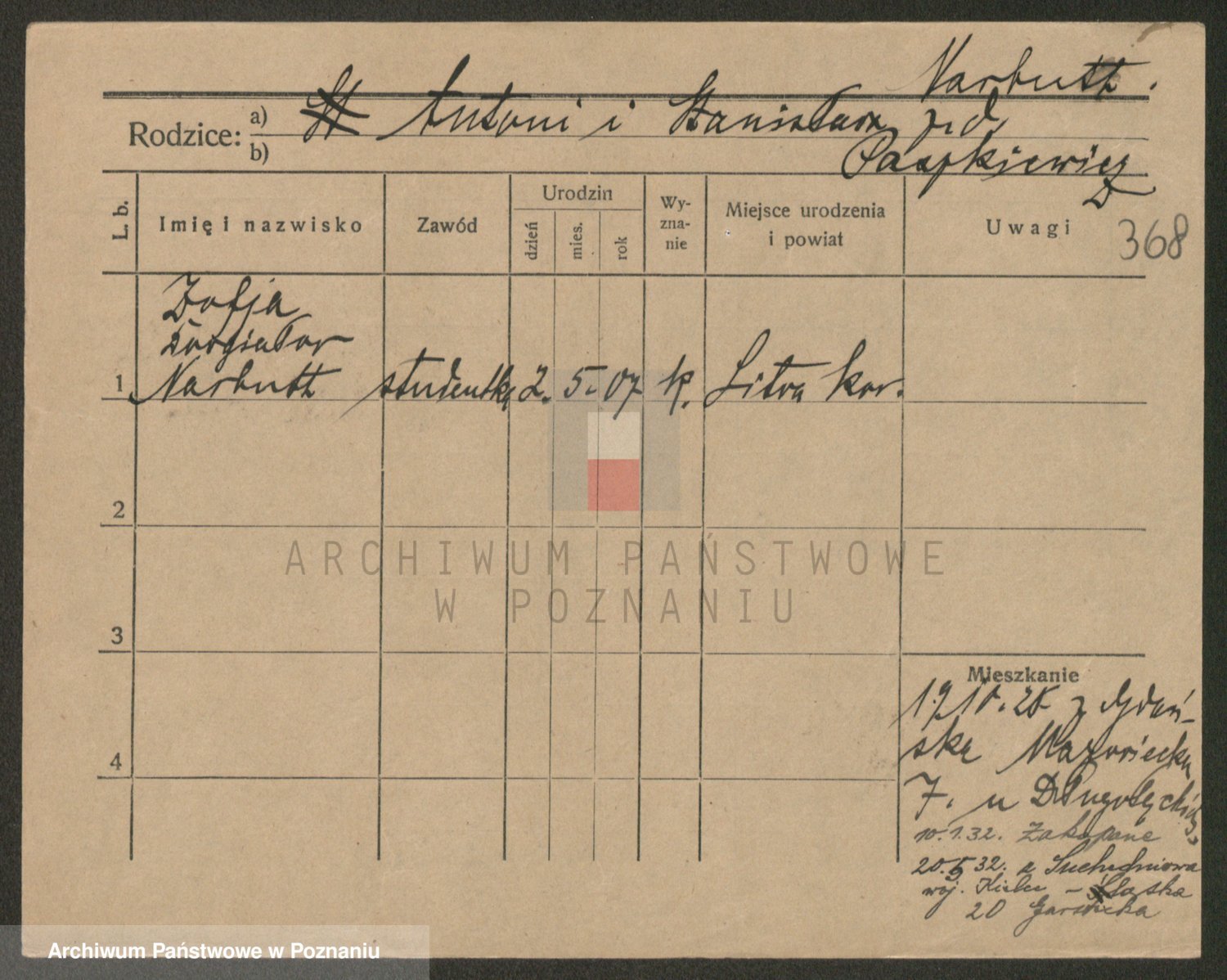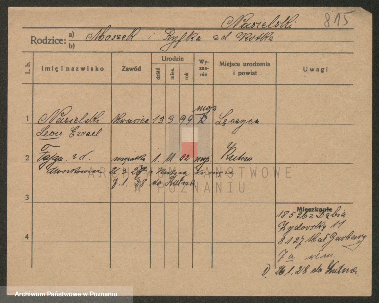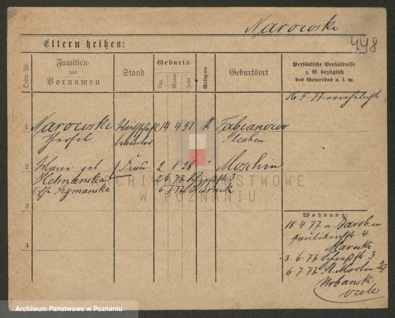 Podgląd karty osobowej dostępny jest po kliknięciu na nazwisko lub ikonkę karty. Można dokonywać powiększenia (ikony na górze) lub przechodzić między kolejnymi skanami (strzałki po bokach).