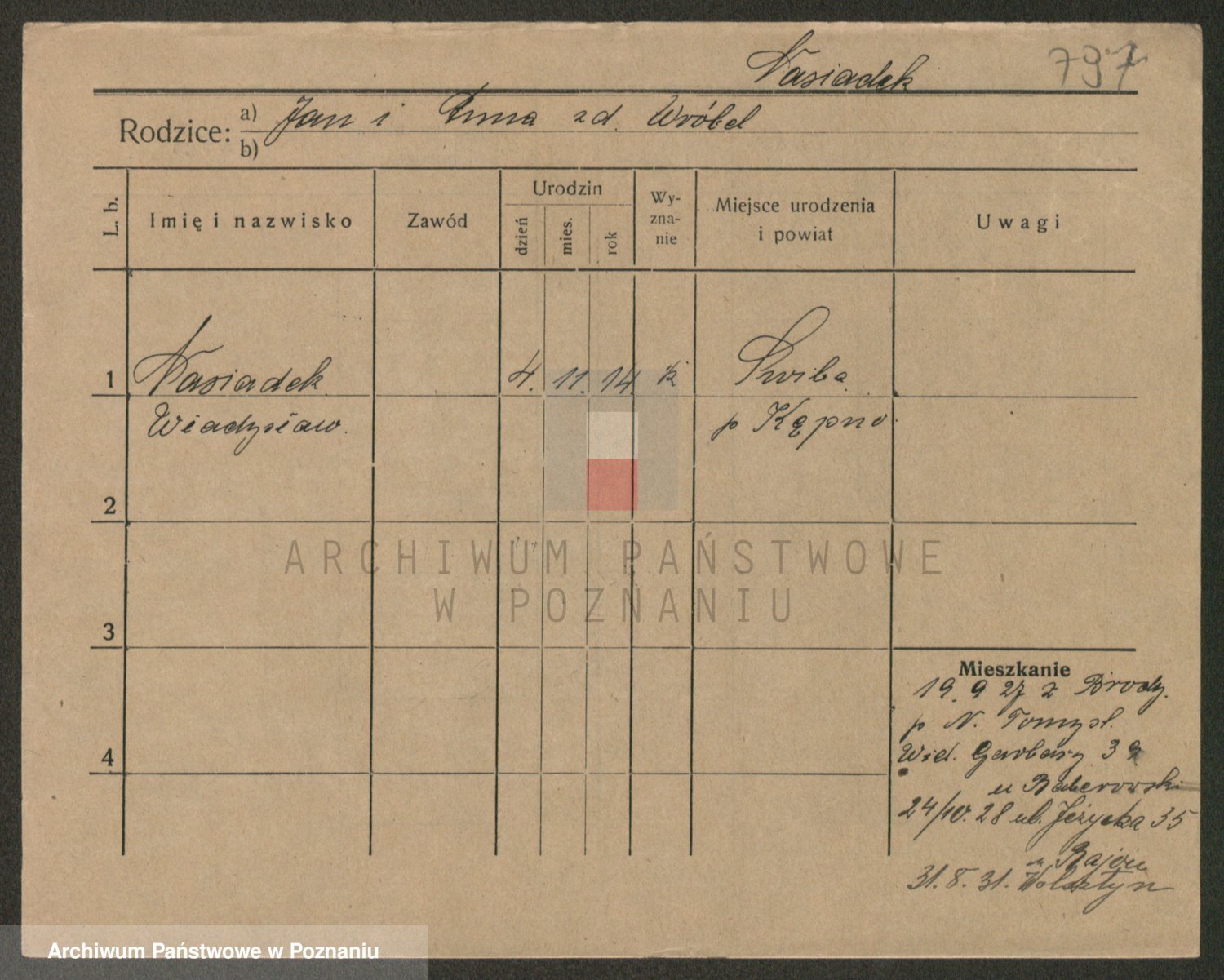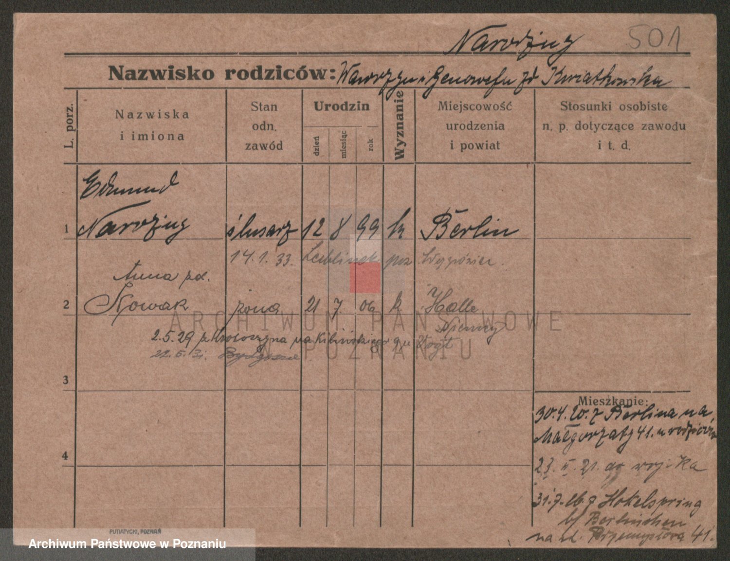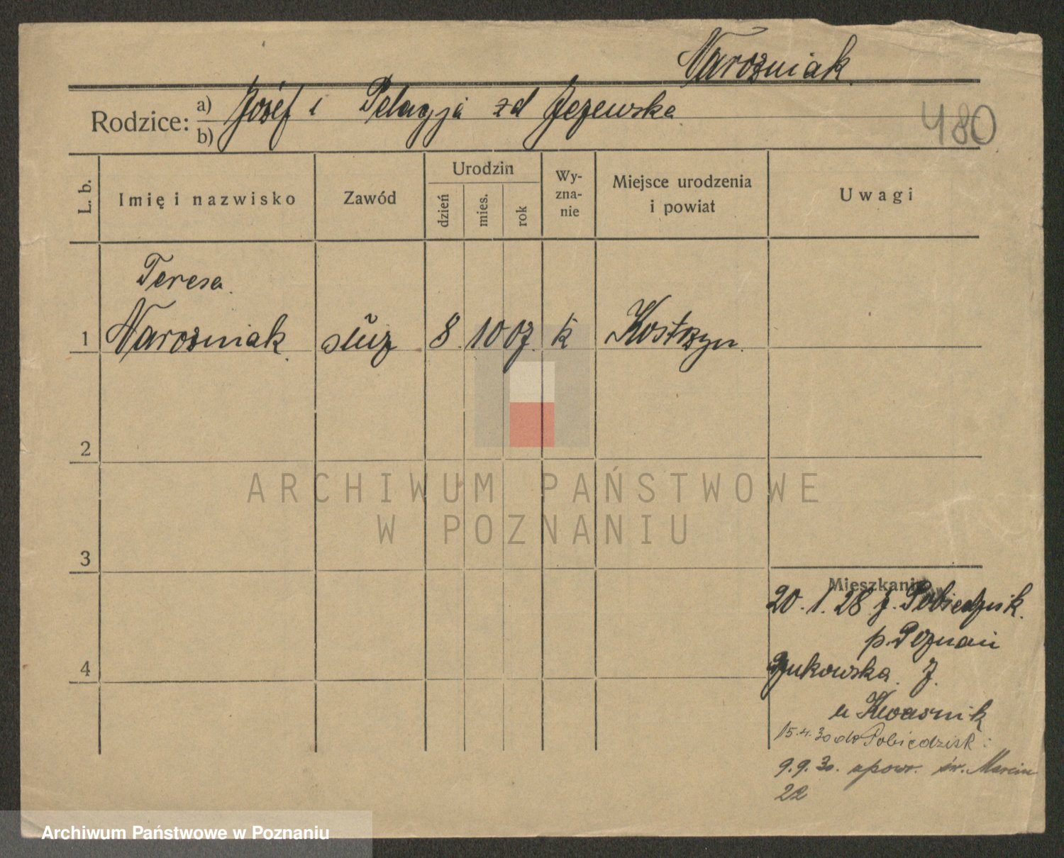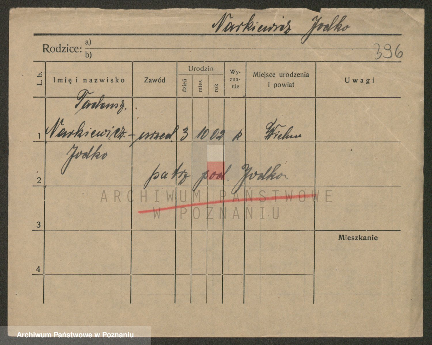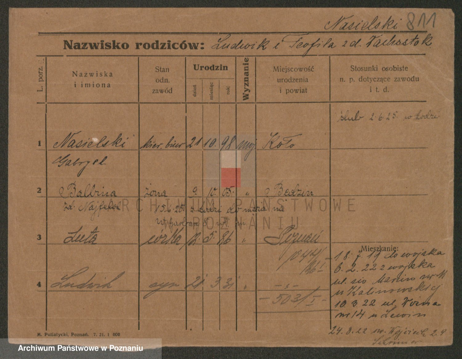 Podgląd karty osobowej dostępny jest po kliknięciu na nazwisko lub ikonkę karty. Można dokonywać powiększenia (ikony na górze) lub przechodzić między kolejnymi skanami (strzałki po bokach).