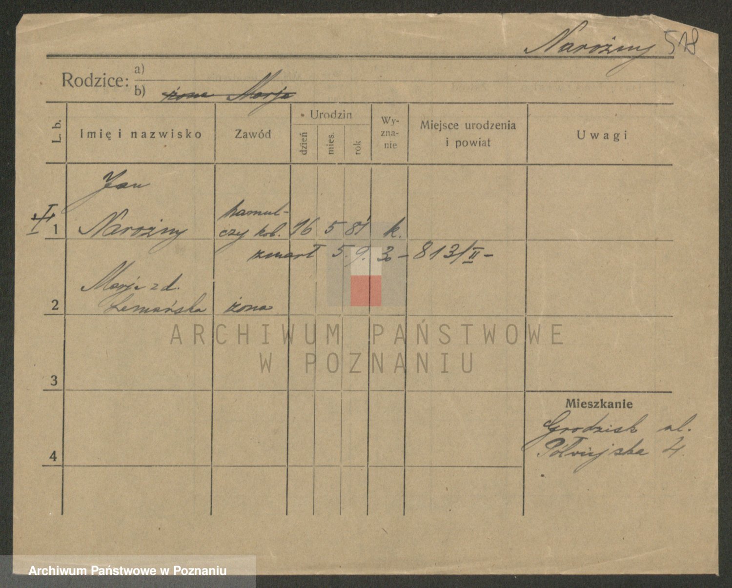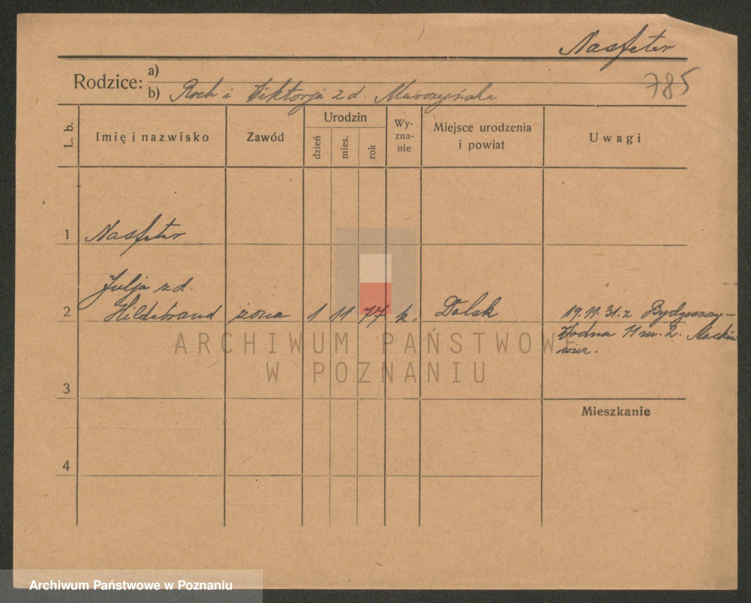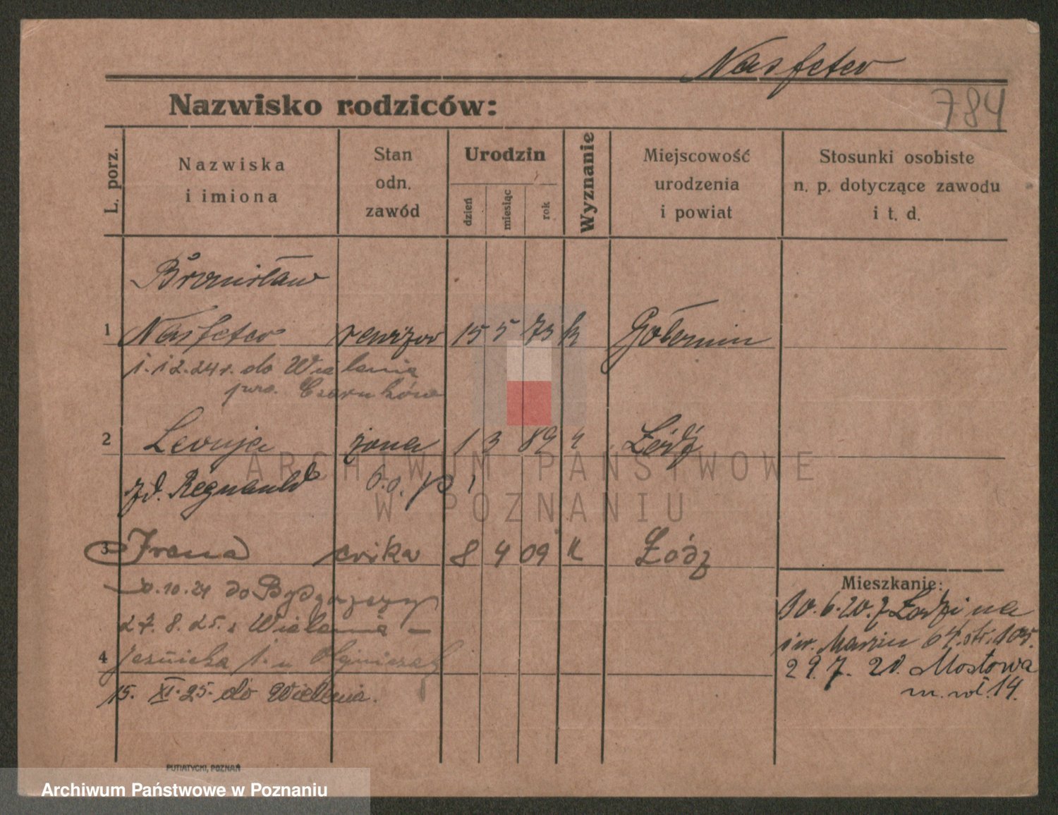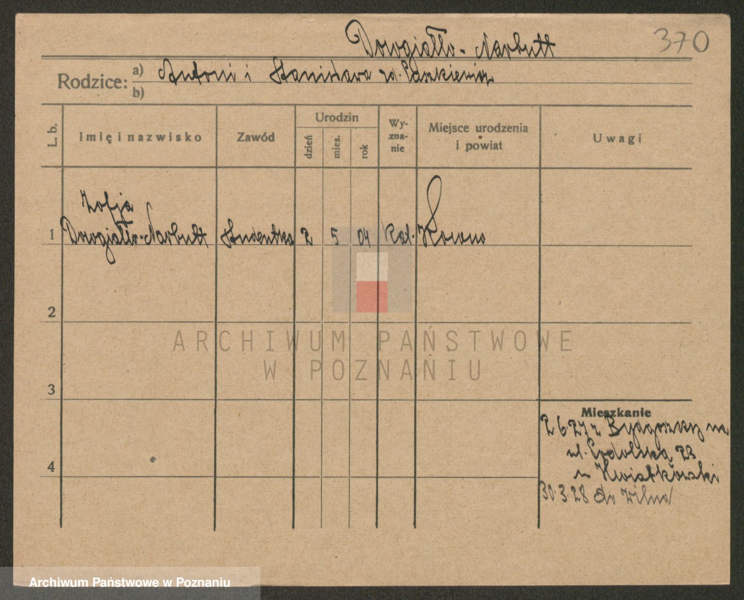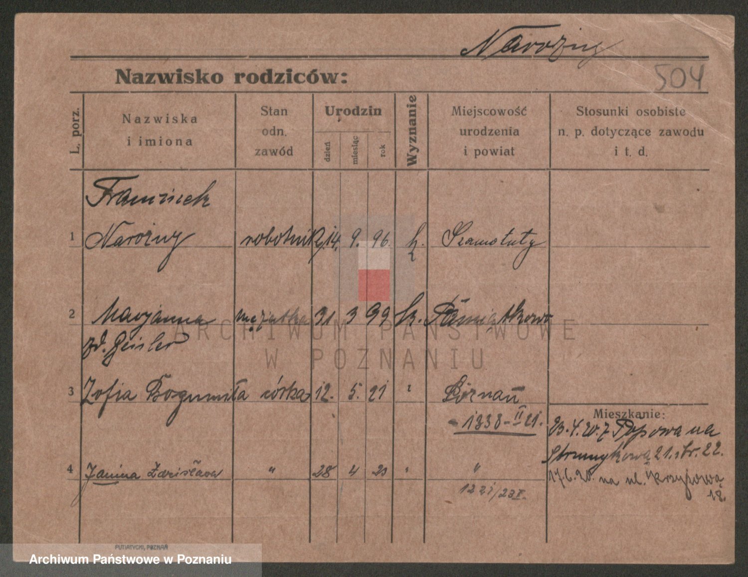 Podgląd karty osobowej dostępny jest po kliknięciu na nazwisko lub ikonkę karty. Można dokonywać powiększenia (ikony na górze) lub przechodzić między kolejnymi skanami (strzałki po bokach).