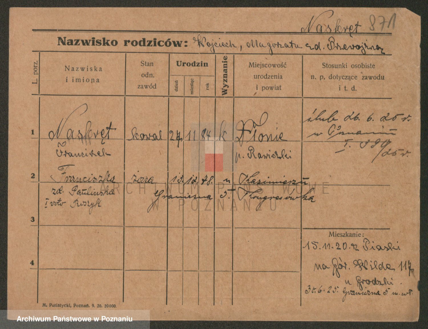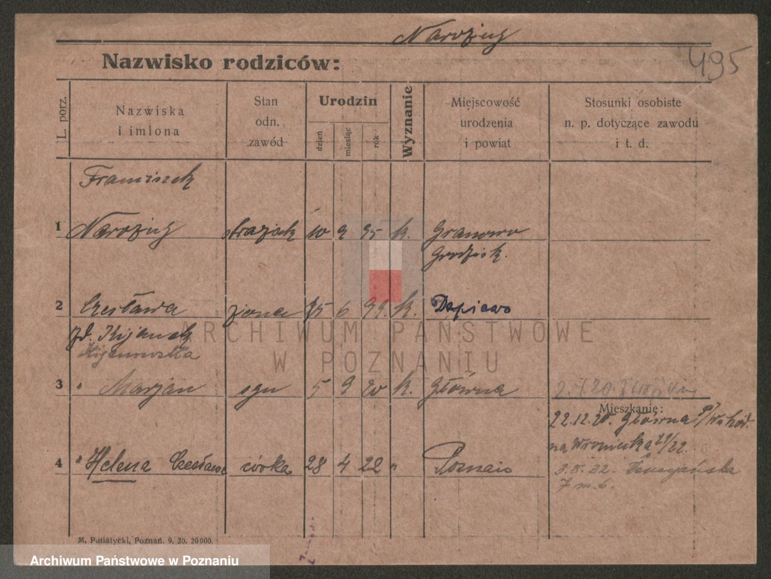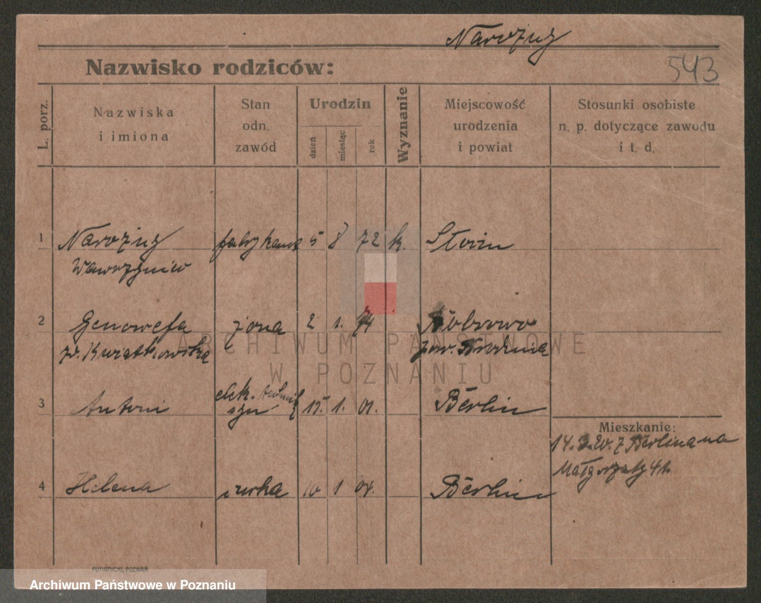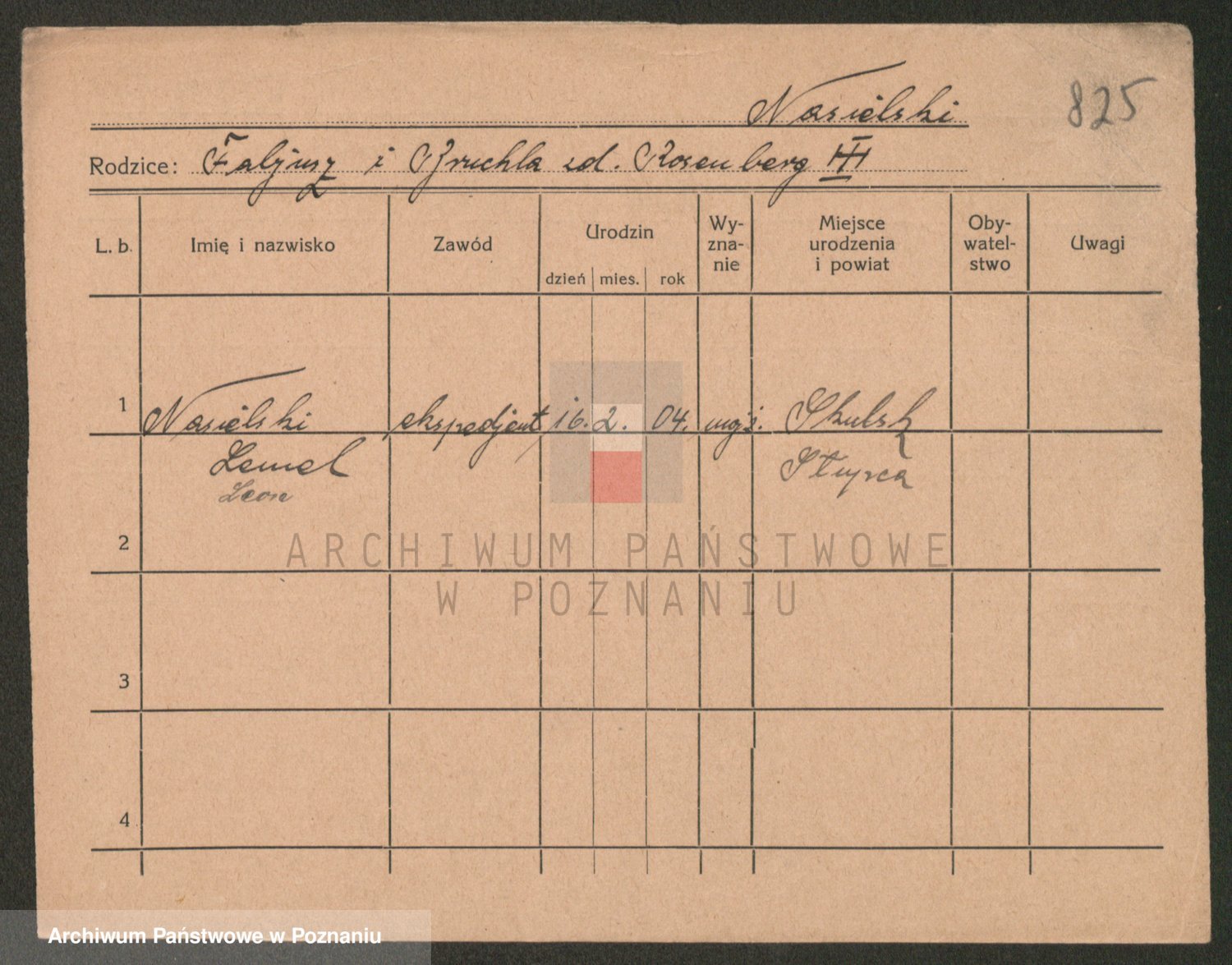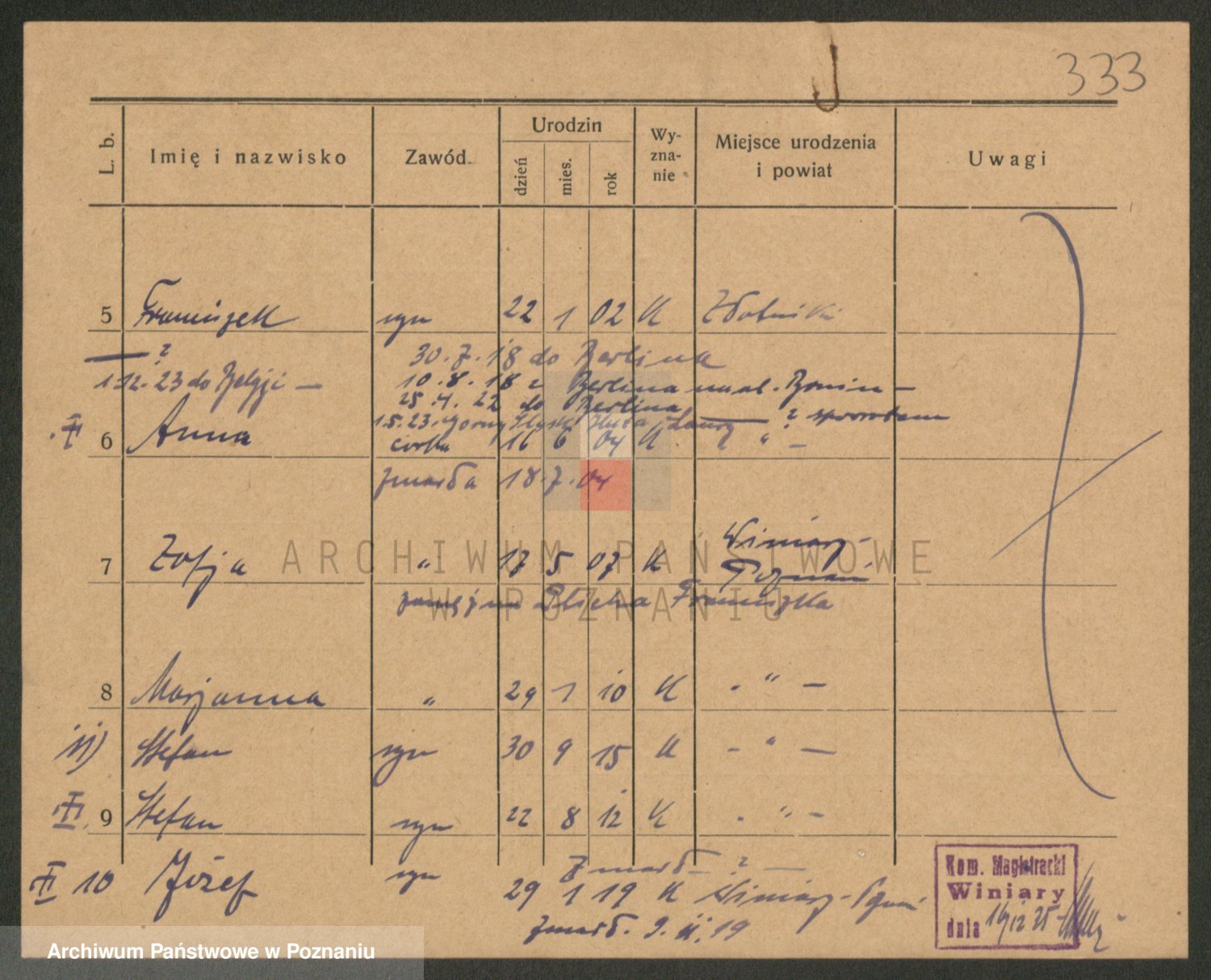 Podgląd karty osobowej dostępny jest po kliknięciu na nazwisko lub ikonkę karty. Można dokonywać powiększenia (ikony na górze) lub przechodzić między kolejnymi skanami (strzałki po bokach).