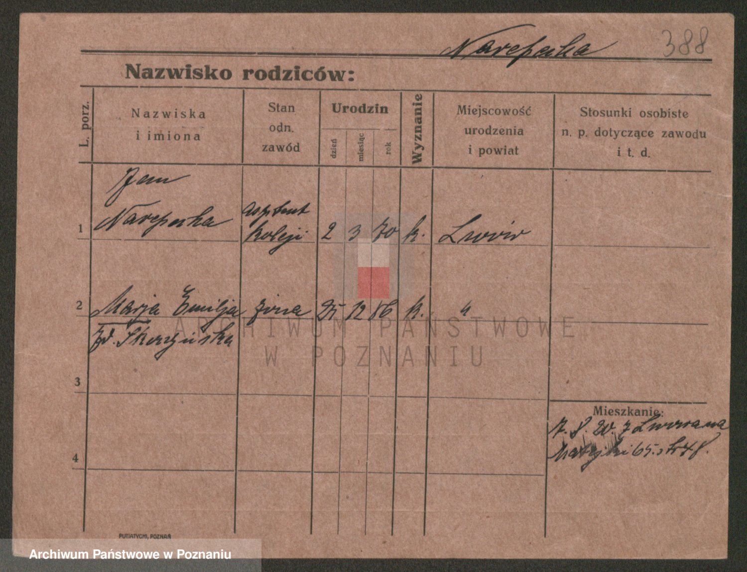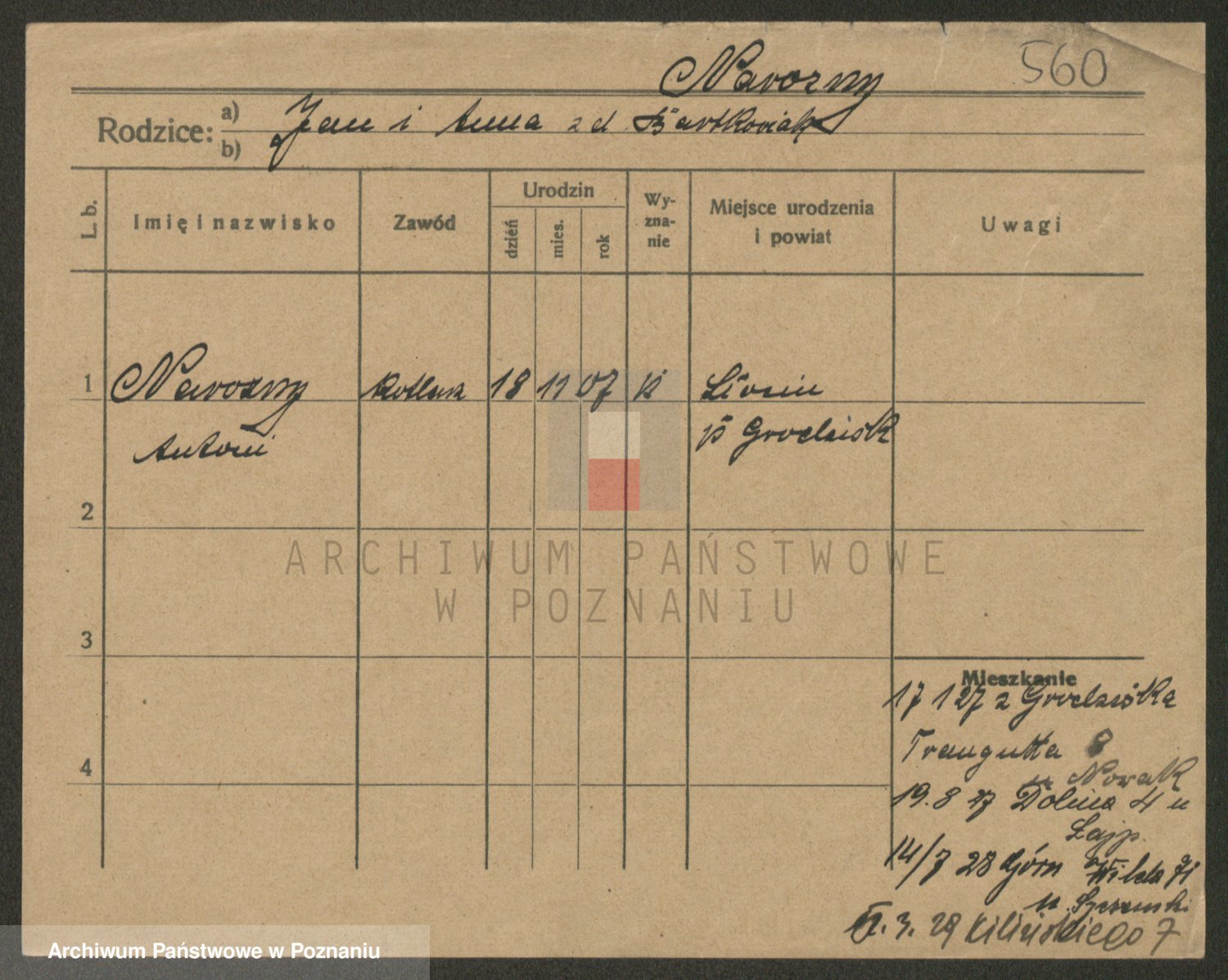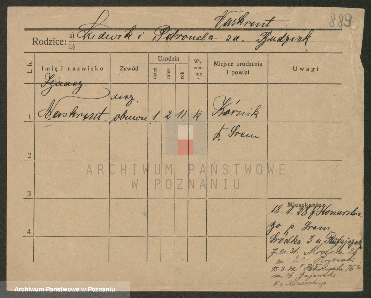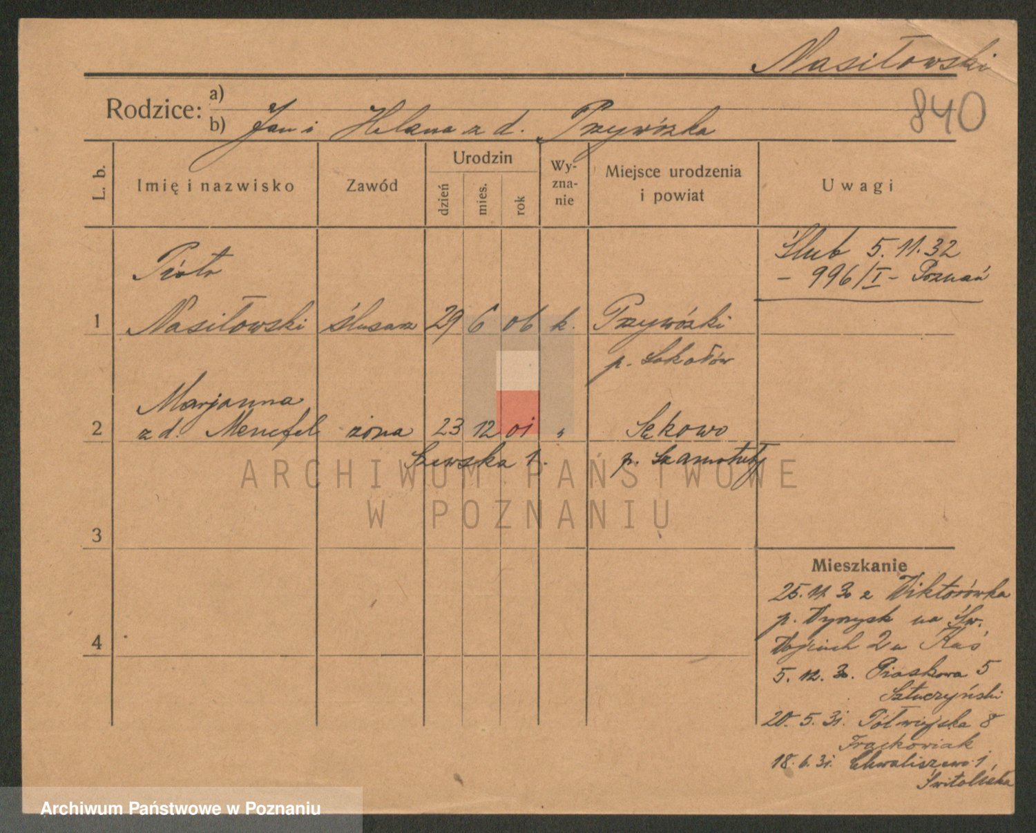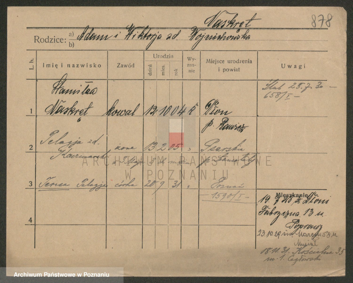 Podgląd karty osobowej dostępny jest po kliknięciu na nazwisko lub ikonkę karty. Można dokonywać powiększenia (ikony na górze) lub przechodzić między kolejnymi skanami (strzałki po bokach).