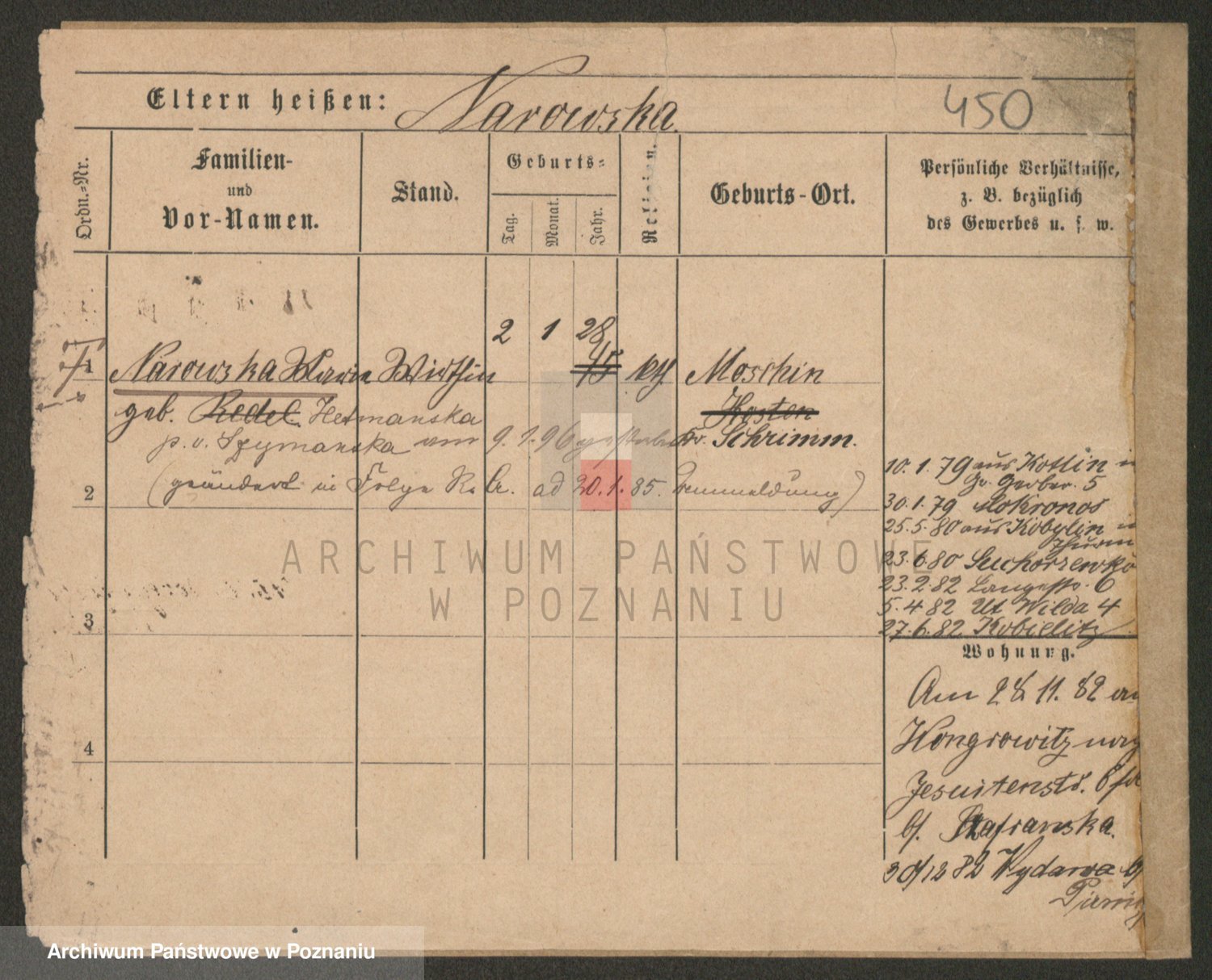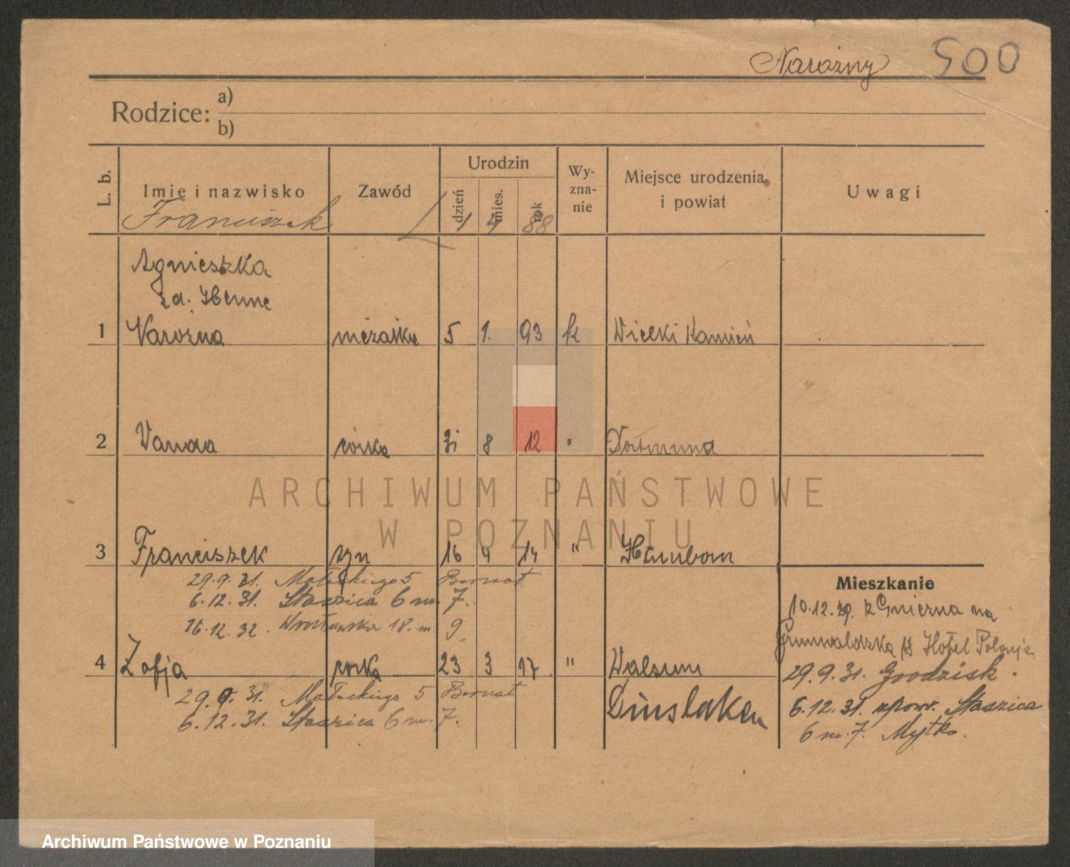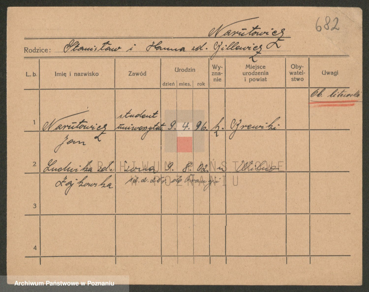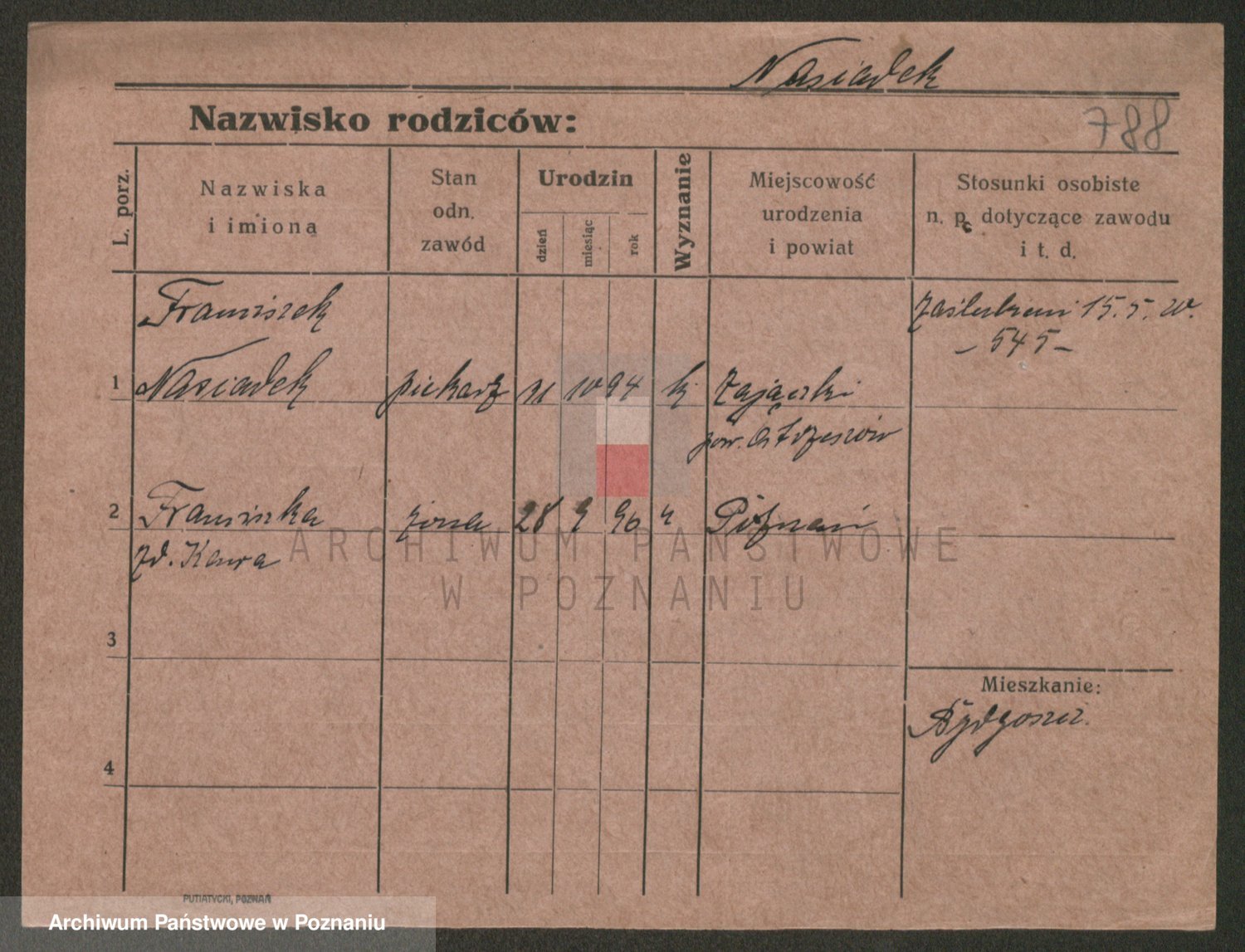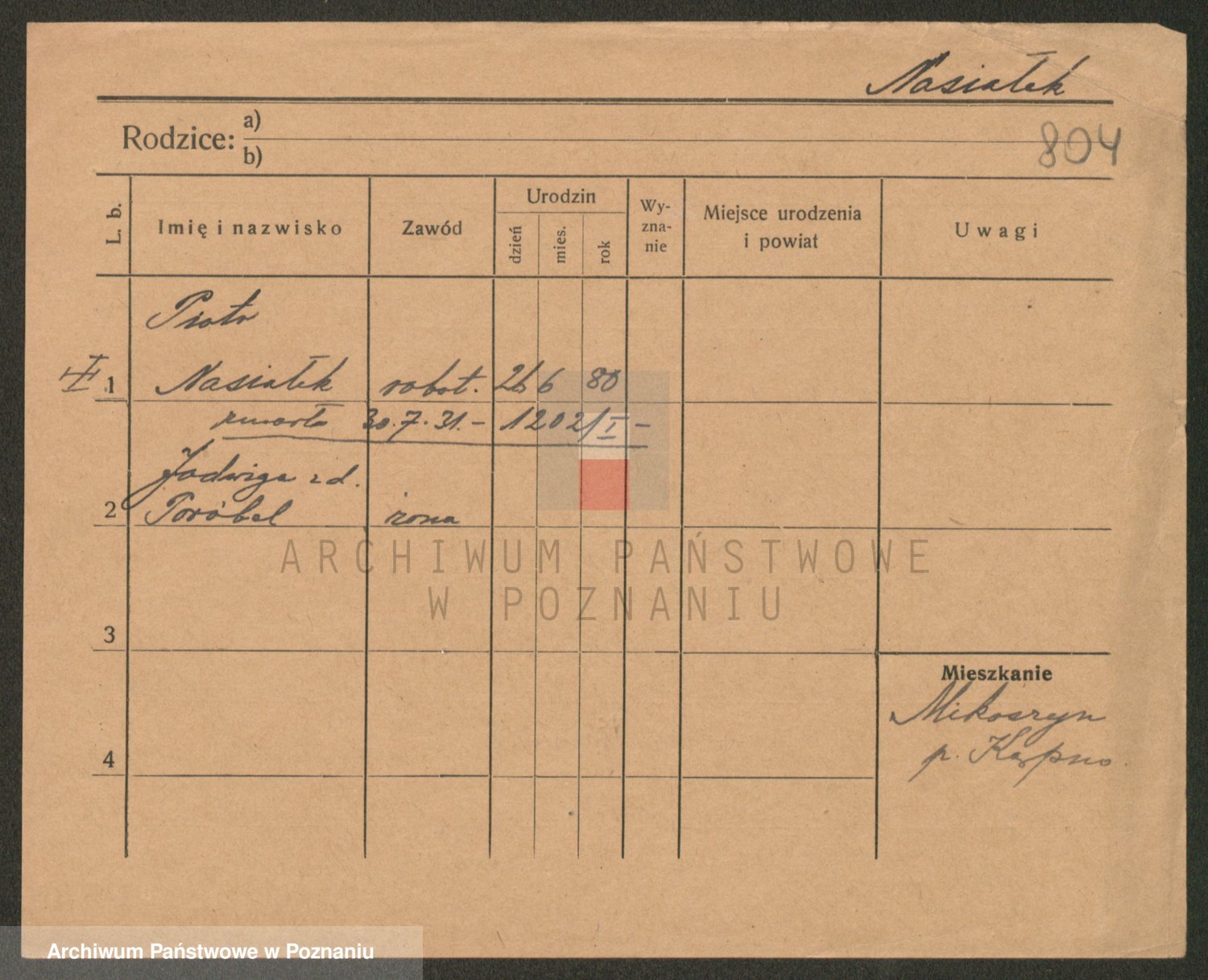 Podgląd karty osobowej dostępny jest po kliknięciu na nazwisko lub ikonkę karty. Można dokonywać powiększenia (ikony na górze) lub przechodzić między kolejnymi skanami (strzałki po bokach).