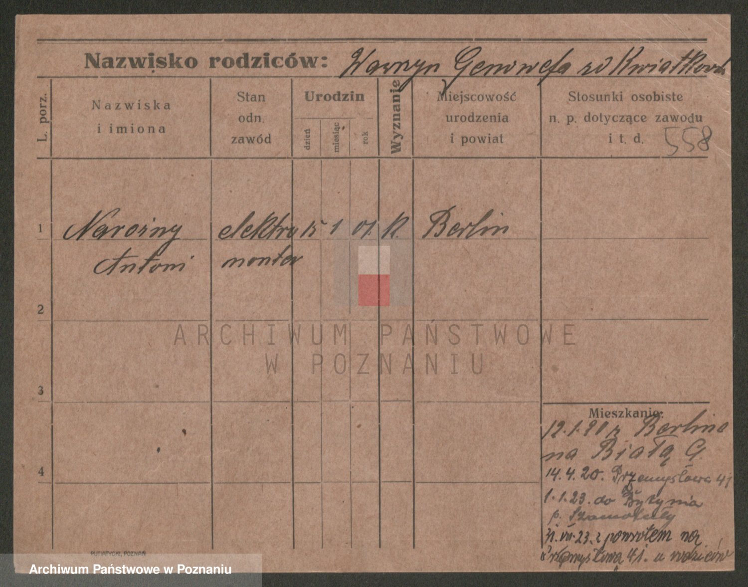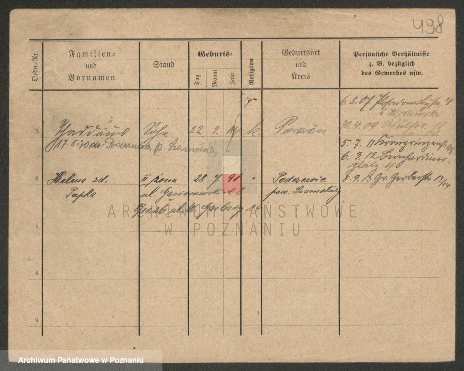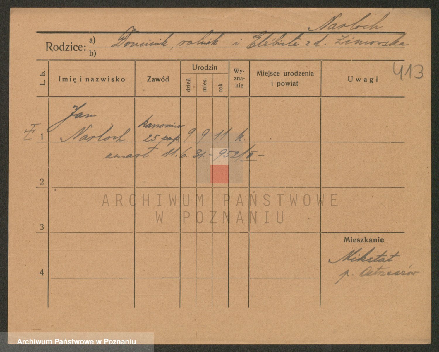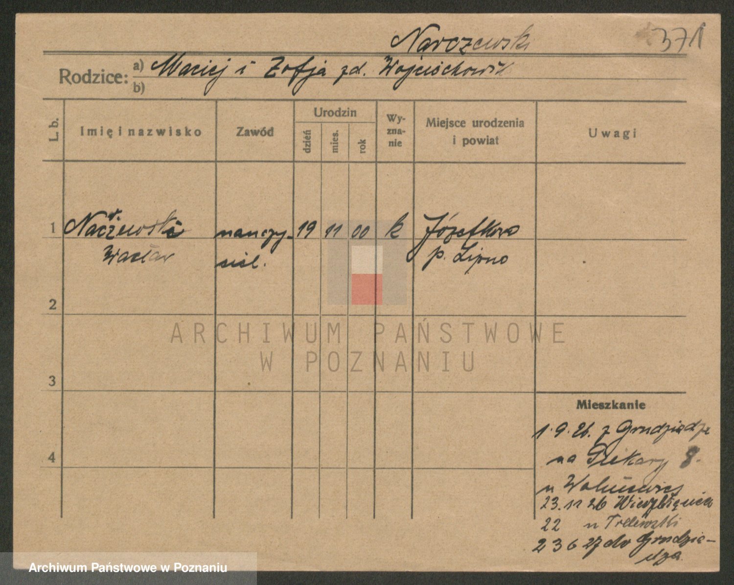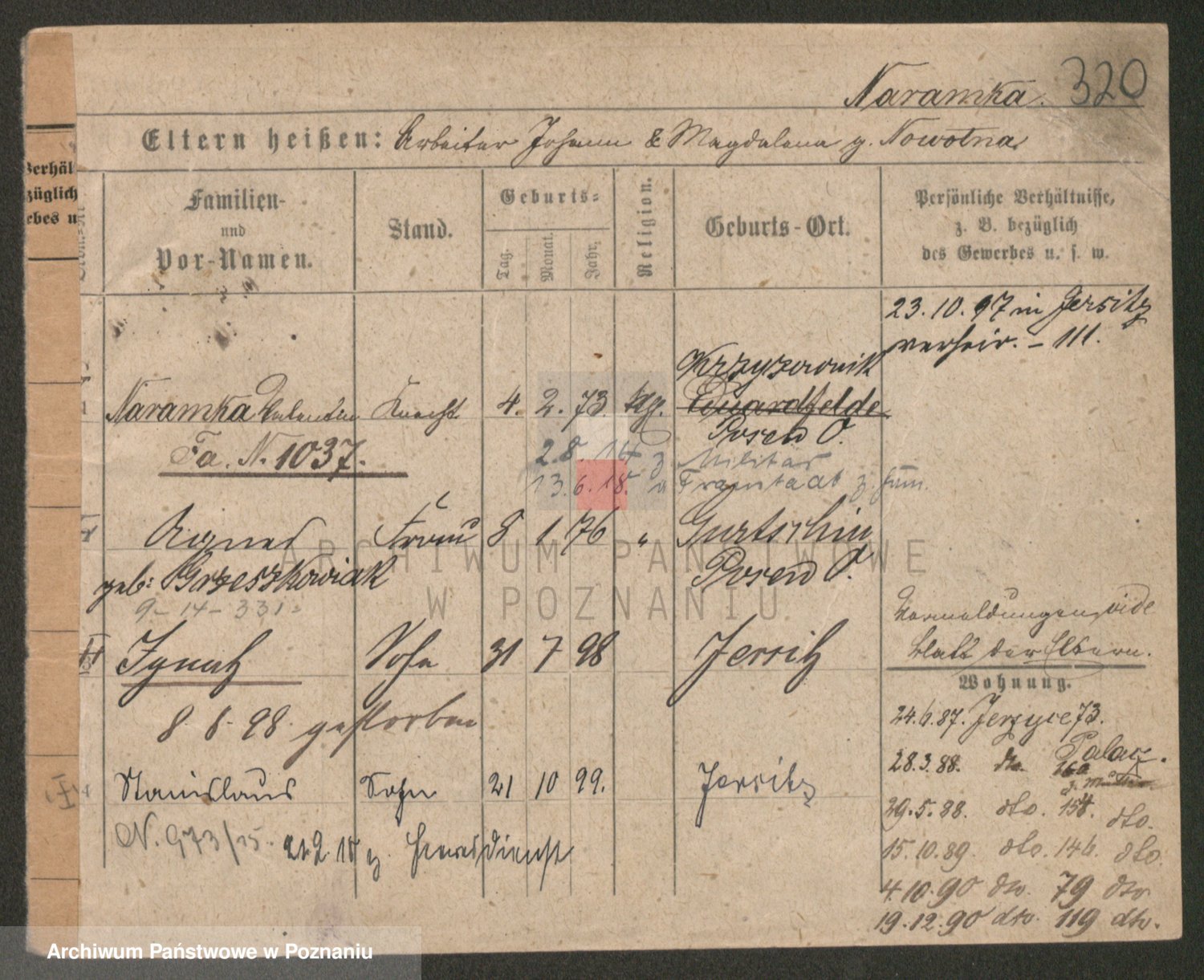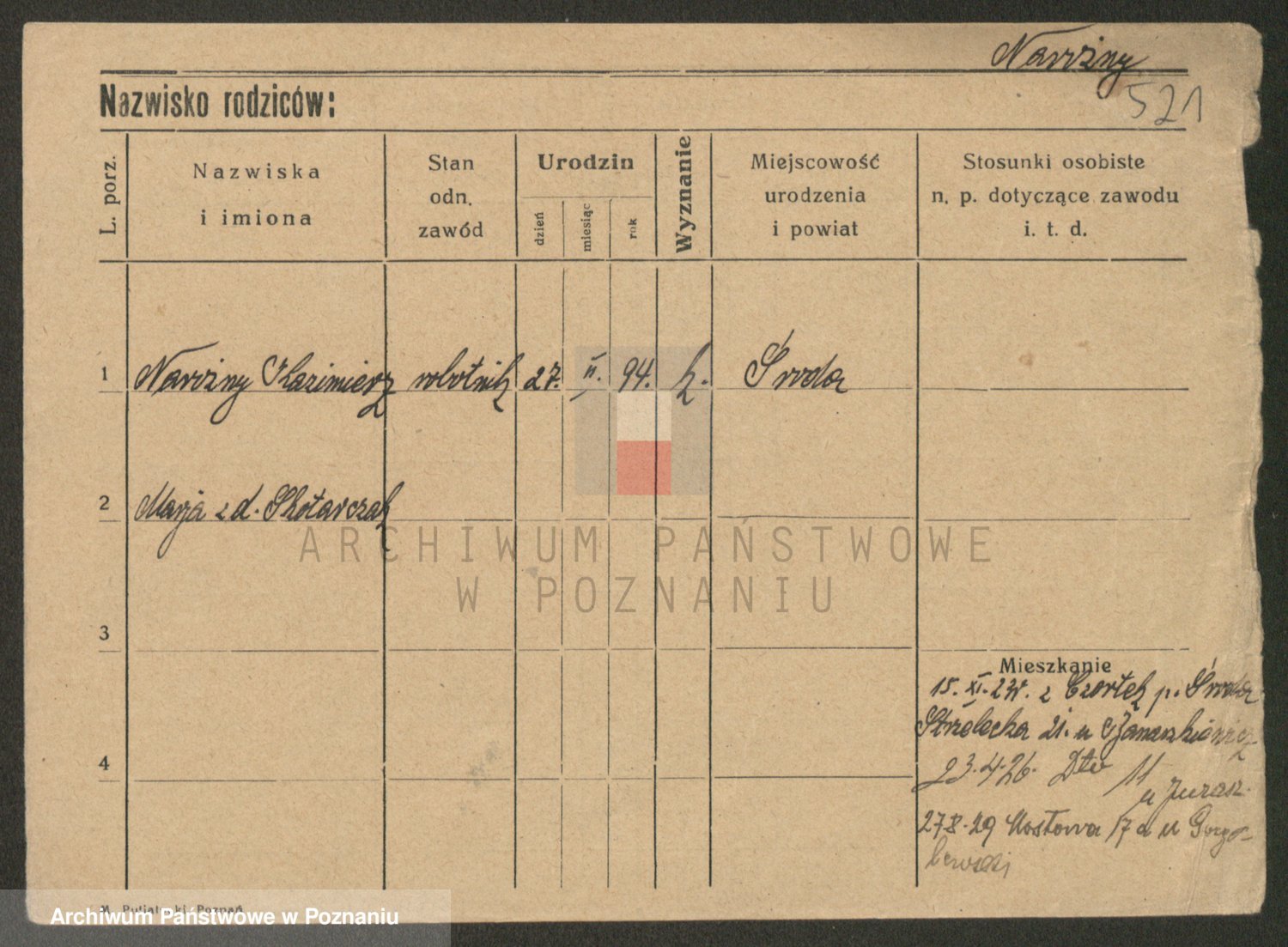 Podgląd karty osobowej dostępny jest po kliknięciu na nazwisko lub ikonkę karty. Można dokonywać powiększenia (ikony na górze) lub przechodzić między kolejnymi skanami (strzałki po bokach).