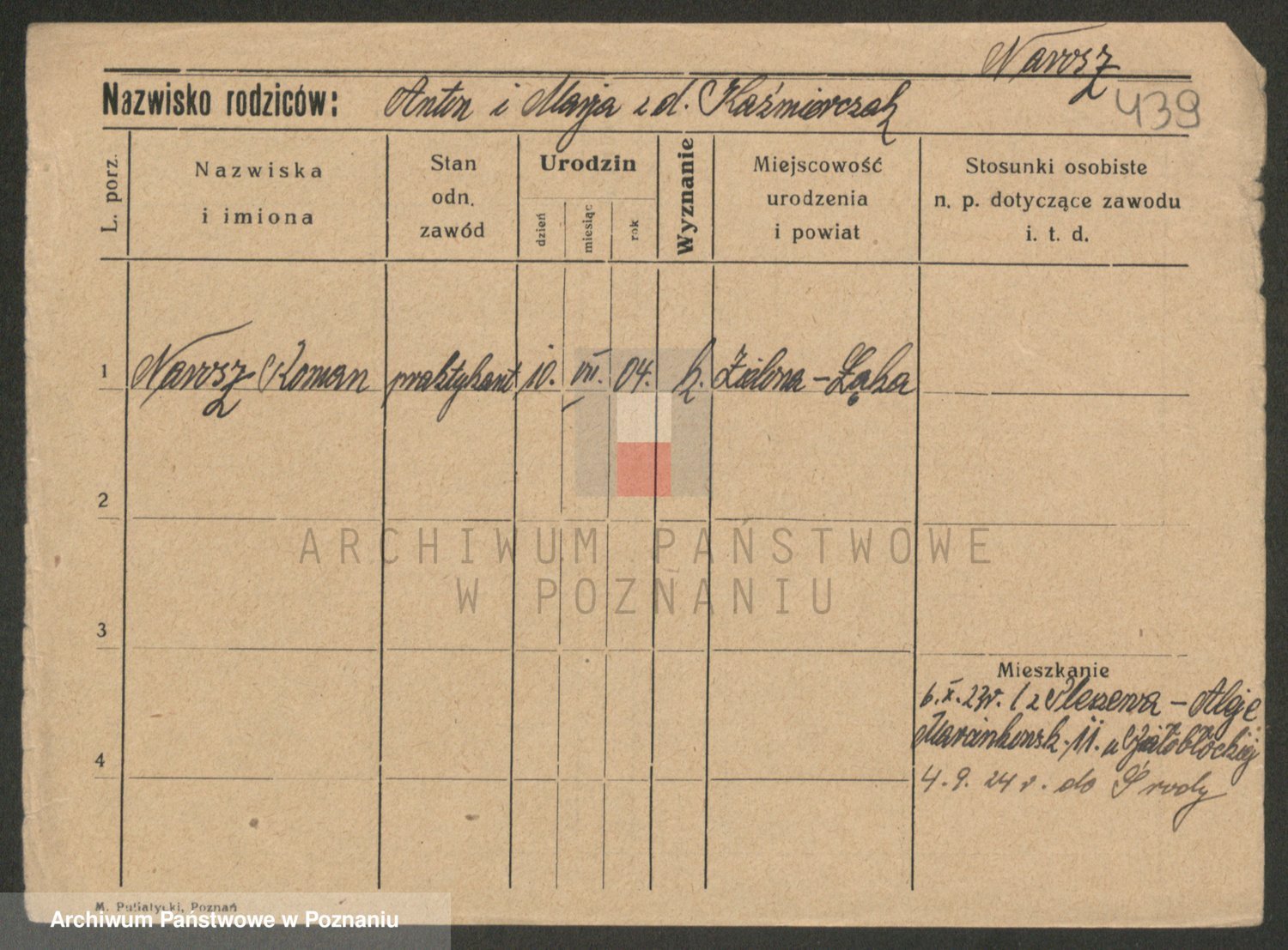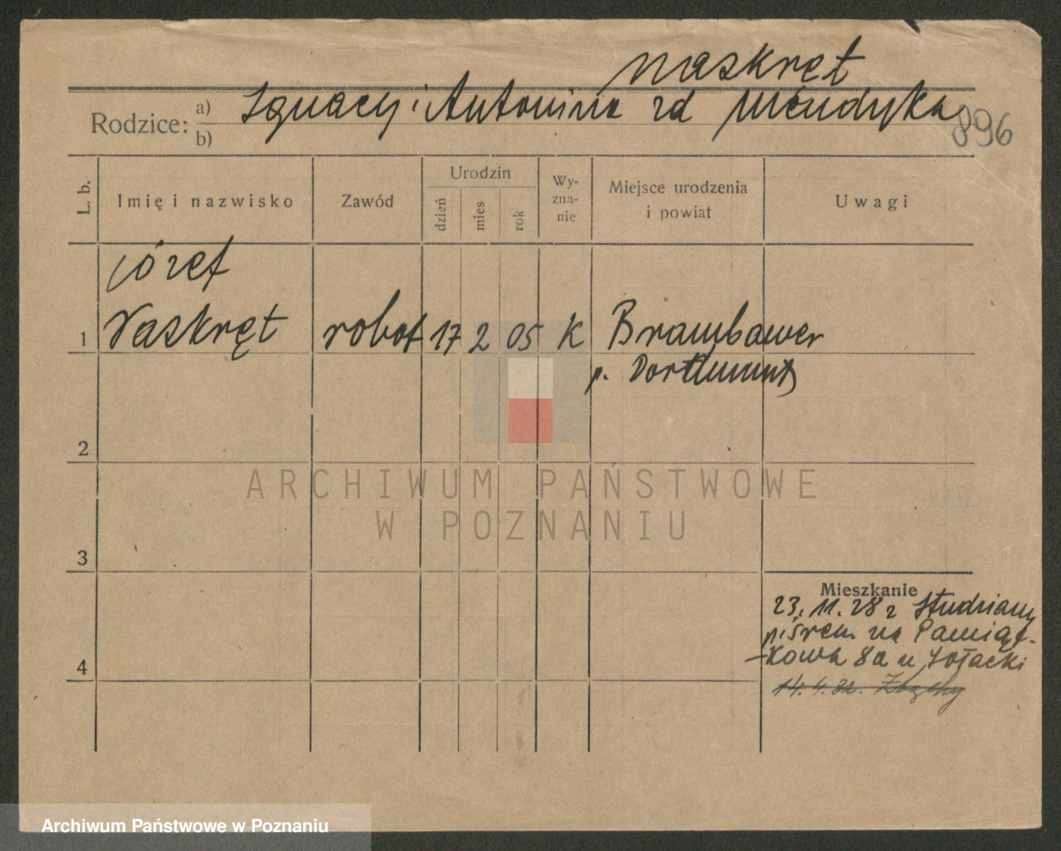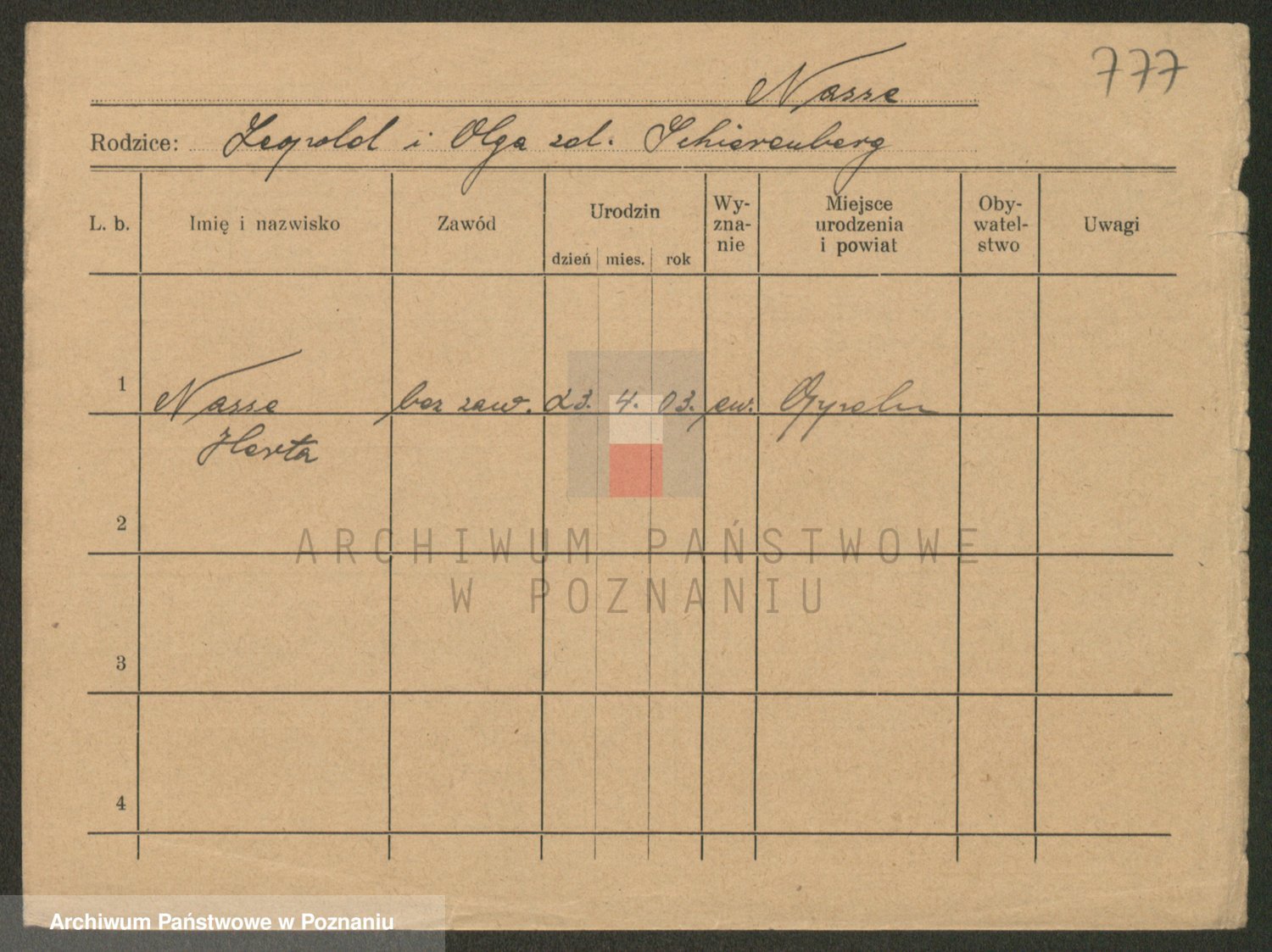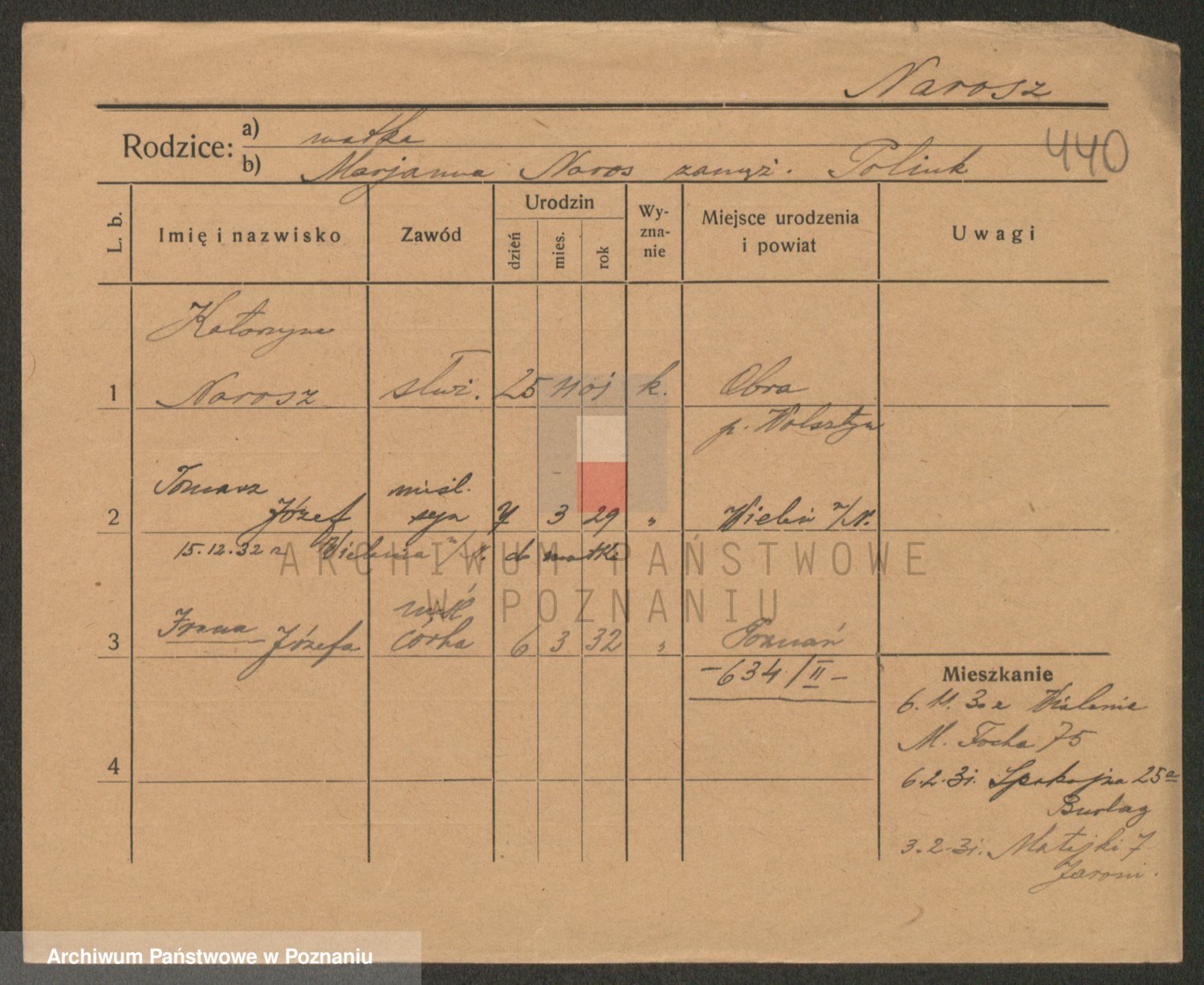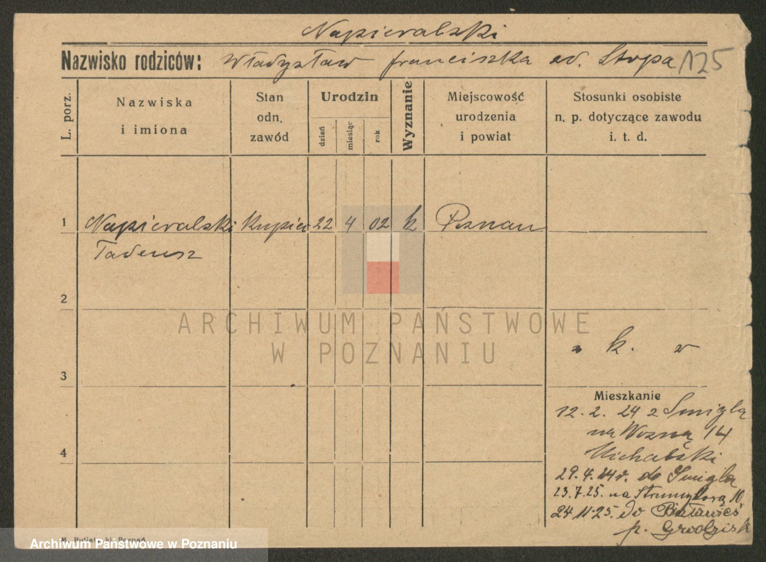 Podgląd karty osobowej dostępny jest po kliknięciu na nazwisko lub ikonkę karty. Można dokonywać powiększenia (ikony na górze) lub przechodzić między kolejnymi skanami (strzałki po bokach).