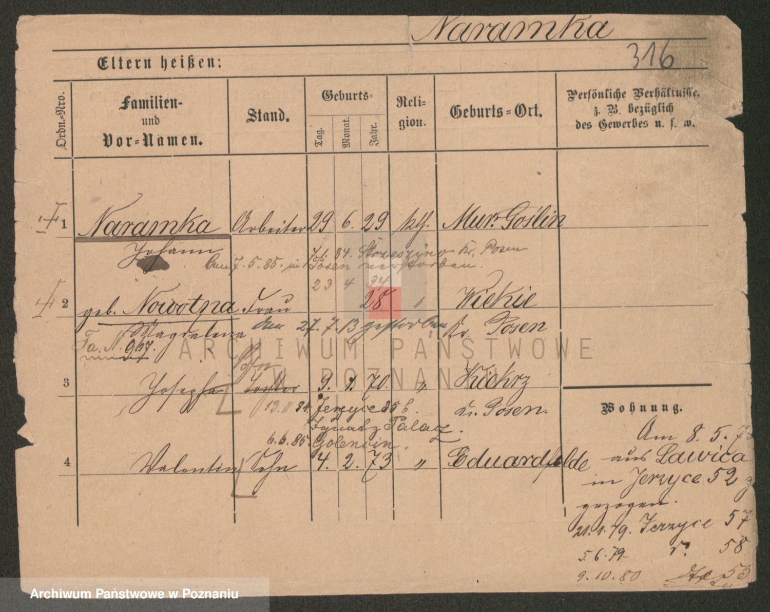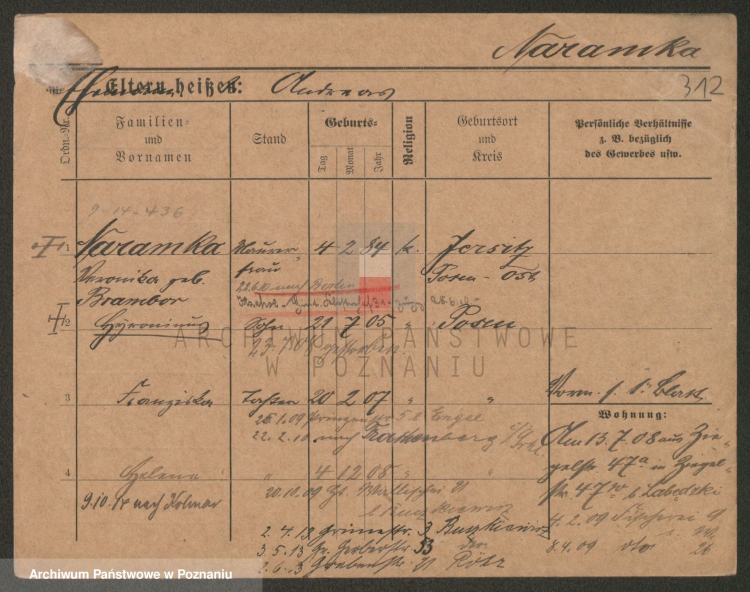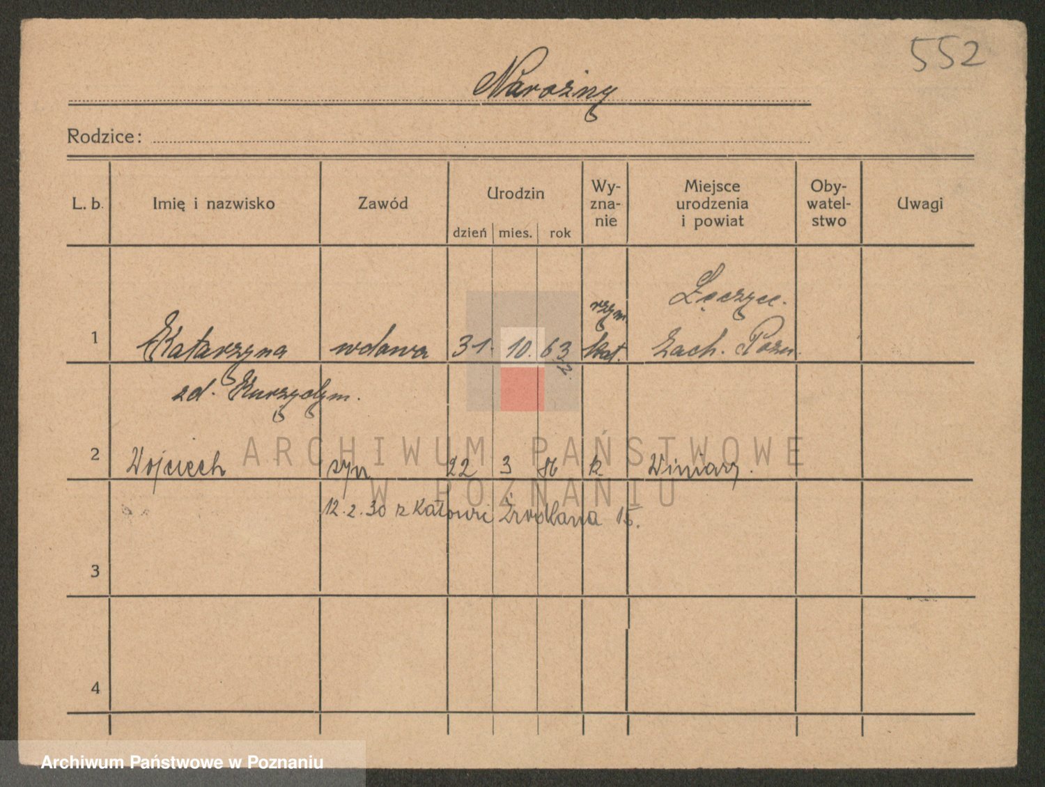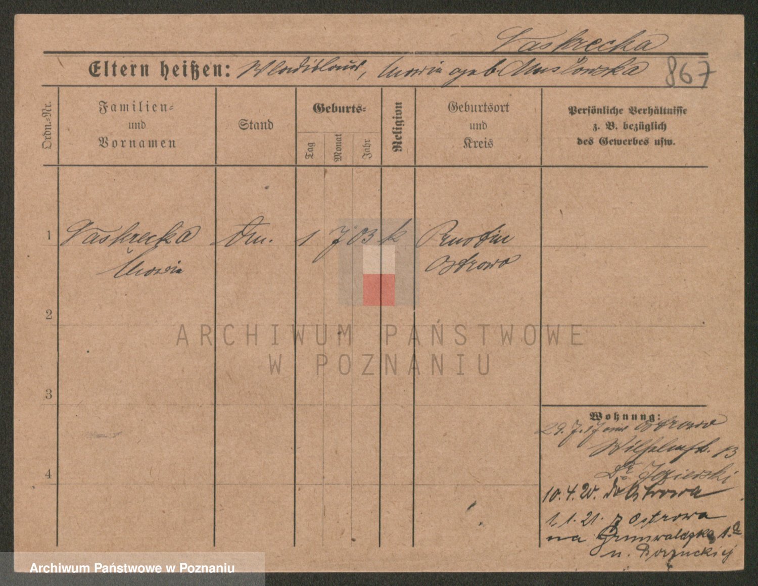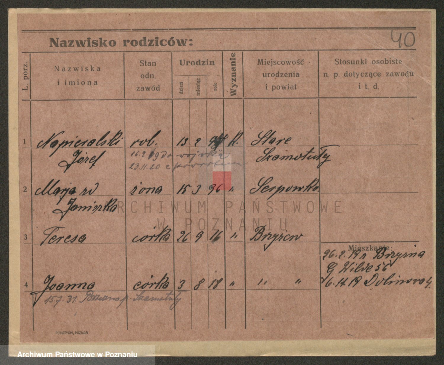 Podgląd karty osobowej dostępny jest po kliknięciu na nazwisko lub ikonkę karty. Można dokonywać powiększenia (ikony na górze) lub przechodzić między kolejnymi skanami (strzałki po bokach).