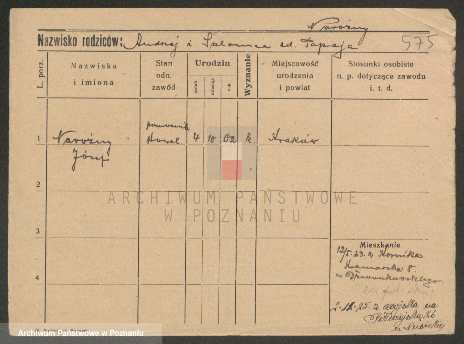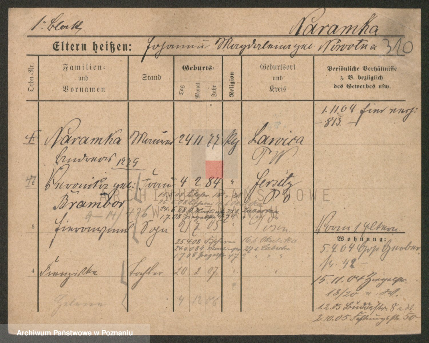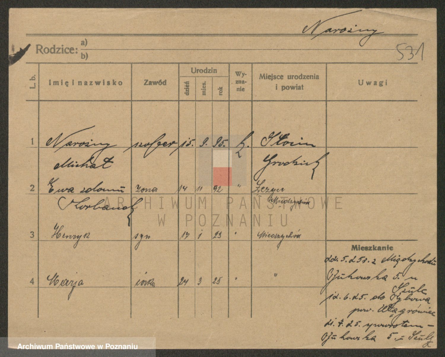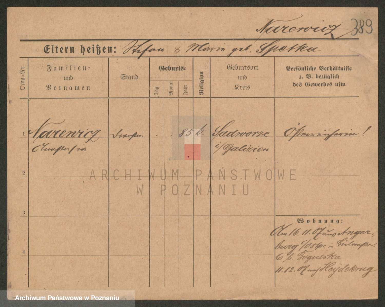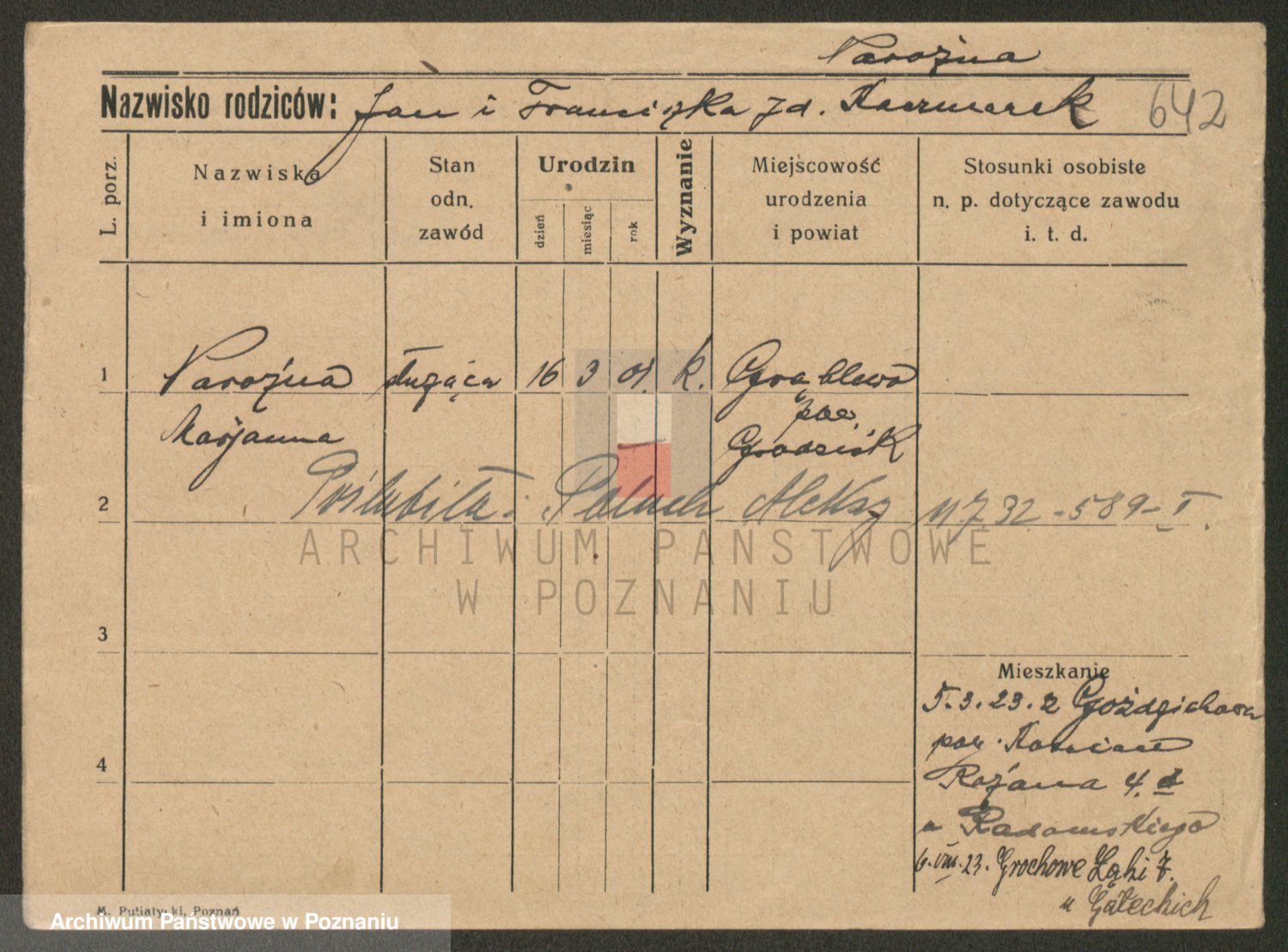 Podgląd karty osobowej dostępny jest po kliknięciu na nazwisko lub ikonkę karty. Można dokonywać powiększenia (ikony na górze) lub przechodzić między kolejnymi skanami (strzałki po bokach).